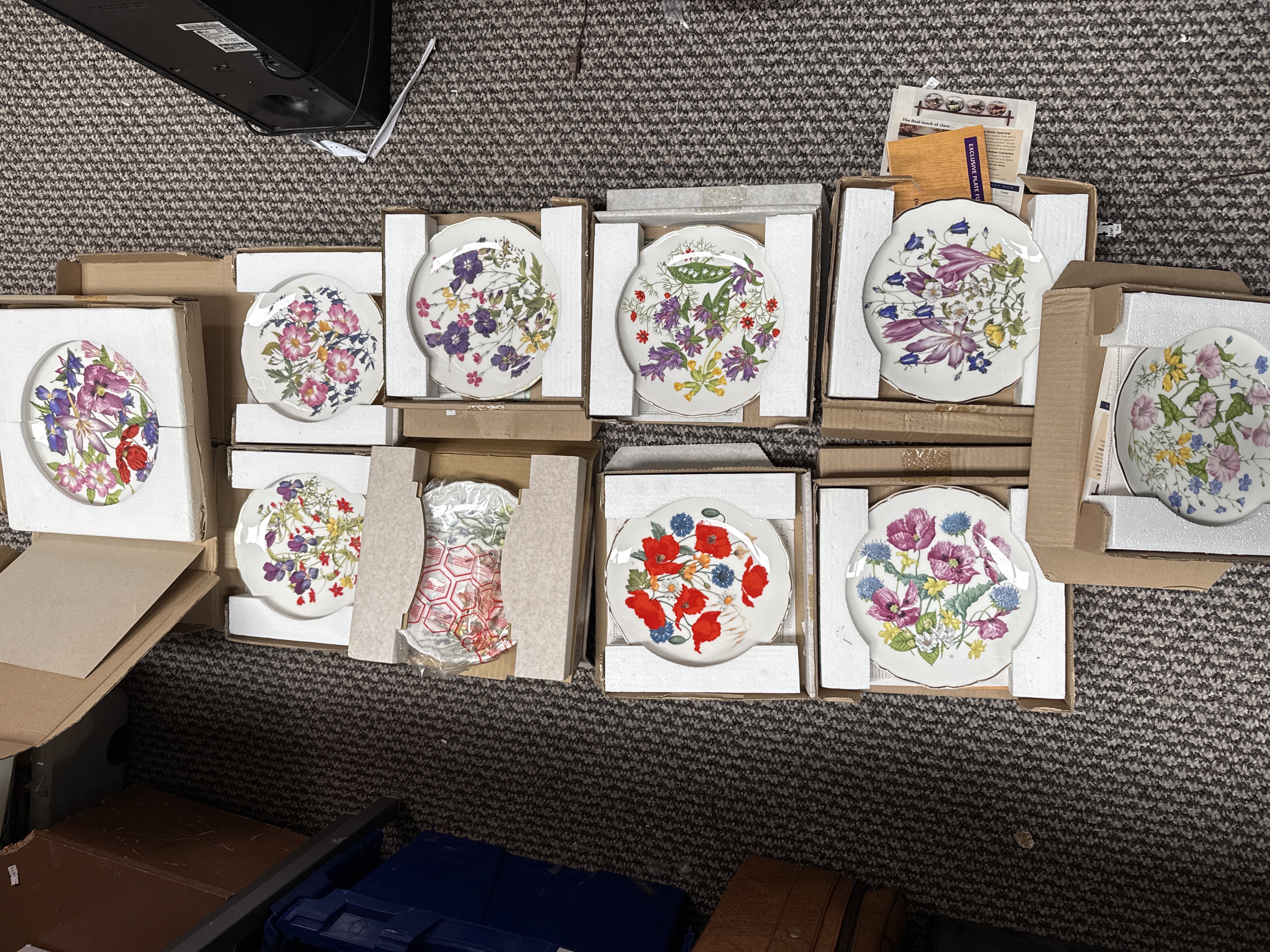 A set of ten bone china collector plates from the Britain’s Wild Flowers collection by Royal Albert. Each plate features a central botanical illustration by artist Jo Hague, depicting various species such as poppies, clematis, and primroses. The designs include the botanical nomenclature and the artist’s signature within the print. Each plate is finished with a fine gilt rim. The collection is housed in original cardboard shipping boxes with protective styrofoam inserts and includes related promotional materials and certificates of authenticity. The set reflects the fine floral porcelain traditions associated with Royal Albert and Crown Derby.