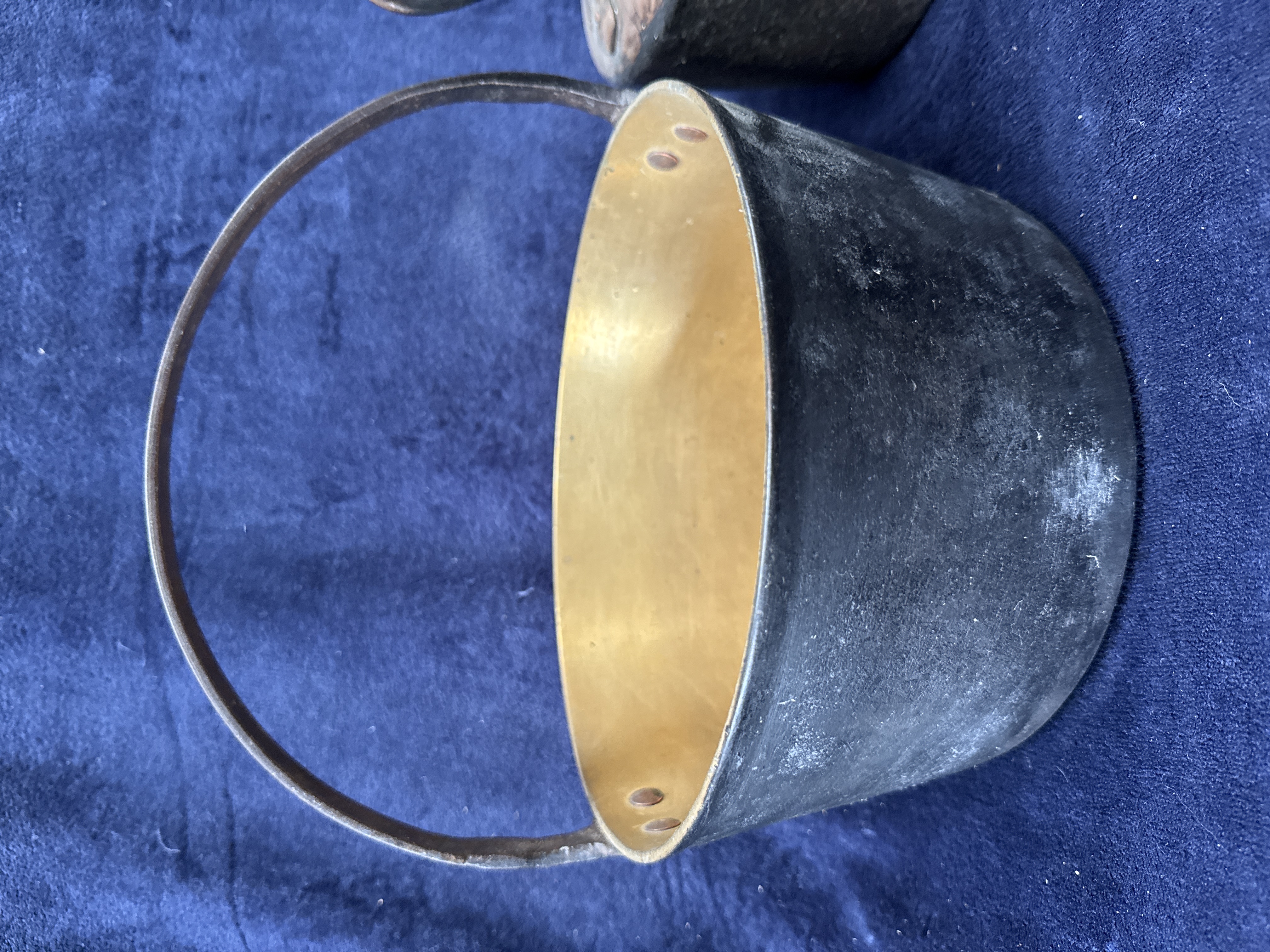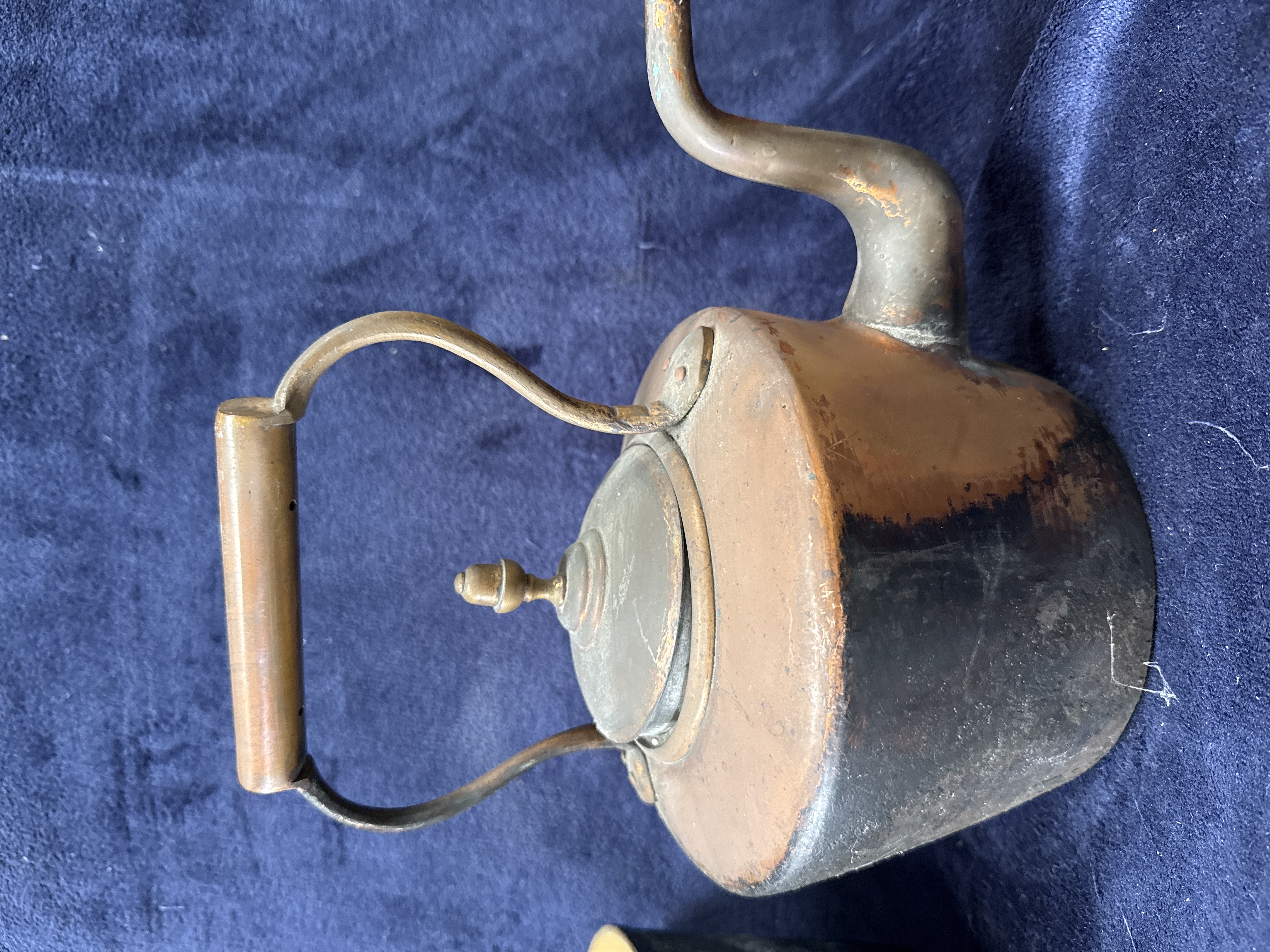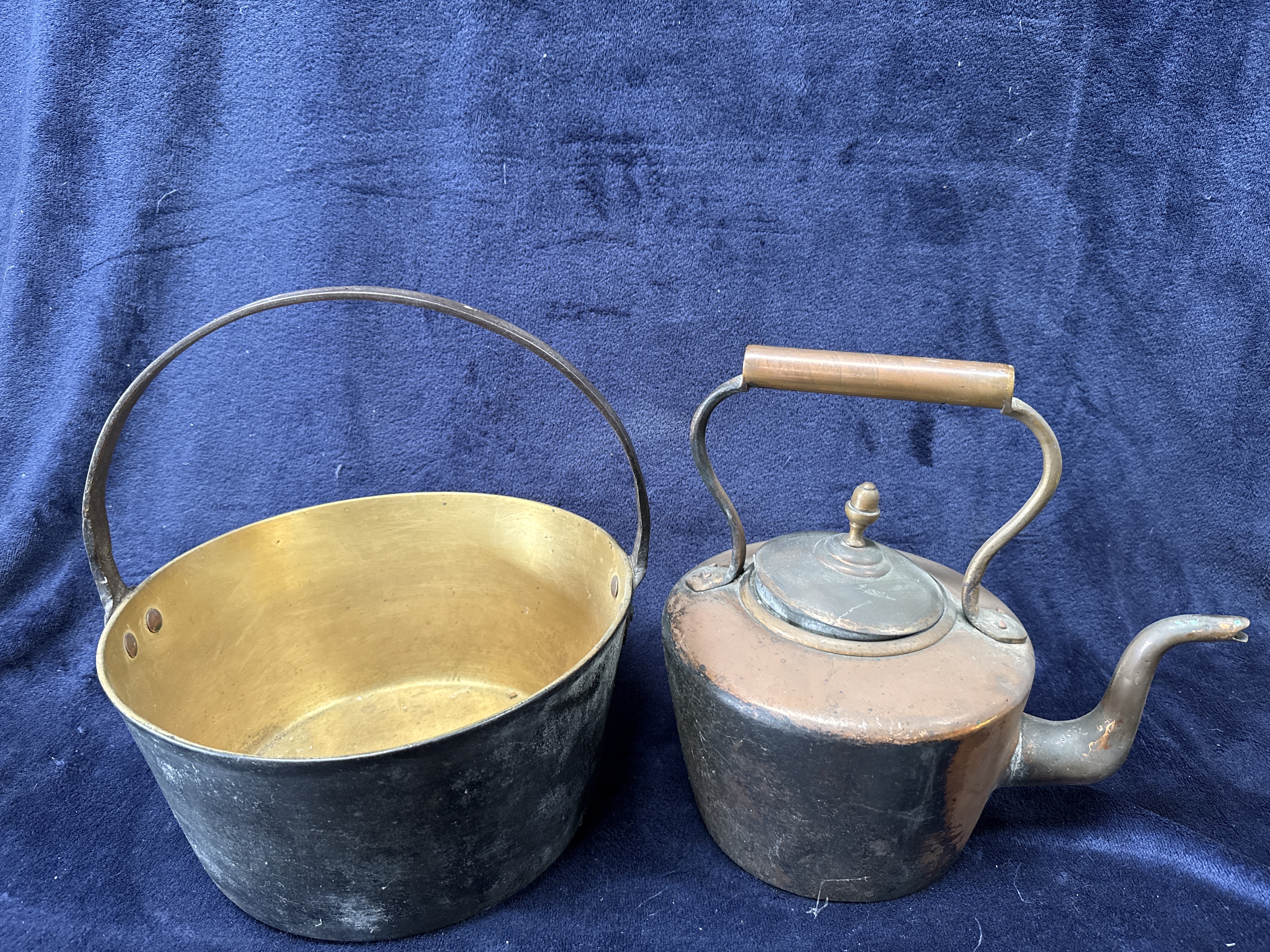 A collection of two antique metalware items associated with historic hearth use. The first item is a tea kettle constructed from copper, featuring a curved spout and a fitted lid topped with a decorative finial. It is equipped with a fixed overhead handle with a cylindrical grip. The second item is a round vessel, identified as a jam or preserve pan, featuring a polished brass interior and a heavily blackened exterior. It is fitted with a slender iron swinging bail handle secured to the body with rivets. Both pieces show evidence of traditional construction and lack visible manufacturer marks or inscriptions.