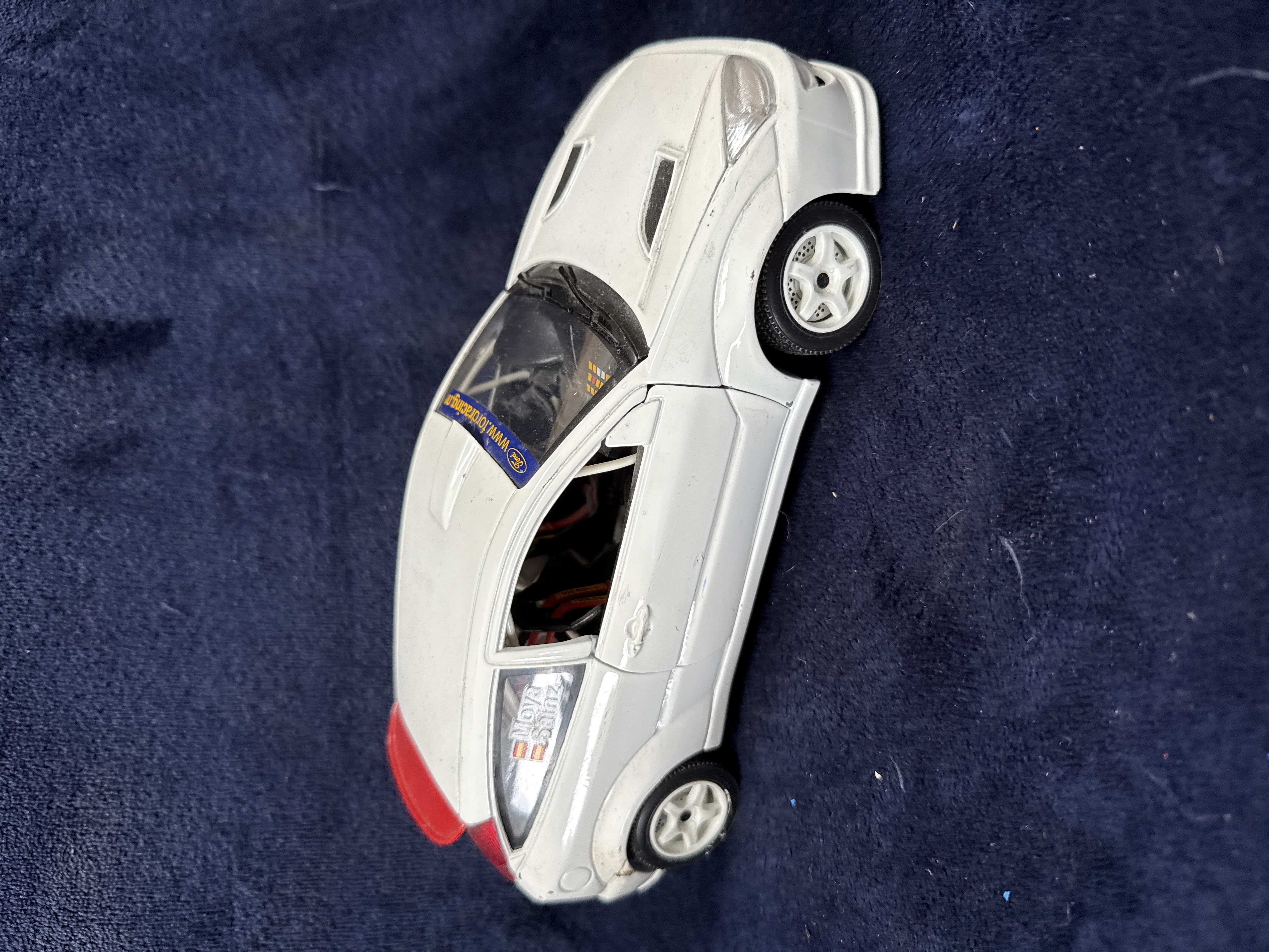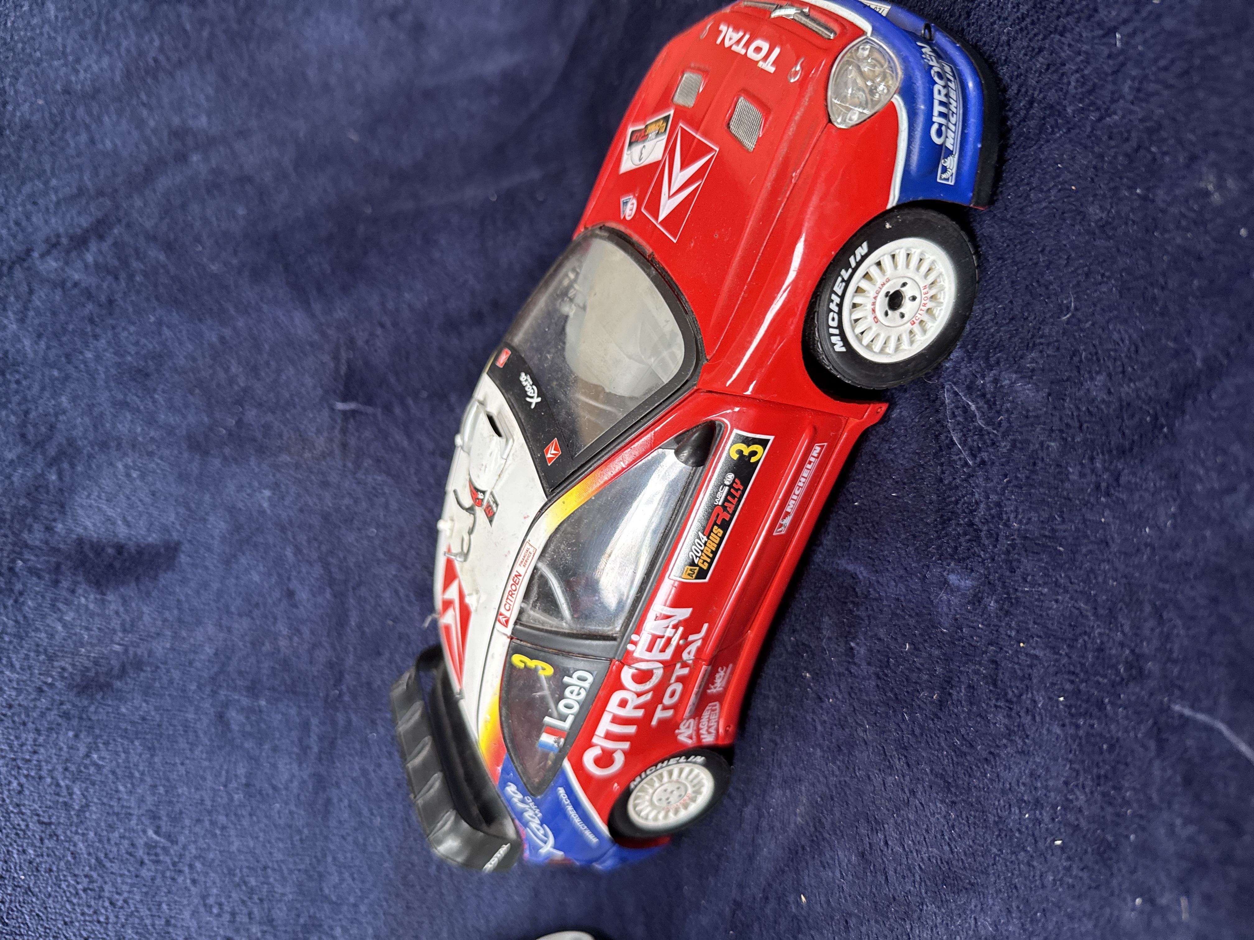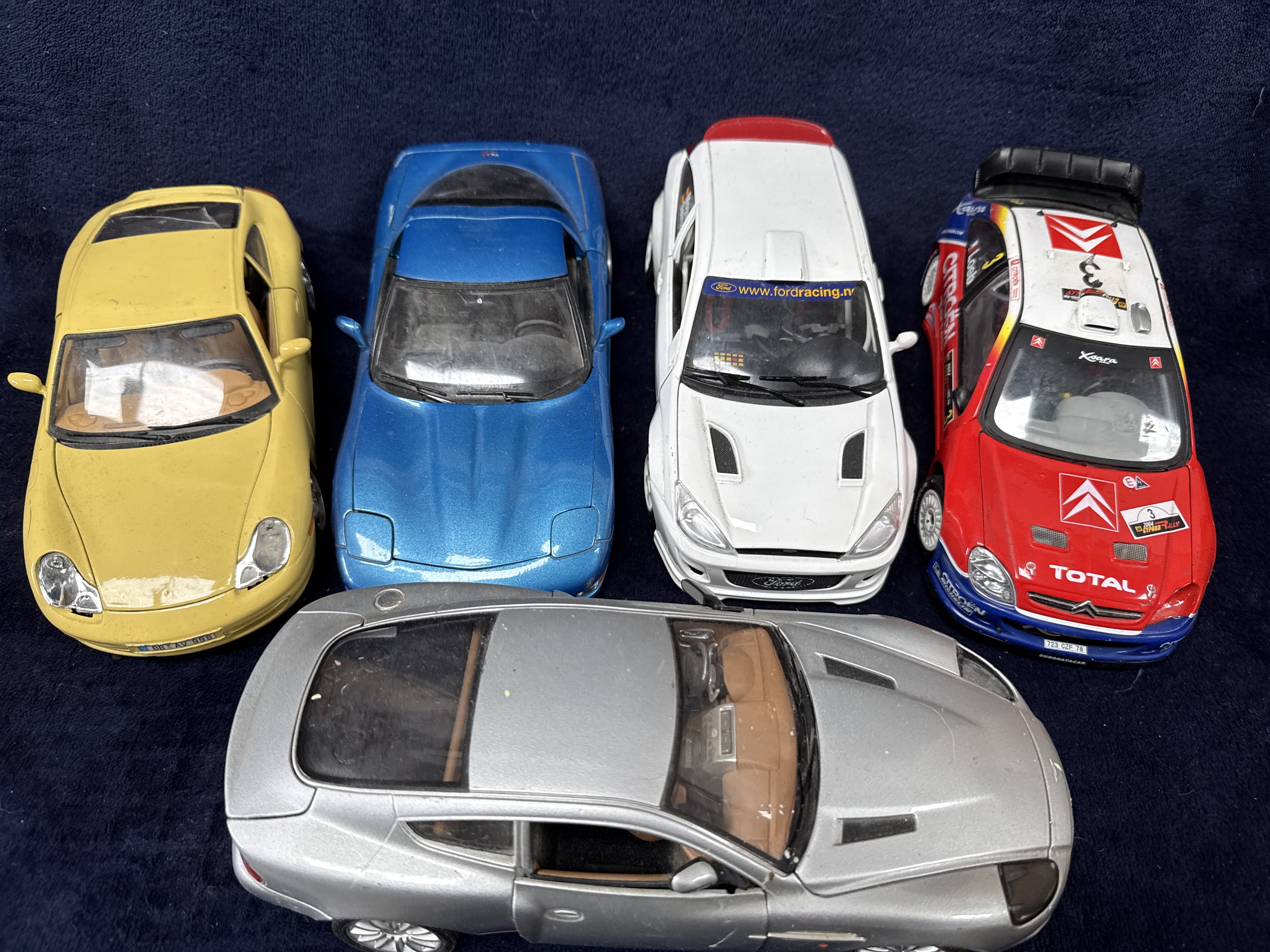 A collection of die-cast metal and plastic model vehicles in various scales. The group is led by a silver Aston Martin Vanquish, attributed to Kyosho and resembling the V12 model associated with the James Bond film series. The collection features two rally-specification vehicles: a red Citroën Xsara WRC with 2004 Cyprus Rally livery for driver Sébastien Loeb, featuring Total and Michelin sponsor decals, and a white Ford Focus WRC with McRae and Sainz team markings and Ford Racing branding including the web address www.fordracing.net. Also included are a yellow Porsche 911 and a blue metallic Chevrolet Corvette. The models are finished with period-accurate liveries and detailed interior components.