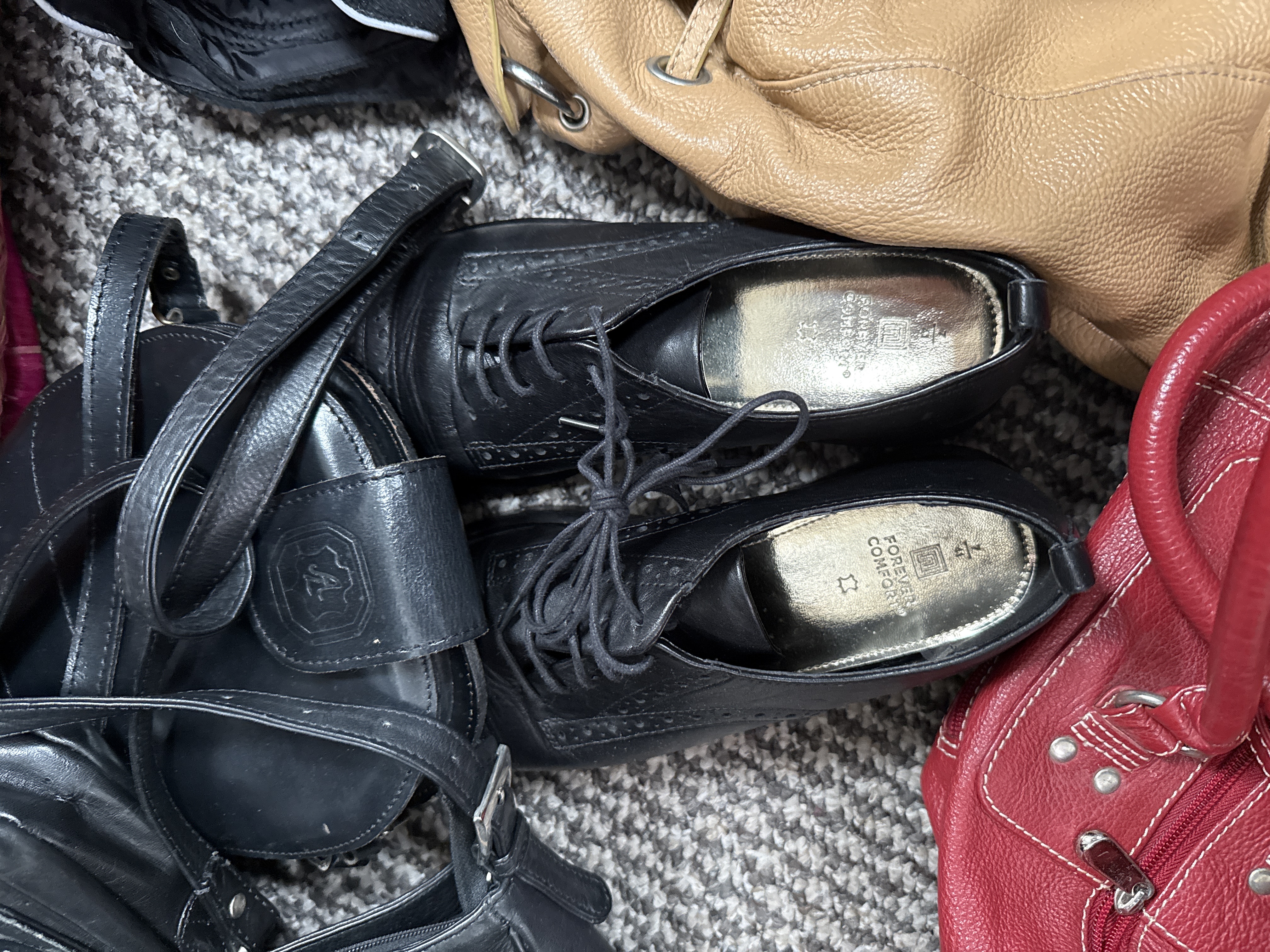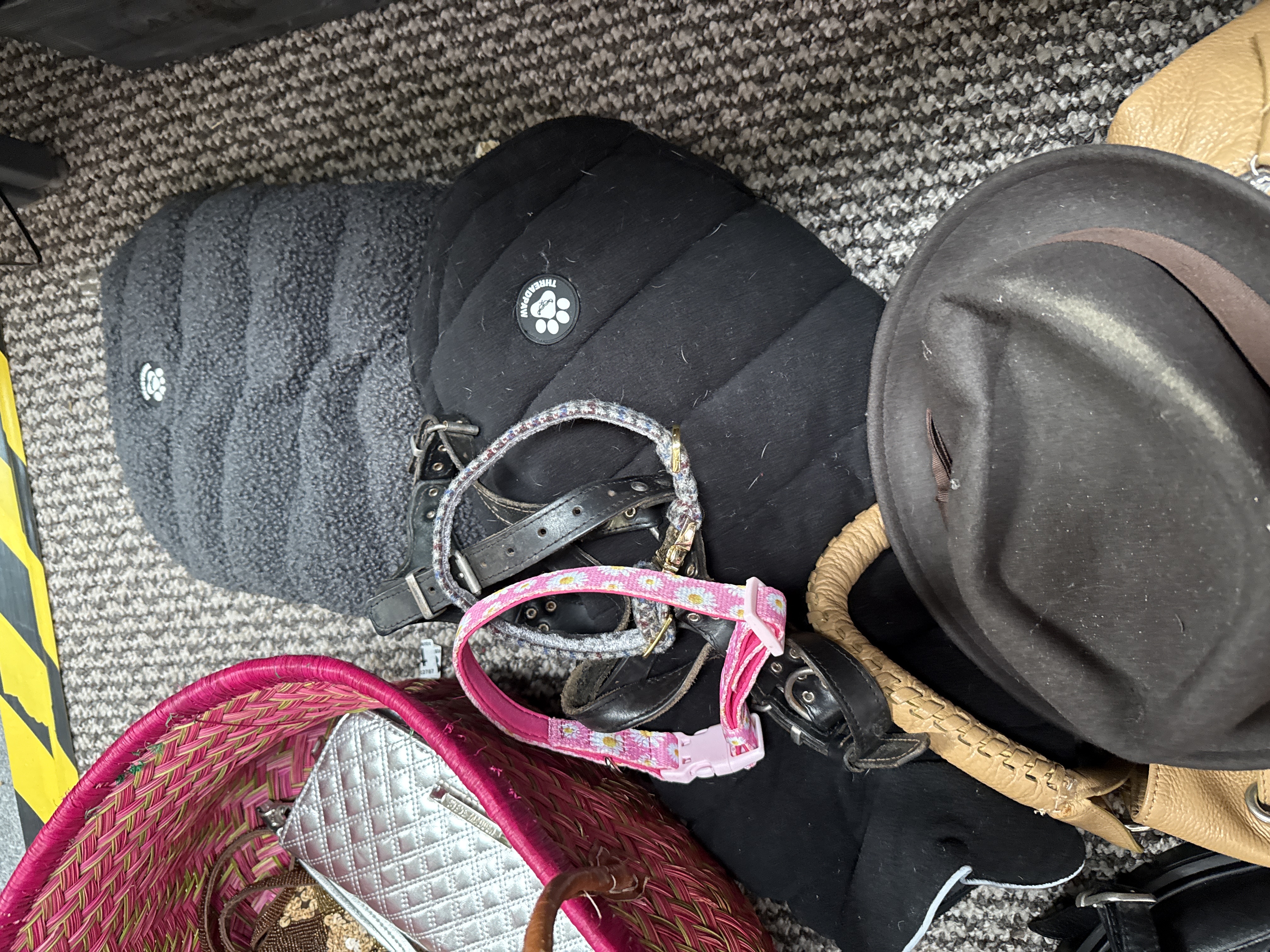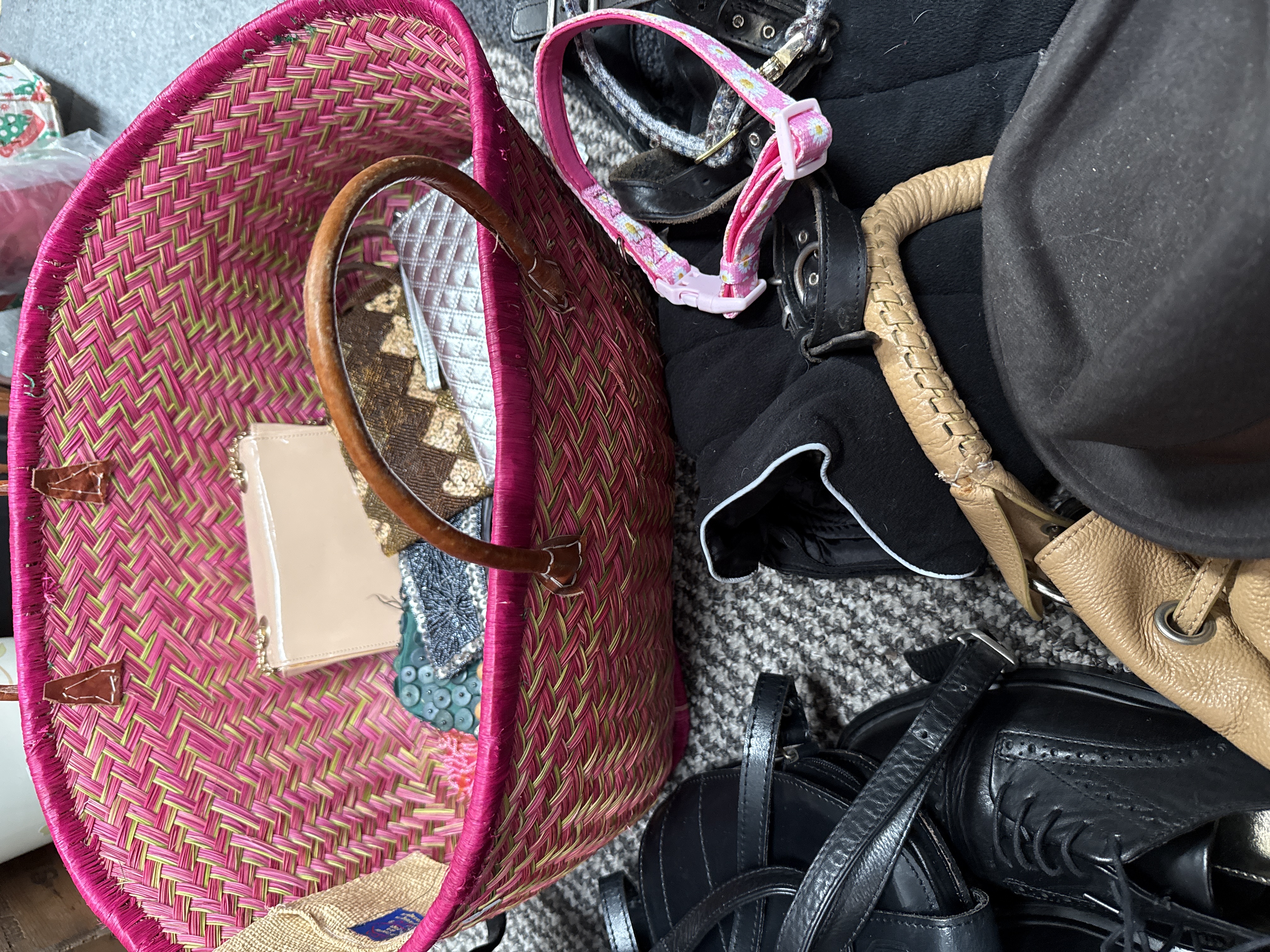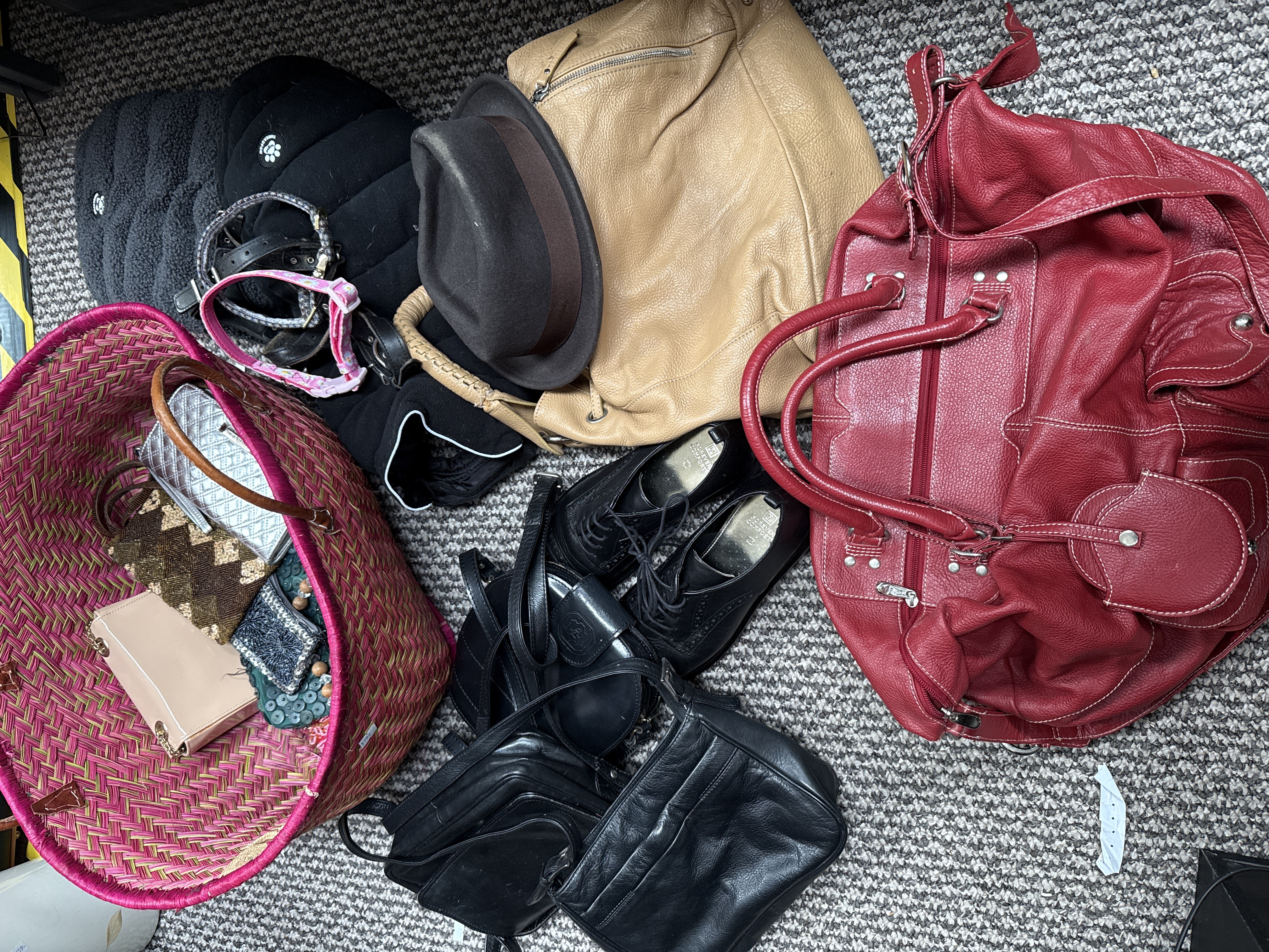 An assortment of personal accessories and pet-related items, confirmed to be mostly leather. The collection includes several leather handbags in red, tan, and black finishes. Notable among these is a large red grained leather holdall featuring twin top handles and multiple external zip compartments, and a tan leather handbag with a braided shoulder strap. Footwear consists of a pair of black leather lace-up brogue shoes with gold-tone insoles marked Forever Comfort. Also present is a dark brown felt hat with a ribbon band. A large pink and natural woven straw tote contains a group of smaller items, including a silver-tone quilted clutch, a tan leather purse, and beaded accessories. Pet accessories comprise a black quilted pet coat with a paw print emblem by Threadpaw, a grey fleece garment, and various collars in pink floral, grey, and black leather styles. One black leather bag features an embossed shield logo containing the letter A.