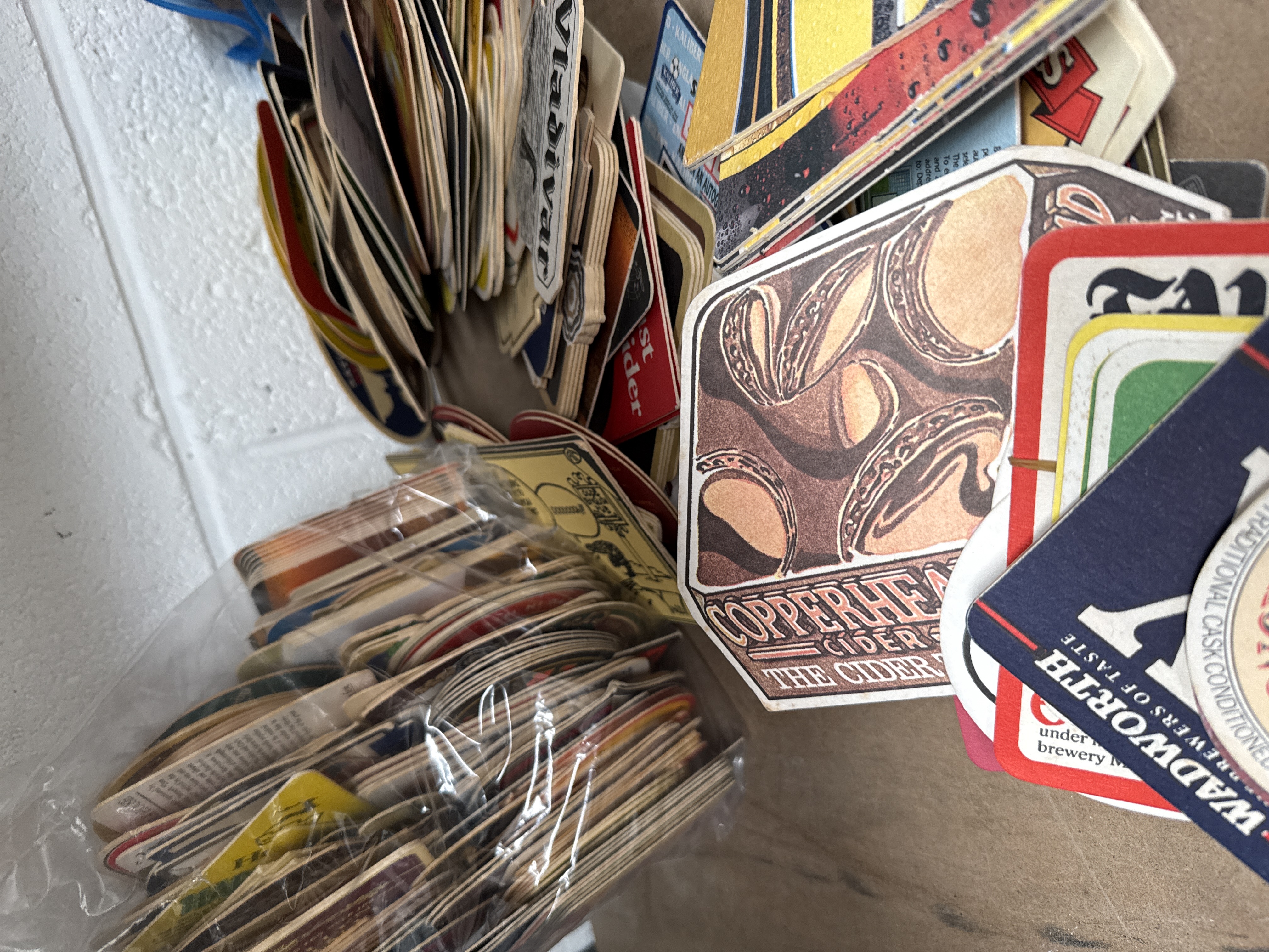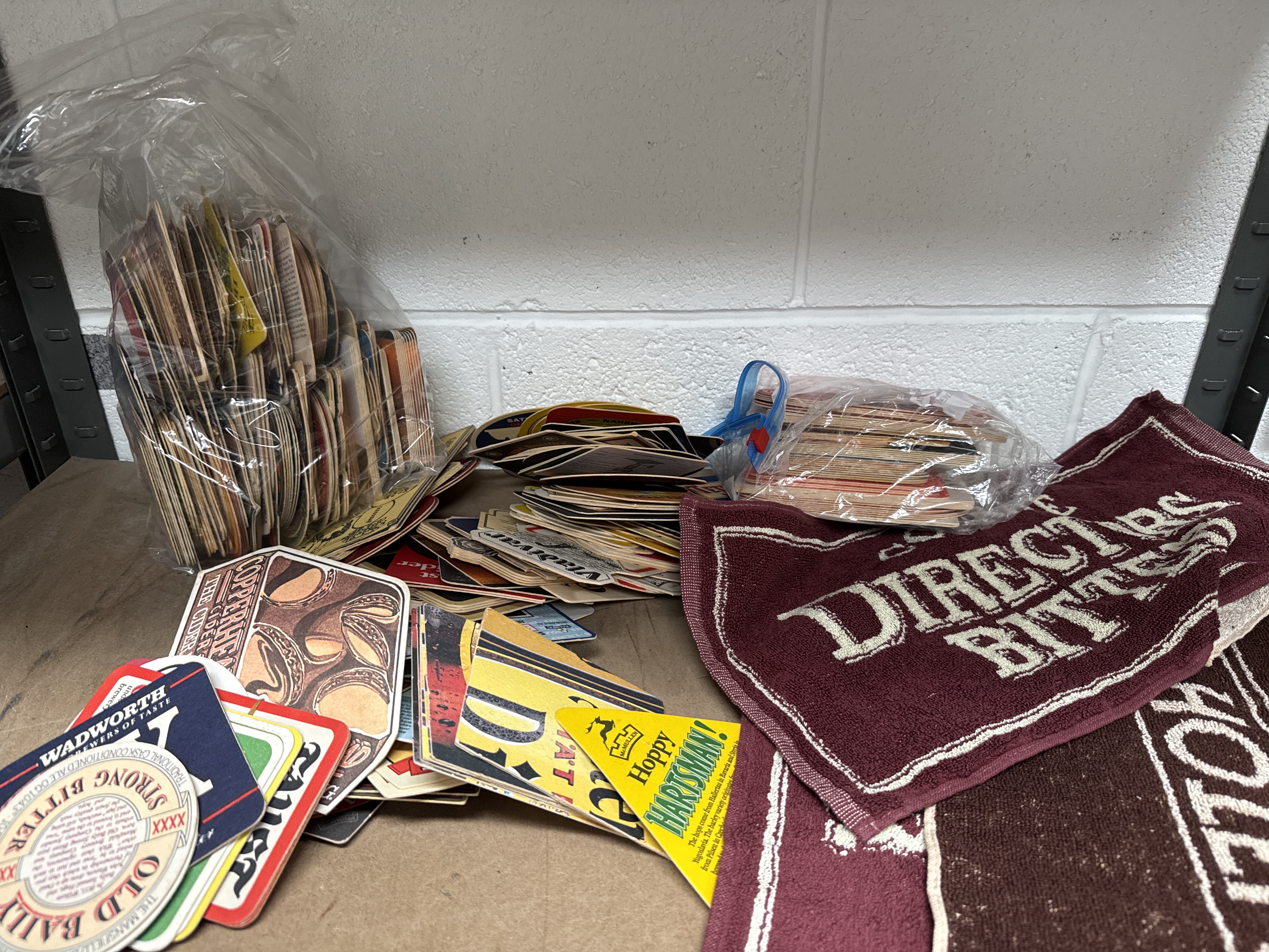 A collection of vintage breweriana and pub advertising ephemera. The lot includes a maroon textile bar towel featuring branding for Directors Bitter. Also included is a large quantity of cardboard and paper beer mats from various breweries and brands. Visible branding includes Wadworth, Strong Bitter, Old Baily, Copperhead Cider, Hoppy Hartsman, and Vladivar. The mats feature various graphic designs, shapes, and logos typical of mid- to late 20th-century pub advertising. A portion of the collection is organised within clear plastic bags, while the remainder is loose.