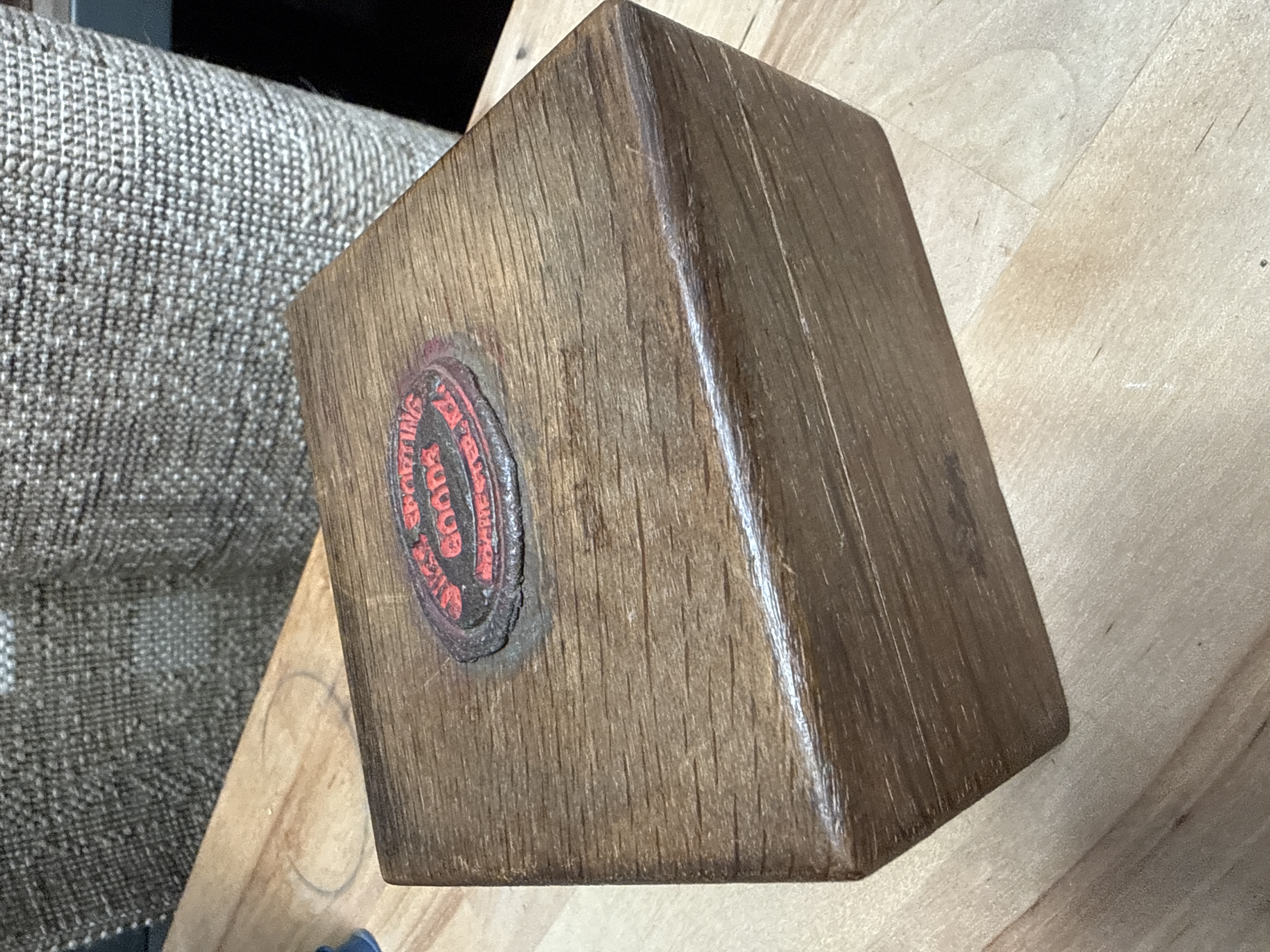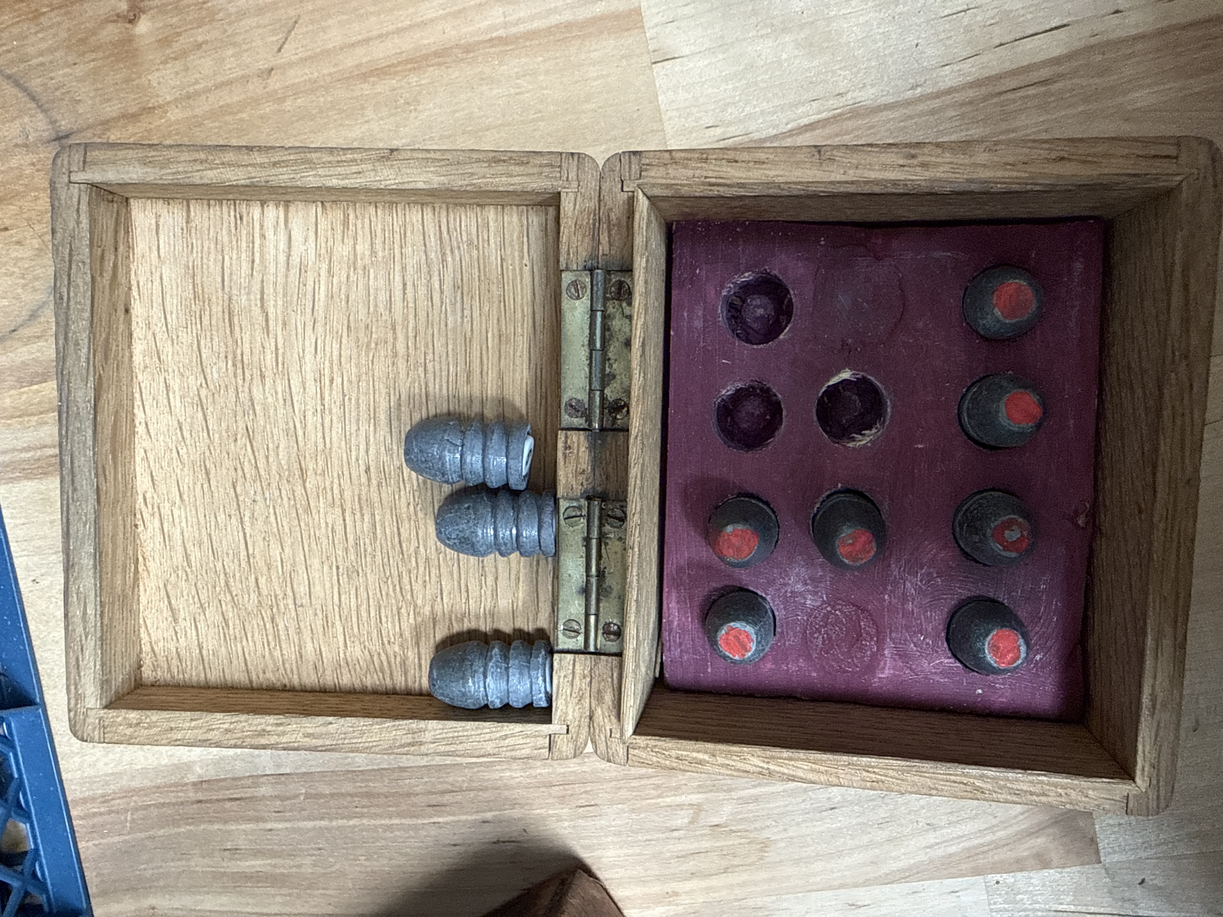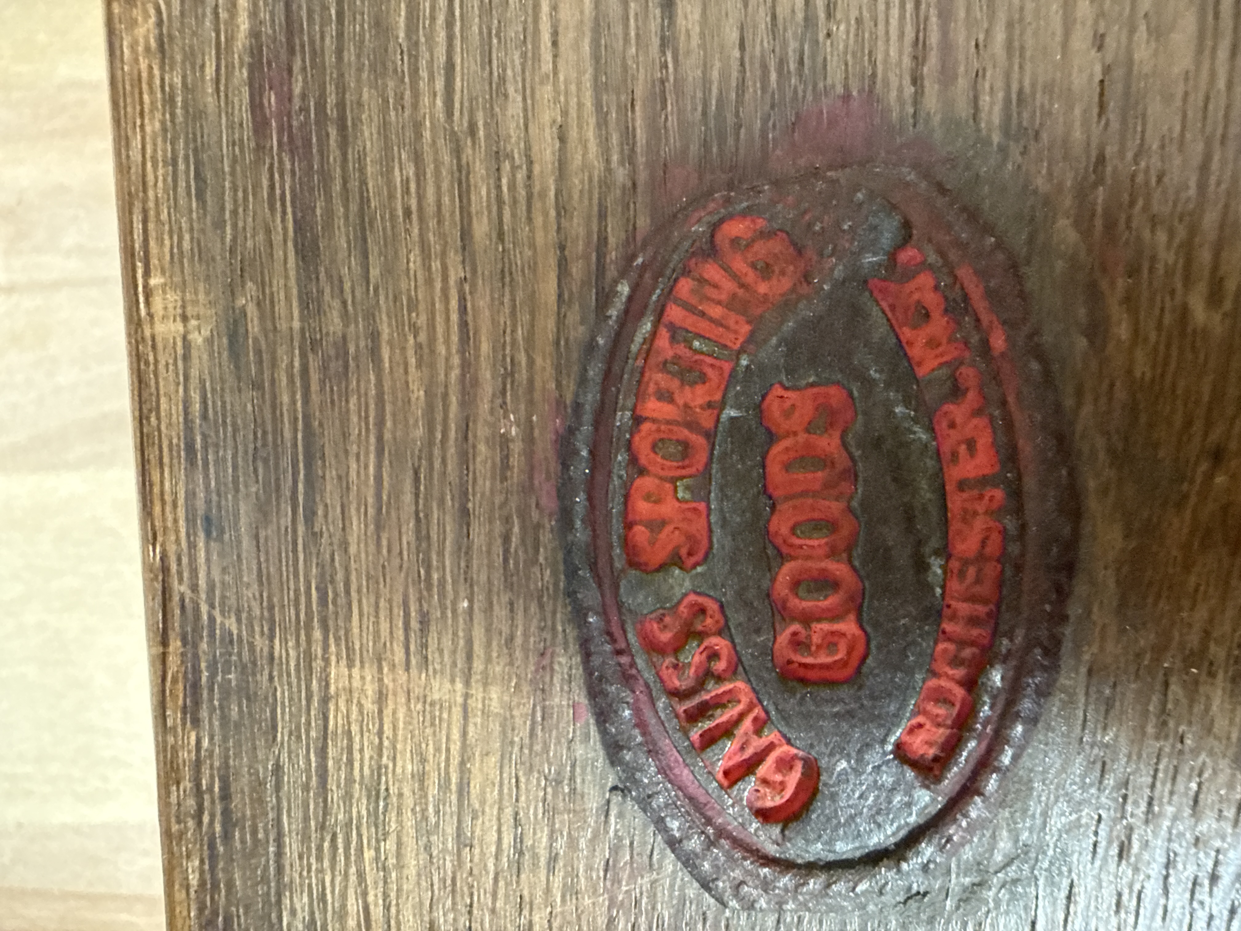 A collection of vintage cast lead projectiles presented within a rectangular wooden storage box. The projectiles are of cylindrical form with grooved sides and rounded tips, several of which feature a red-coloured coating to the ends. The wooden box is constructed with a hinged lid and features an oval-shaped brand to the exterior finished in red lettering, reading GAUSS SPORTING GOODS ROCHESTER, N.Y. The interior of the box contains a purple foam insert with pre-cut circular slots designed to house the projectiles.