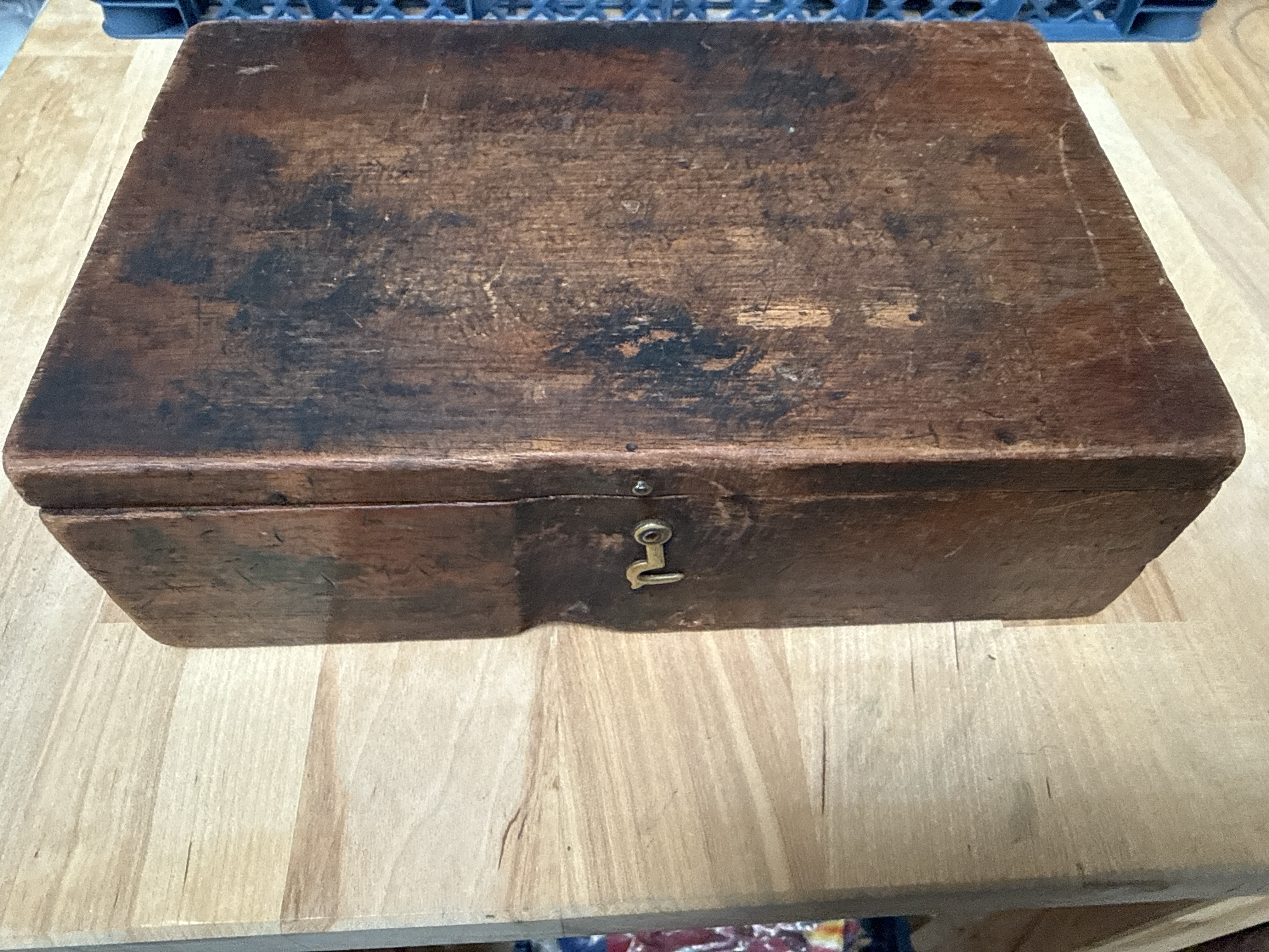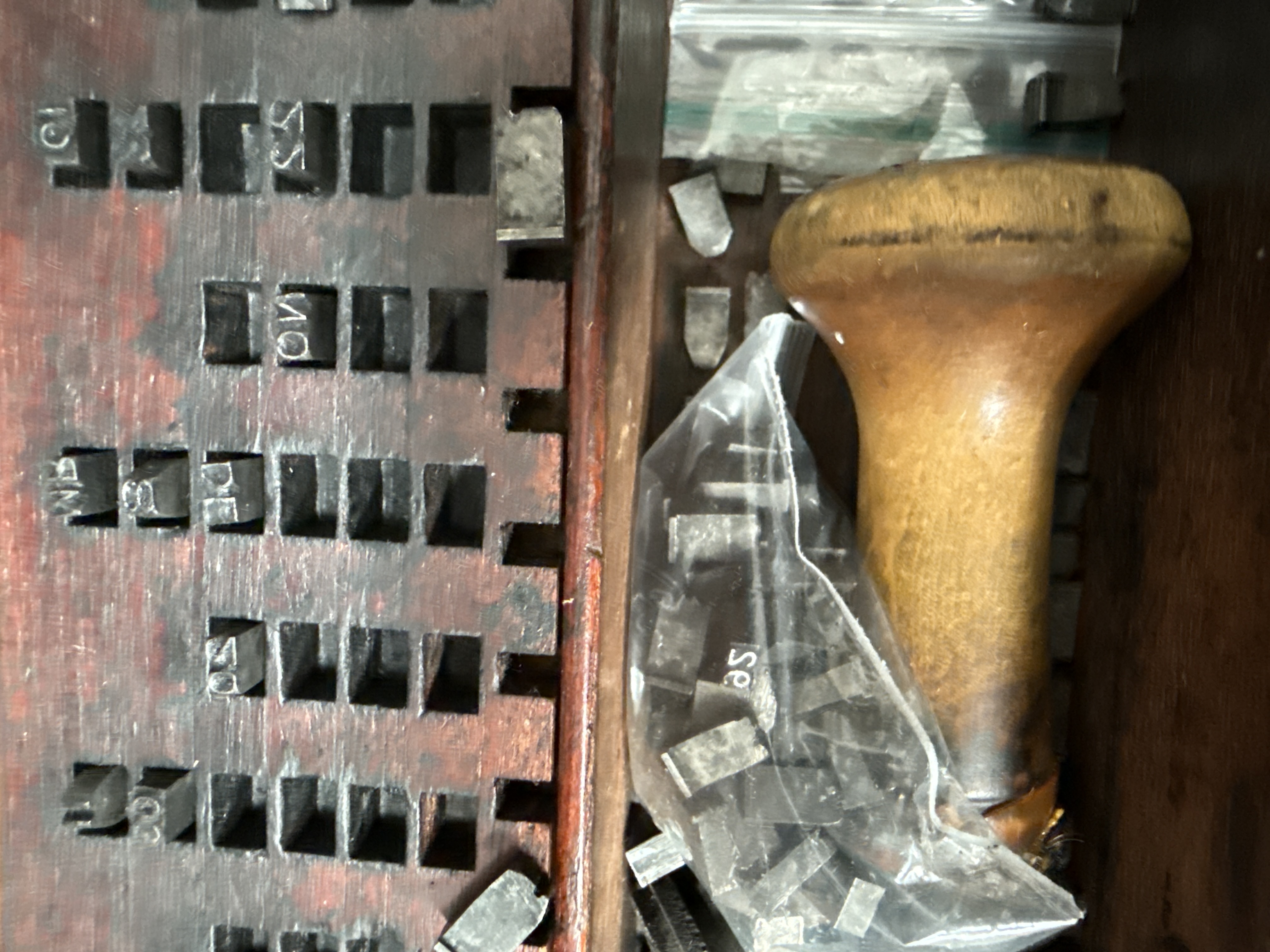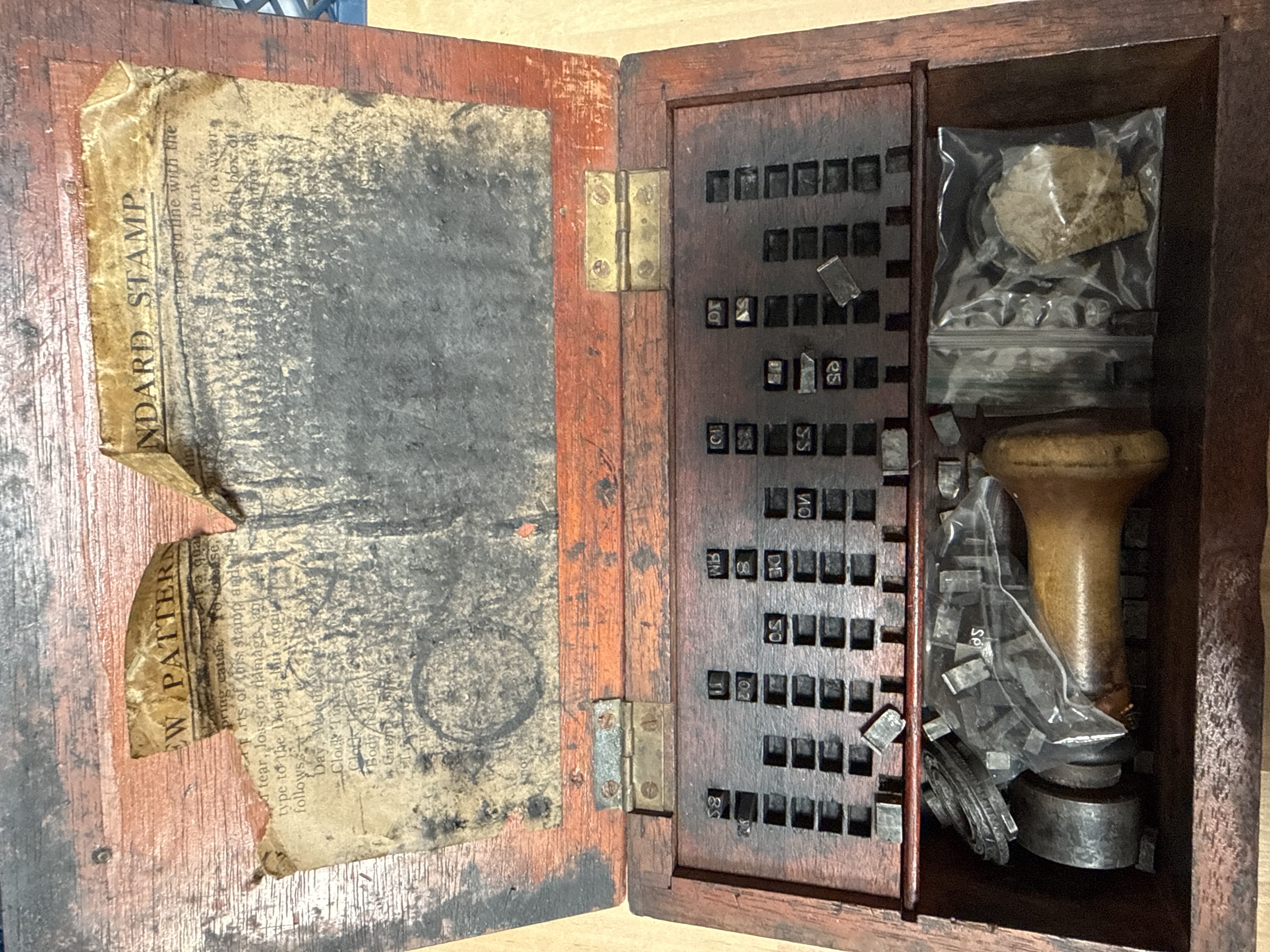 A wooden boxed printing set featuring a rectangular weathered case with a brass hook latch and hinges. The interior lid contains a worn and partially torn paper label with the text STANDARD STAMP and NEW PATTERN. The interior is divided into a gridded section for the organisation of metal typeset character blocks and a larger open compartment. The set includes a turned wooden stamp handle, various metal character blocks with raised alphanumeric characters, and circular metal components. Some components are housed in modern plastic bags.