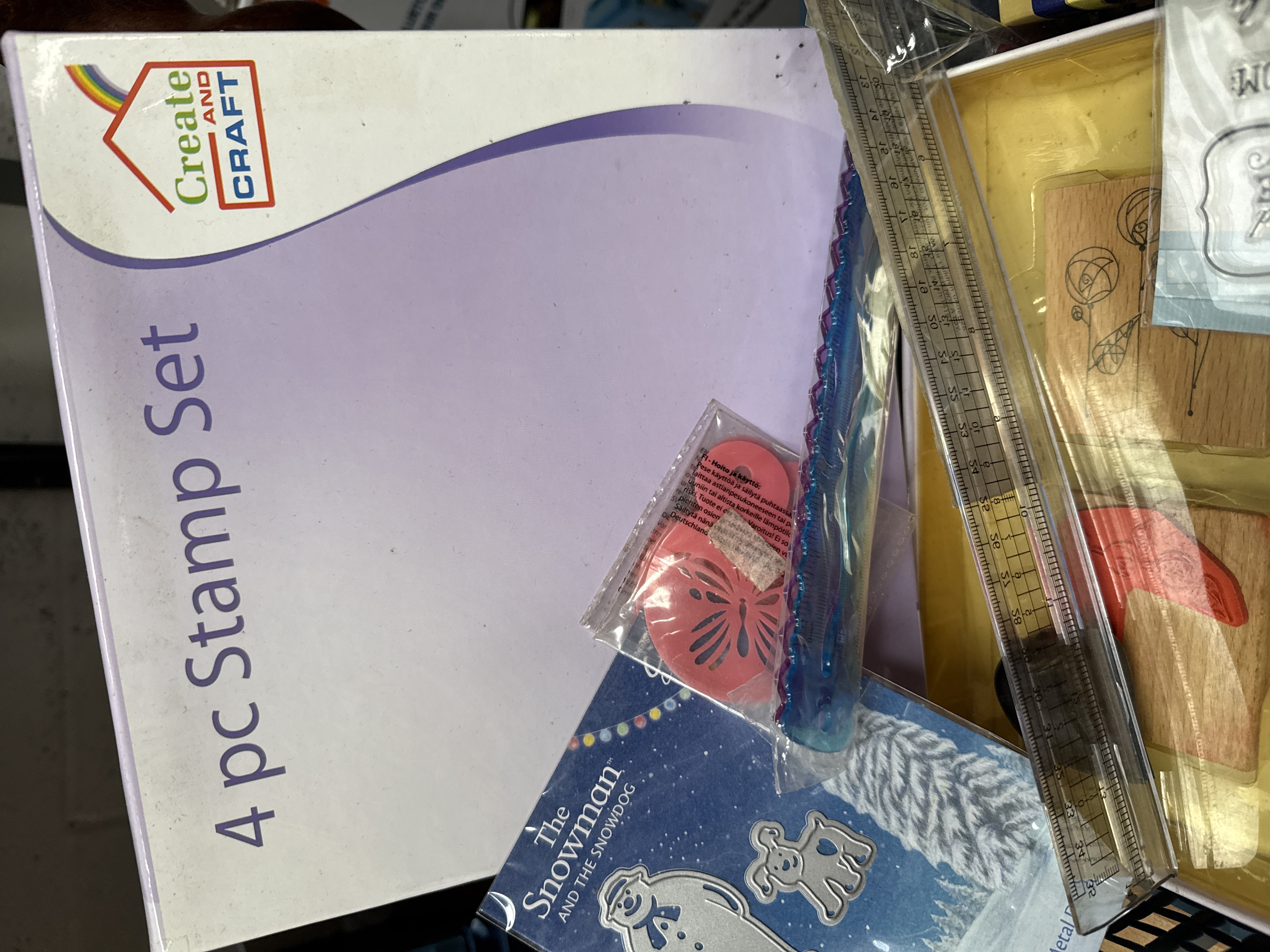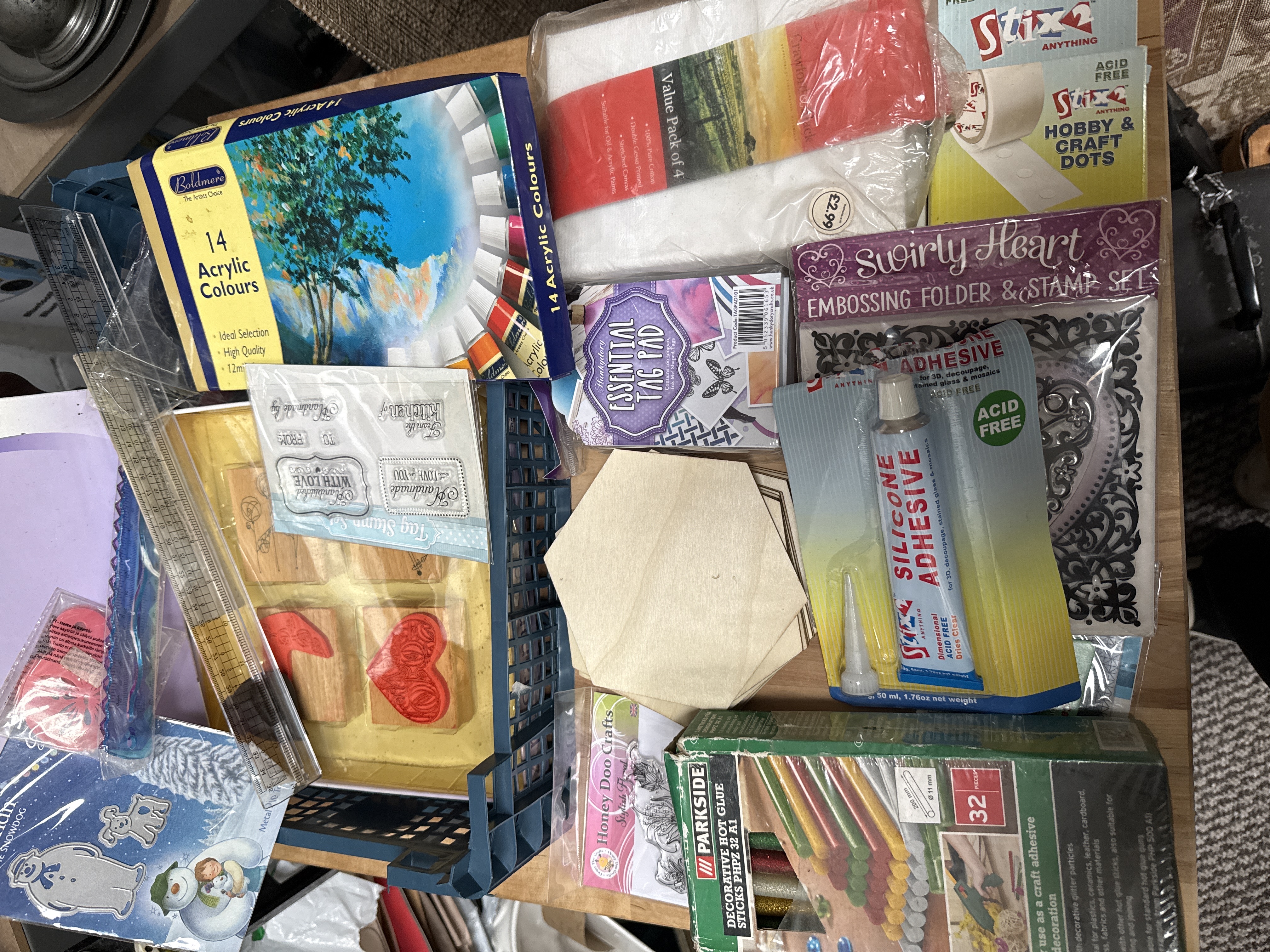 A collection of various arts and crafts materials and equipment. The assortment includes a Boldmere set of 14 acrylic colours and a Hunkydory value pack of four stretched cotton canvases. Adhesive products comprise a tube of Stix 2 silicone adhesive, Stix 2 hobby and craft dots, and a box of 32 Parkside decorative glitter hot glue sticks. Stamping and embossing items include a Swirly Heart embossing folder and stamp set, a Create and Craft four-piece stamp set, Honey Doo Crafts stamps, and several individual rubber stamps mounted on wooden blocks featuring various designs. Additional components include a Hunkydory Essential Tag Pad, wooden hexagonal cutouts, a clear plastic ruler, and The Snowman and the Snowdog themed craft materials.