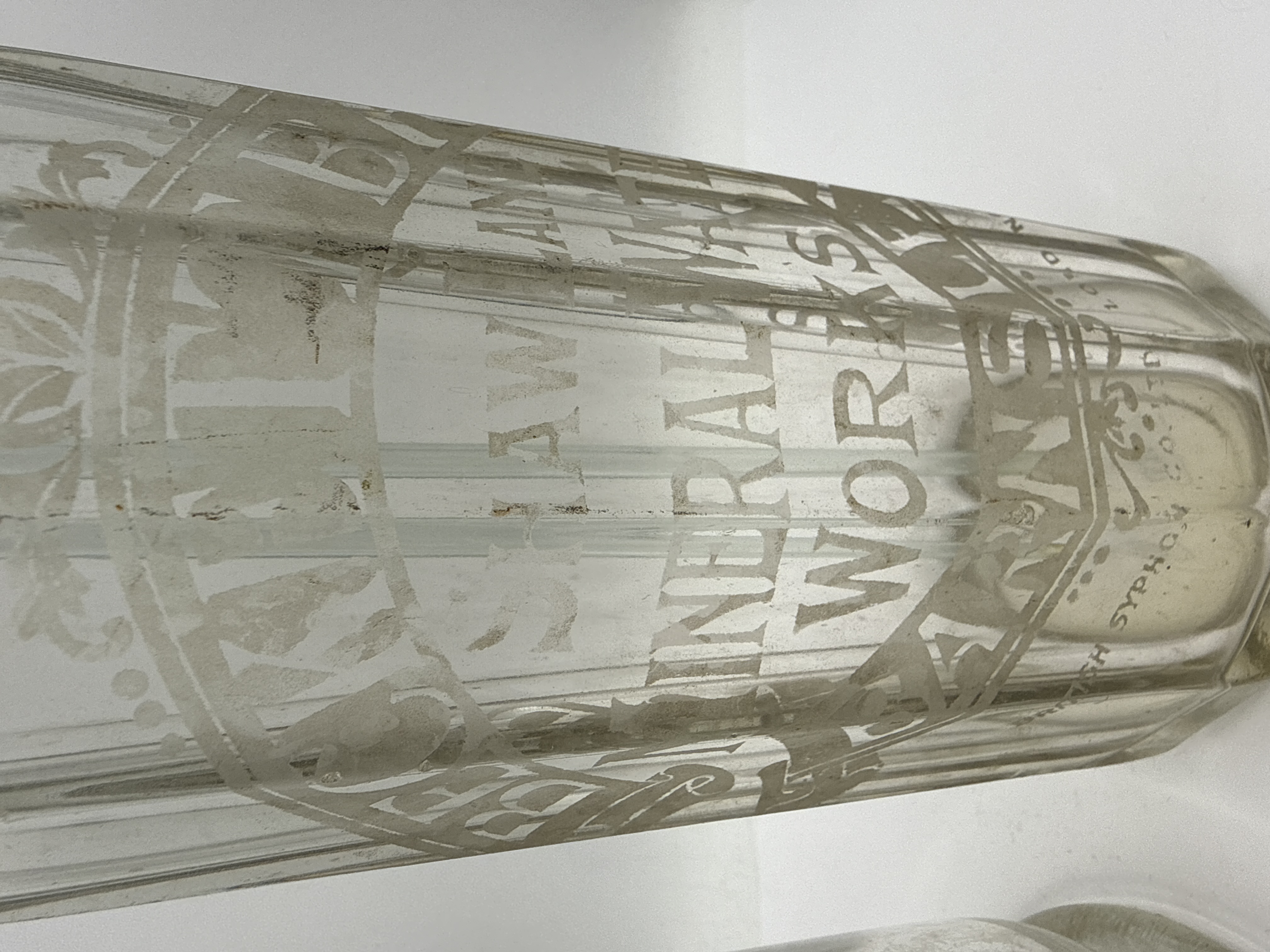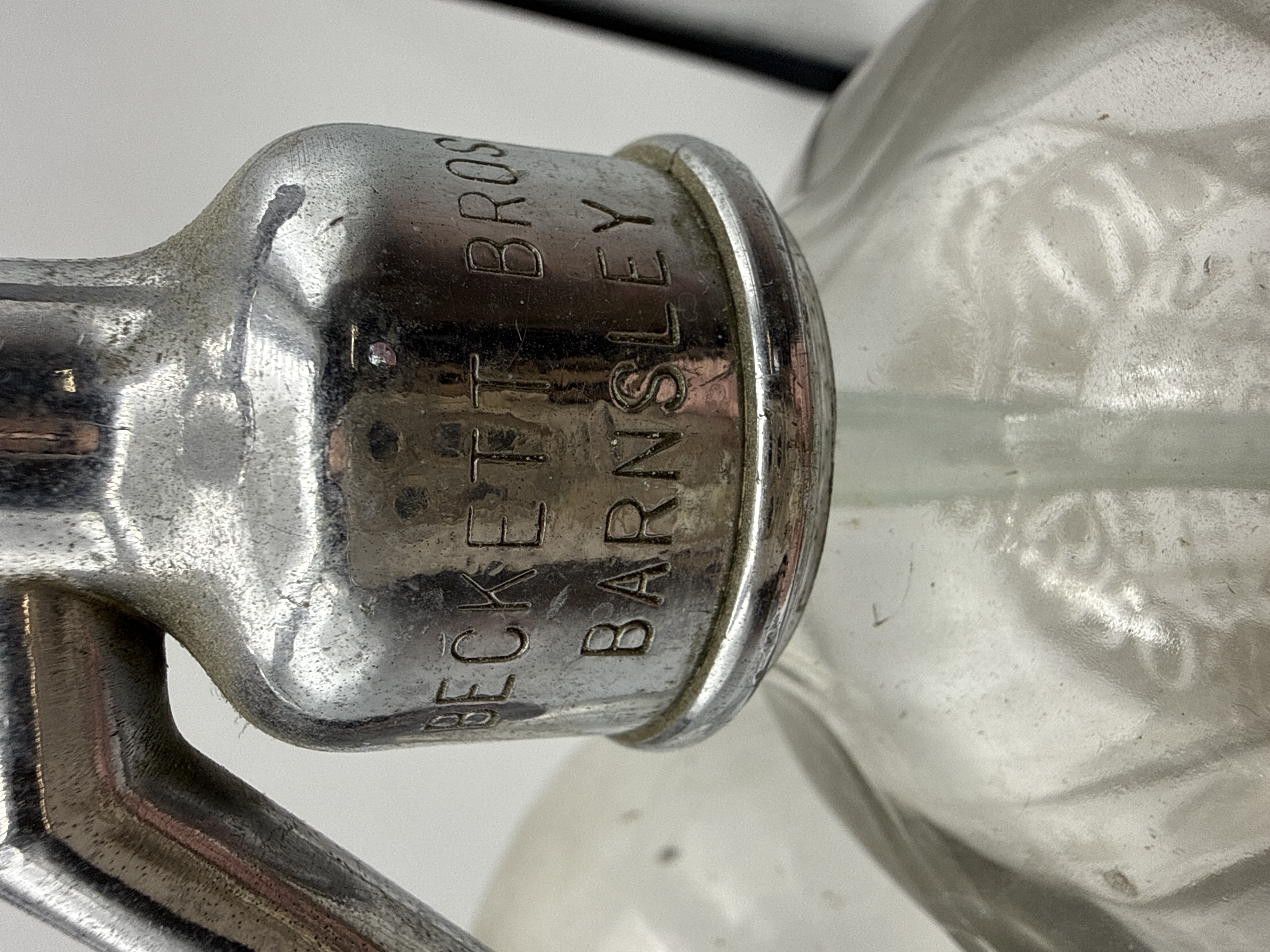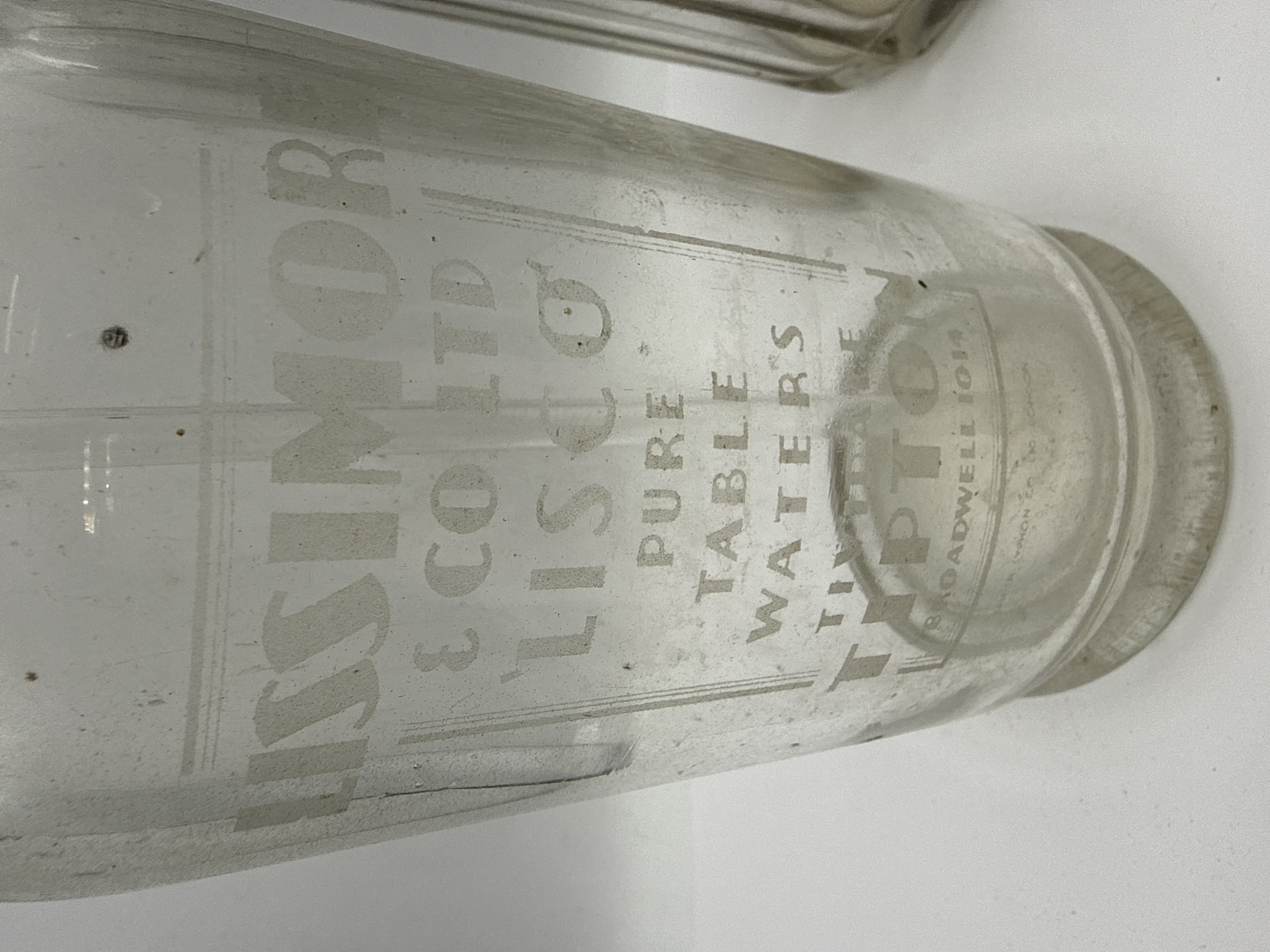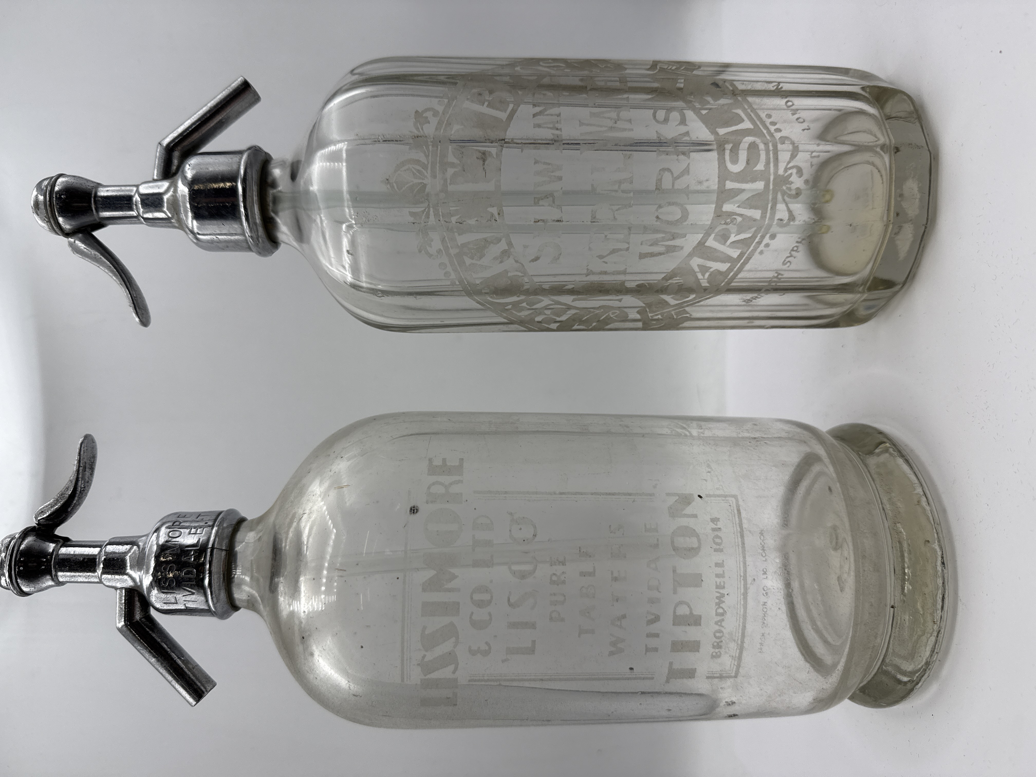 This lot comprises two glass soda syphons from British mineral water manufacturers. The first example features a fluted glass body with acid-etched branding for Beckett Bros Shaw Lane Mineral Water Works Barnsley. It is fitted with an engraved metal spout marked Beckett Bros Barnsley. The second syphon is a smooth-bodied vessel with a flared base, bearing an etched label for Lissimore and Co Ltd Lisco Pure Table Waters Tividale Tipton, with a corresponding engraved metal top. Both vessels retain their internal glass dip tubes and are marked for the British Syphon Co. Ltd. London.