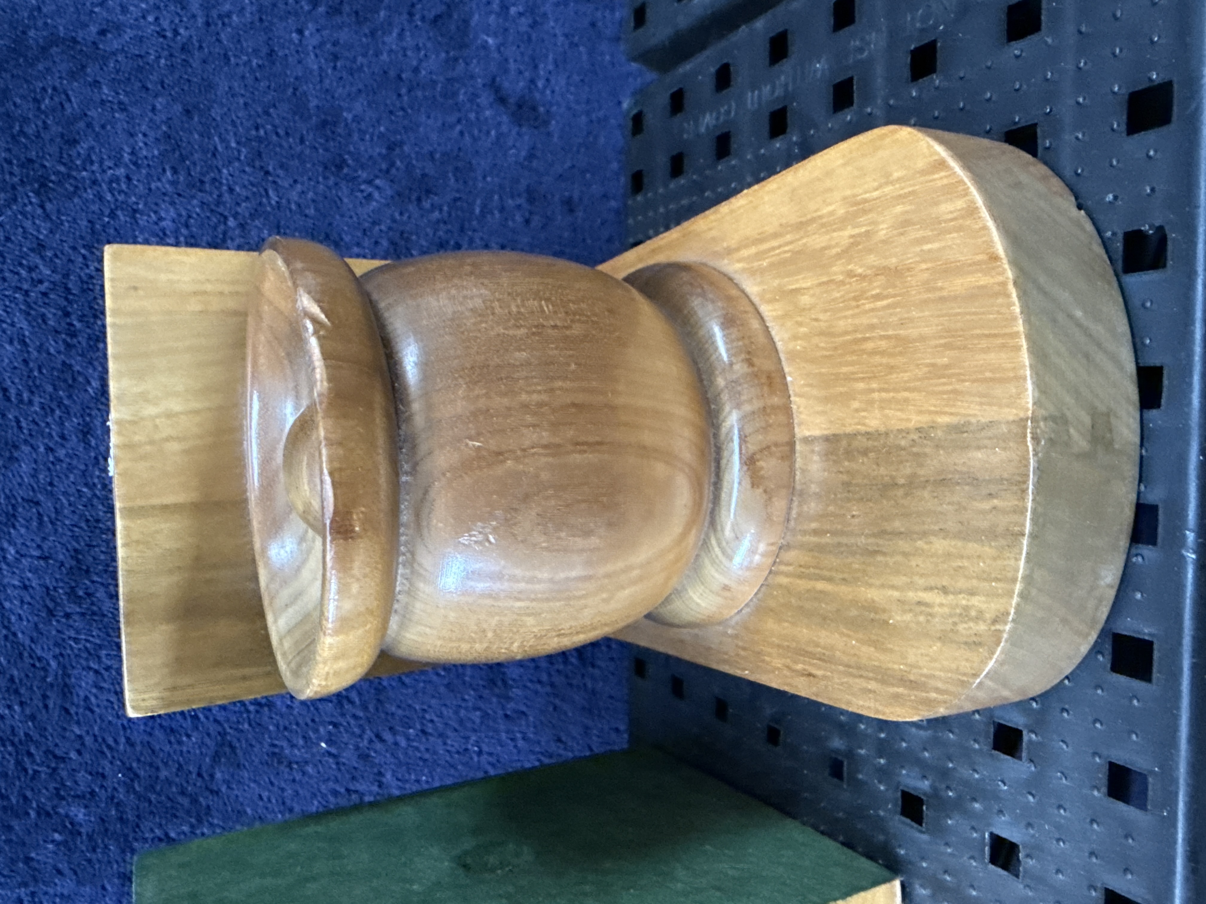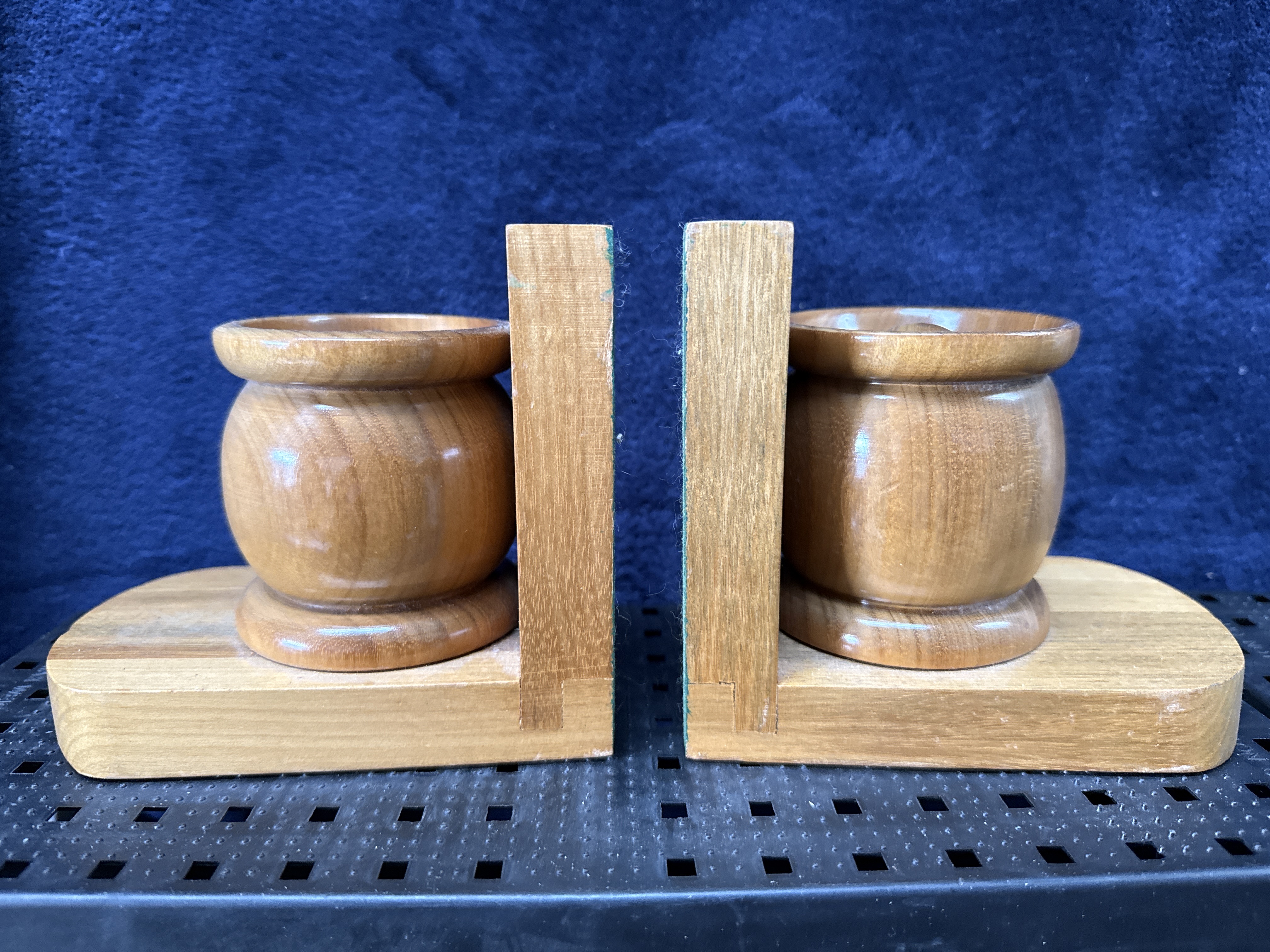 A pair of bookends of modernist design, each constructed from light-toned wood with a polished glossy finish. The items feature an L-shaped base with a rounded front edge, supporting a centrally mounted turned decorative element in the form of a bowl or vessel. The inner vertical faces are lined with green felt. The wood displays a distinct natural grain throughout.