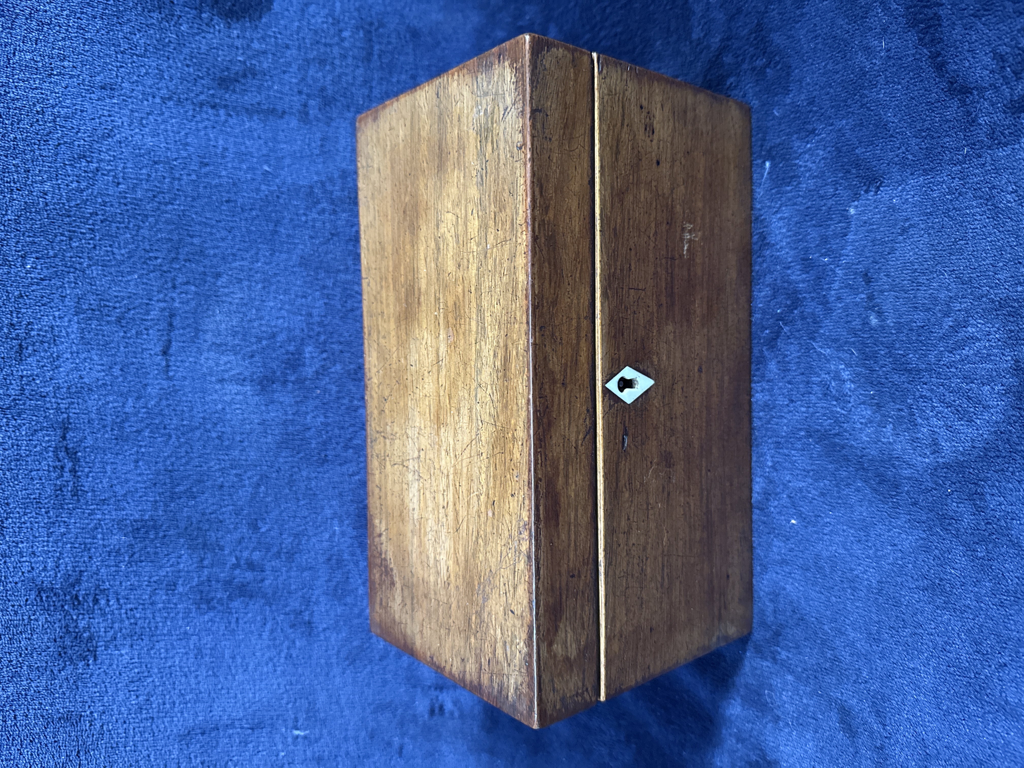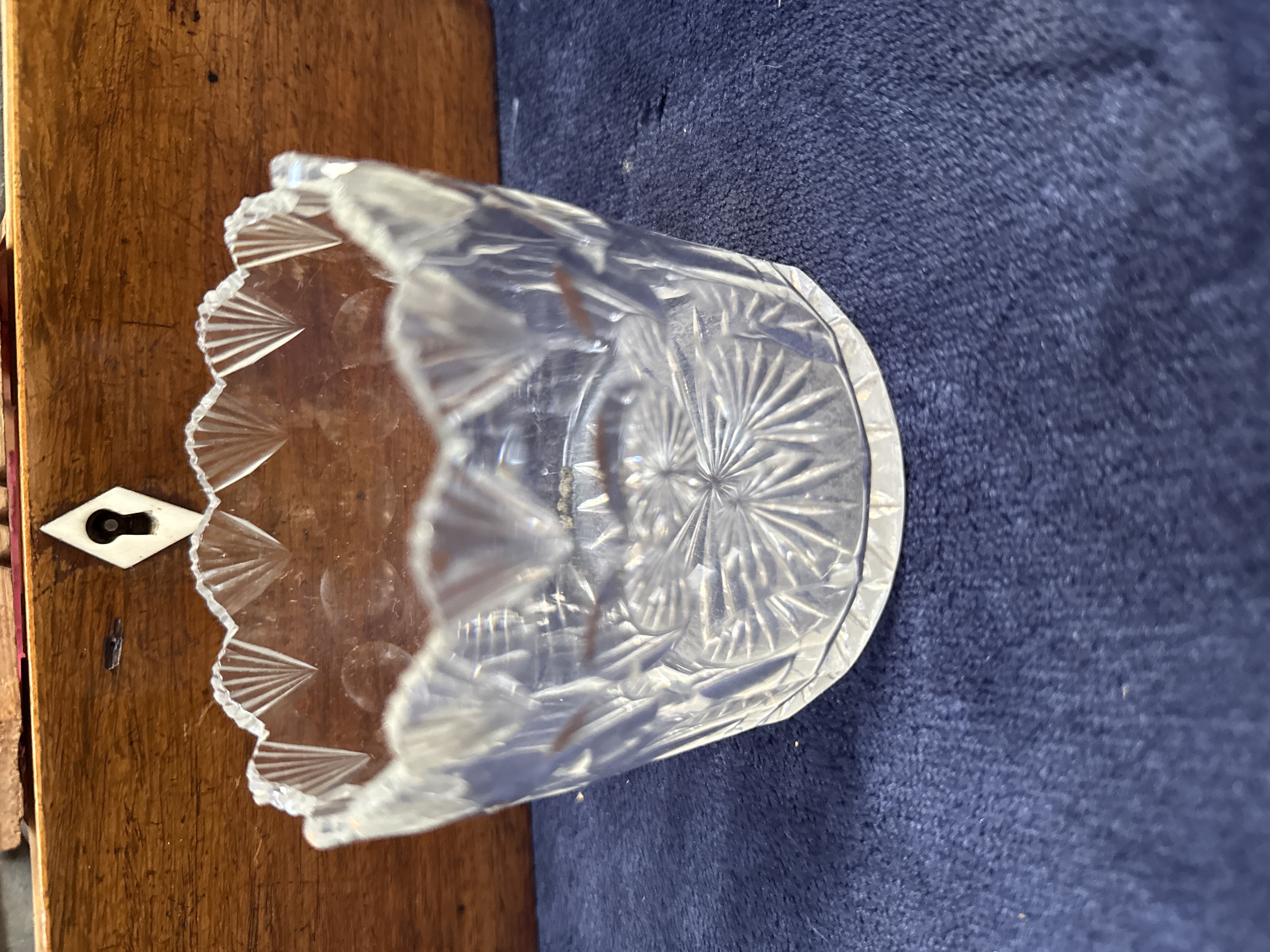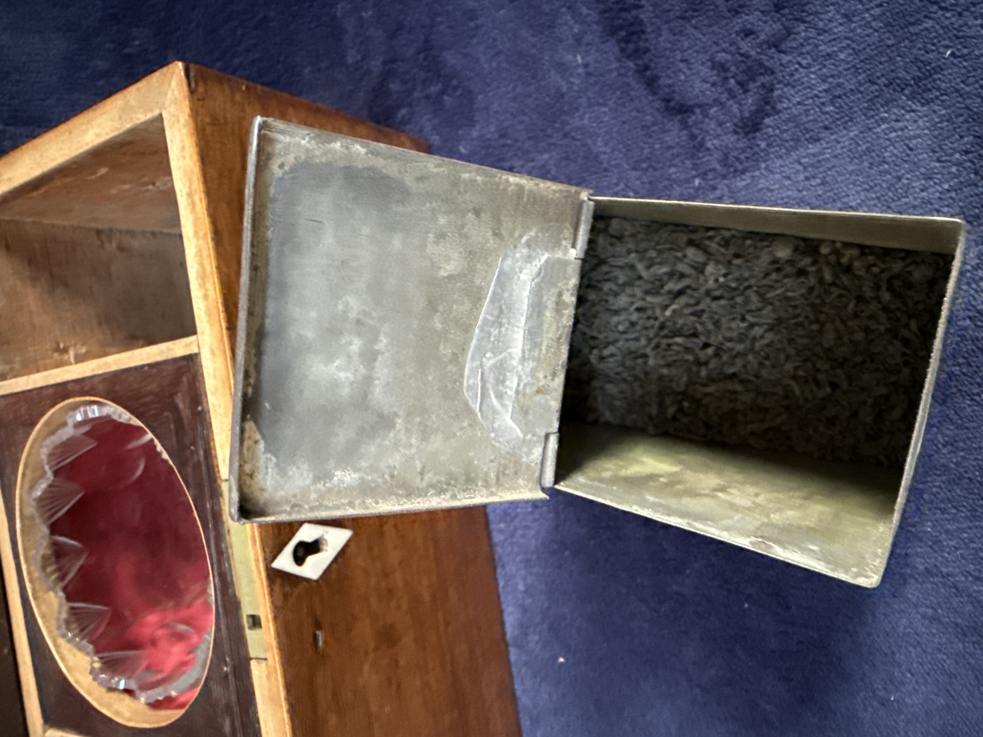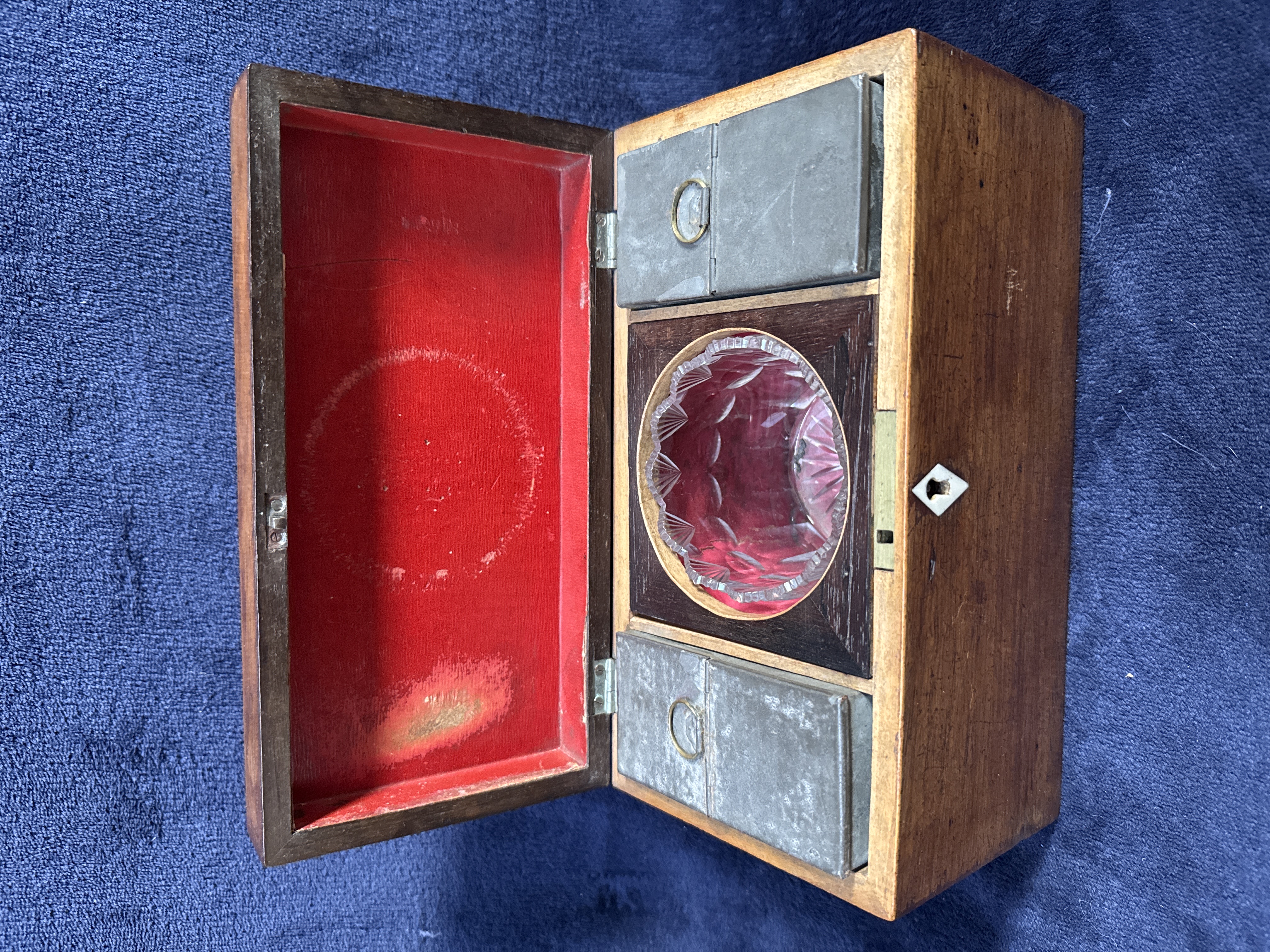 An antique 19th-century mahogany tea caddy of rectangular casket form, featuring a hinged lid and a diamond-shaped bone escutcheon. The interior is divided into three compartments: two flanking wells containing removable metal canisters with hinged lids, and a central circular well housing a cut-glass mixing bowl. The bowl is decorated with star-burst and fan-cut motifs. The interior of the lid is lined with red fabric.