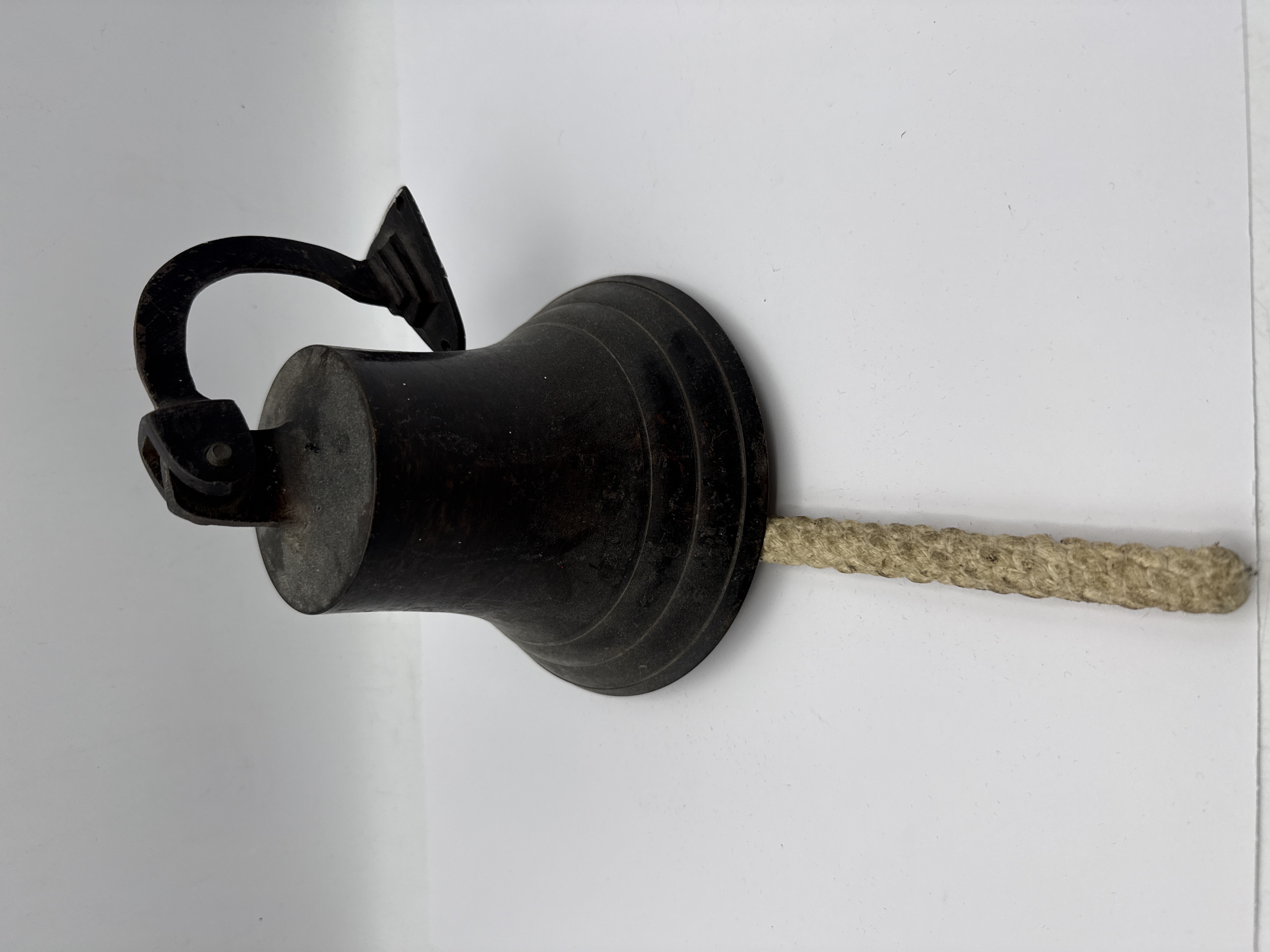 A wall-mounted cast metal bell featuring a traditional flared form with moulded concentric rings around the sound bow. The bell is suspended from a curved, cast metal mounting bracket via a hinged yoke and includes a thick, braided natural fibre rope pull attached to the internal clapper. The piece displays a dark, aged patina. No manufacturer’s marks or inscriptions are visible.