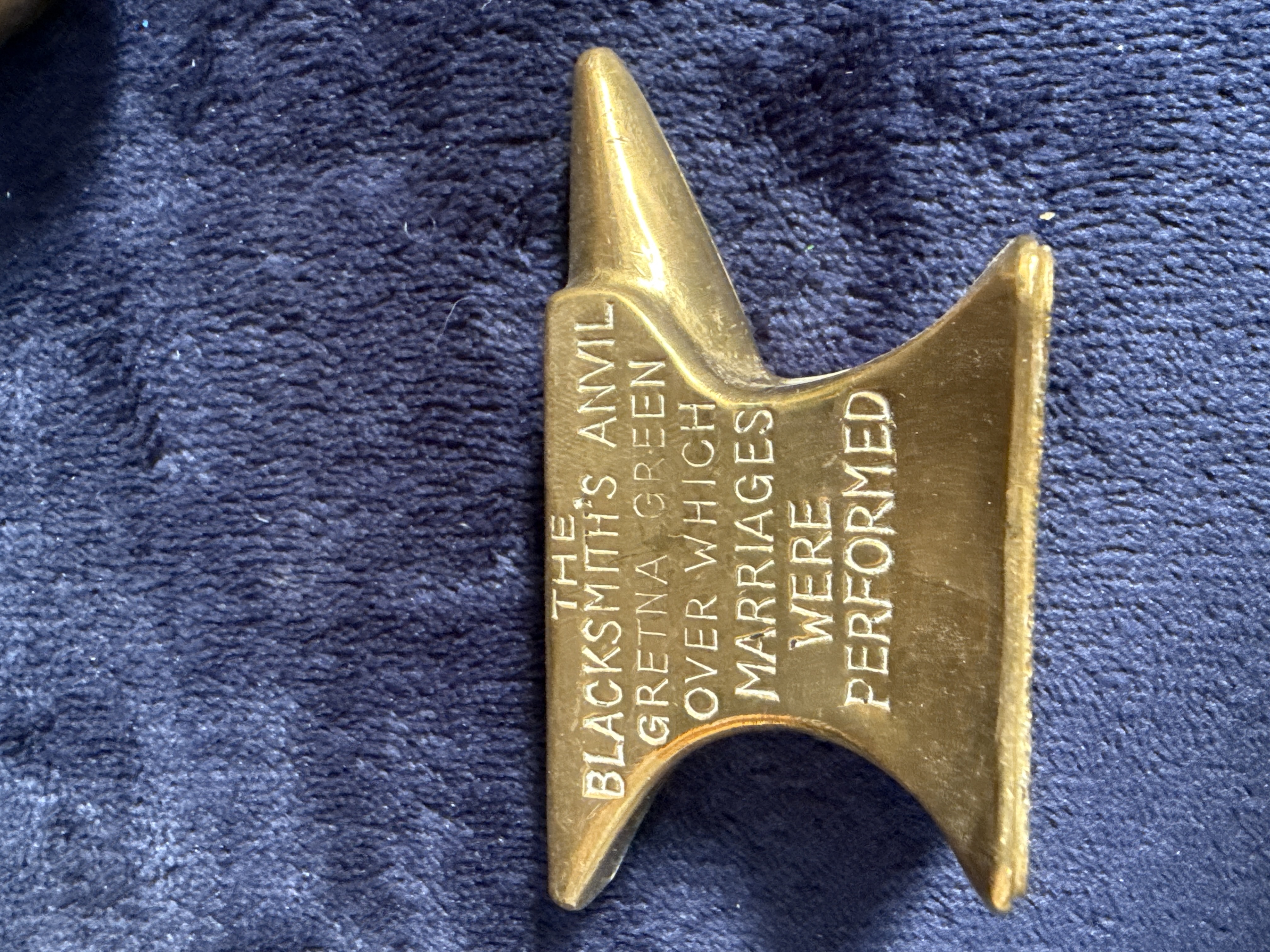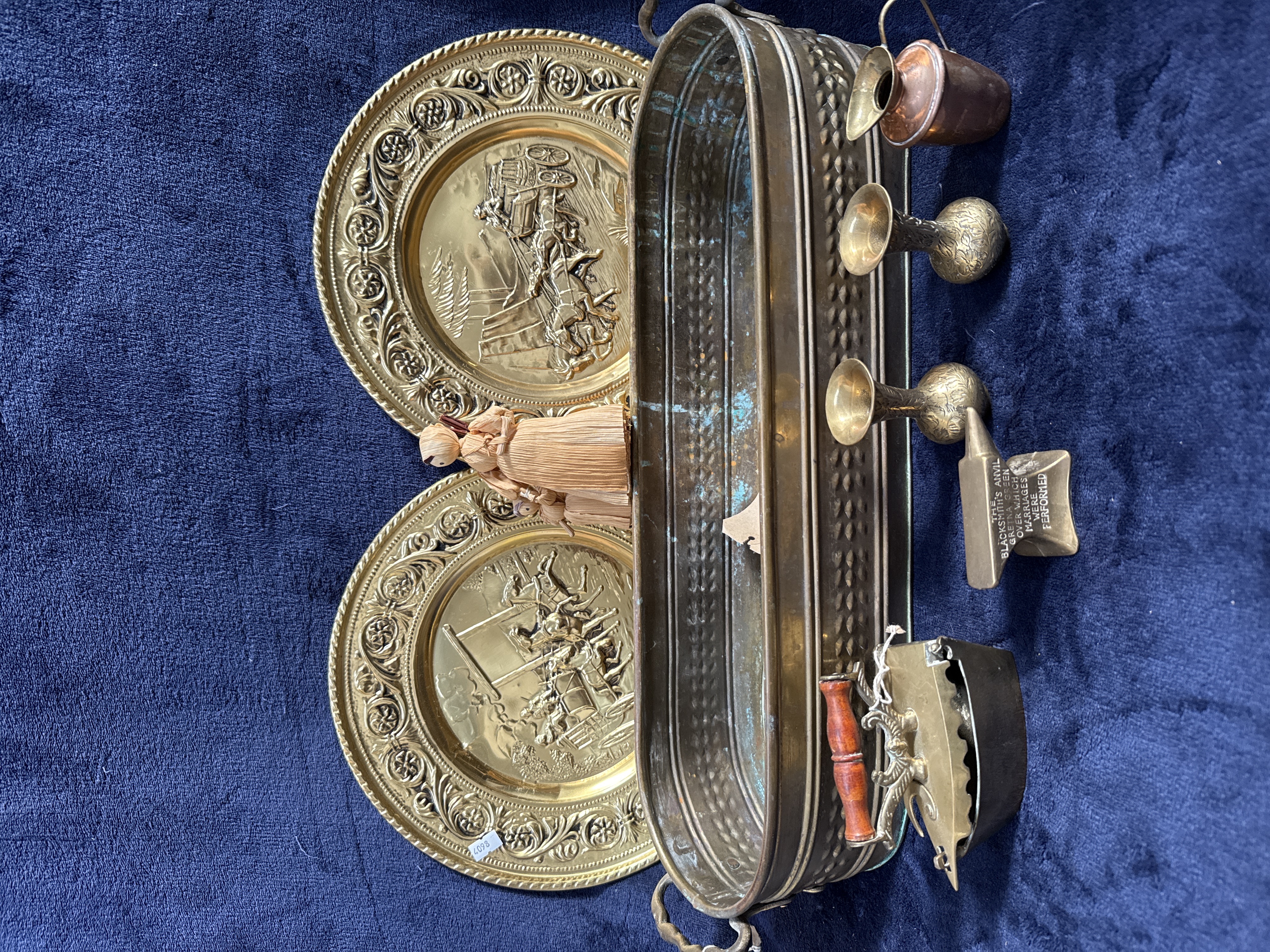 A collection of decorative metalware featuring large embossed brass plates depicting stagecoach and pastoral scenes within ornate foliate borders. The group includes large hammered brass planter of oval form with loop handles and an assortment of miniature items, including cast brass souvenir anvil inscribed THE BLACKSMITH’S ANVIL GRETNA GREEN OVER WHICH MARRIAGES WERE PERFORMED, small trumpet-shaped brass ornaments, miniature copper pitcher, and brass-style flat iron with a turned wooden handle. Small corn husk doll is also included.
