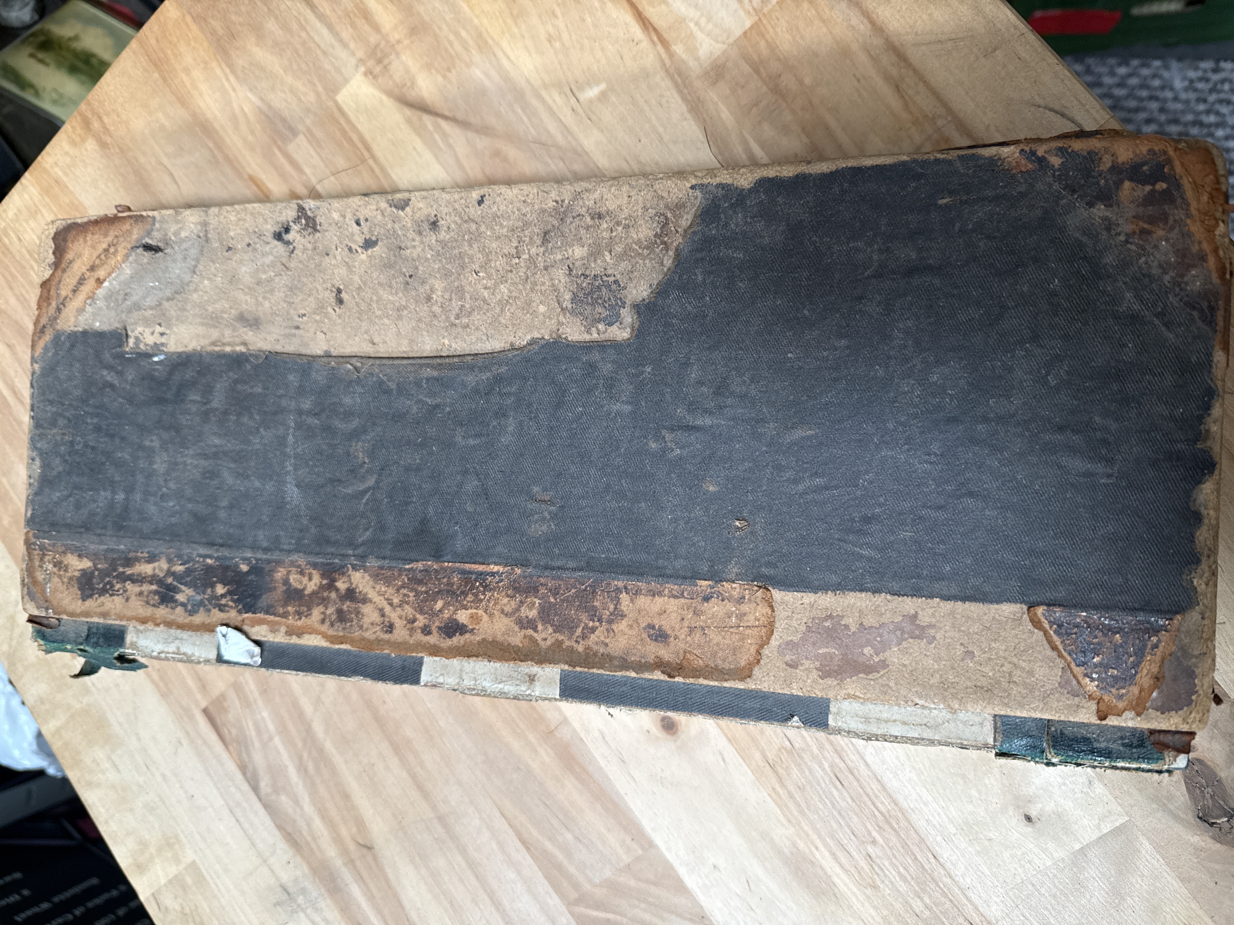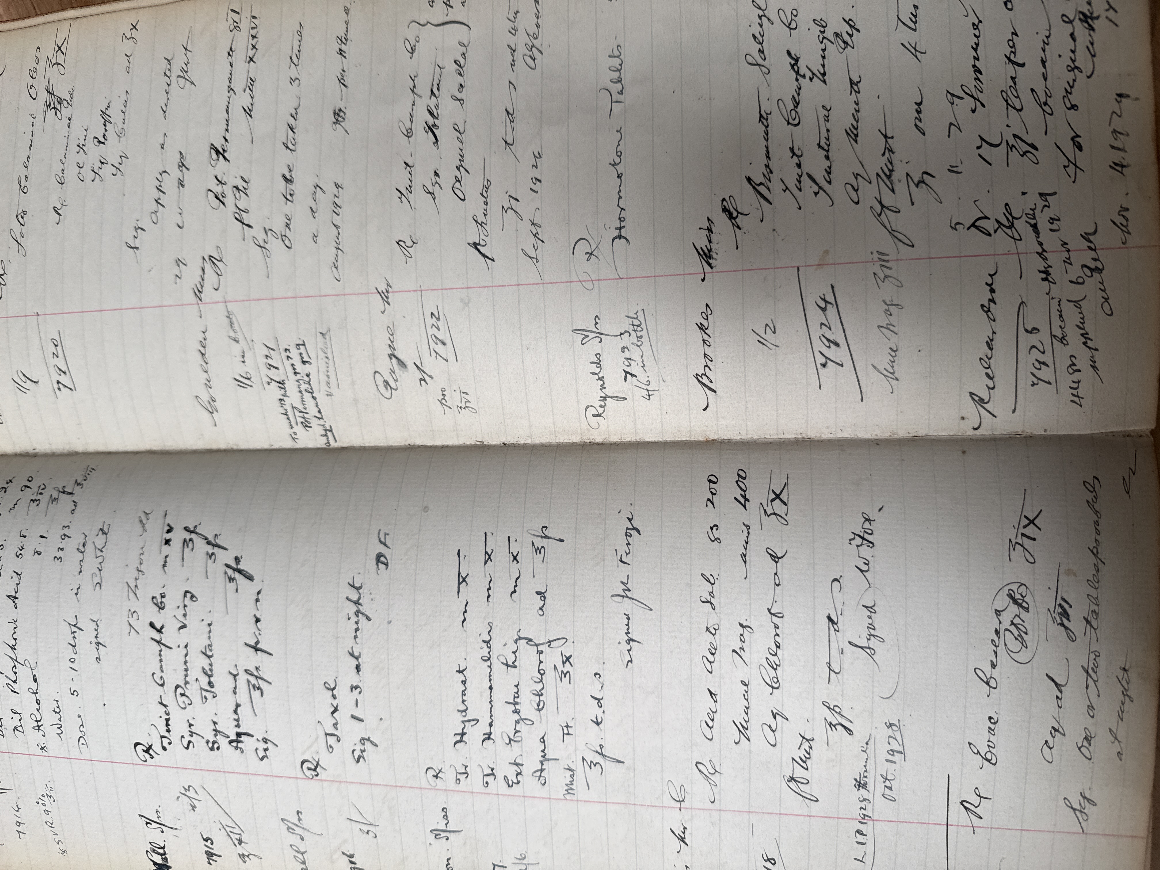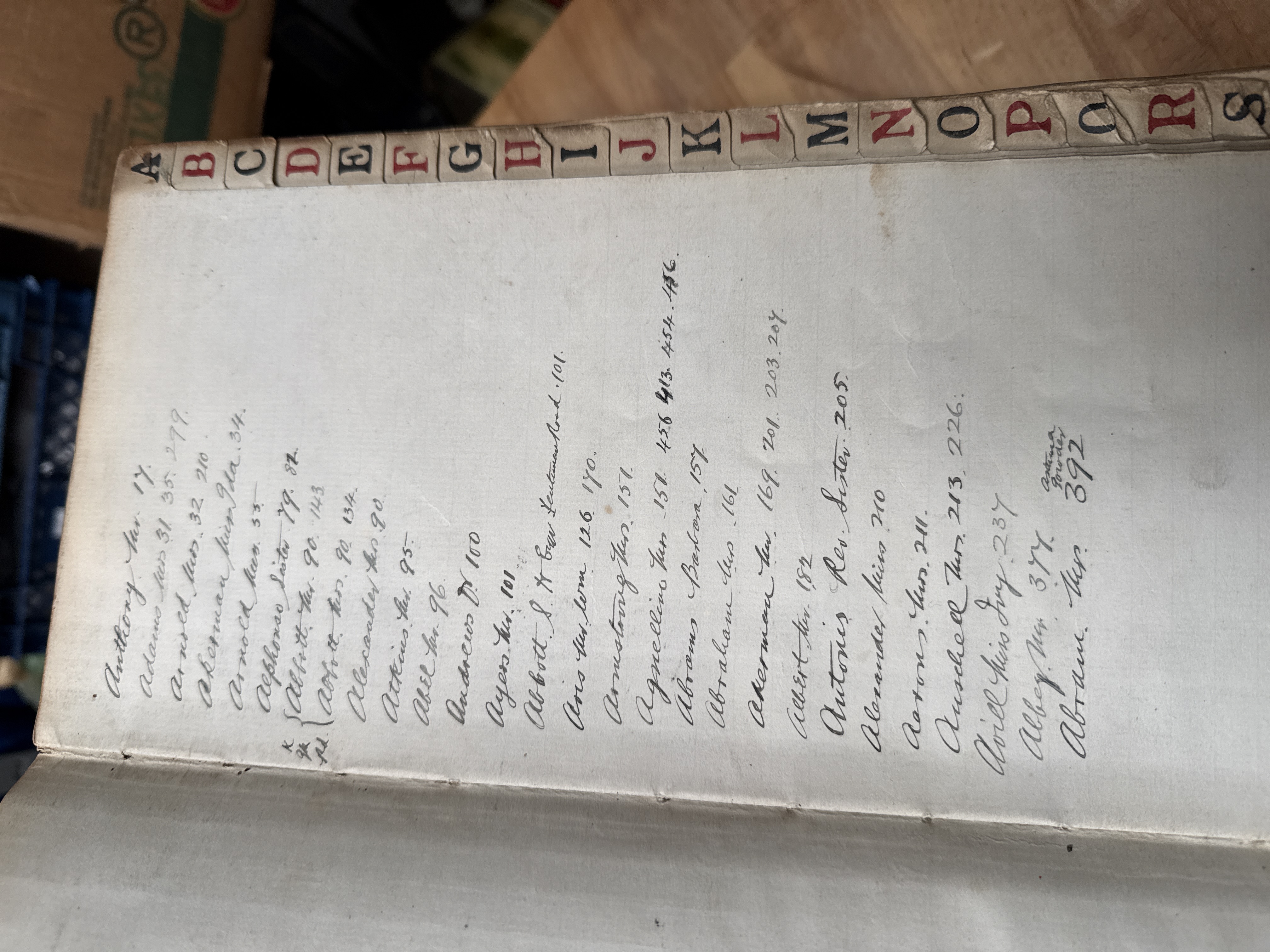 This early 20th-century handwritten pharmacist’s prescription ledger contains entries dated between 1924 and 1928. The large-format volume is constructed with cloth-covered boards and marbled paper endpapers. The interior is organised with an alphabetical thumb index and contains numerous pages of handwritten pharmaceutical records, including patient names, prescription details in Latin and English, and numerical reference codes. Several printed labels and advertisements are pasted to the inside front cover for various London-based dispensing chemists, including Morrell Bros. of 806 Kennington Park Road, Byatt Walker of Clapham Road, and Frederick K. Morrell of 306 Kennington Park Road. A prominent label for Morrell’s Essence for Lameness in Horses & Cattle is also present, alongside a printer’s label for Silverlock, Engraver & Printer, 92 Blackfriars Road, London S.E.