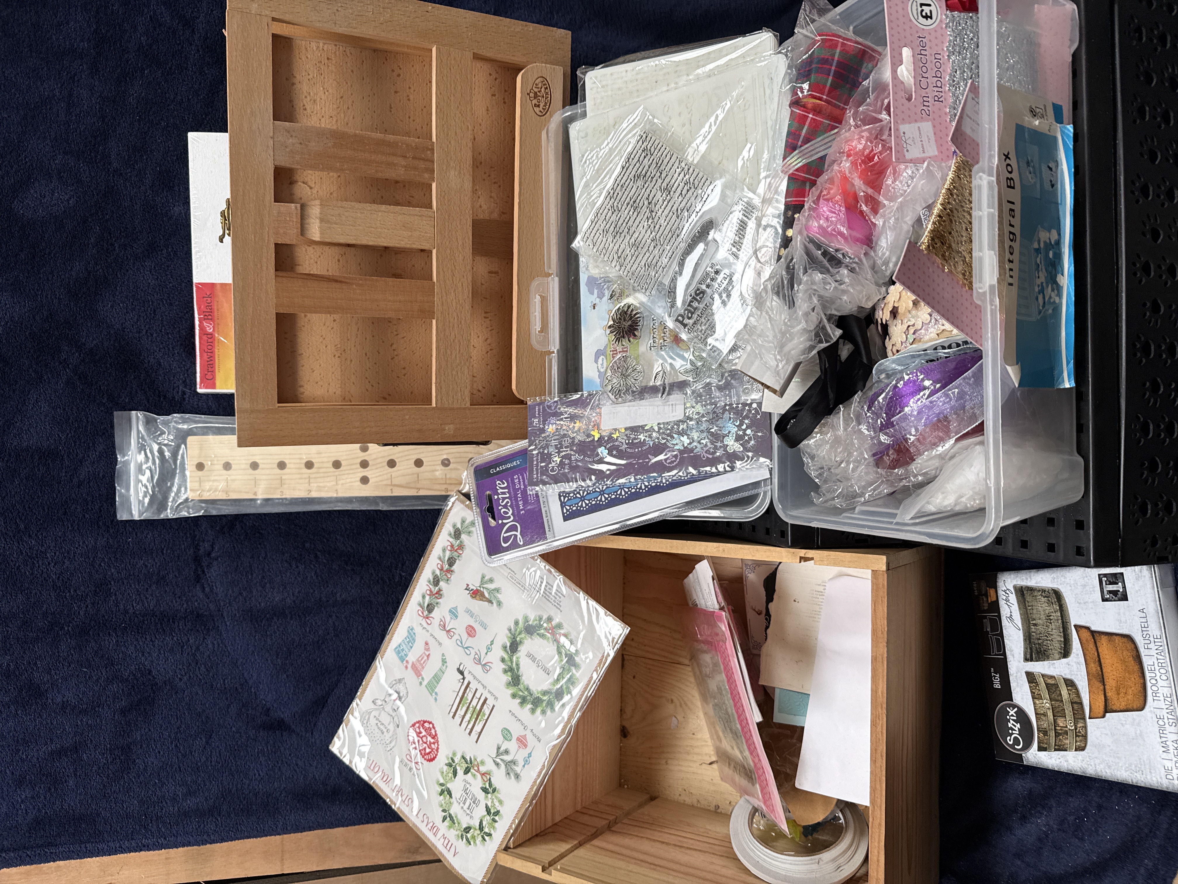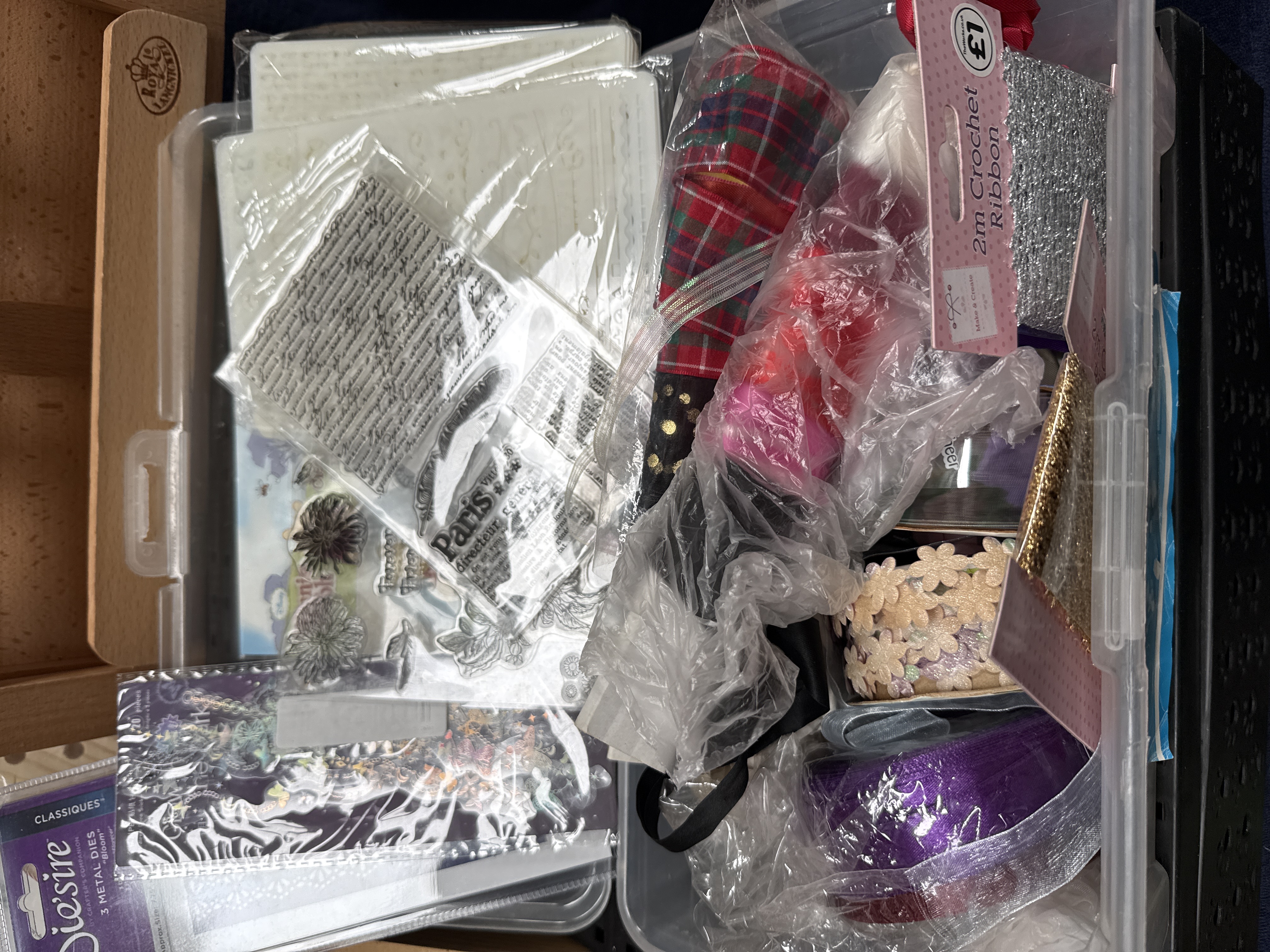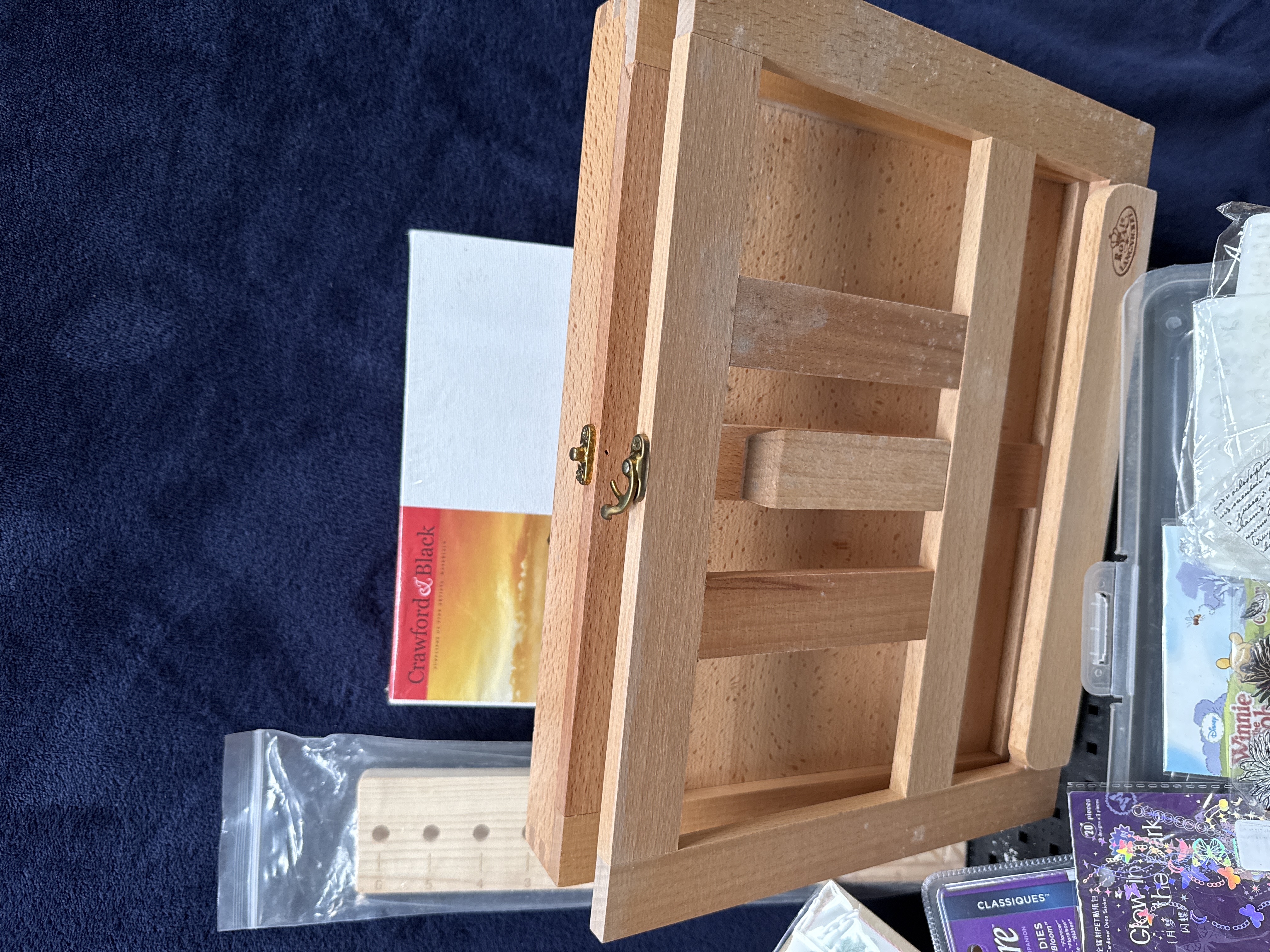 A collection of various art and craft supplies featuring a Royal & Langnickel wooden table easel with a natural finish and brass-tone hardware. The lot includes a wooden storage crate and multiple clear plastic containers housing an assortment of haberdashery and paper crafting materials. Included are various ribbons in crochet, lace, and satin styles, clear decorative stamps with French text including directeur général, and Die’sire brand metal cutting dies. Additional items comprise Crawford & Black artist materials, Sizzix Bigz die packaging, holiday-themed ephemera, and a wooden weaving or knitting tool.