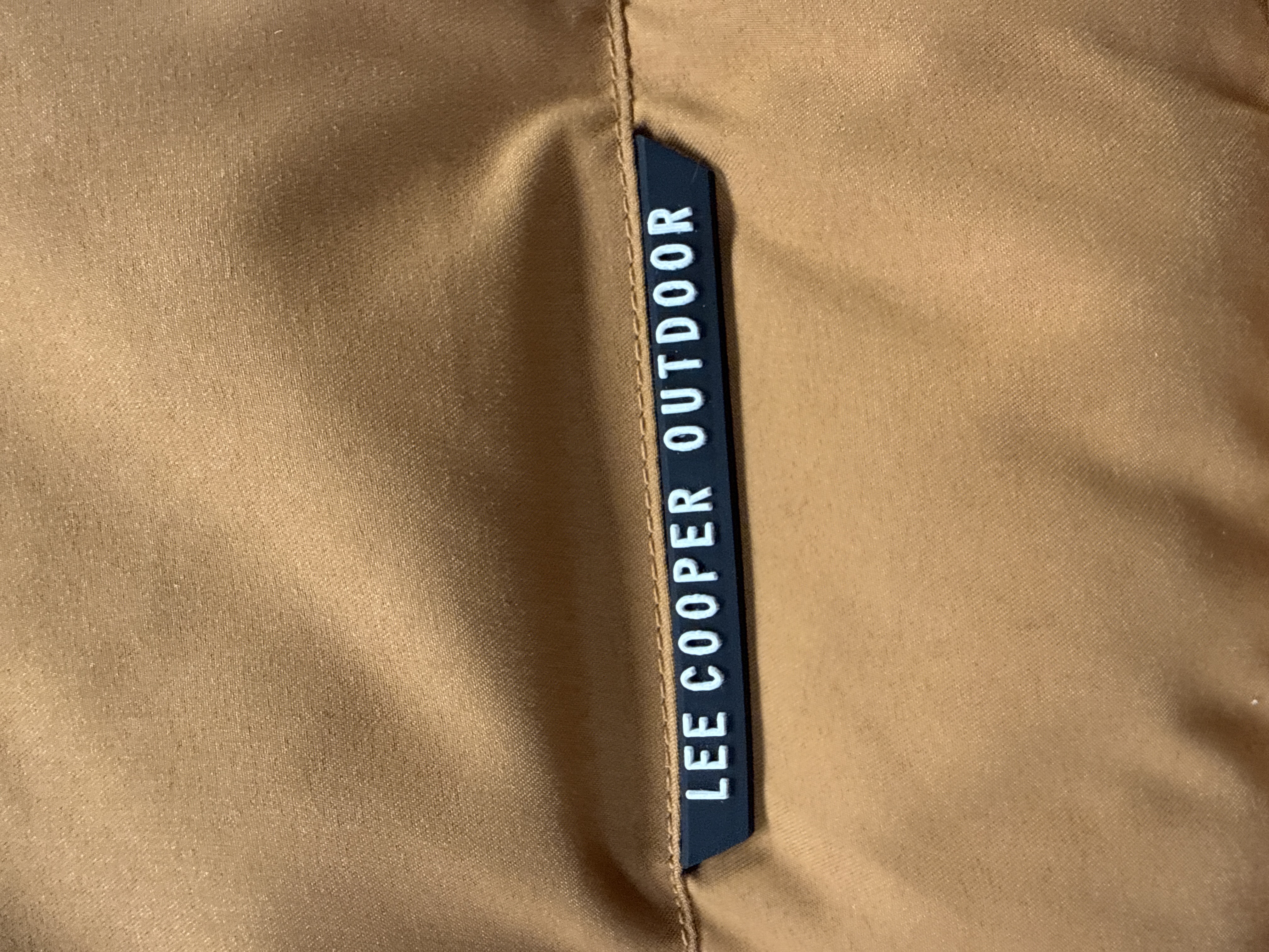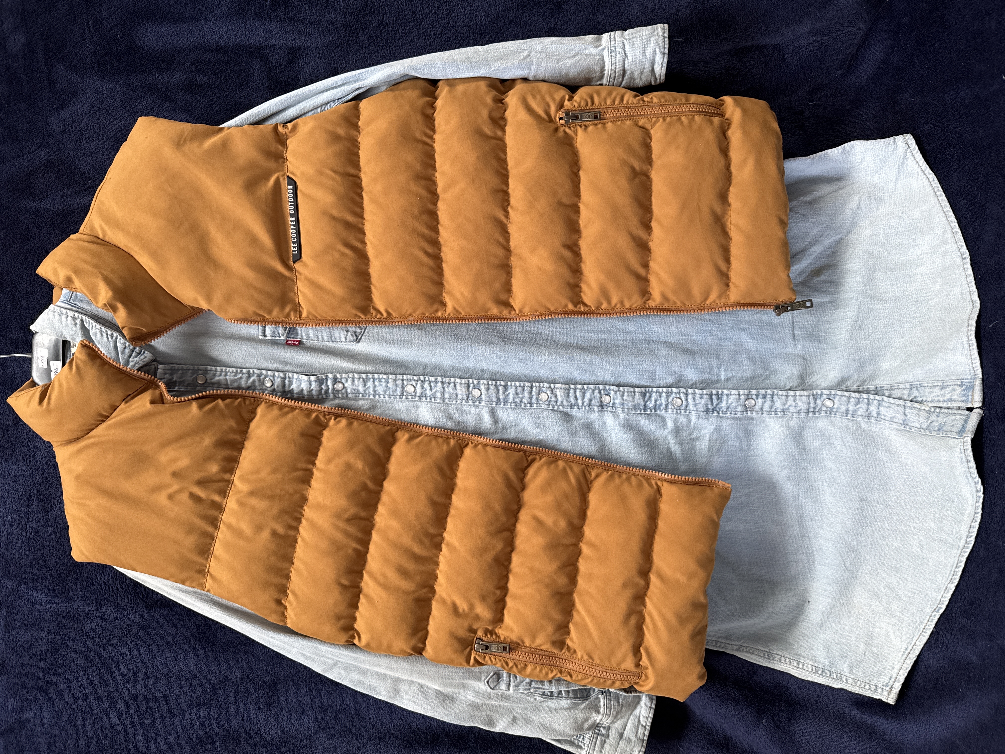 A pair of men’s casual garments. The first is a quilted puffer vest in a mustard-tan colour, featuring a rubberised Lee Cooper Outdoor label on the chest. It is constructed with a stand-up collar, a full-length front zip, and two zippered hand pockets. The second item is a Levi’s western-style denim shirt in a light-wash finish. The shirt includes a standard point collar, pearlescent snap-button closures, and two chest pockets. A signature Levi’s red brand tab is present on the left chest pocket. The internal neck label identifies the size as Large.