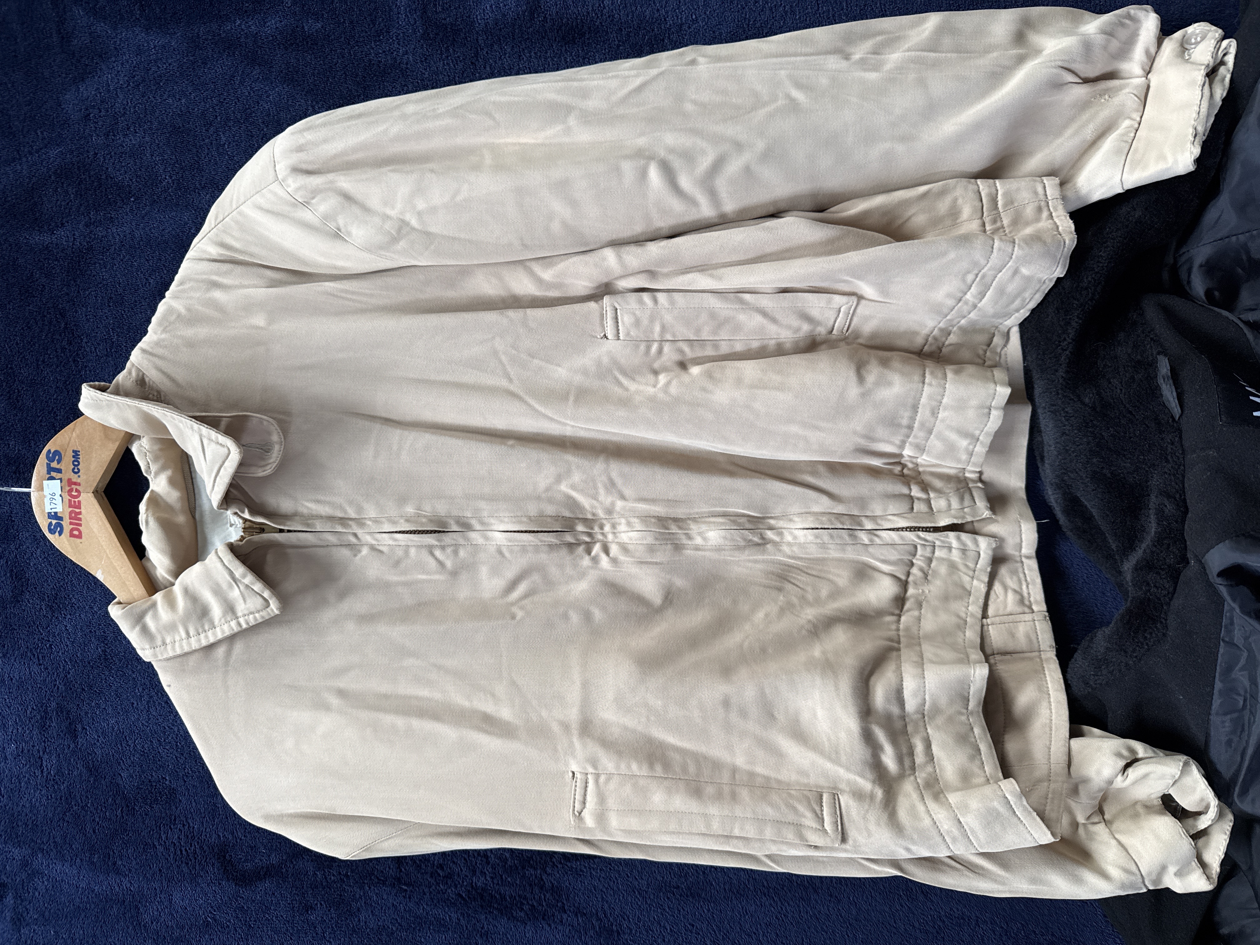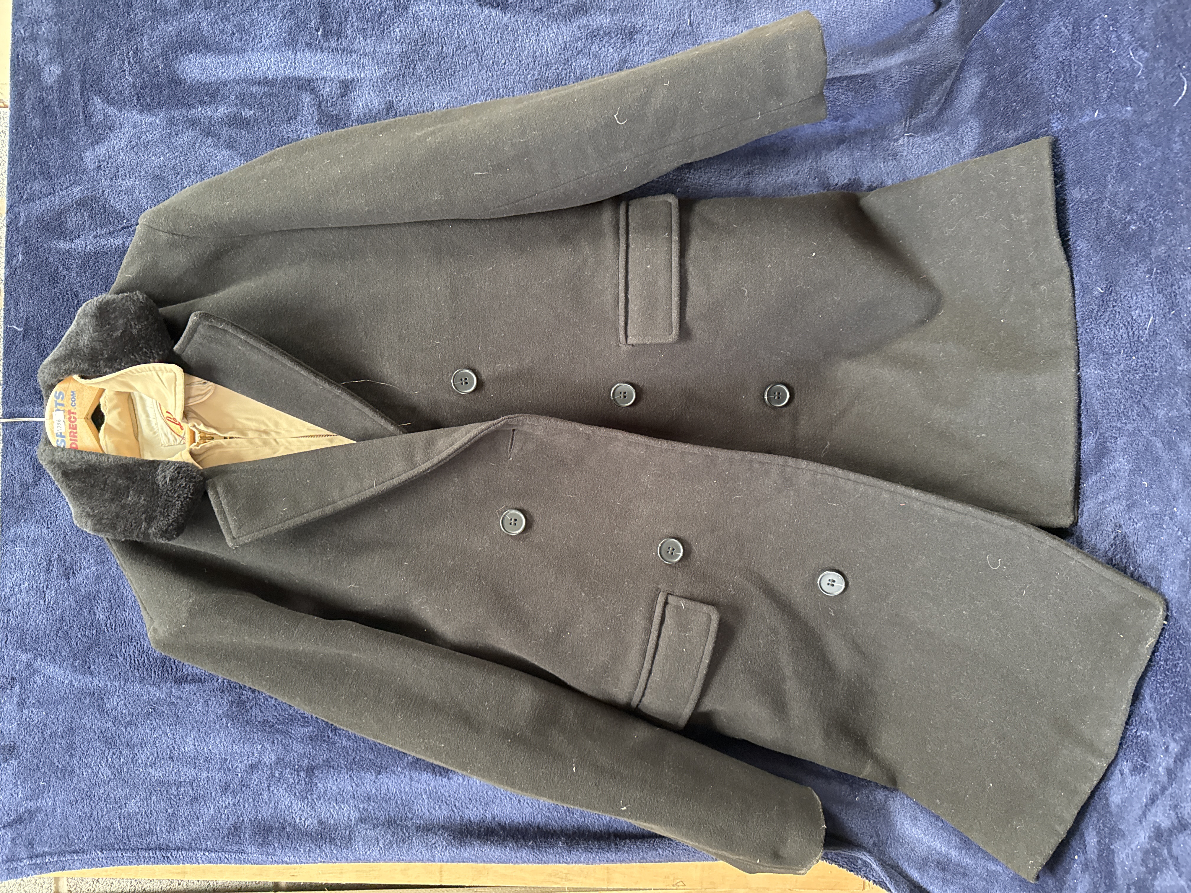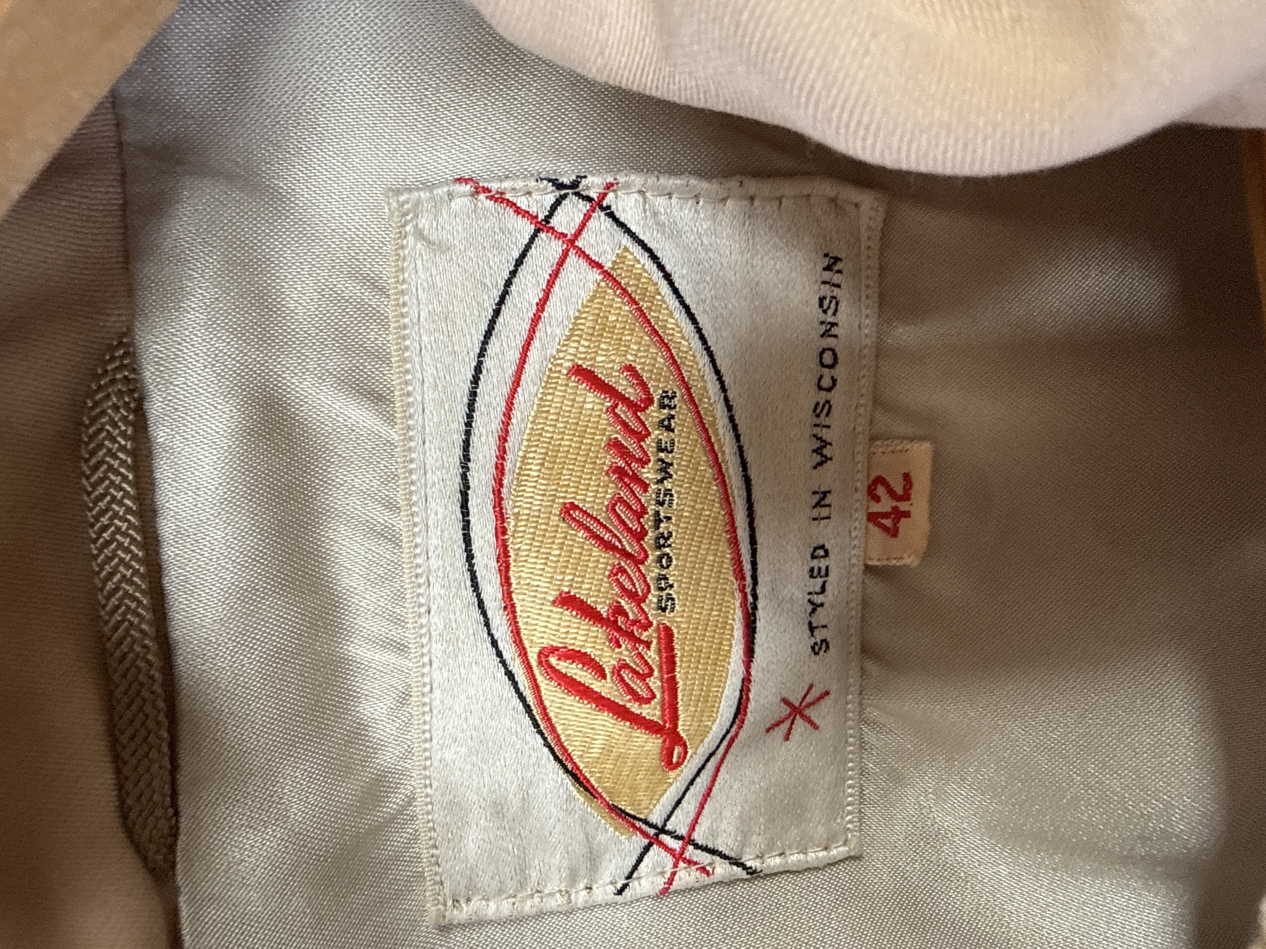 Two items of men’s outerwear. The first is a tan-coloured lightweight jacket featuring a pointed collar, a full-length metal zip closure, and two slanted welt pockets. The interior contains a woven manufacturer’s label for Lakeland Sportswear, Styled in Wisconsin, and a separate tag indicating size 42. The second garment is a dark charcoal-coloured double-breasted overcoat constructed from a wool-blend material. It is designed with notched lapels, a faux fur collar, and two front flap pockets. The coat features a six-button front fastening arrangement.