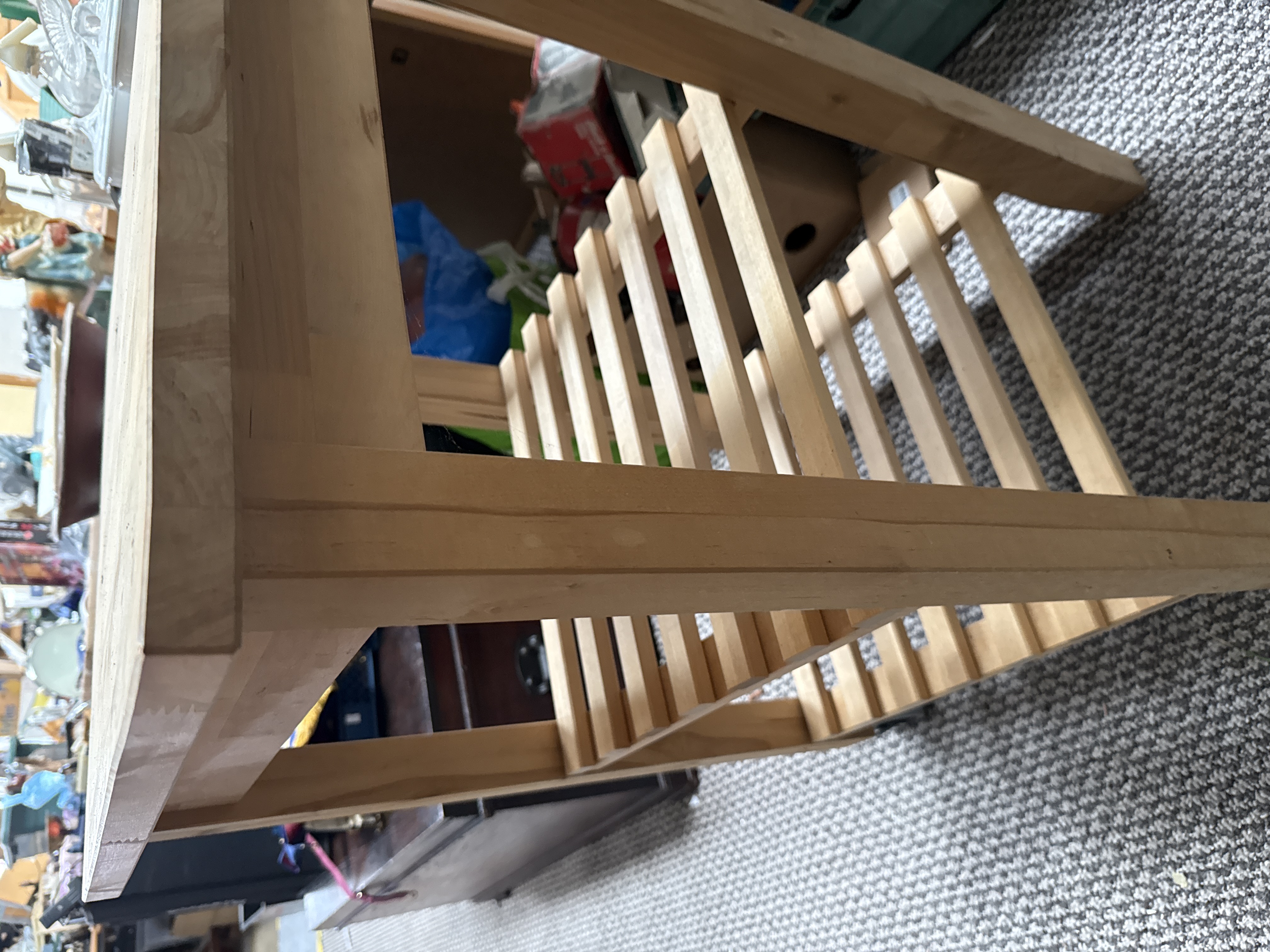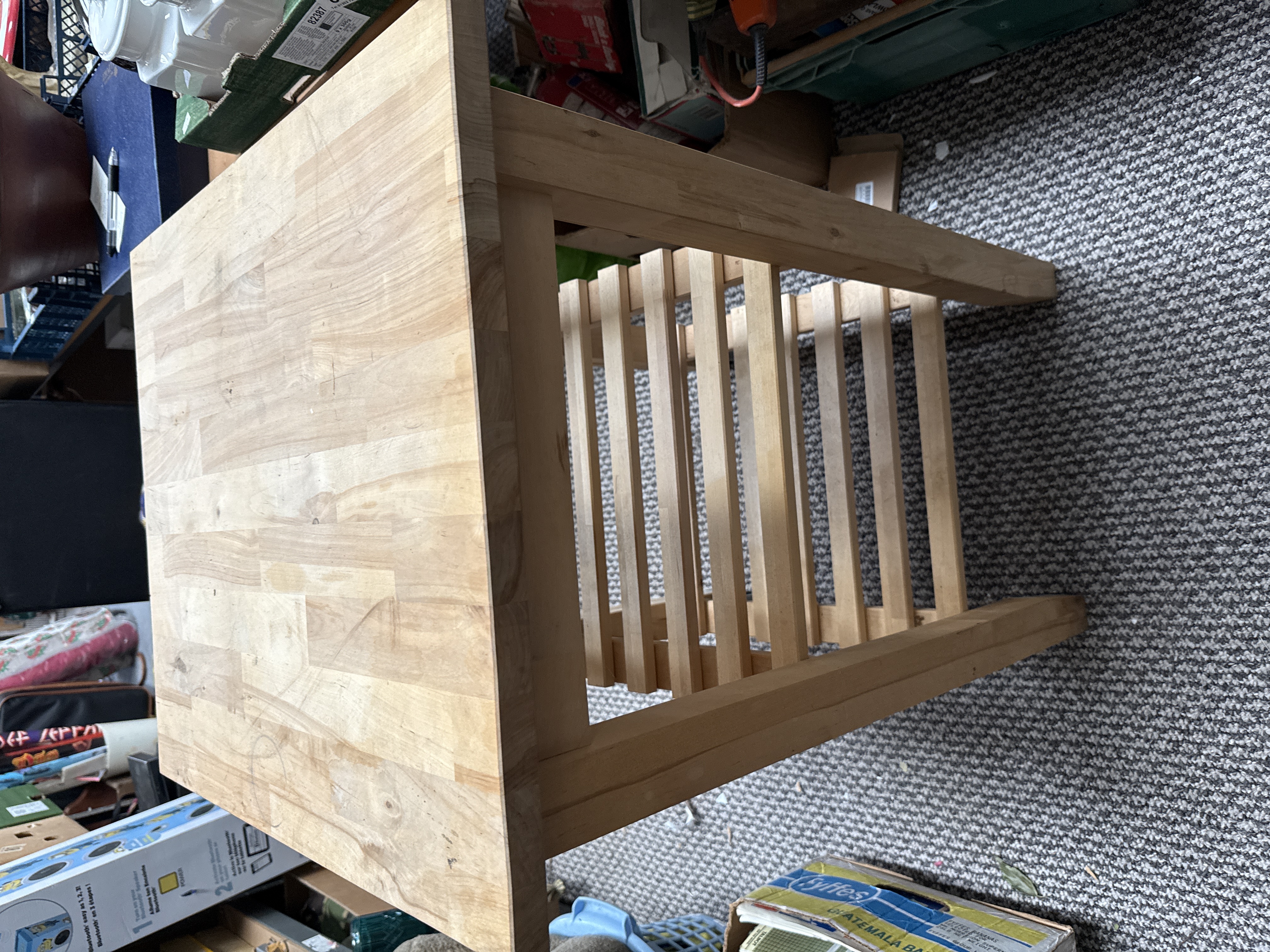 A contemporary kitchen utility table or side table constructed from natural-finish wood. The piece features a rectangular butcher-block style top supported by four square-section legs. A slatted lower storage shelf is positioned between the legs for additional utility. The design and construction are in the style of functional furniture produced by International Concepts. No maker’s marks or labels are visible on the piece.