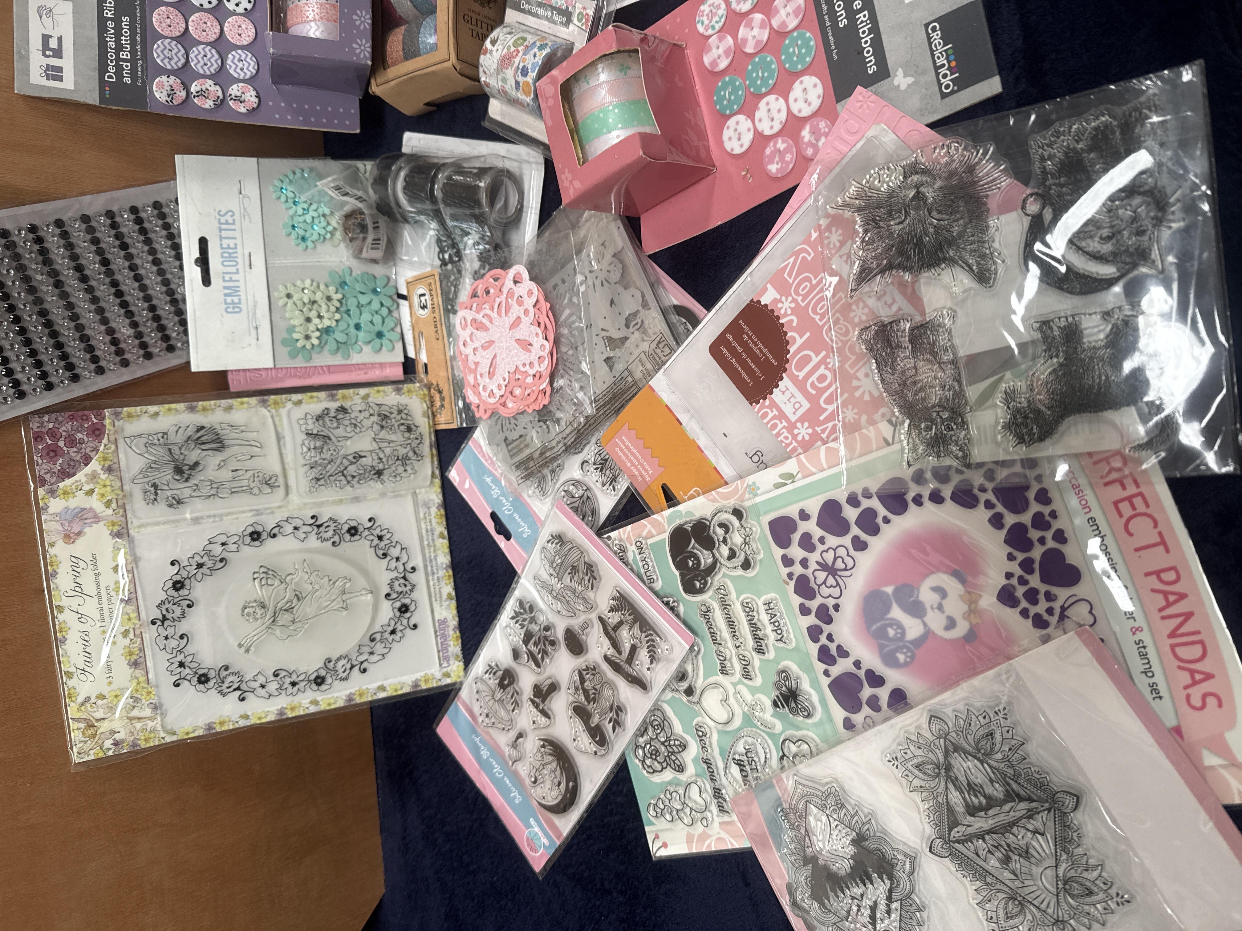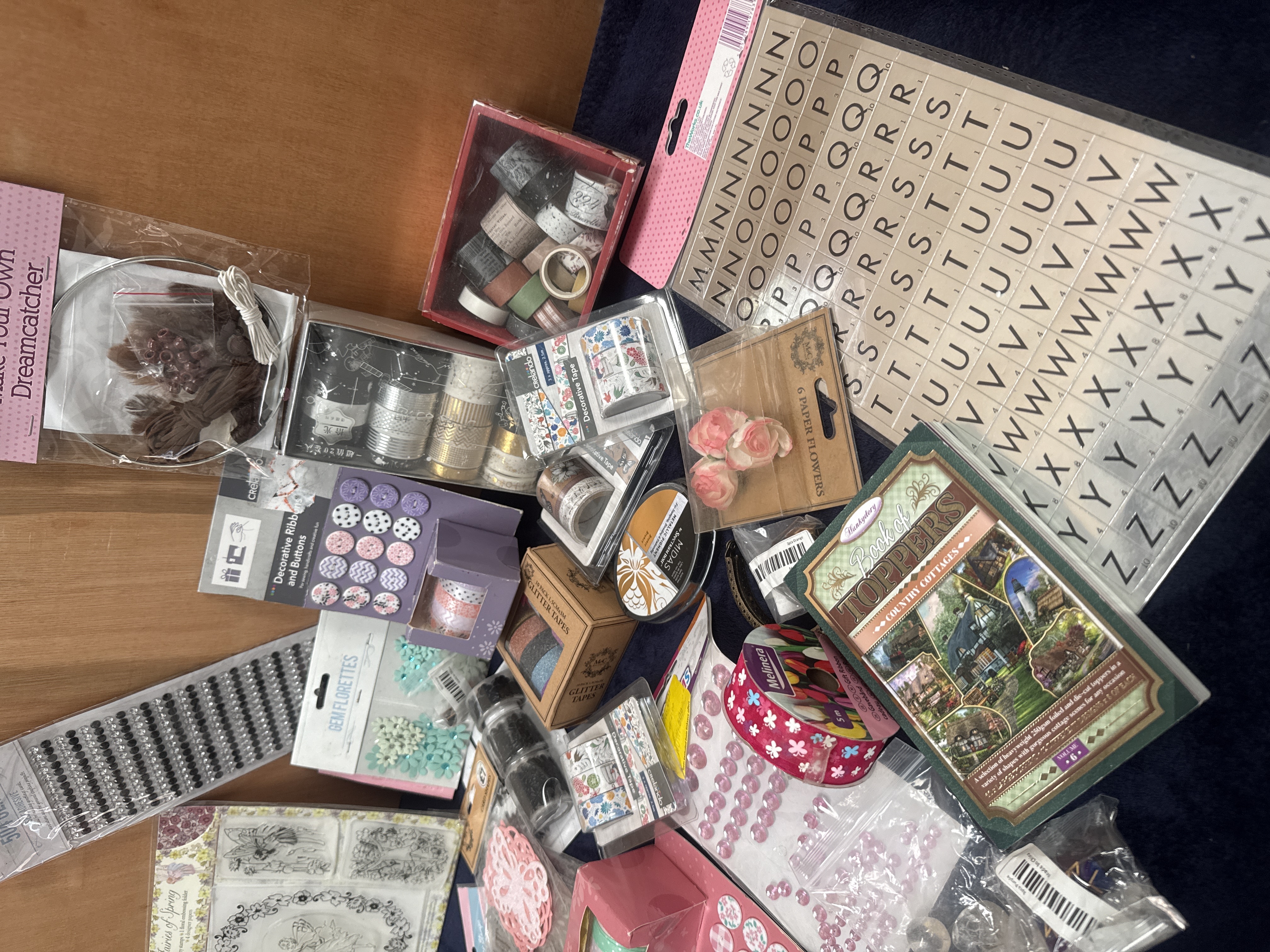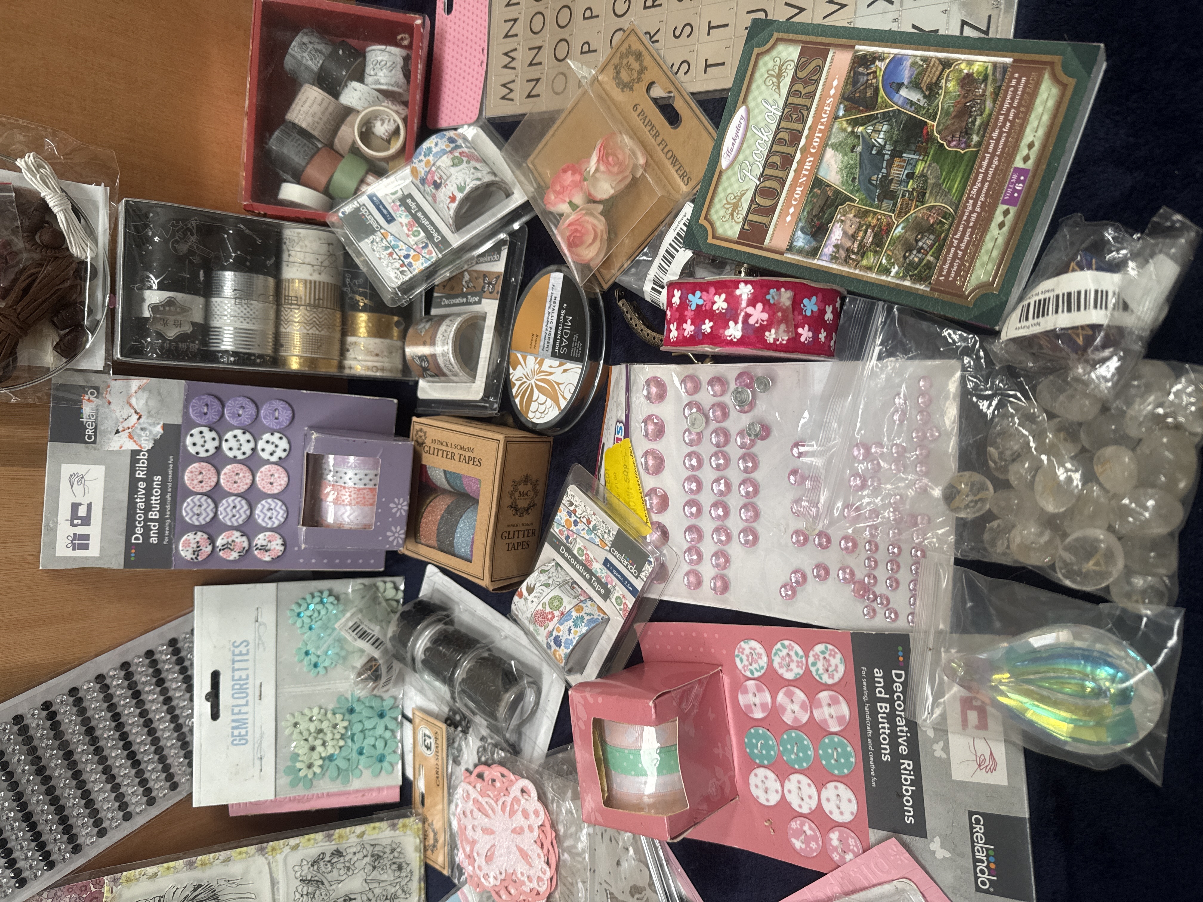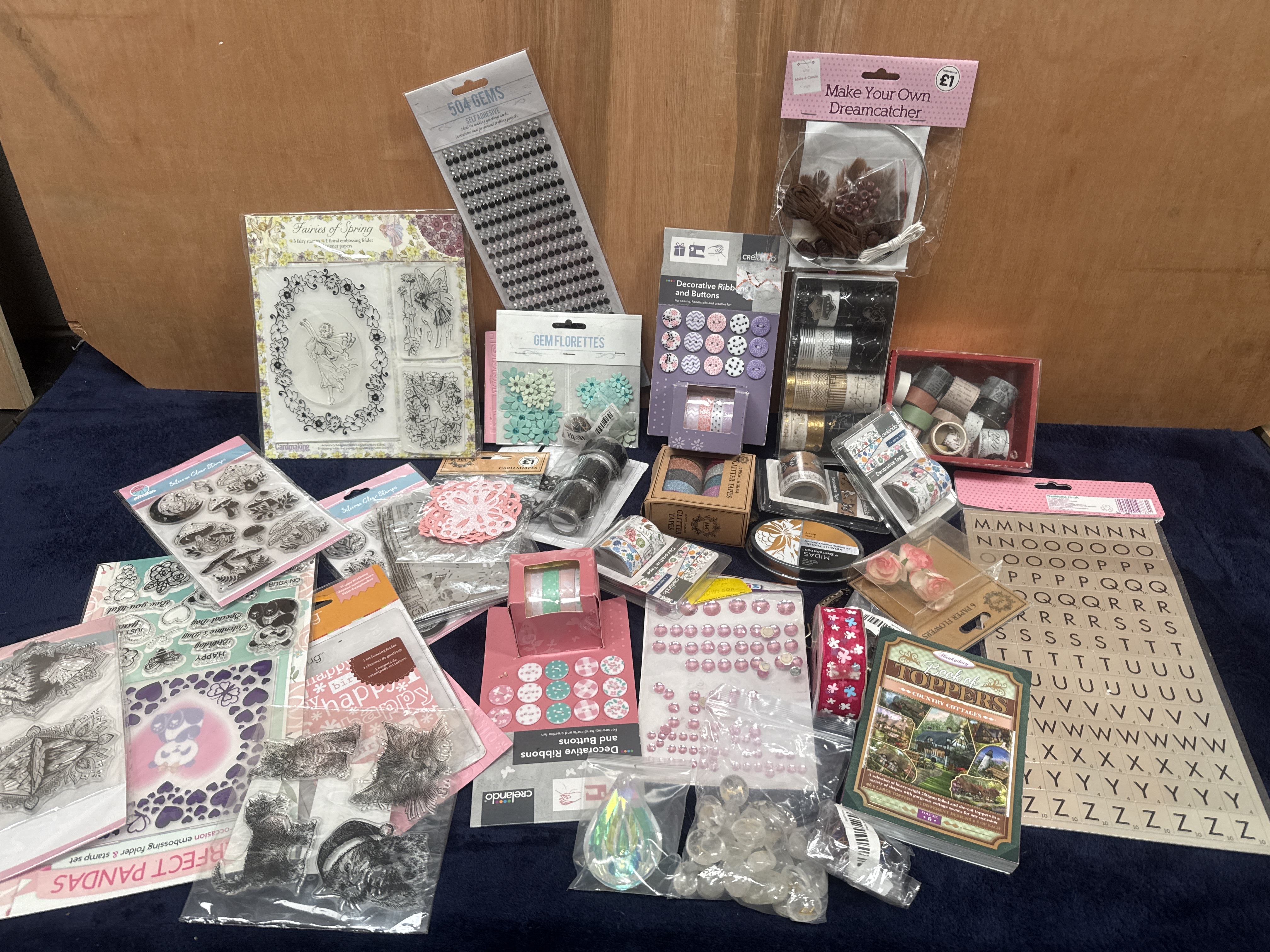 A collection of various papercrafting and scrapbooking materials. The lot includes a Hunkydory Book of Toppers – Country Cottages containing heavyweight foiled and die-cut toppers. Also present are Cardmaking Fairies of Spring and Perfect Pandas stamp and embossing sets. The collection features a tin of Spectrum Noir MIDAS metallic pigment. Other items include Crelando decorative ribbons and buttons, various washi and glitter tapes, self-adhesive gems, alphabet stickers, and a DIY dreamcatcher kit. The items are primarily housed in their original retail packaging.