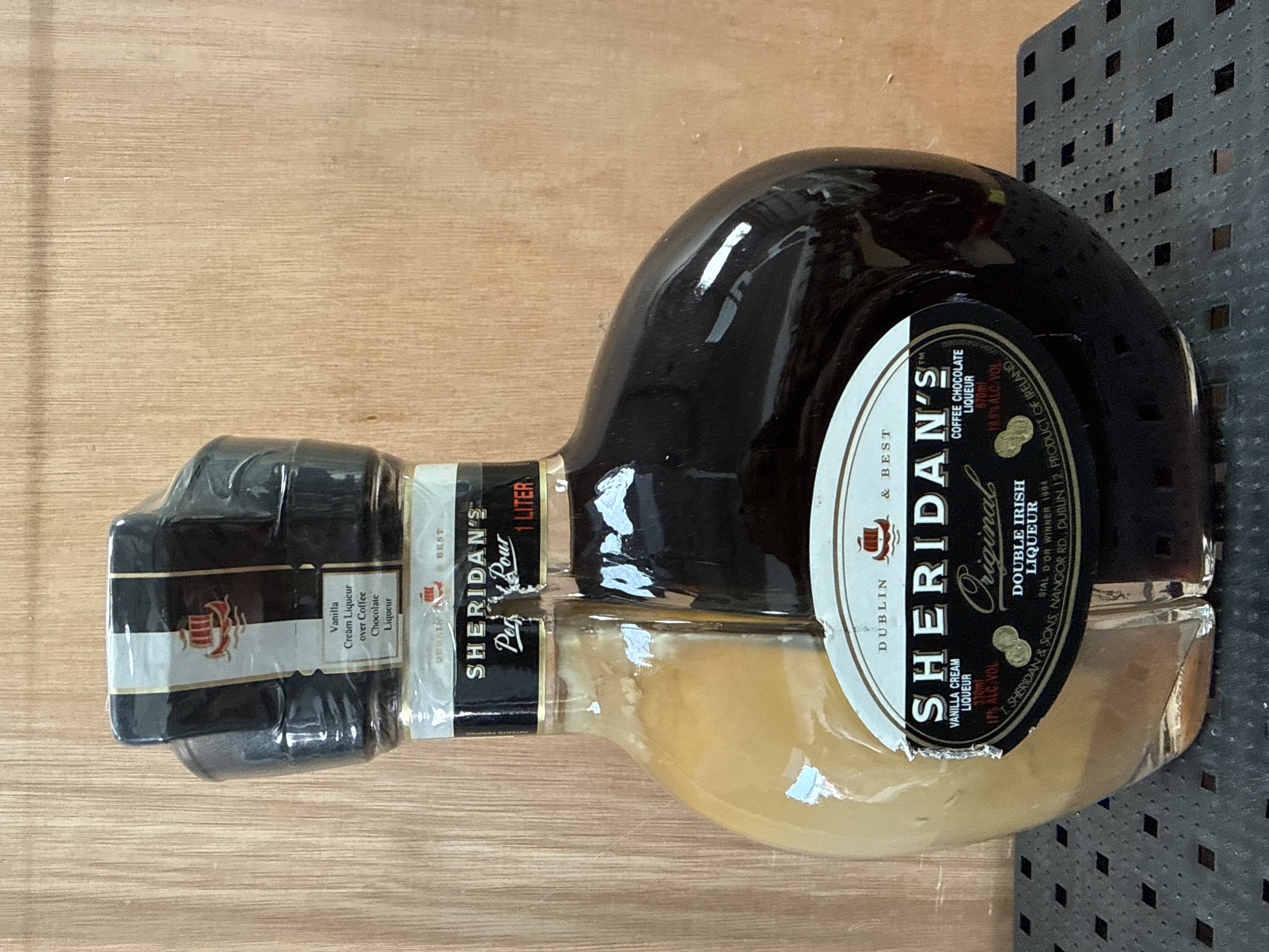 A 1-litre bottle of Sheridan’s Original Double Irish Liqueur, produced by T. Sheridan and Sons in Dublin, Ireland. The item features a dual-chambered glass bottle designed to pour two components simultaneously. The dark coffee chocolate liqueur component is 670ml at 15.5% ABV, and the vanilla cream liqueur component is 330ml at 17% ABV. The label includes a reference to the 1994 SIAL D’OR award. The bottle is sealed with its original black plastic neck wrap.