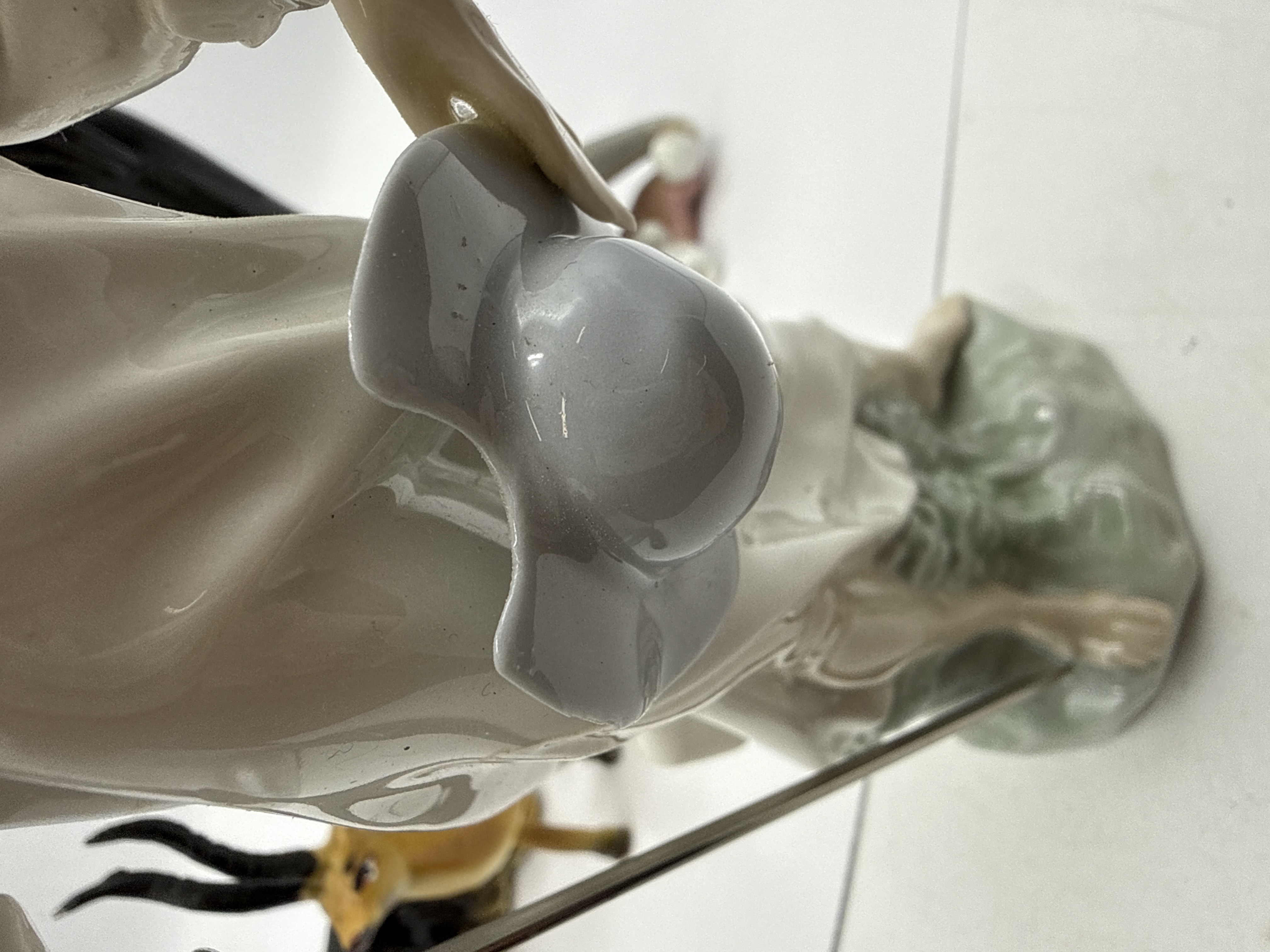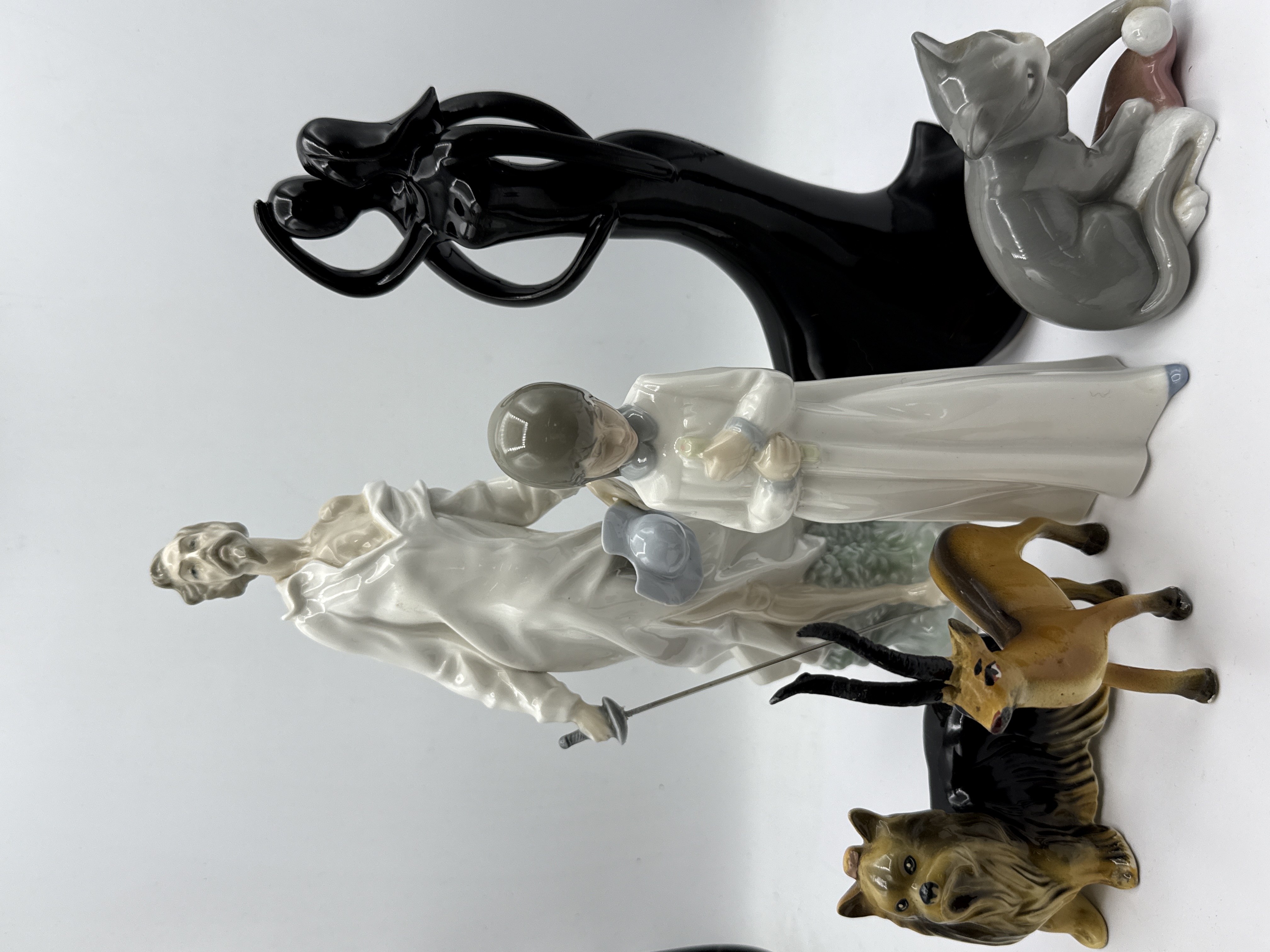 An assortment of glazed porcelain figurines featuring various subjects and styles. The collection includes a tall, stylized black sculpture of an embracing couple, a grey cat, a child in a white gown, a seated dog, a small horned animal, and a figure of Don Quixote. The Don Quixote figure is depicted holding a grey hat and a sword with a metal blade. The items are finished in a high-gloss glaze with a characteristic pastel and neutral colour palette. The style and execution are consistent with mid to late 20th-century Spanish manufacture, resembling the work of Lladro or Nao.