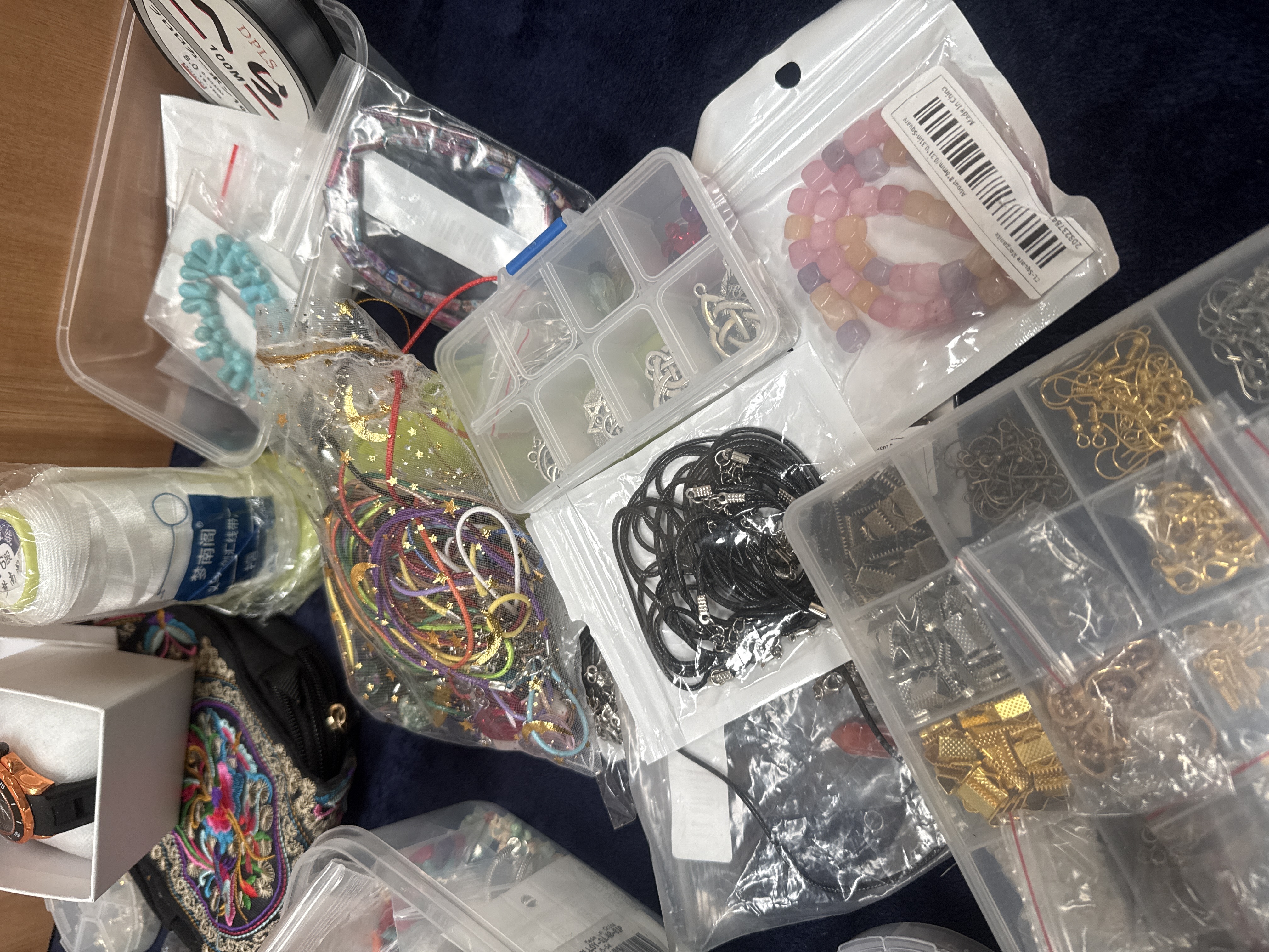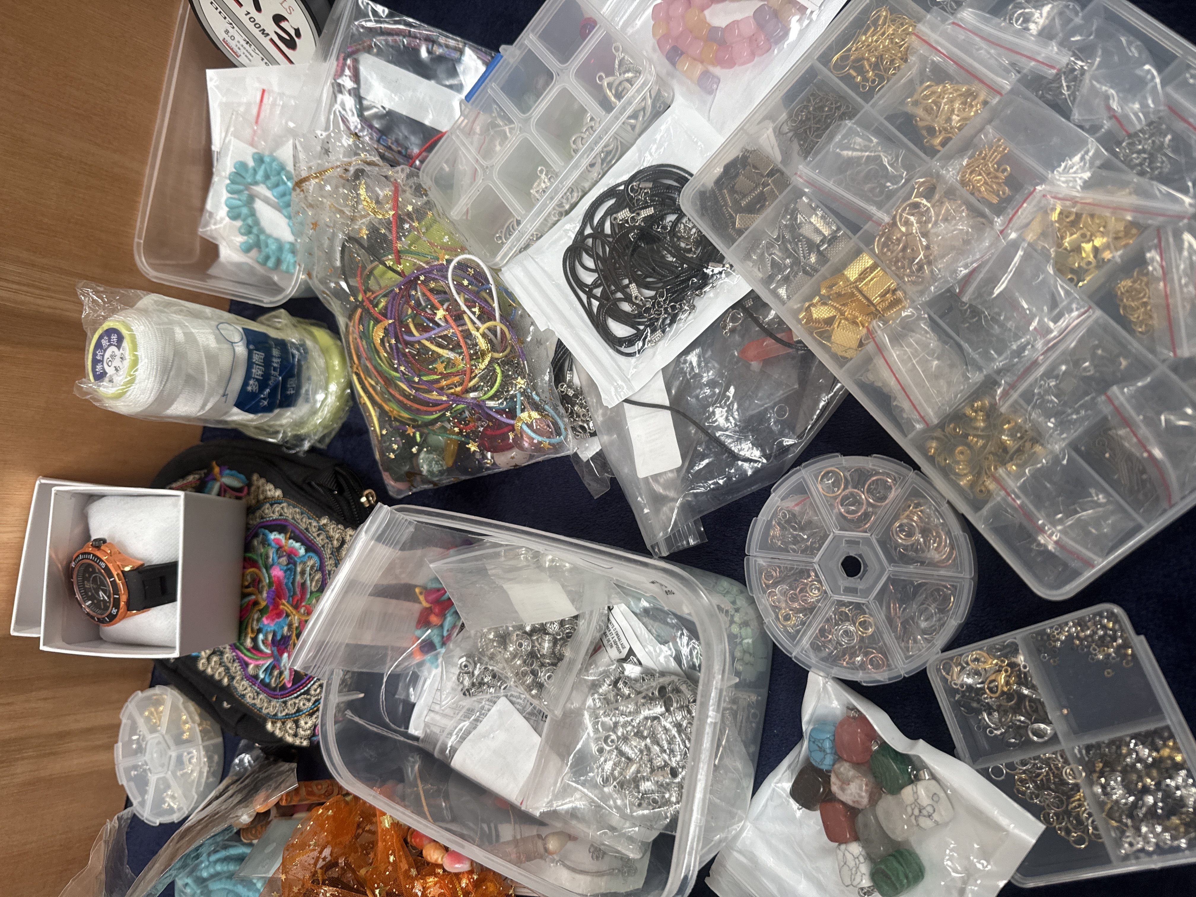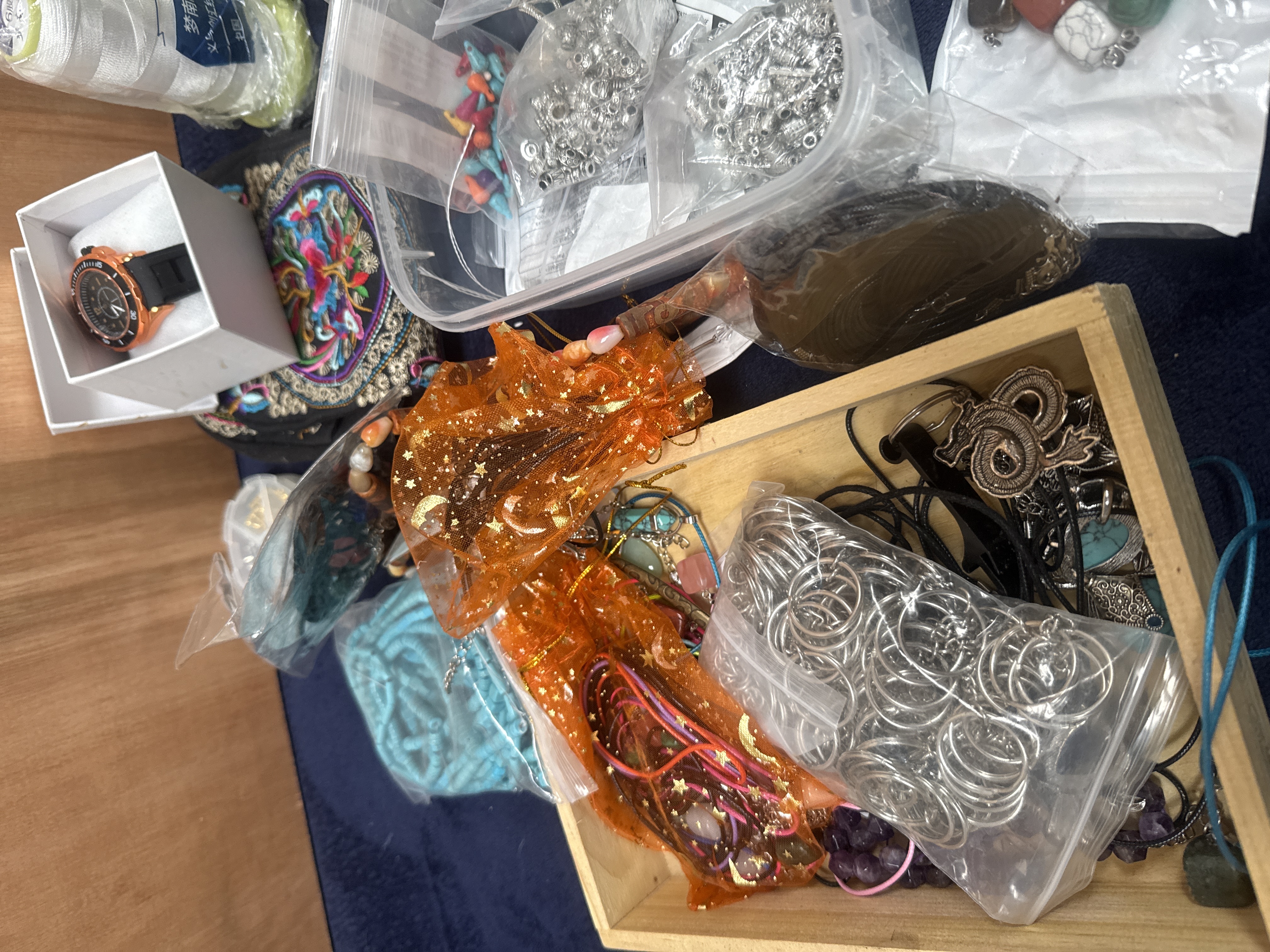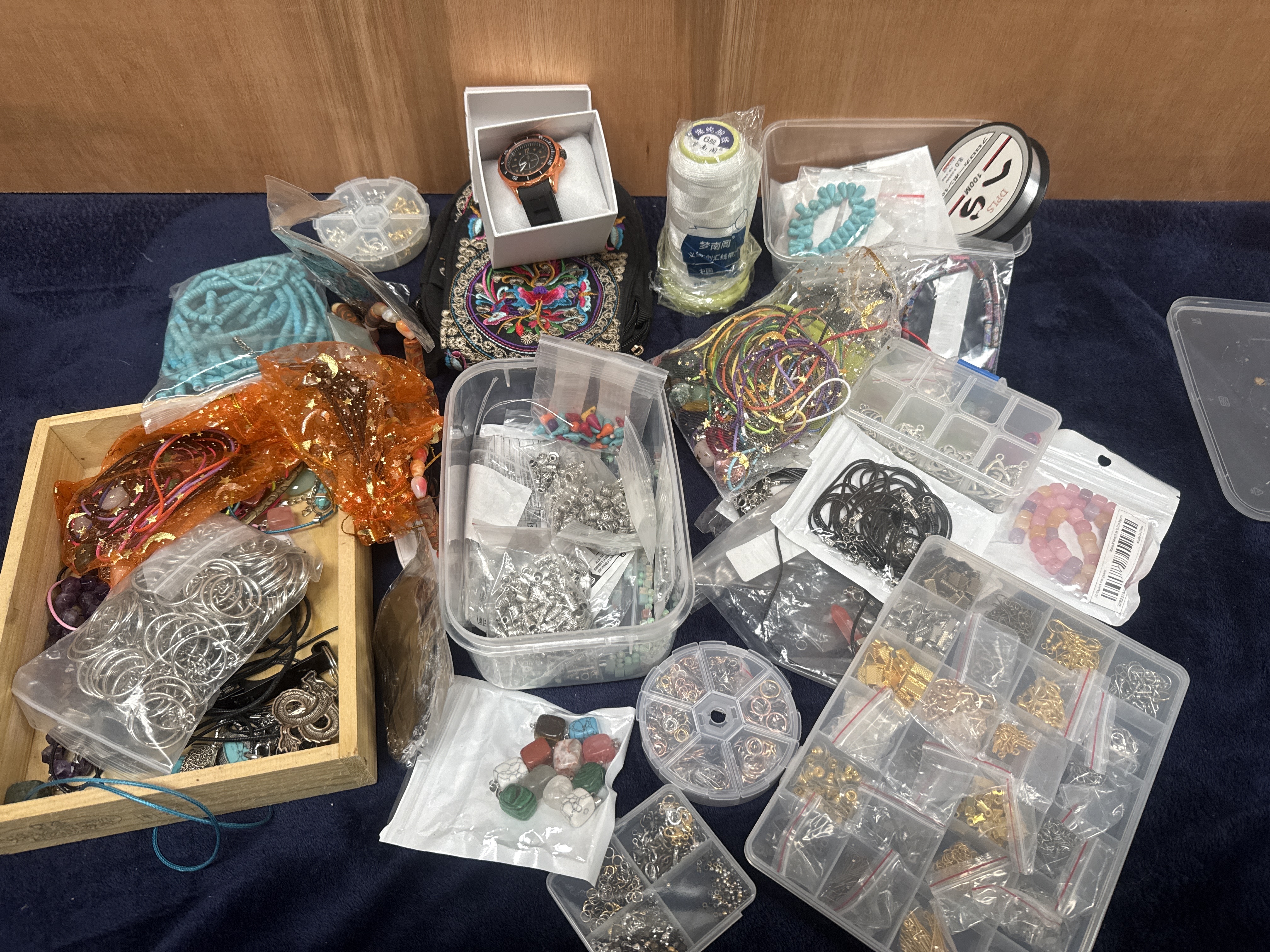 A comprehensive collection of contemporary jewellery-making components and related accessories. The lot comprises a variety of beads in glass, plastic, and stone-style materials, alongside an extensive selection of base-metal findings including jump rings, ear wires, lobster clasps, and spacer beads. Many components are housed in plastic compartment organisers and individual zip-top bags. The collection includes several spools of thread and monofilament, various colourful and black jewellery cords, and assorted pendants. Also included is a modern men’s-style wristwatch with a black and orange strap in a white presentation box, a small embroidered textile pouch with floral motifs, and a wooden storage tray. Several items retain original retail packaging with barcodes and Chinese character labelling.