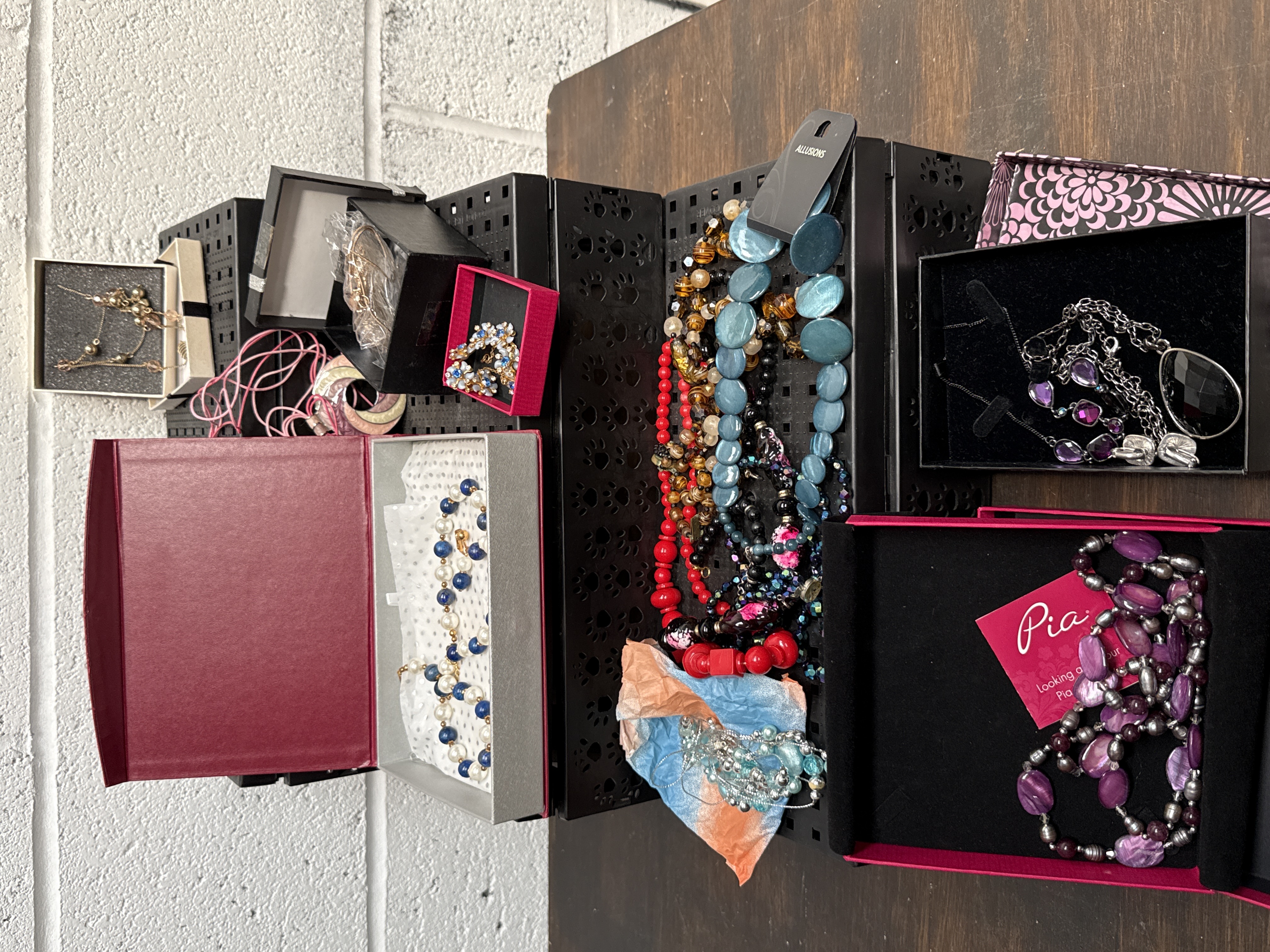 An assortment of costume jewellery items presented with several black patterned wall-mounted organiser panels. The jewellery collection includes various beaded and chain necklaces, earrings, and decorative pieces. Visible branding includes a retail card for Pia and a tag for Allusions. The collection features a variety of materials including base metals, glass, plastic, faux pearls, and synthetic or semi-precious stones. Styles range from chunky multi-coloured bead strands and large blue disc necklaces to more delicate metallic chains and floral-motif earrings. The items are housed in a variety of retail gift boxes and packaging. The organisers consist of black panels with decorative paw-print and geometric cut-out designs.