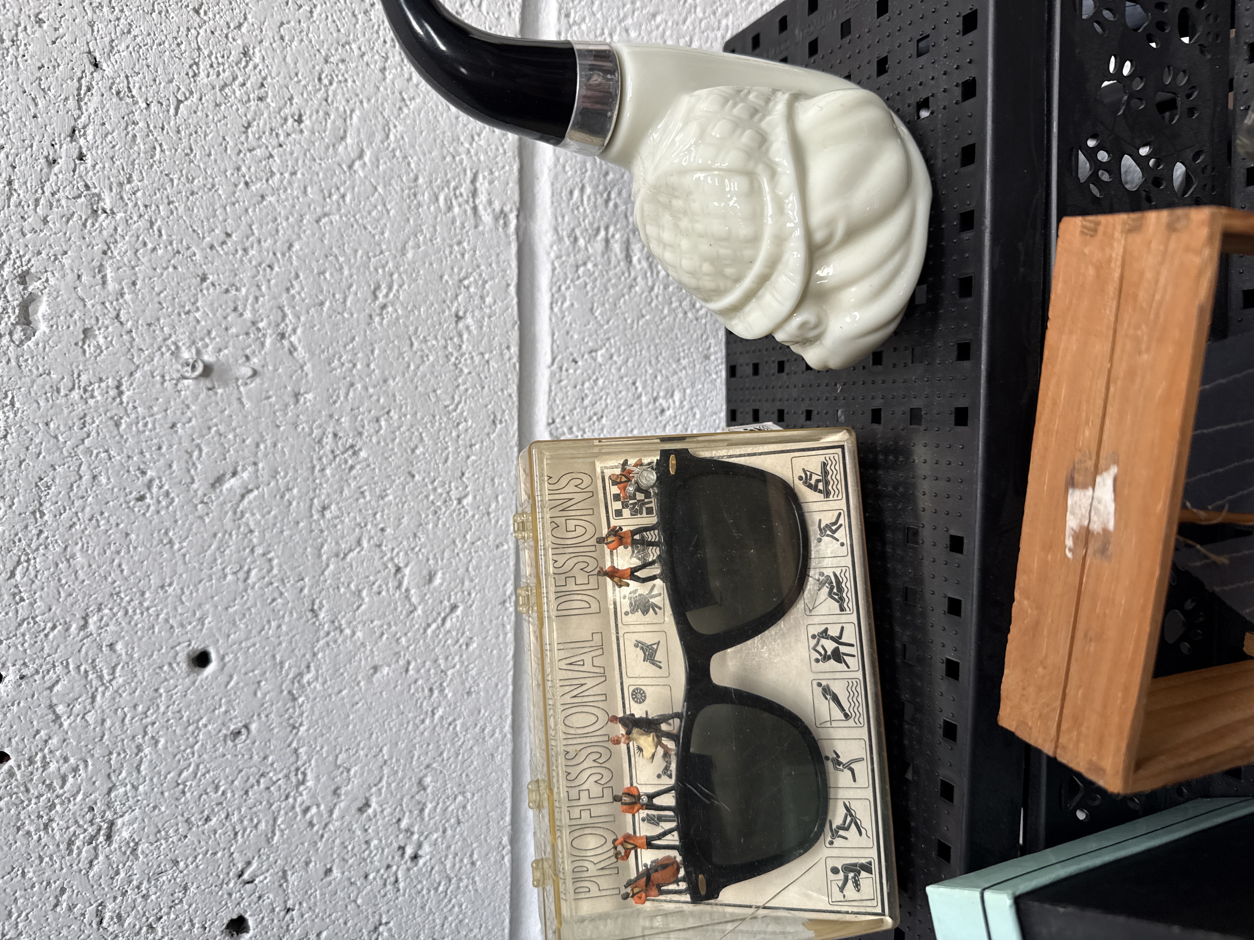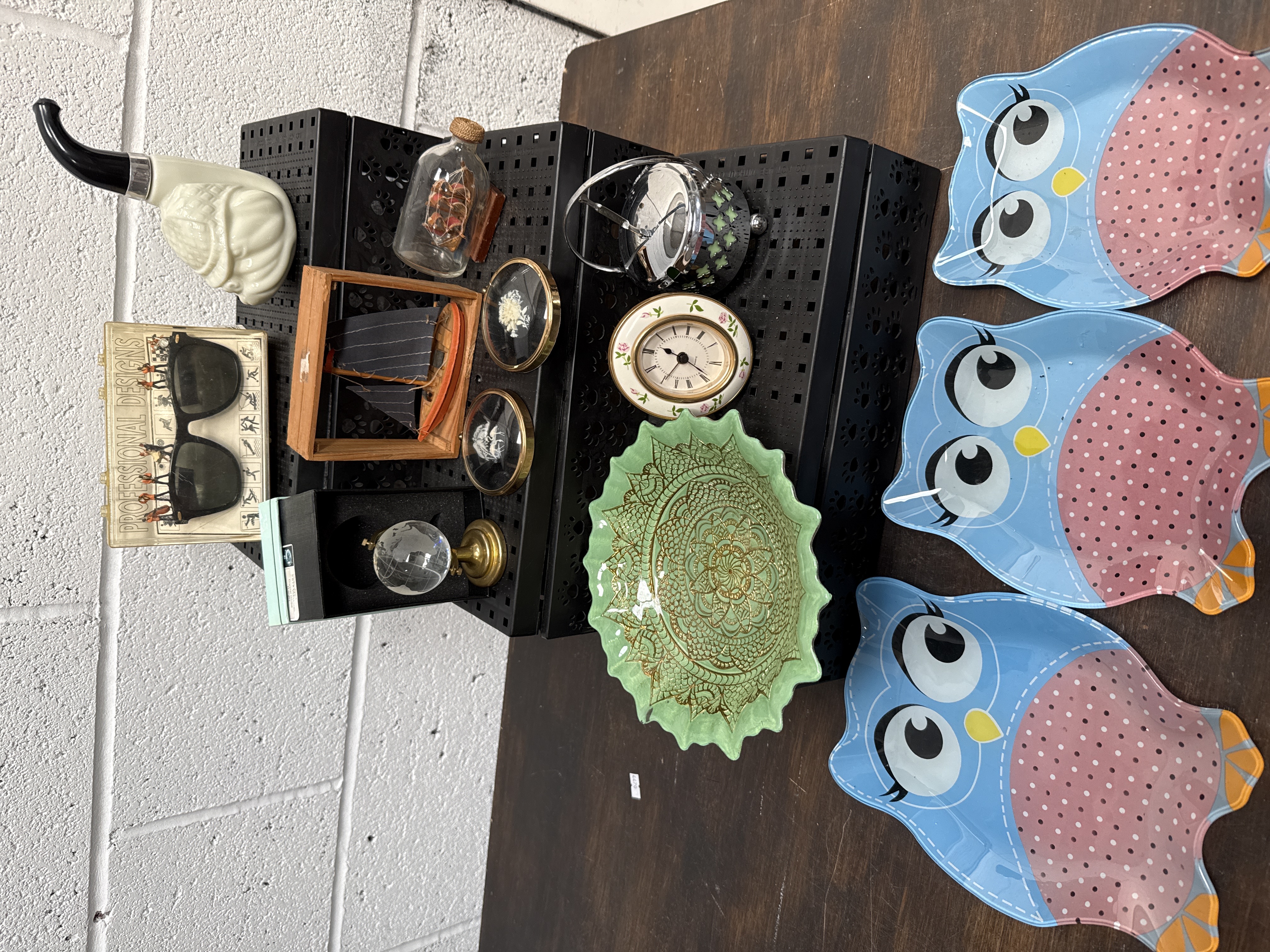 An assortment of decorative and collectible items. The collection includes a green pressed glass bowl with a scalloped rim featuring a gilded mandala design to the interior. Also included are several owl-shaped melamine plates with a blue and pink polka-dot motif. The lot further comprises a small mantle clock with a floral-embellished face and Roman numerals a ship-in-a-bottle and a wooden-framed sailing vessel model. Additional items include a crystal globe mounted on a brass-toned base several small circular framed decorative pieces and a silver-toned metal basket with openwork detailing. Completing the collection is a white moulded pipe bowl with a black stem and a pair of dark-lensed sunglasses housed in a plastic case marked PROFESSIONAL DESIGNS. Materials include glass ceramic wood metal and plastic.