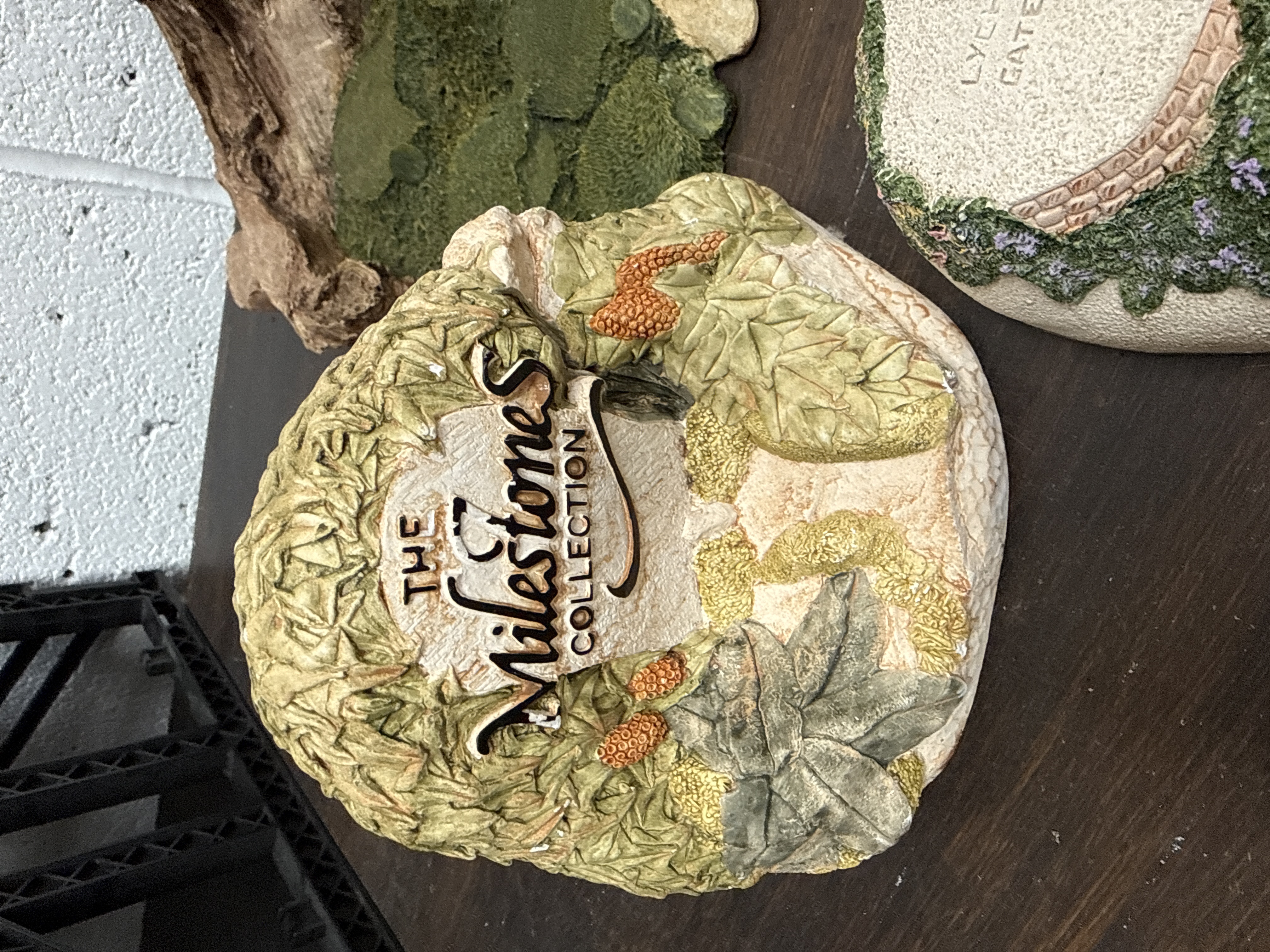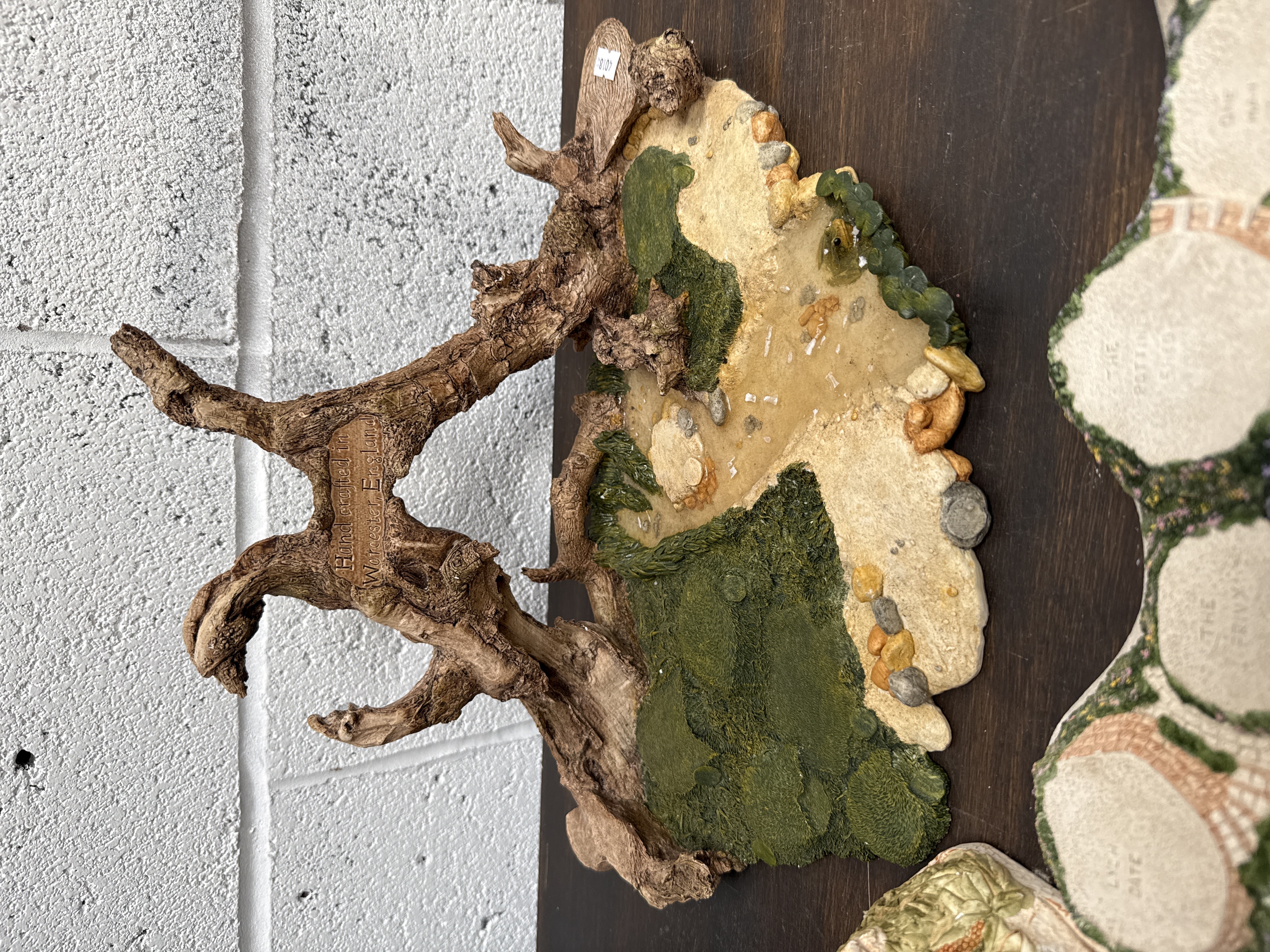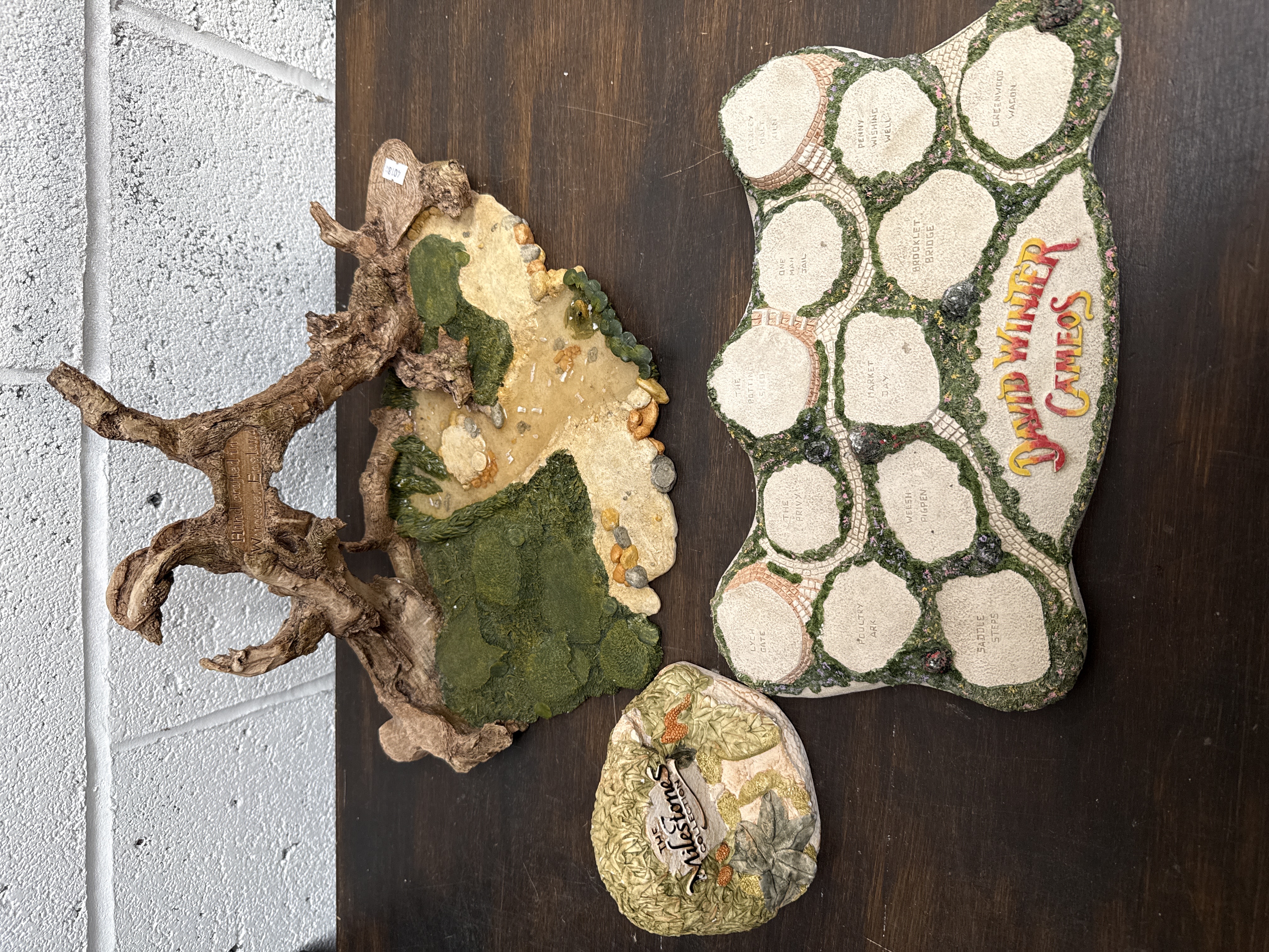 A collection of three hand-painted display accessories designed for David Winter miniature figurines. The lot includes a landscape-style base featuring a gnarled tree trunk with an embossed mark reading Hand crafted in Worcester, England. This base depicts a textured scene with mossy grass, a sandy path, and stone details. Also included is a large, flat display plaque titled David Winter Cameos, featuring recessed and labeled positions for specific models including Market Day, Brooklet Bridge, and Penny Wishing Well. The third item is a smaller rounded plaque for The Milestones Collection, decorated with relief-carved foliage and fruit. All items are constructed from a cold-cast composite material with painted finishes.