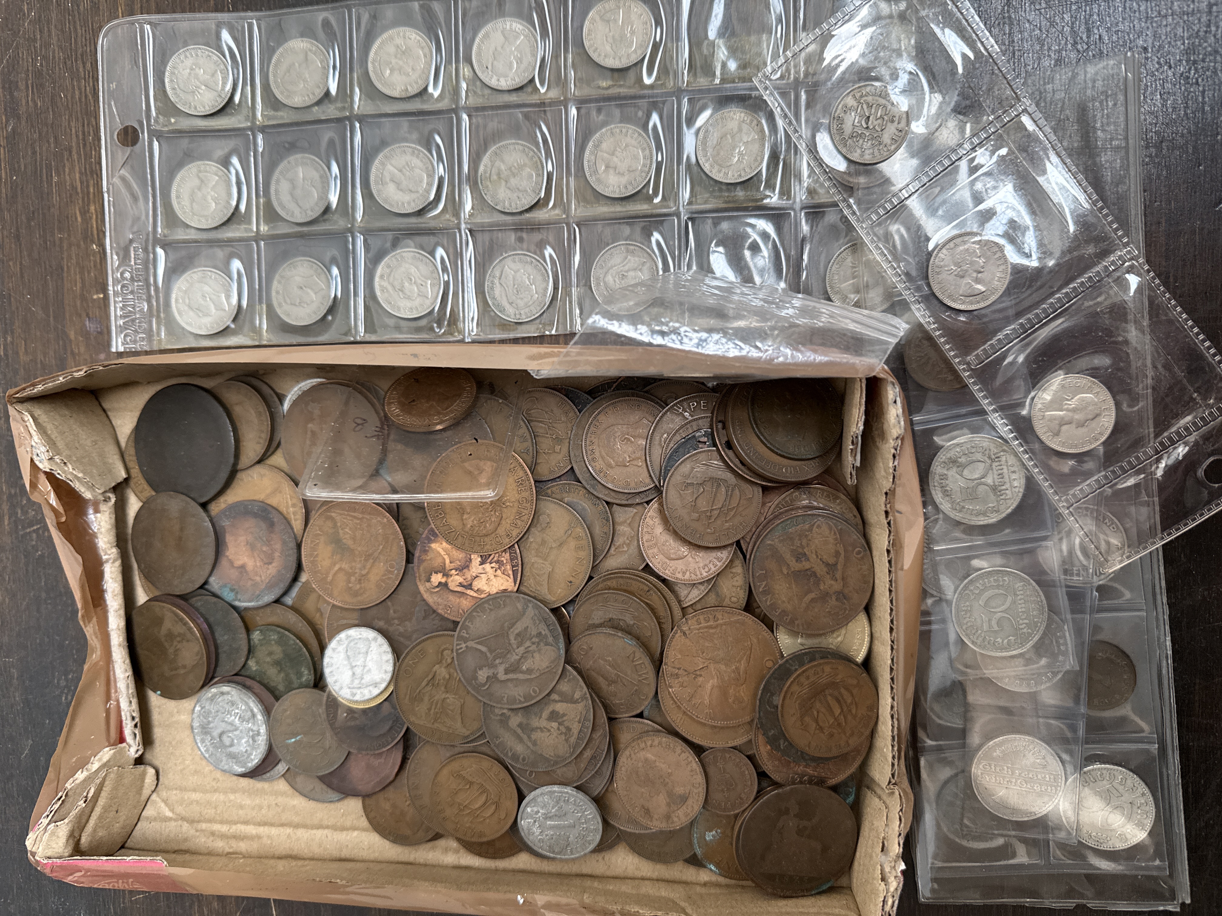 A collection of international coinage, primarily consisting of British currency from the 20th century. The assembly includes various denominations such as pennies, halfpennies, and silver-toned pieces. Visible profiles include King George VI and Queen Elizabeth II, with inscriptions including ONE PENNY, FID DEF, and IND IMP. The collection also features international pieces, notably German 50 pfennig coins bearing the inscription Sich regen bringt Segen. The items are presented in plastic collector sheets, individual flips, and a loose volume within a cardboard box.