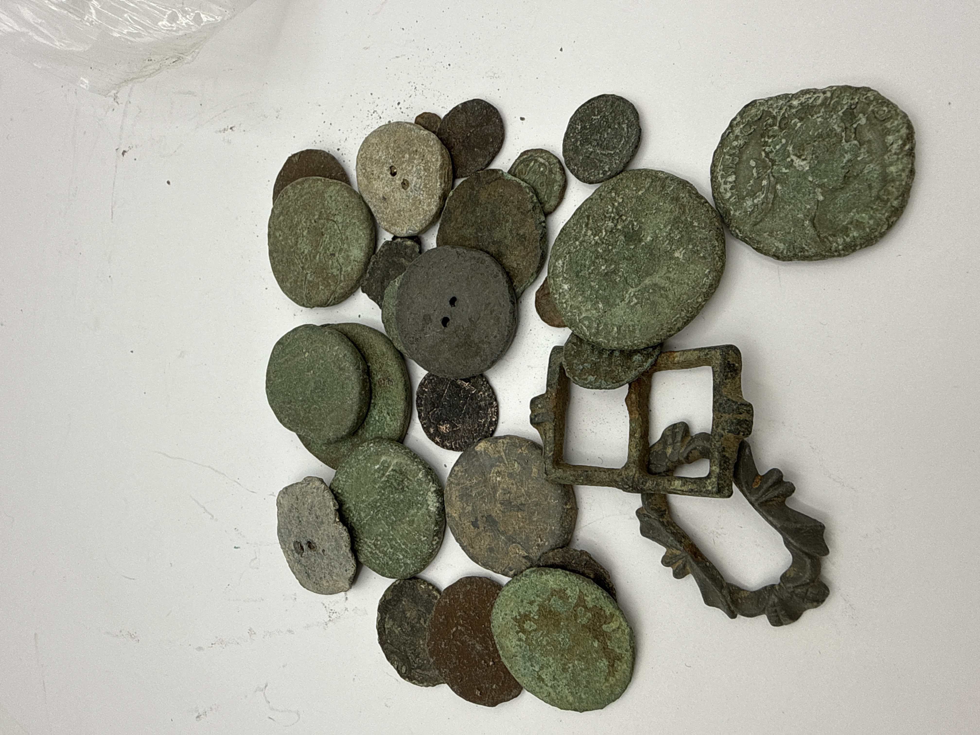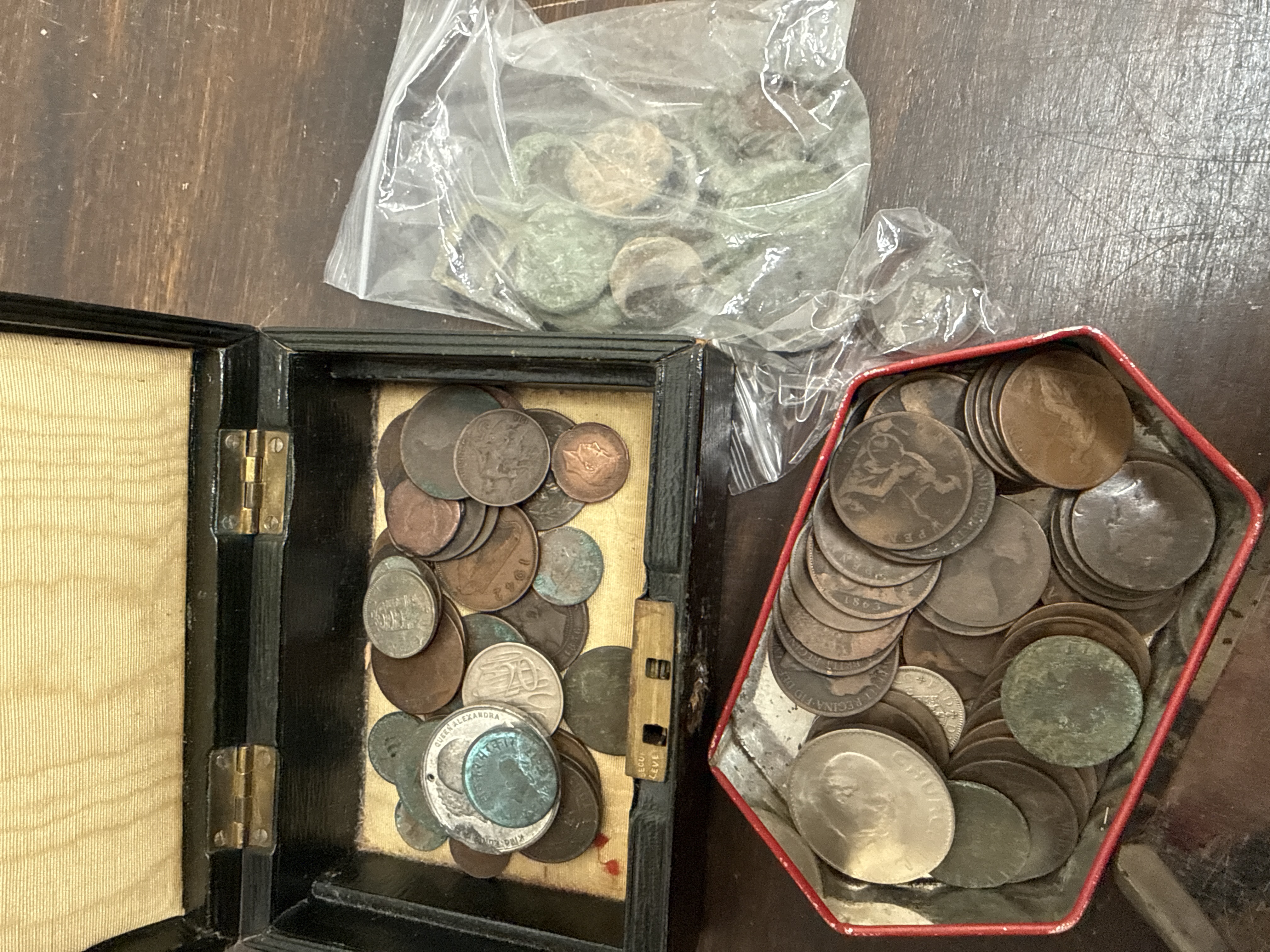 An assortment of 19th and 20th-century British and world currency, medals, and metal artifacts. The collection is housed in a black-lacquered wooden box with a cream fabric-lined interior and brass hardware, a vintage red-rimmed hexagonal tin, and a clear plastic bag. Identified items include a 1965 Winston Churchill commemorative crown, a Queen Alexandra commemorative medal, and a Victorian 1863 penny. The lot also contains various pre-decimal and decimal coinage. A portion of the collection consists of excavated or metal-detecting finds, including historical buttons, clothing buckles, and early-period coins showing heavy patination and environmental wear.