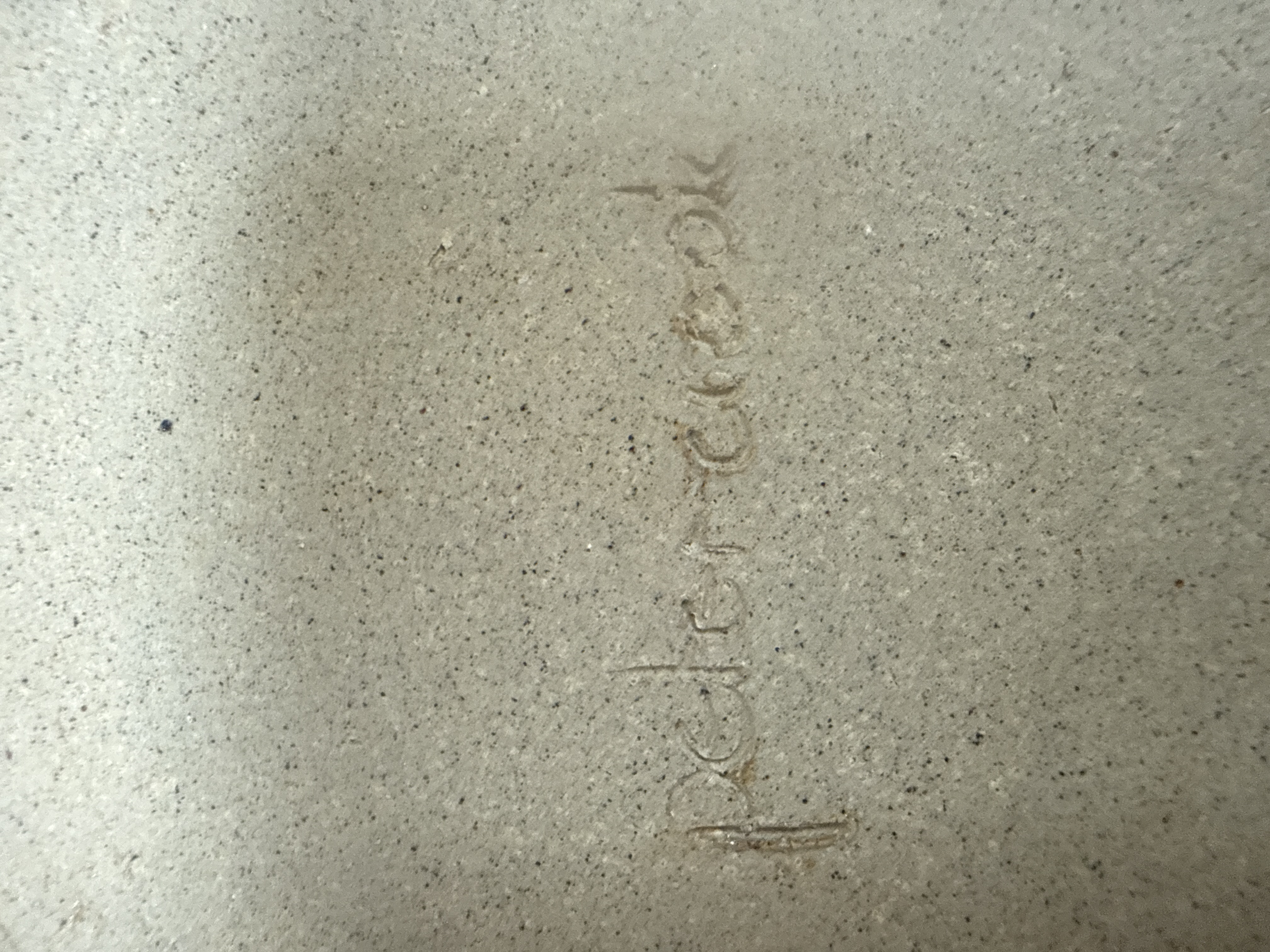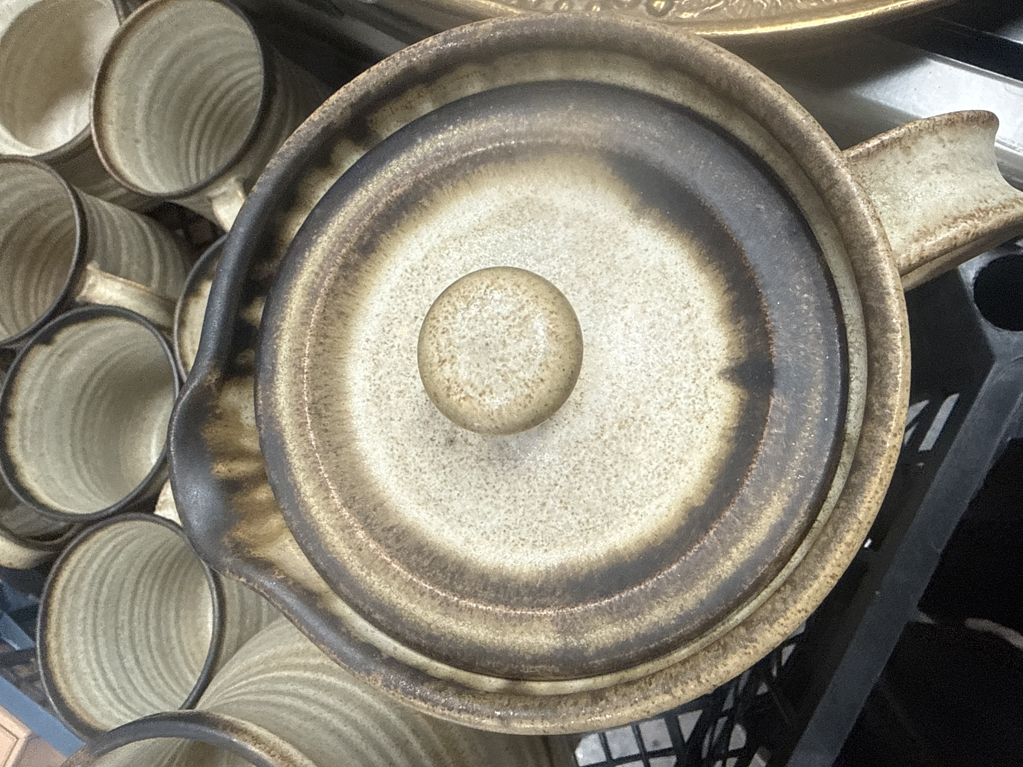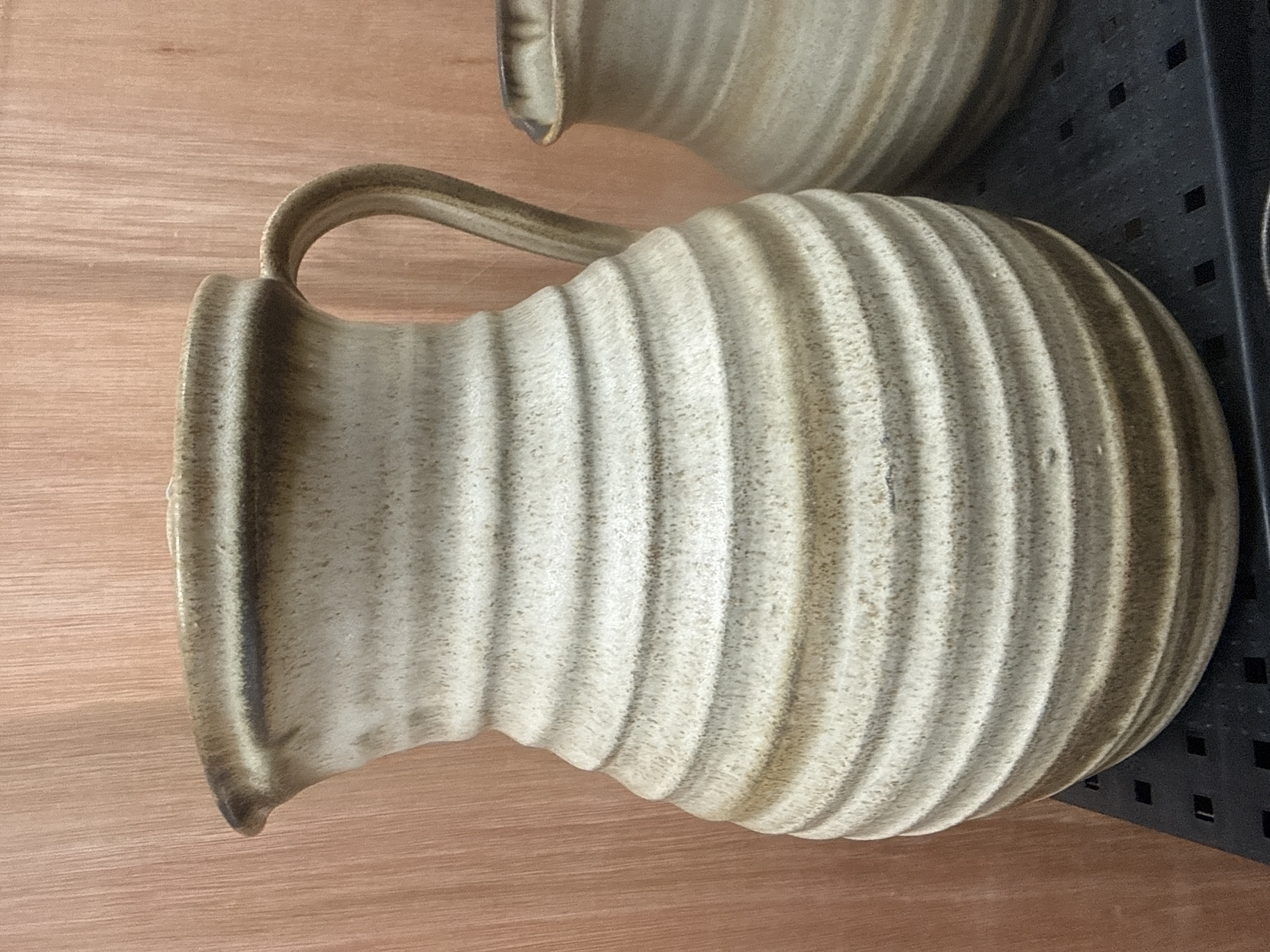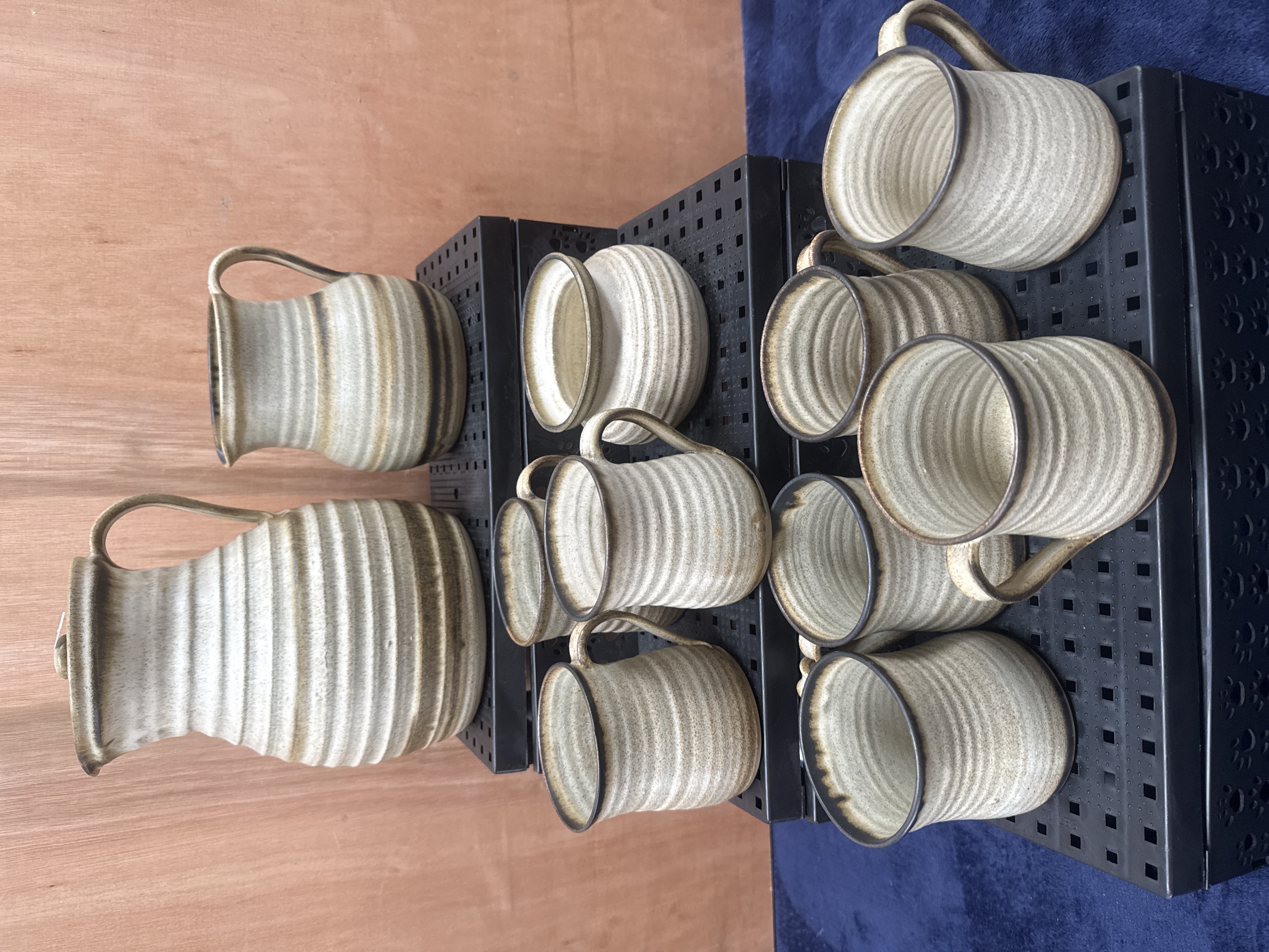 A collection of Peter Cook studio pottery comprising several mugs, pitchers of graduated sizes, and a lidded vessel. The stoneware pieces feature a light oatmeal-coloured speckled glaze with prominent horizontal throwing rings and dark brown accents along the rims and handles. Each piece exhibits a handcrafted aesthetic characteristic of late 20th-century studio pottery. The base of at least one item bears the incised signature Peter Cook.
