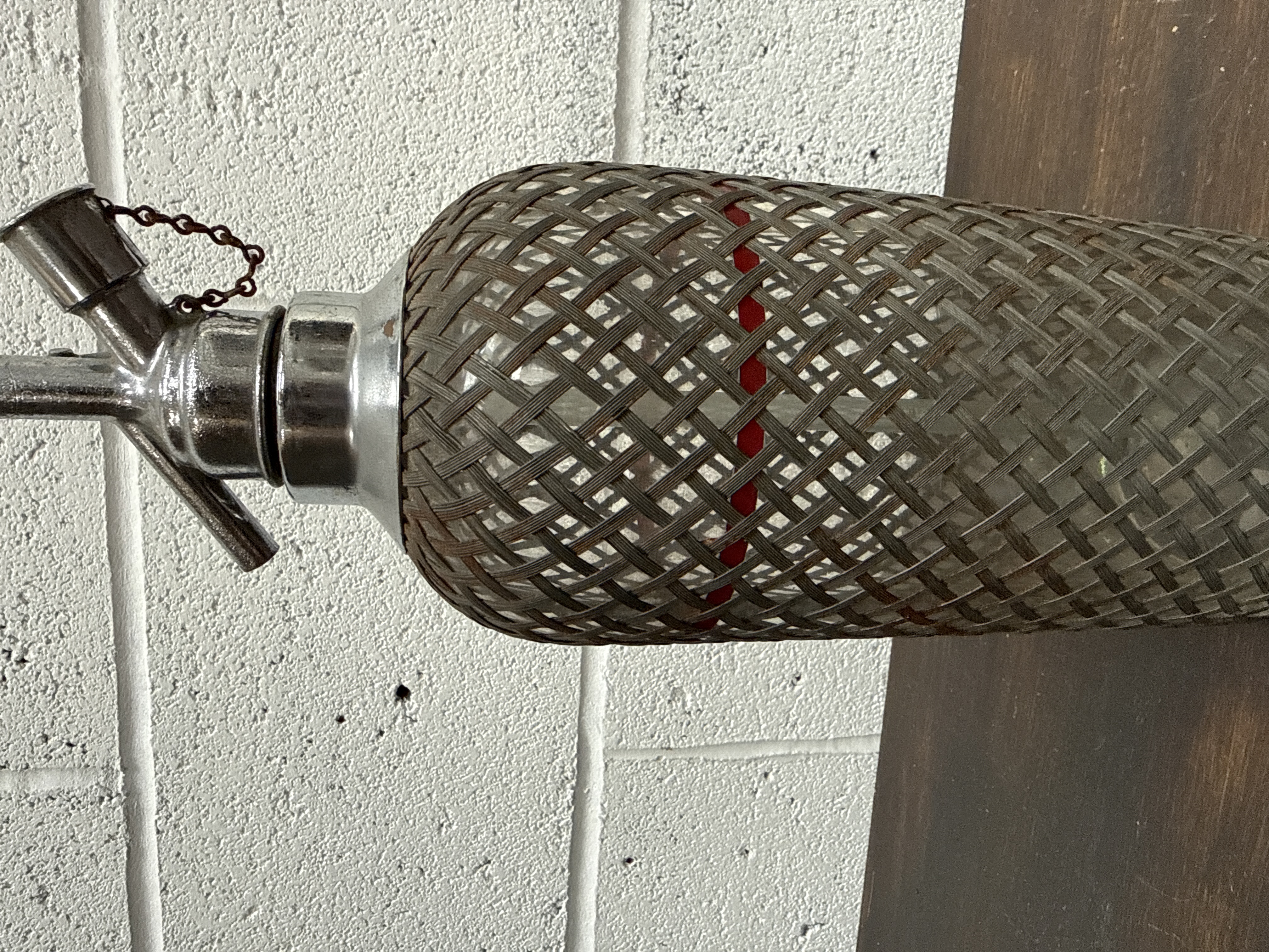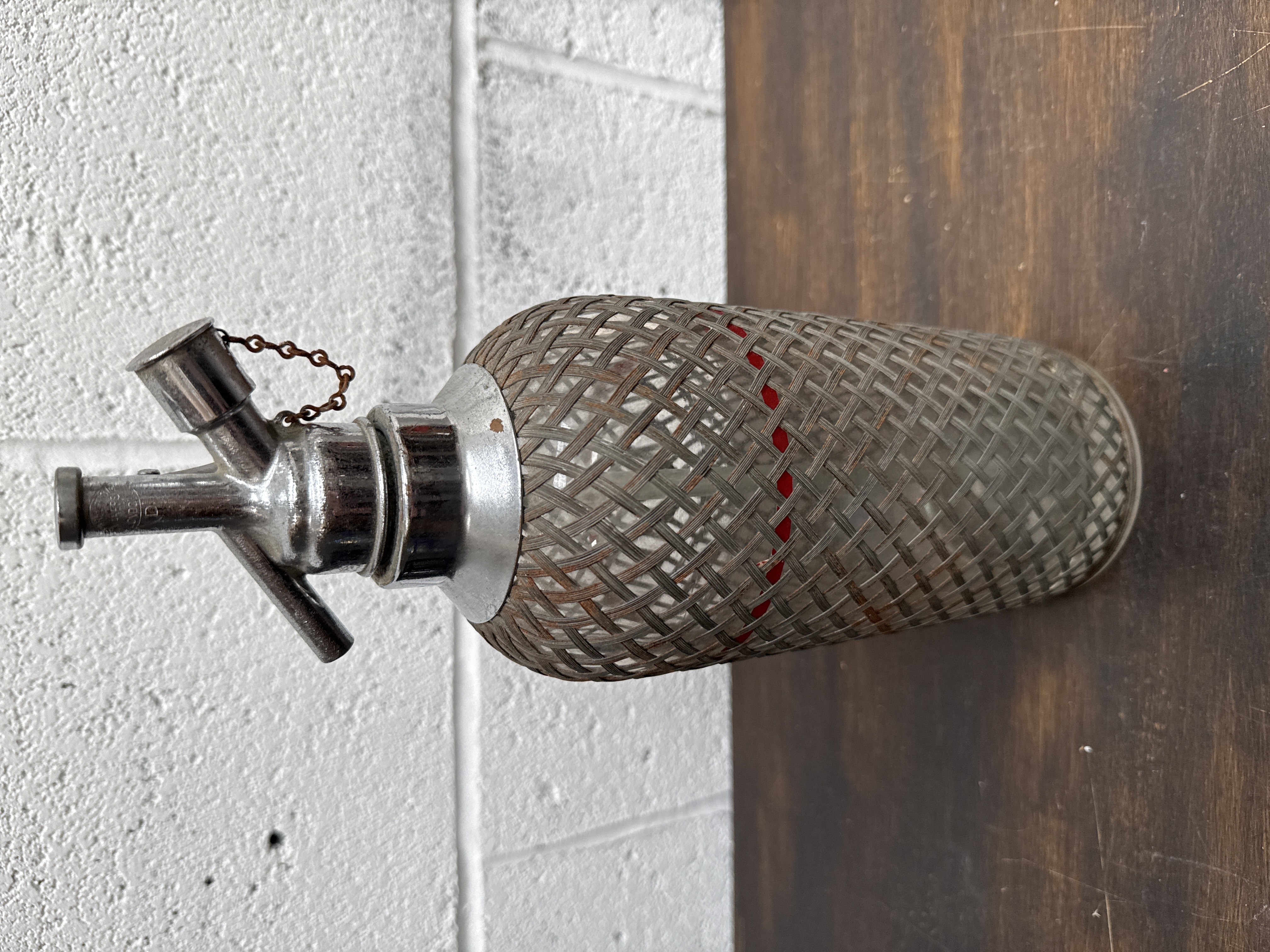 A vintage soda siphon by Sparklets of London, featuring a glass bottle body encased in a protective woven metal wire mesh. The siphon head is constructed from chrome-plated metal and is equipped with a dispensing spout, a lever, and a CO2 cartridge port with a small cap attached by a fine metal chain. A prominent red horizontal fill line is visible on the interior glass bottle through the mesh. The spout is marked with the letter D and manufacturer branding for Sparklets London.