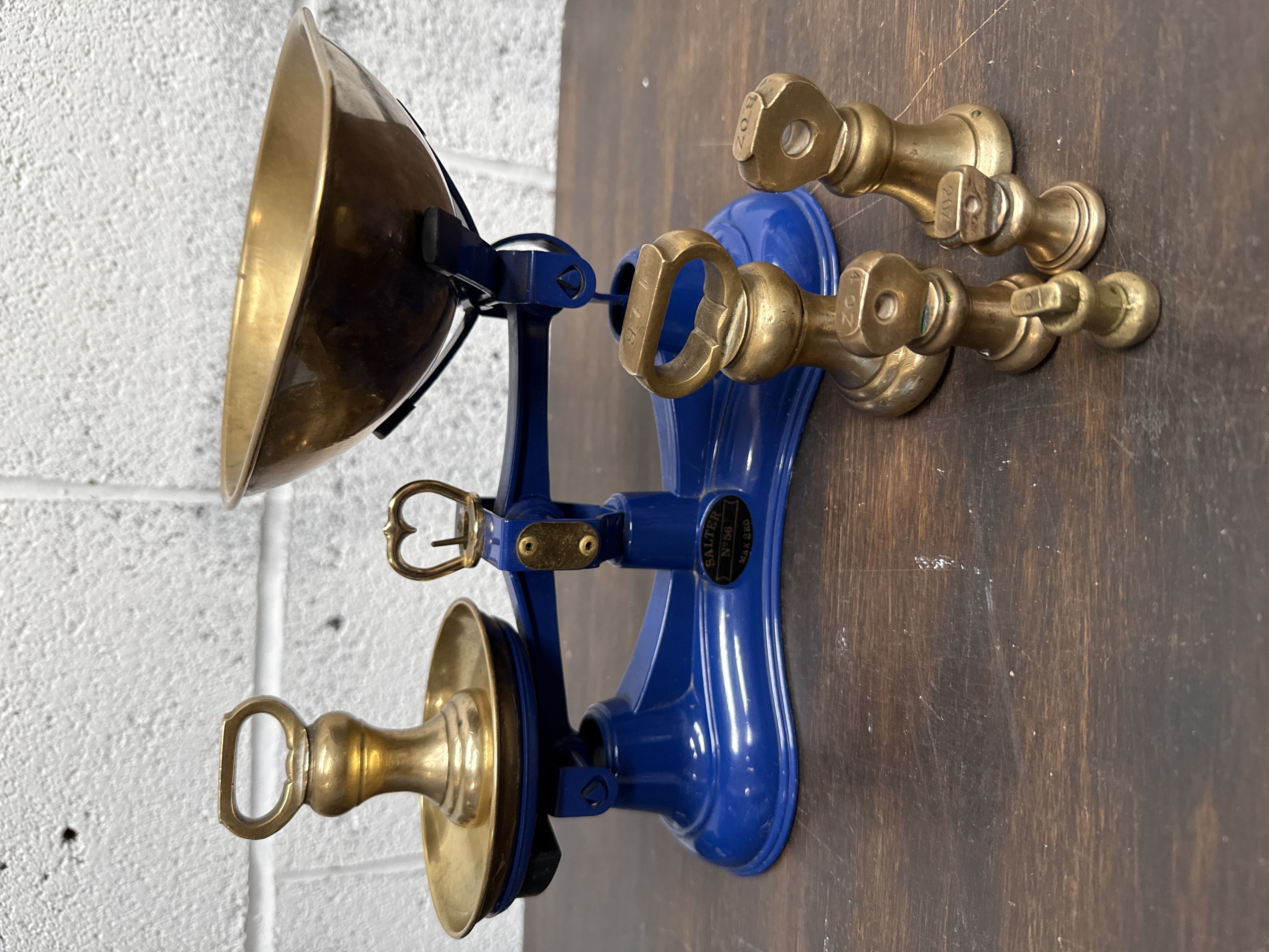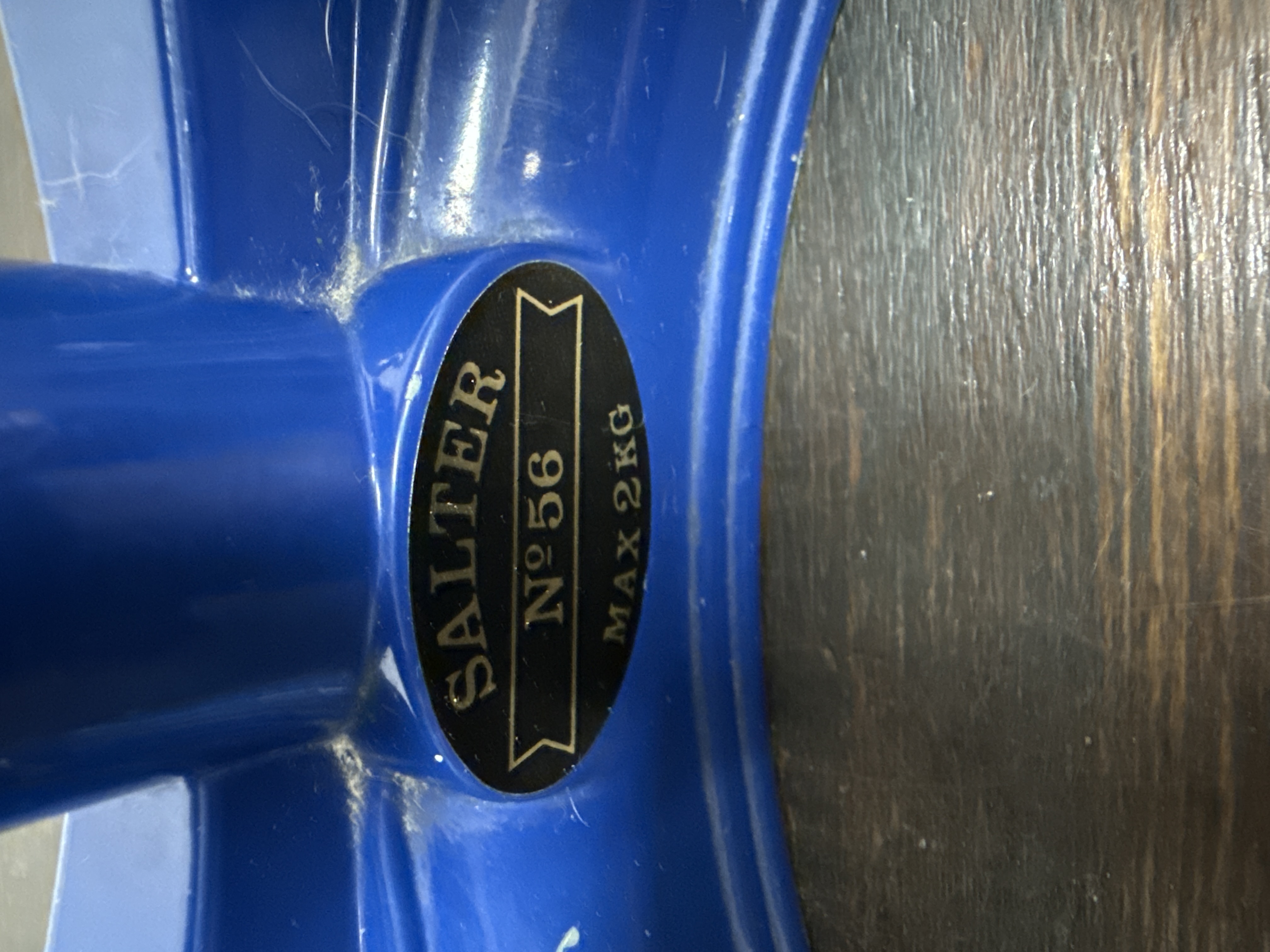 A Salter No. 56 balance scale featuring a blue enamelled cast iron base and a pair of brass pans. The base is fitted with a central black and gold oval label marked SALTER № 56 MAX 2KG. The lot includes a group of graduated brass weights with markings for 1 LB, 8 OZ, 4 OZ, and 2 OZ.