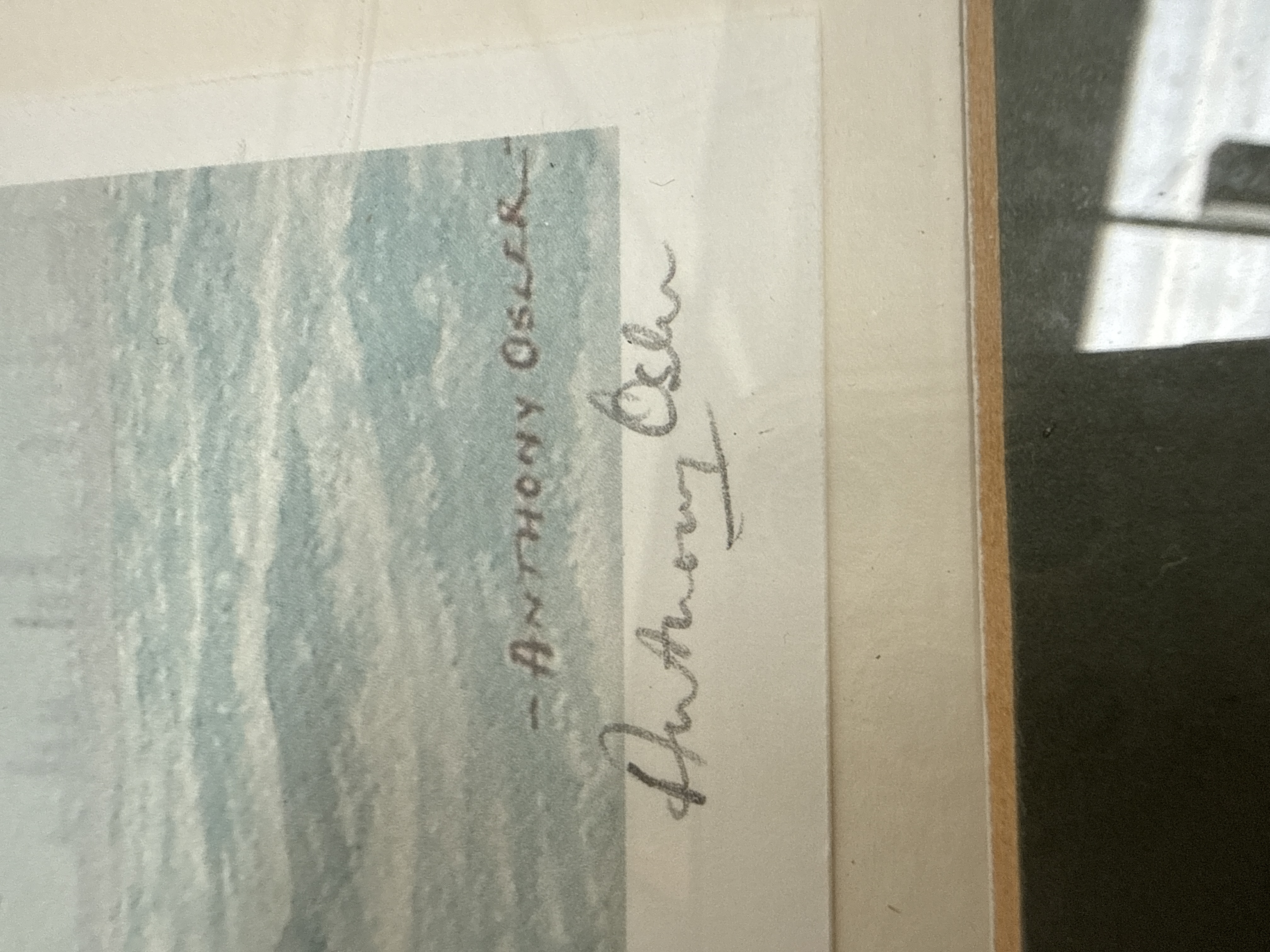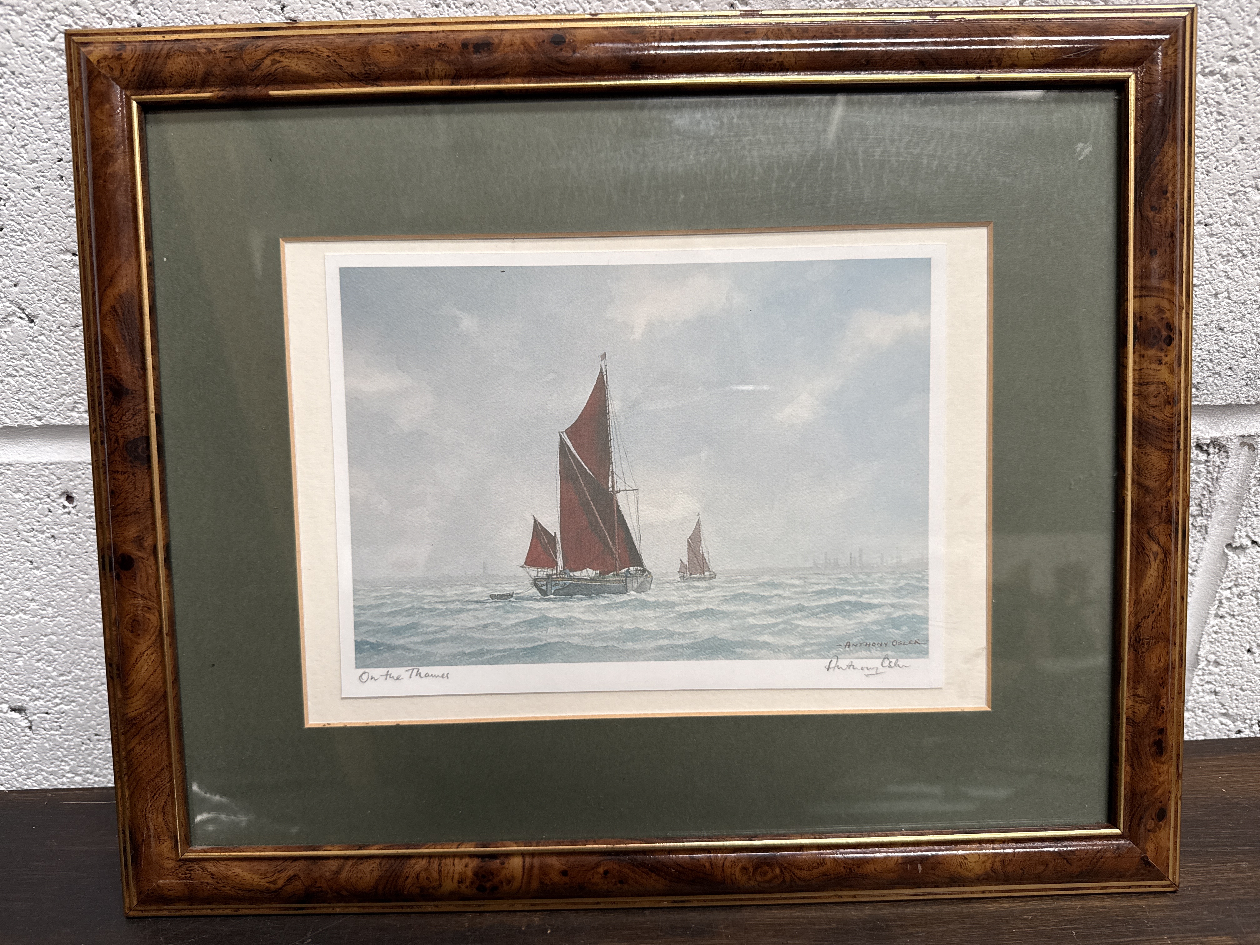 A maritime print titled On the Thames by the artist Anthony Osler. The composition depicts several sailing vessels, including Thames barges with characteristic red sails, navigating choppy waters. The work is signed by the artist in pencil to the lower right margin and features the handwritten title to the lower left. The piece is presented with a double mount of dark green over off-white, housed within a polished wooden frame featuring a burr veneer and a gilt inner slip.