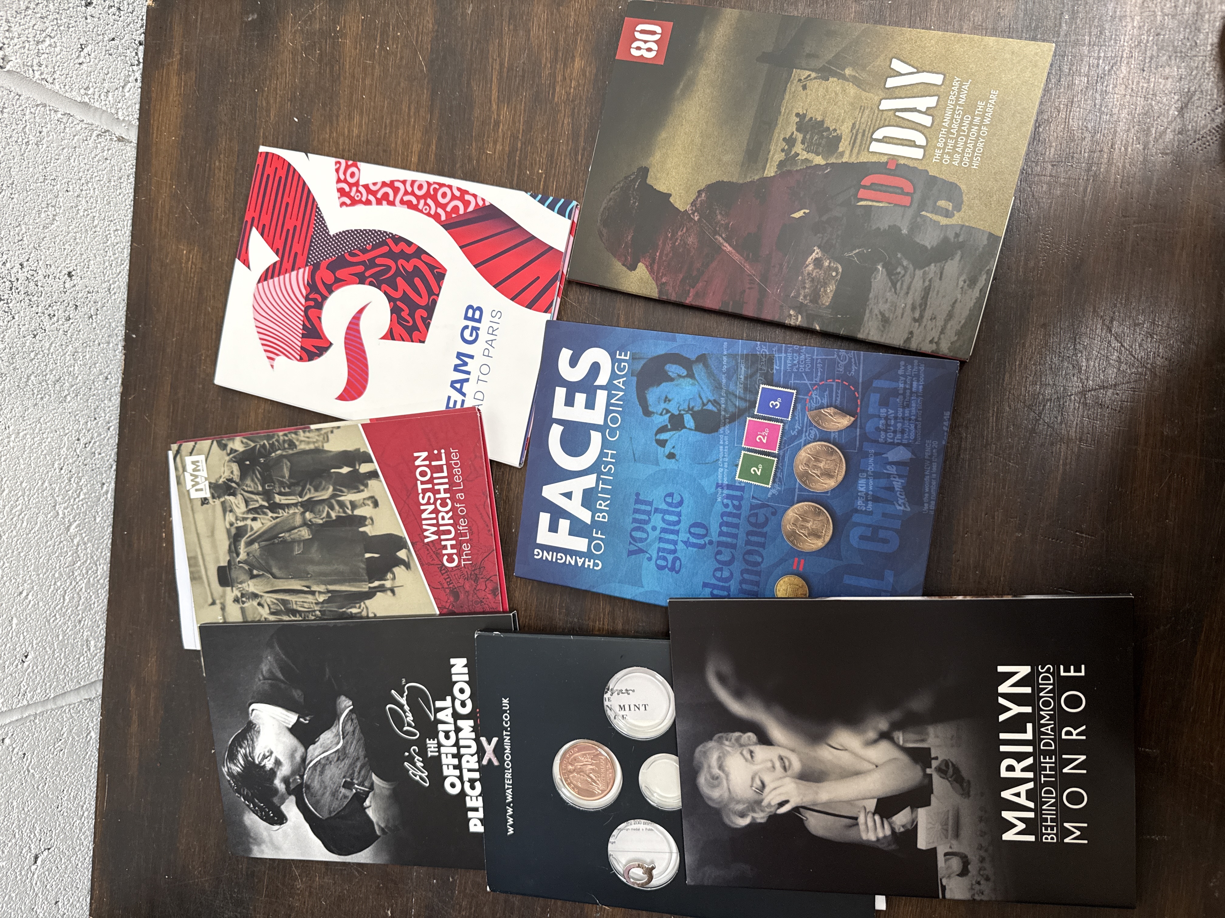 A collection of seven contemporary commemorative booklets and numismatic-related ephemera featuring various historical, cultural, and sporting themes. The group includes printed paper and card materials such as a Team GB Road to Paris booklet, an 80th-anniversary D-Day publication, and an Imperial War Museum booklet titled Winston Churchill: The Life of a Leader. Also present is a numismatic guide titled Changing Faces of British Coinage: your guide to decimal money. Promotional and presentation items include an Elvis Presley Official Plectrum Coin booklet, a Marilyn Monroe: Behind the Diamonds commemorative piece, and a presentation card from The London Mint. Each of the seven items in this lot is confirmed to contain 1 coin or commemorative medal, housed within the respective packaging or presentation inserts. The items feature high-quality printed graphics on cardstock and paper.