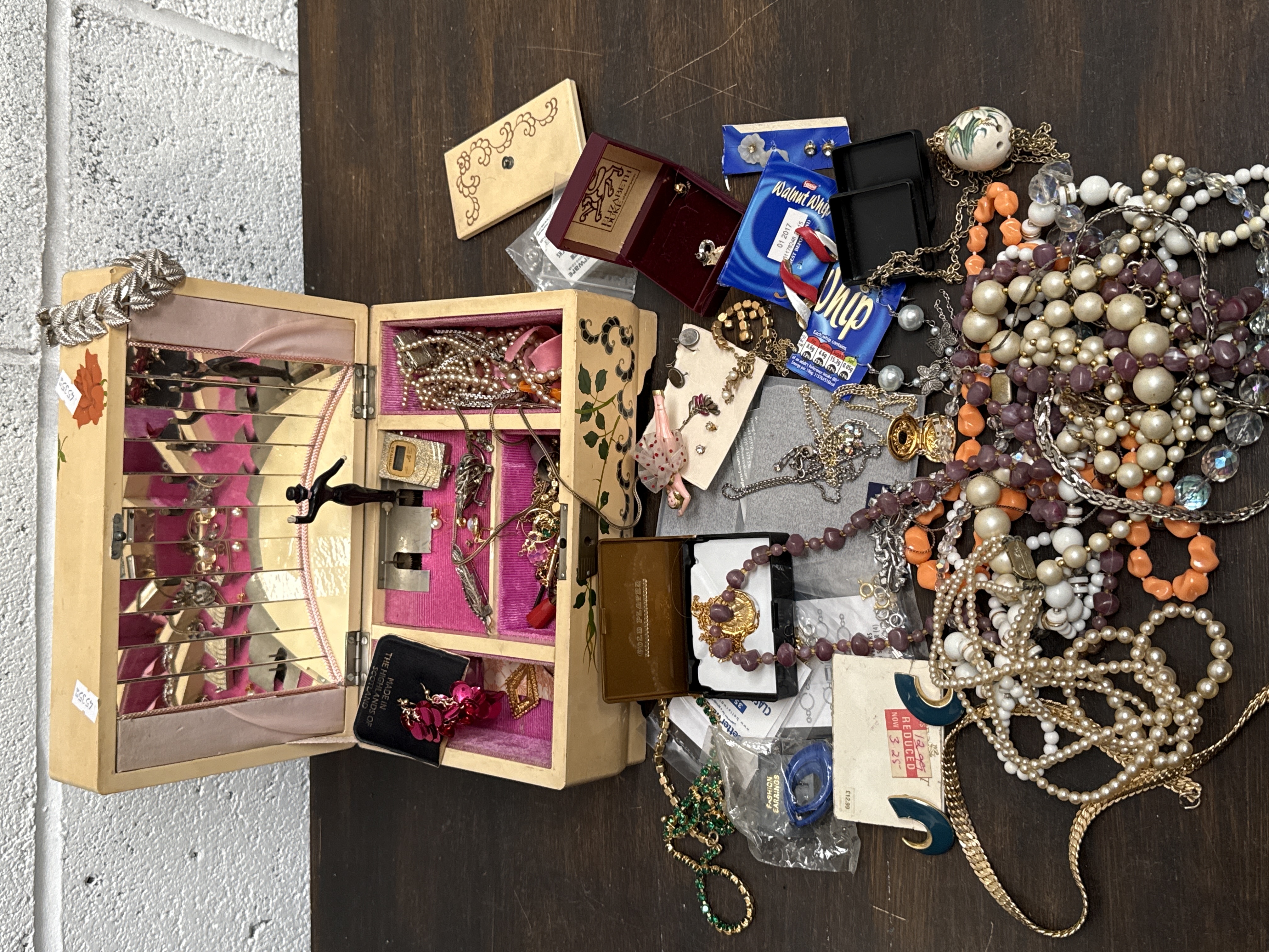 An assortment of costume jewellery and accessories accompanied by a musical jewellery box. The upright wooden box is finished in a cream colour with painted floral motifs and features a hinged lid, a mirrored interior back, and a rotating ballerina figurine. The interior is lined with pink velvet-effect fabric. The collection of jewellery includes various necklaces, bracelets, earrings, and pendants. Materials include base metals, plastics, faux pearls, and glass beads in various styles. Notable items within the lot include a red velvet presentation box marked ELIZABETH, a black presentation box marked MADE IN THE HIGHLANDS OF SCOTLAND, and various retail tags and packaging remnants.