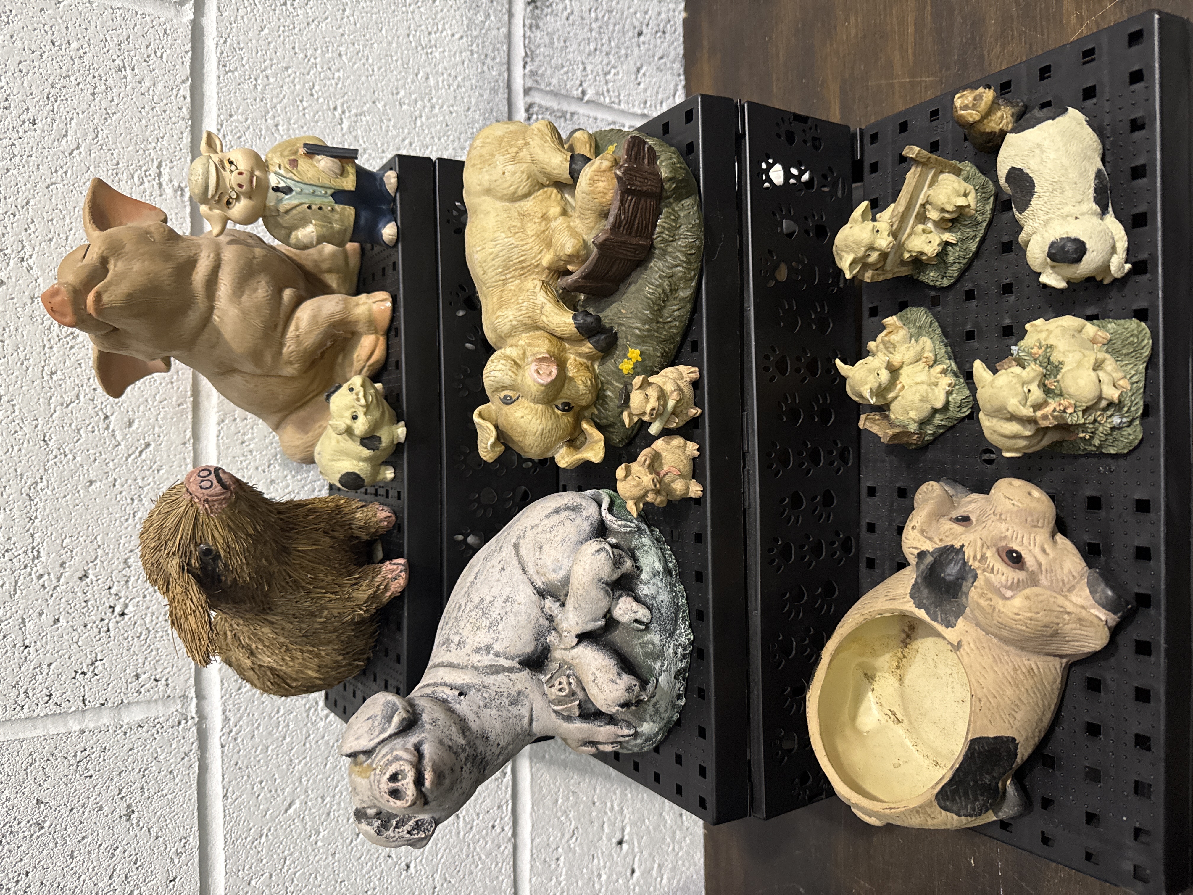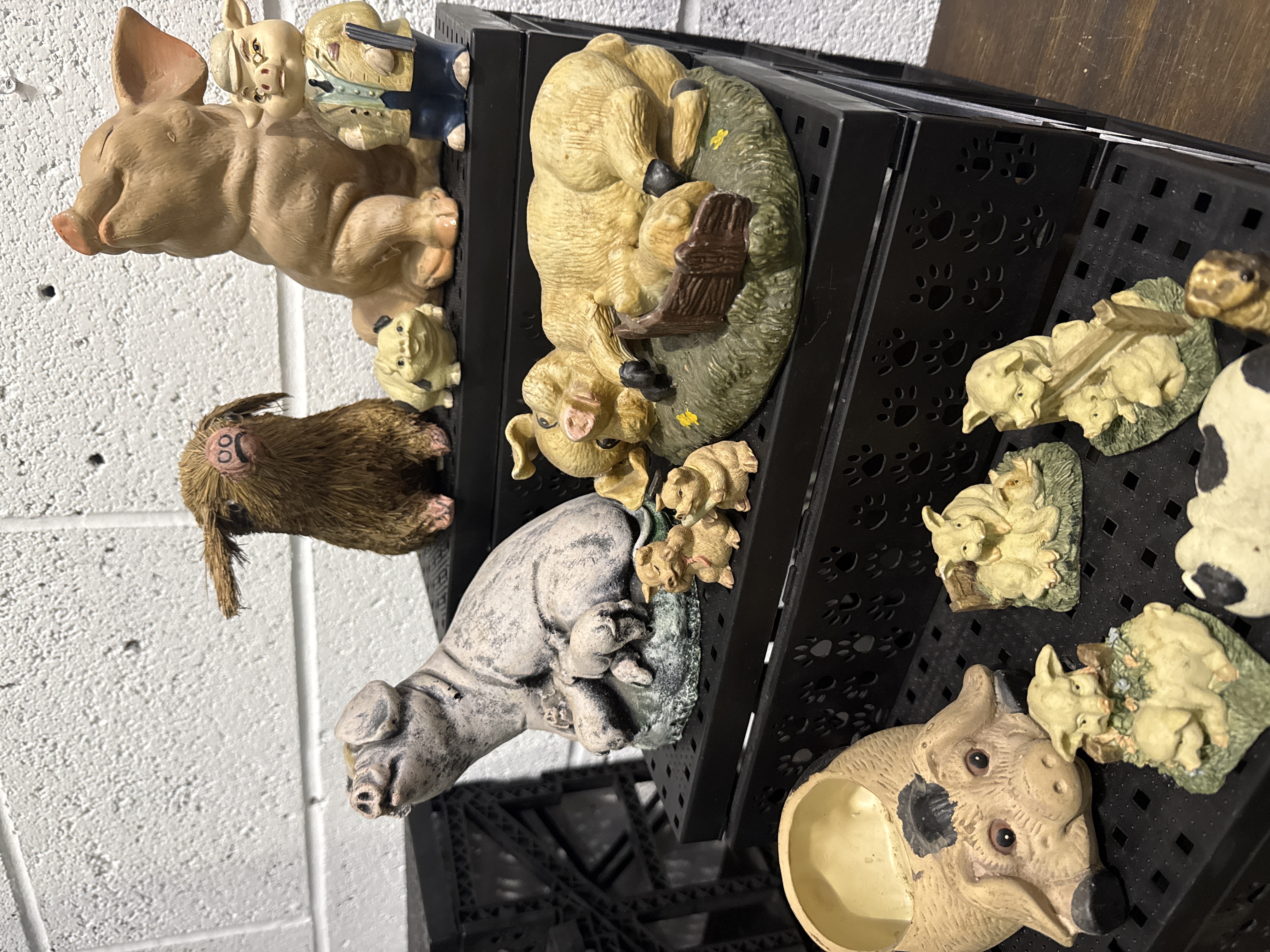An assortment of pig-themed figurines and decorative items, featuring several moulded resin figures from the Piggin collection by David Corbridge. The collection includes various anthropomorphic swine in poses such as a pig wearing a waistcoat and others in resting or reclining positions. Also included is a large cast-stone-effect sculpture depicting a sow with her piglets, a pig-head-shaped planter or bowl with black painted spots, and a naturalistic pig figure with a natural bristle fibre exterior. The items are constructed from a variety of materials including moulded resin, composite, and stone-effect media.