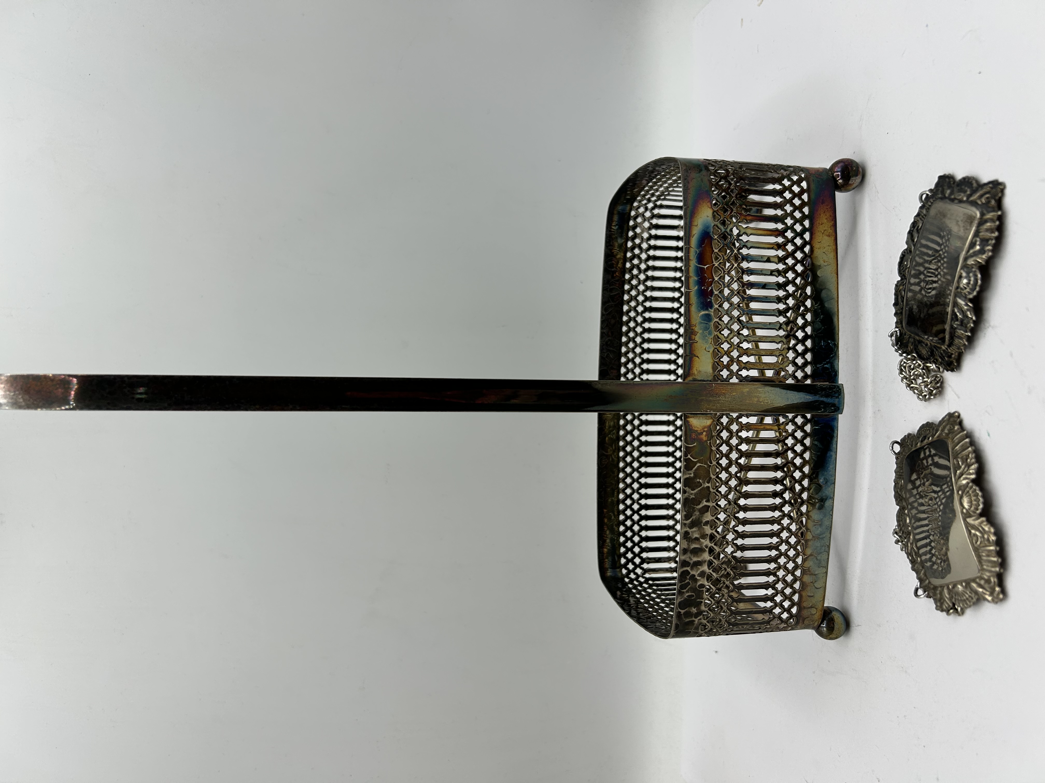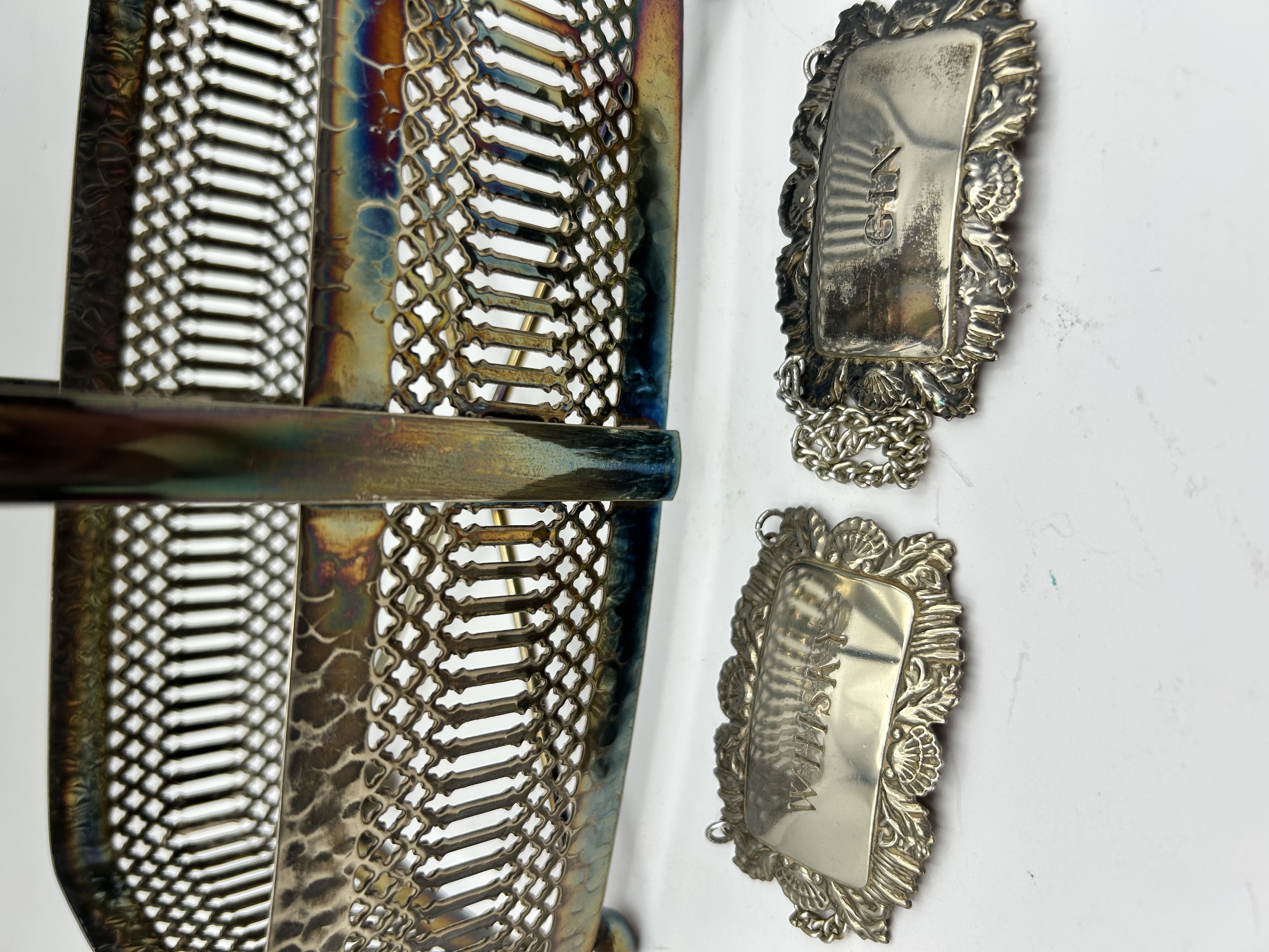 A group of silver-toned metal articles comprising a footed basket and decanter labels. The basket is of rectangular form with rounded corners, featuring a fixed centre handle and a reticulated gallery with a repeating geometric pierced pattern. The piece is supported by four small ball feet. Accompanying the basket are ornate decanter labels featuring scrolled and shell-motif borders, with engraved text for GIN and WHISKY. The labels are fitted with suspension chains.