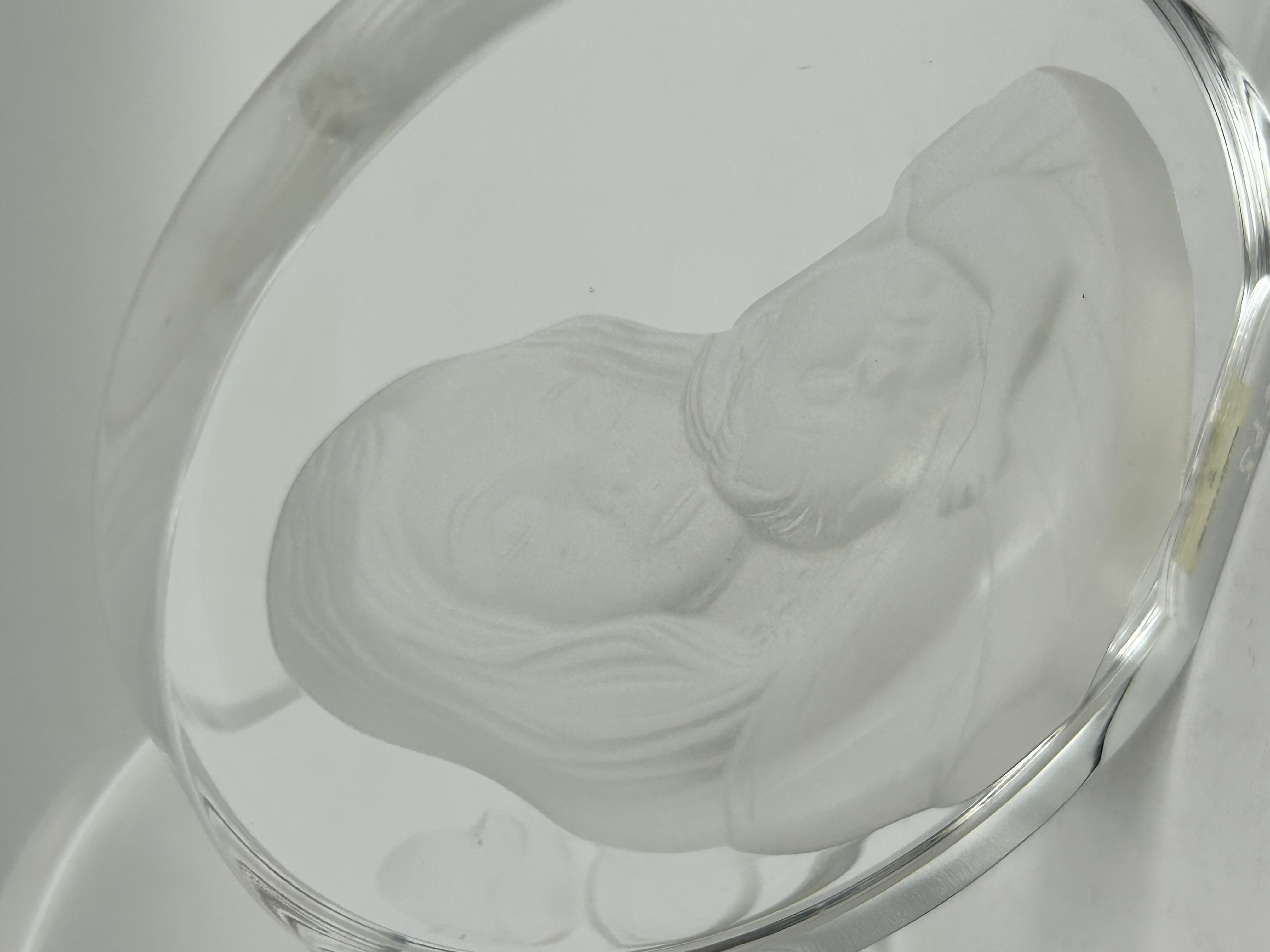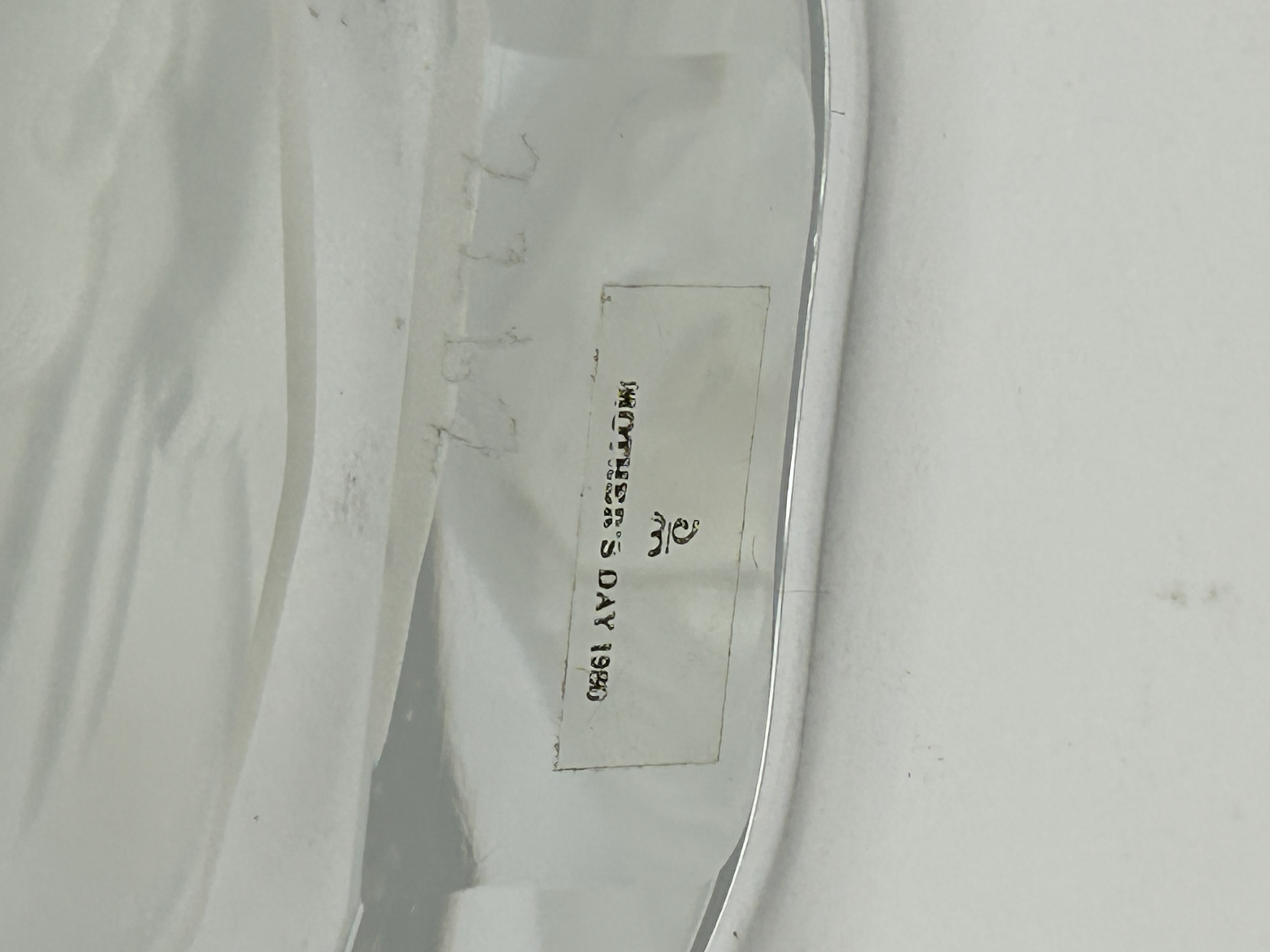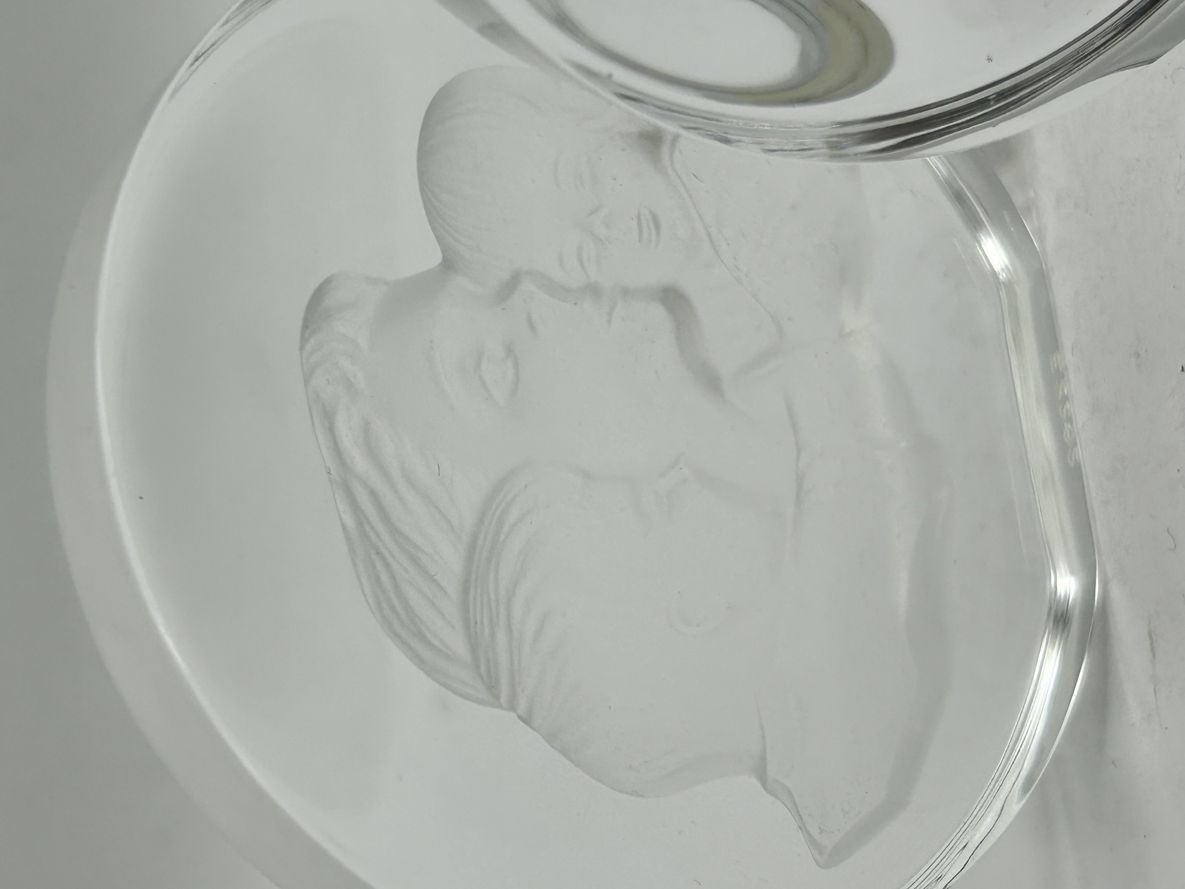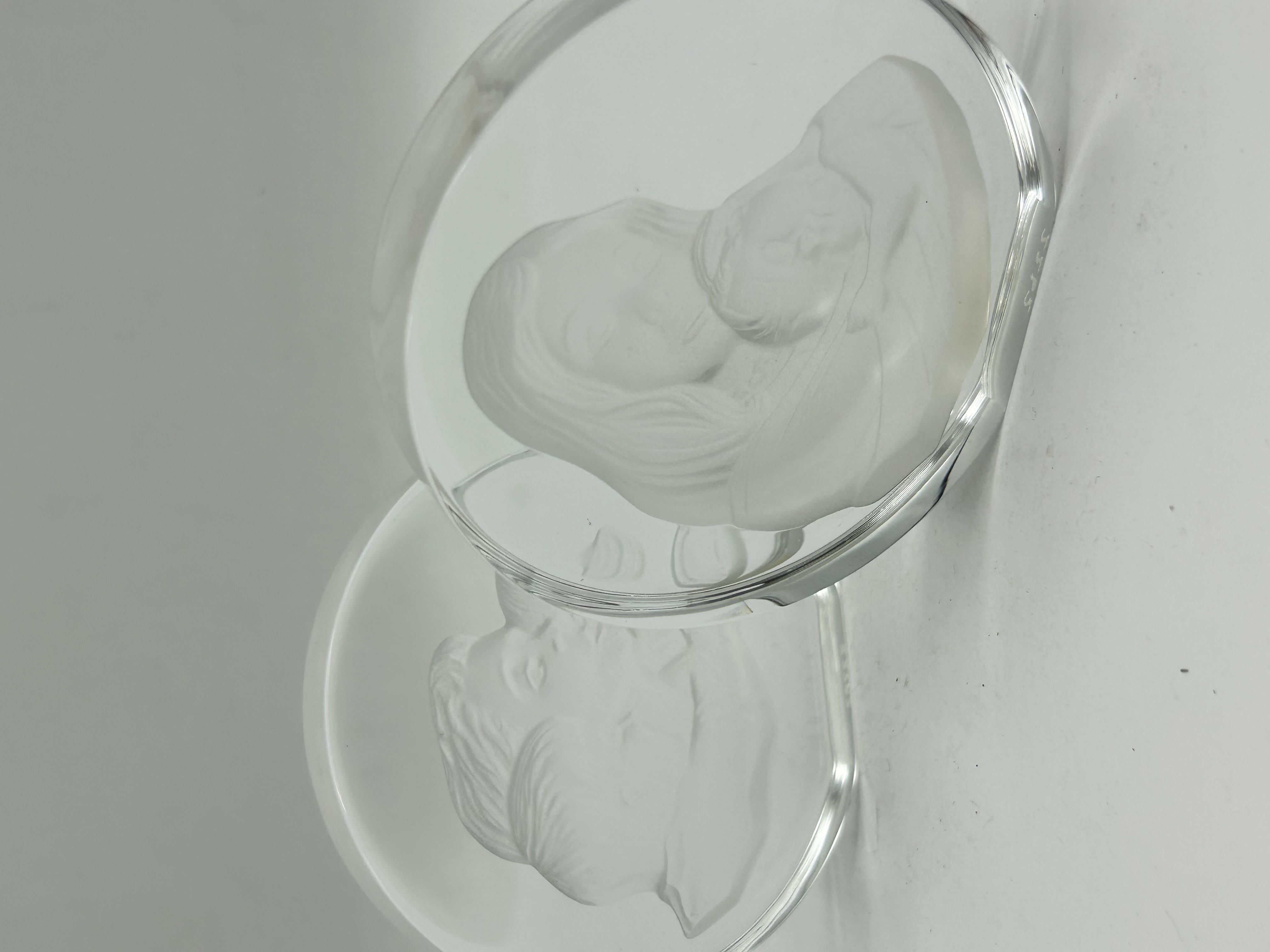 A pair of circular clear crystal plaques featuring frosted bas-relief portraits. One plaque depicts a Mother and Child motif, while the second shows the face of a young child. The reverse of the Mother and Child plaque bears an adhesive label featuring a crown logo and the text MOTHER’S DAY 1980 alongside a handwritten inventory number 7762. The pieces are constructed from heavy clear glass with intaglio-style frosted decoration to the reverse. Faint etched markings are visible near the outer rims.