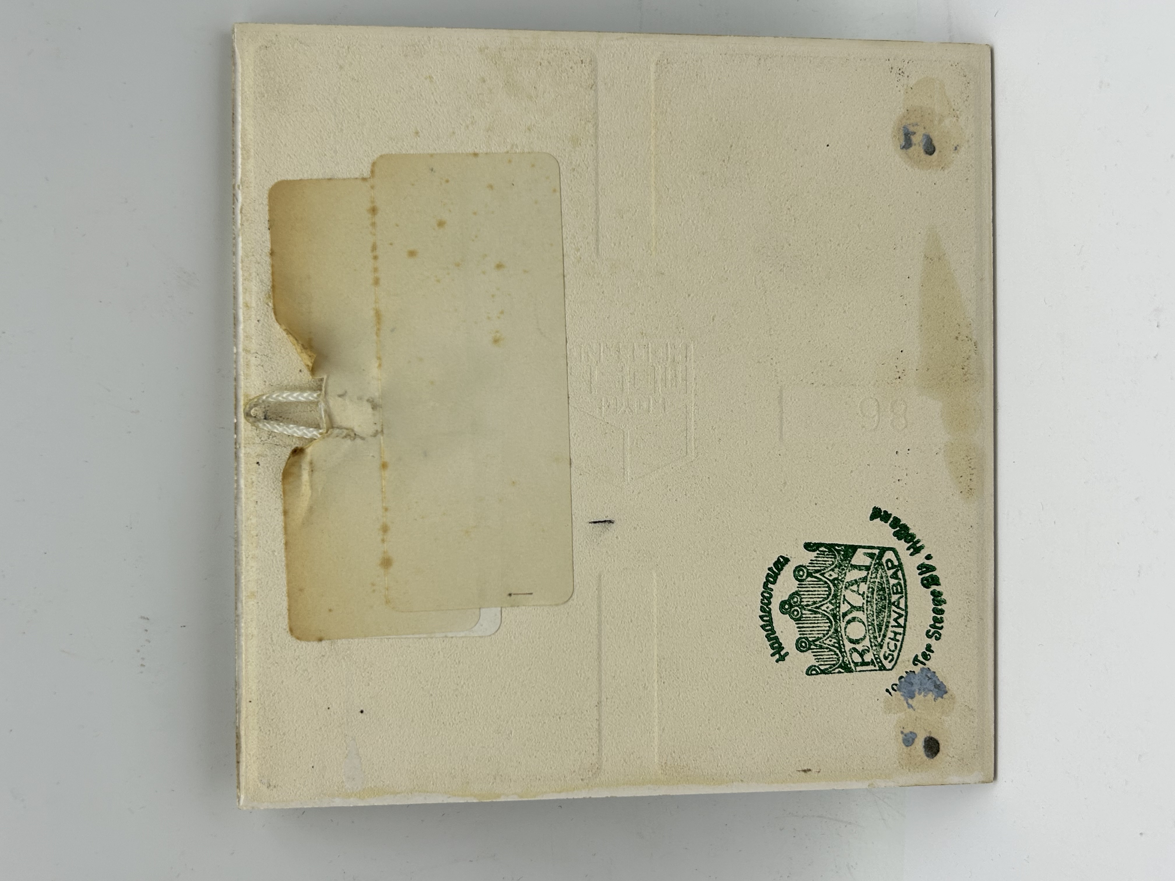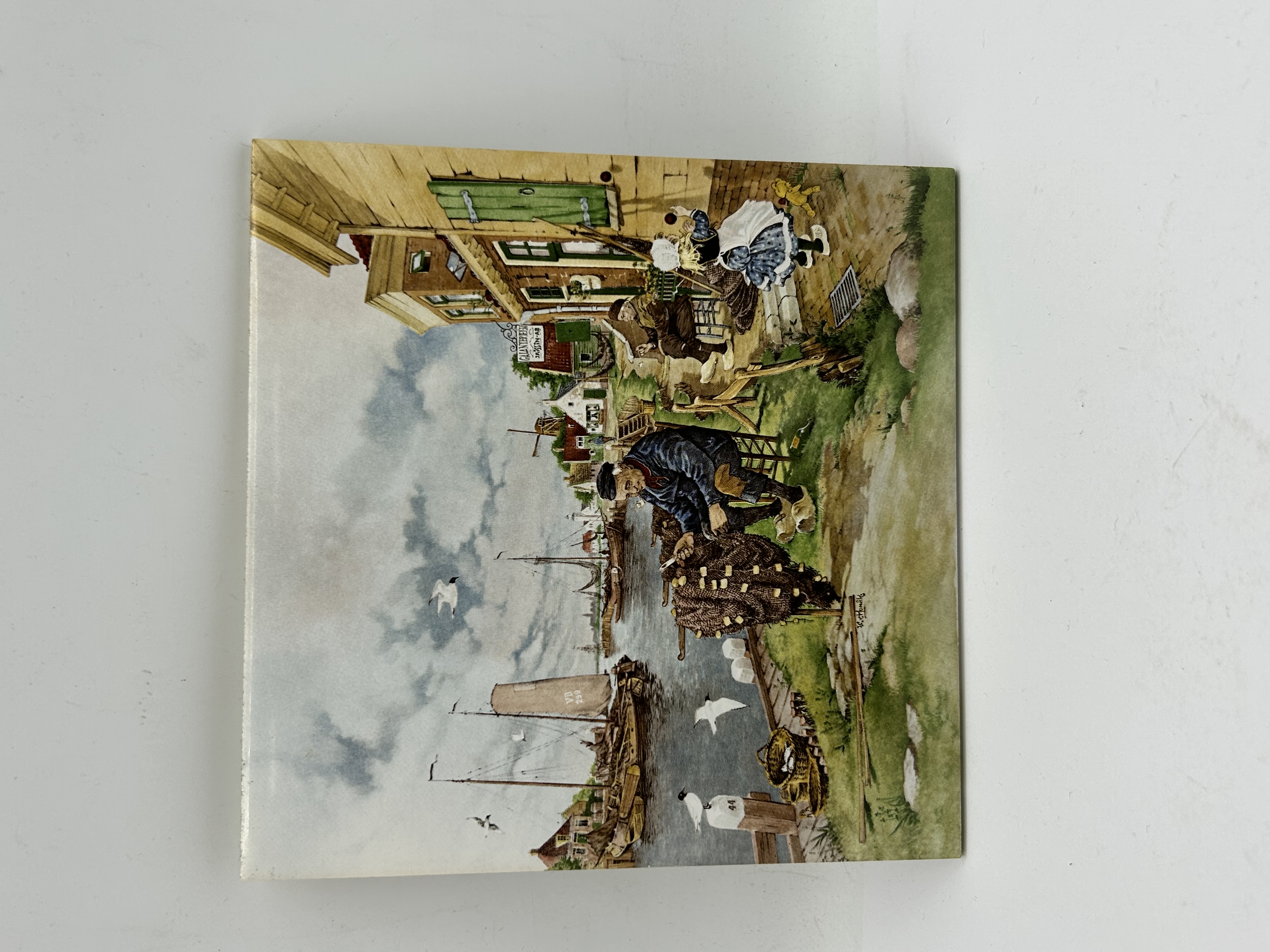 A square ceramic tile featuring a hand-decorated illustration of a traditional Dutch harbour scene. The composition depicts a fisherman in the foreground mending nets, set against a backdrop of sailboats, windmills, and figures in period attire. The reverse of the tile is marked with a green Royal Schwabap backstamp for Ter Steege BV, Holland, including the text Handdecorata. It also features an impressed house-logo mark containing the numeral 98. A corded hanging loop is fixed to the reverse.