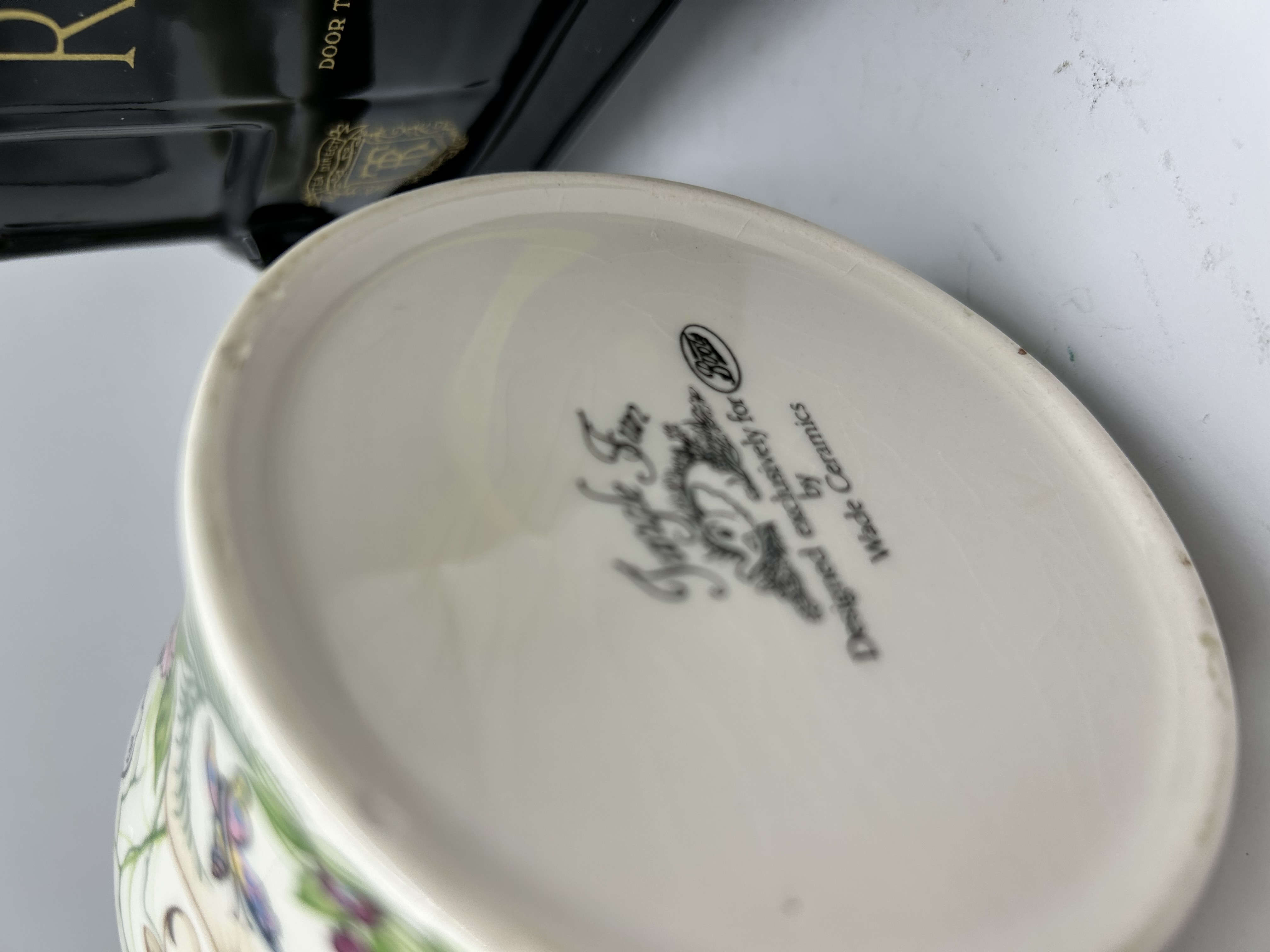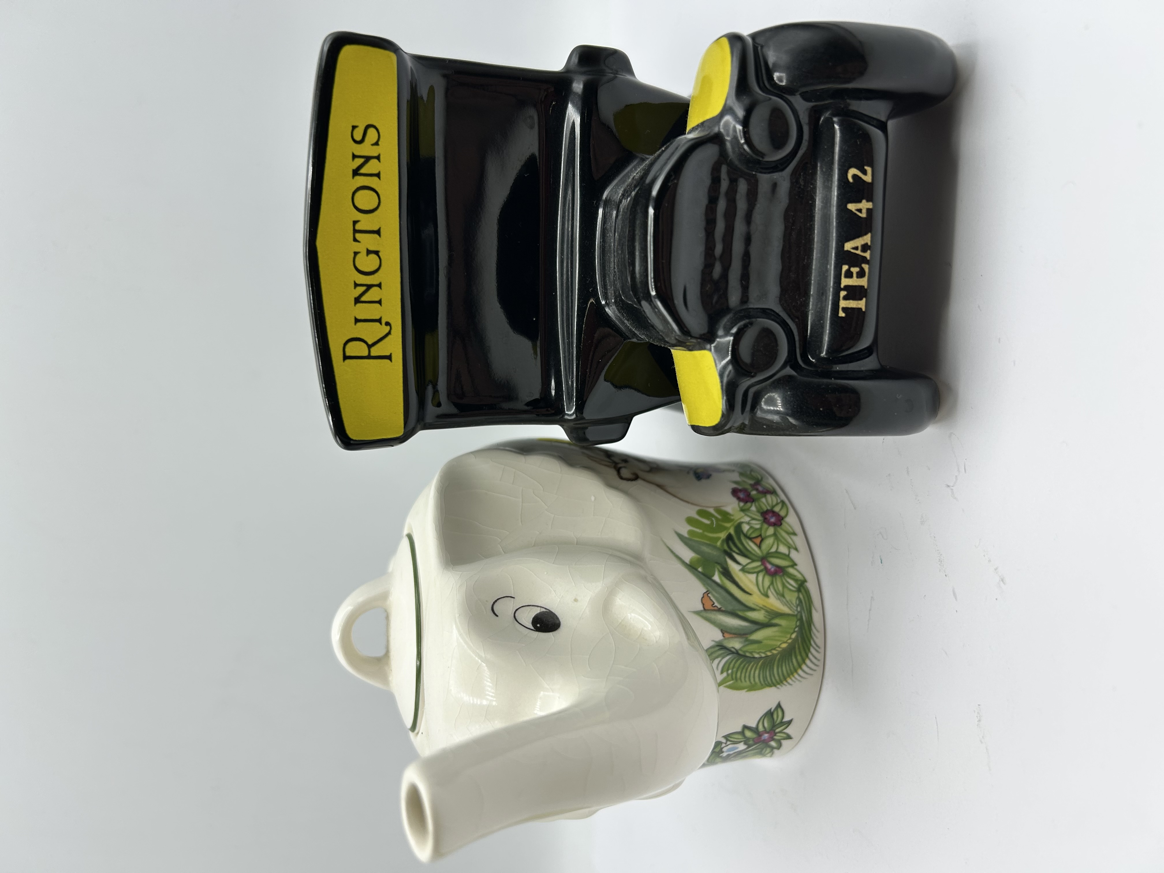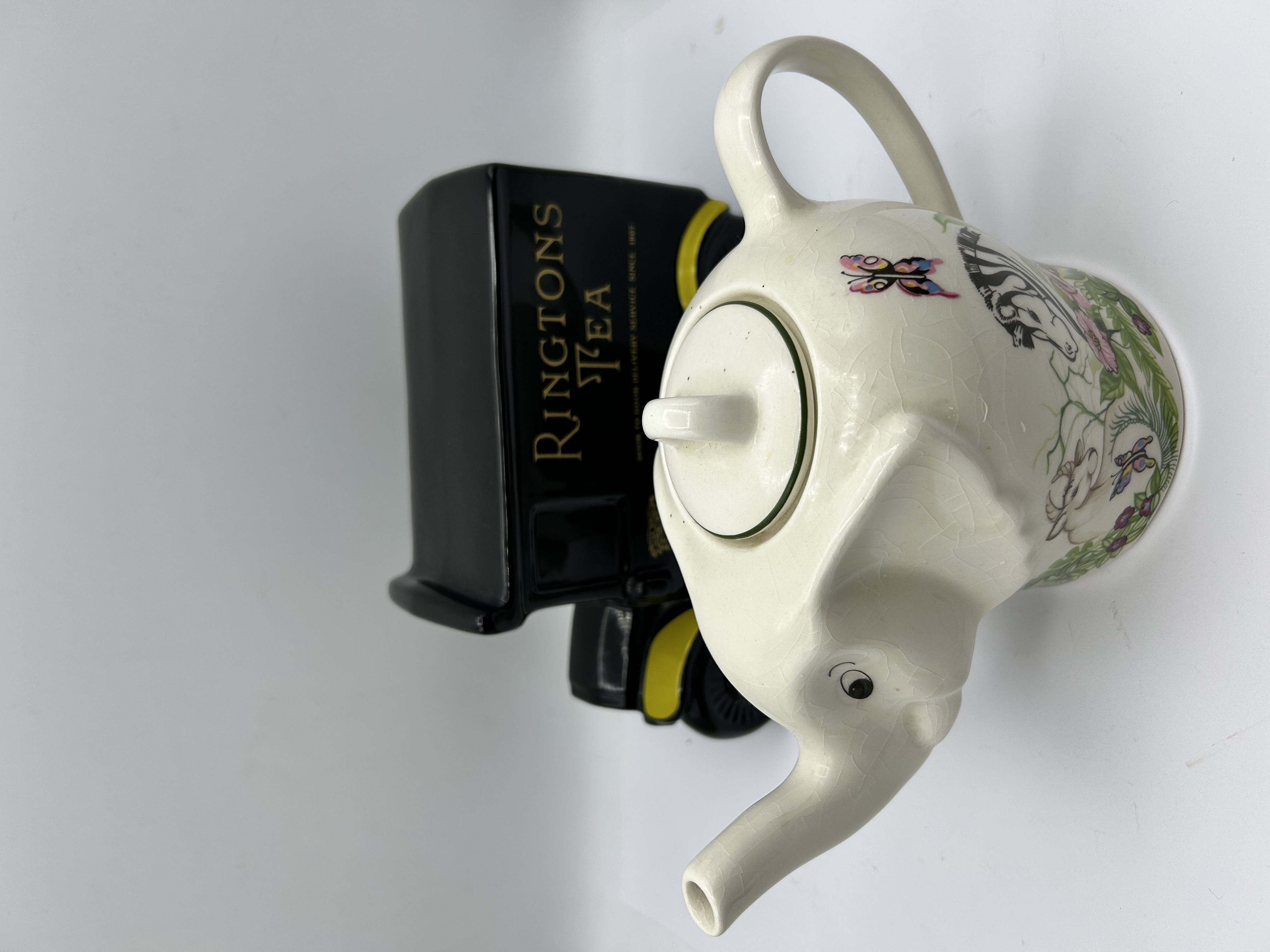 A pair of ceramic promotional items produced for the British tea merchant Ringtons. The first item is an elephant-shaped teapot from the Jungle Fun range, featuring a cream-glazed body decorated with transfer-printed motifs of jungle animals, butterflies, and floral elements. The trunk serves as the spout and the tail forms the handle. The underside bears the printed mark Designed exclusively for Ringtons by Wade Ceramics. The second item is a ceramic money box modelled as a vintage Ringtons delivery van in black and yellow livery. It features gilded lettering including Ringtons Tea, Tea Merchants, and Door to Door Delivery Service Since 1907, with a coin slot to the roof and a registration plate reading TEA 4 2.