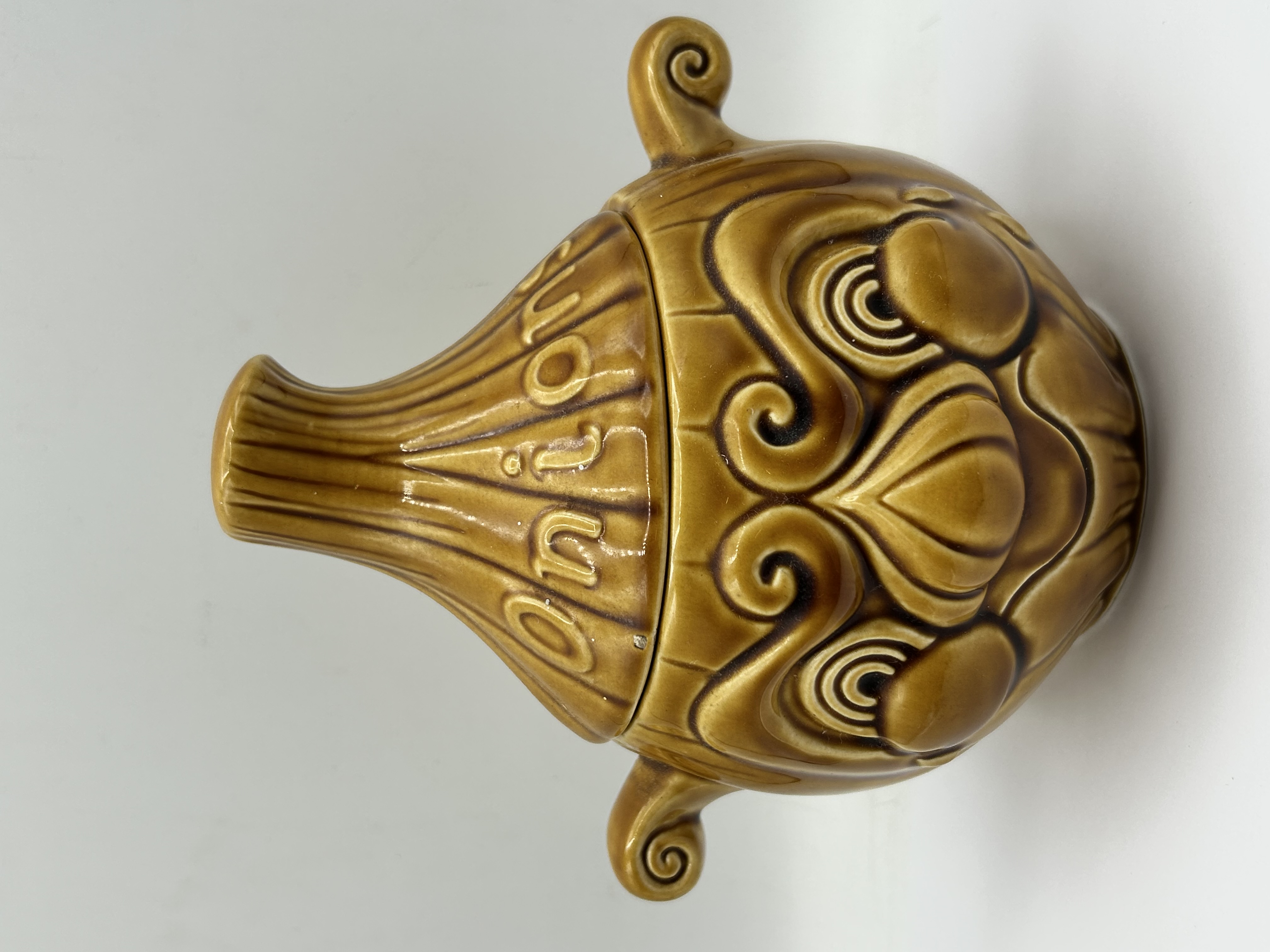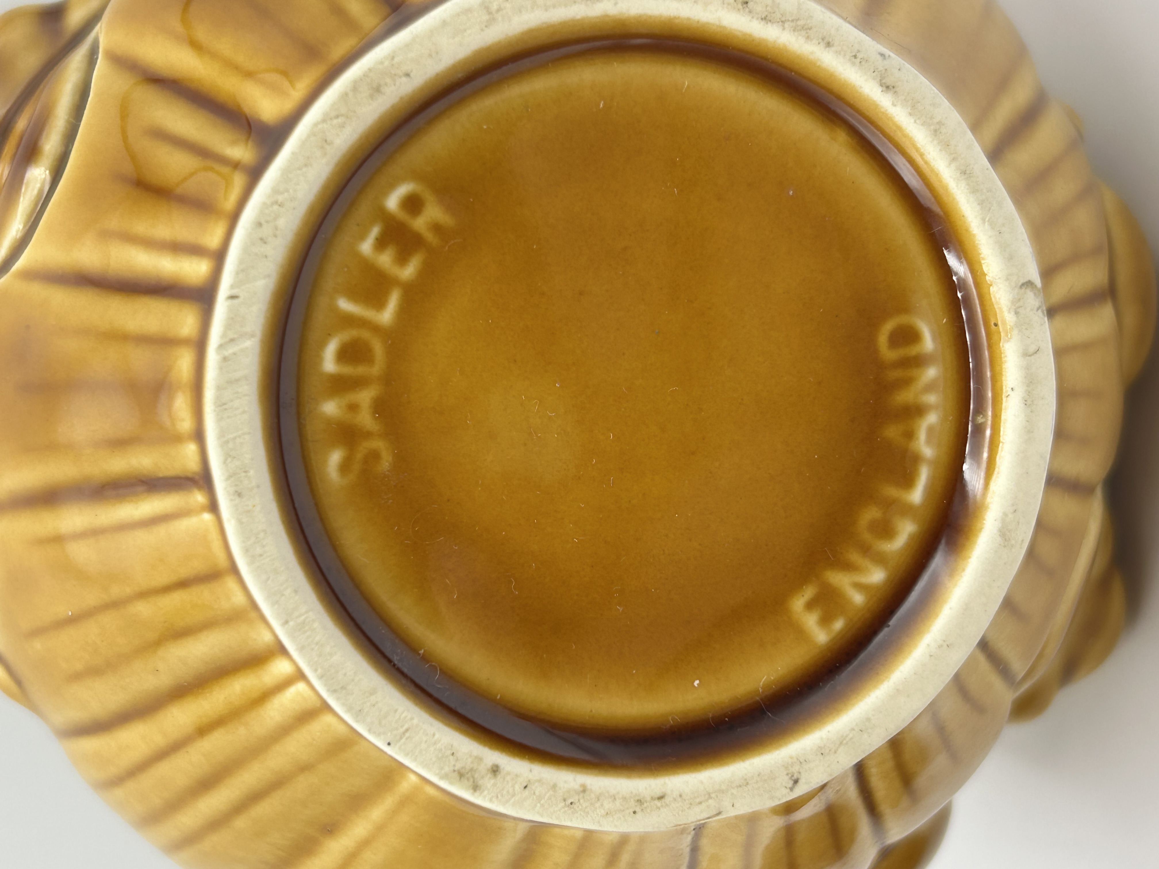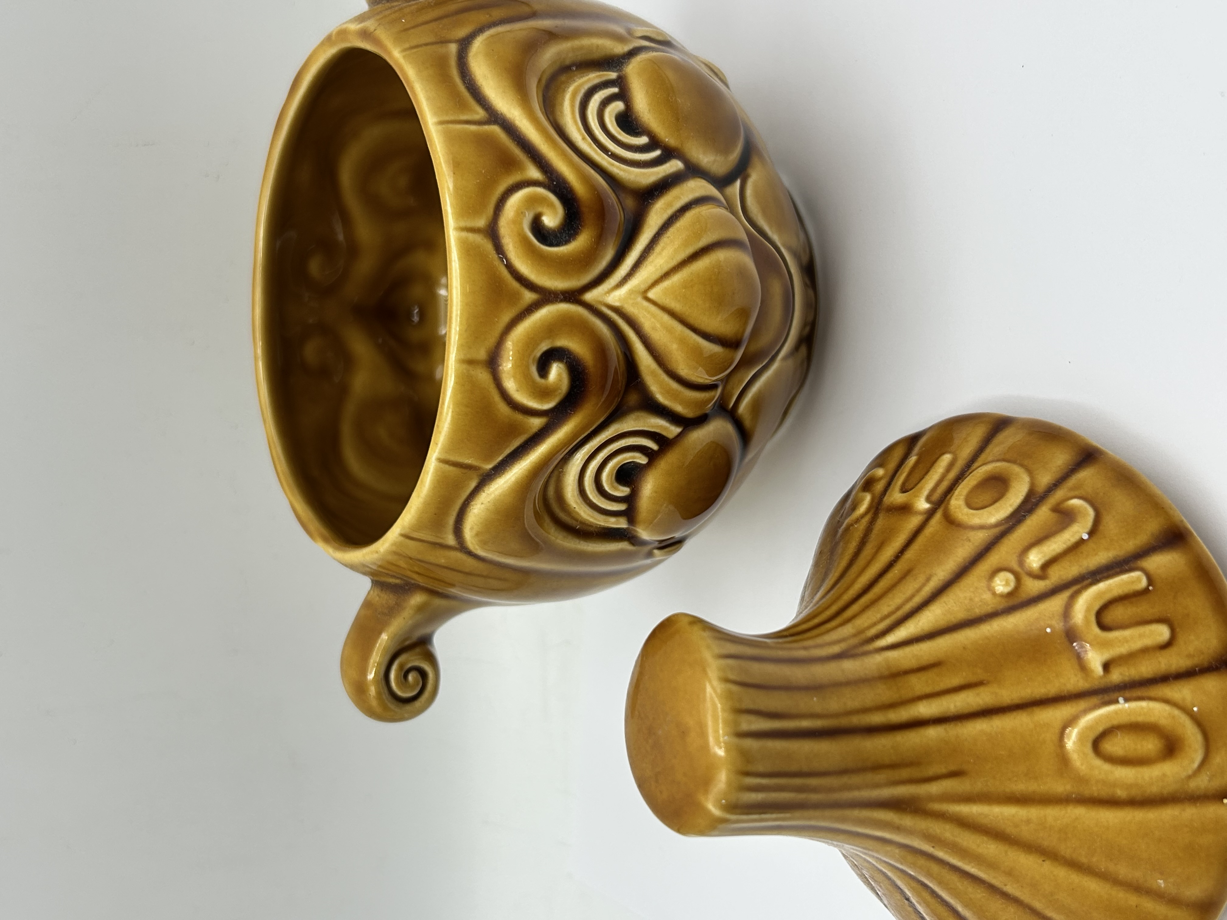 A Sadler ceramic onion storage jar of bulbous form with a matching lid. The body is decorated with raised scrollwork and stylised patterns that form a face, flanked by two small scrolled handles. The lid tapers to a flattened top and features the embossed word Onion. The piece is finished in a glossy honey-brown glaze with darker tonal accents highlighting the relief details. The base is impressed with the maker mark SADLER and ENGLAND.