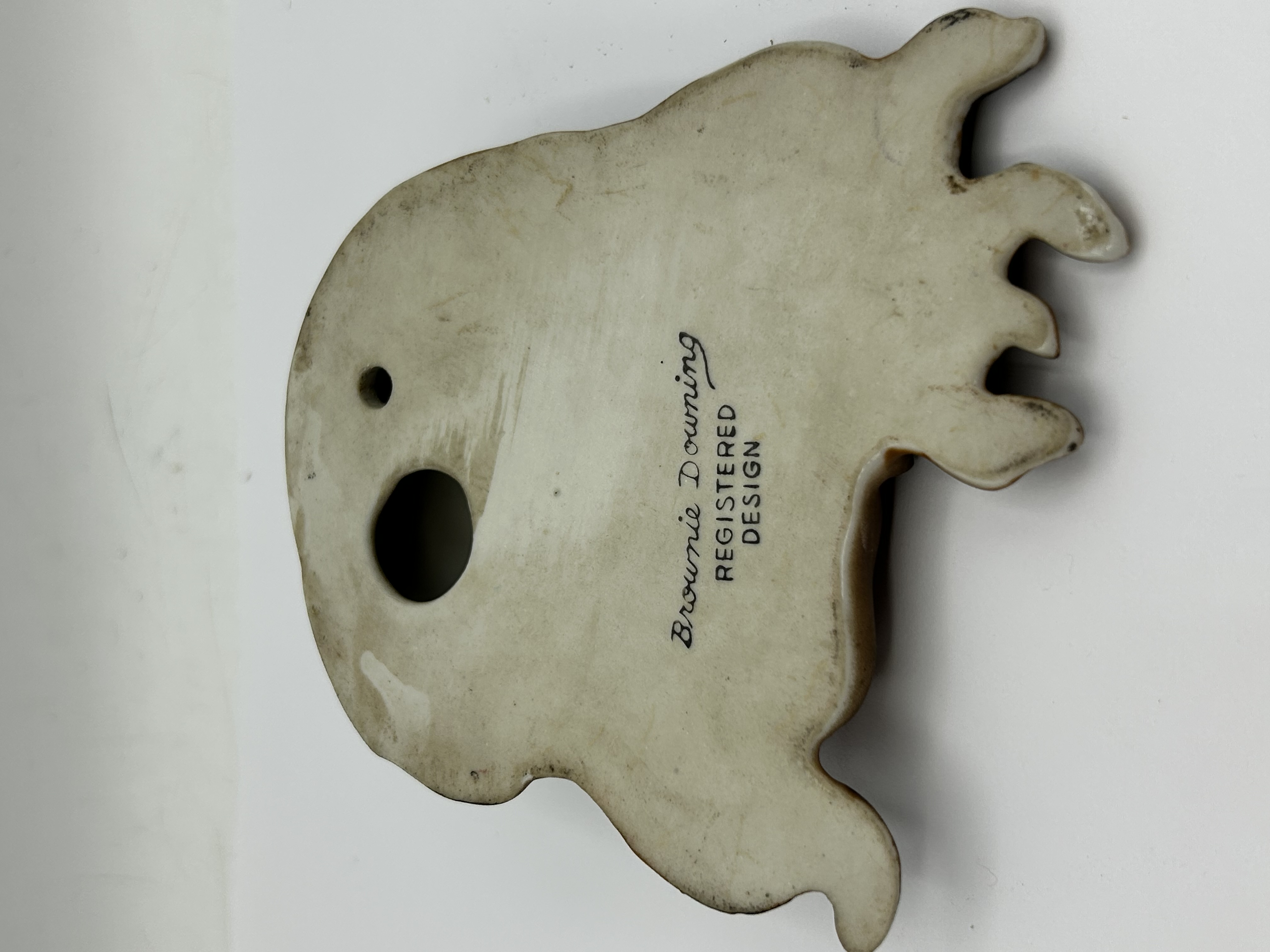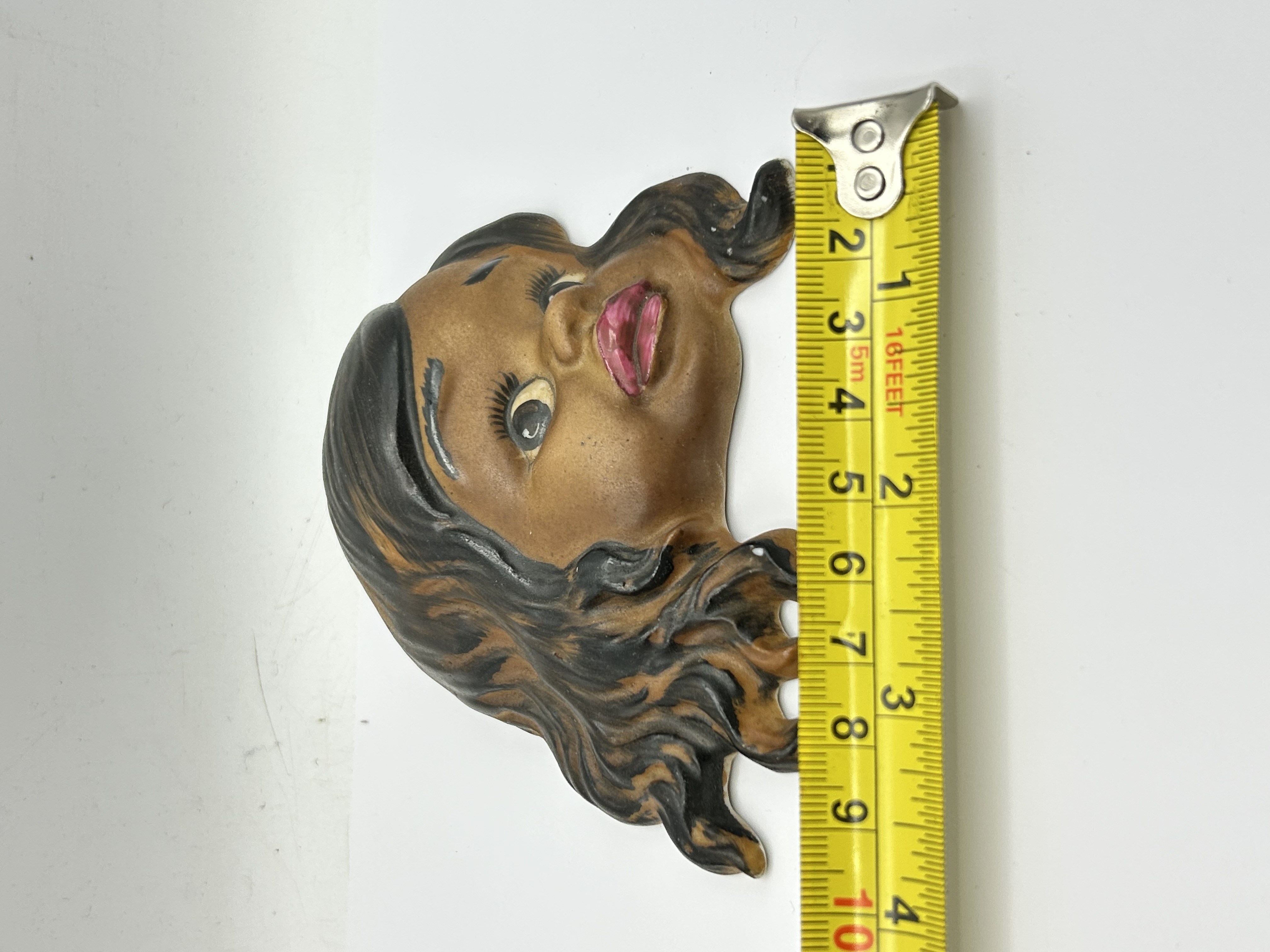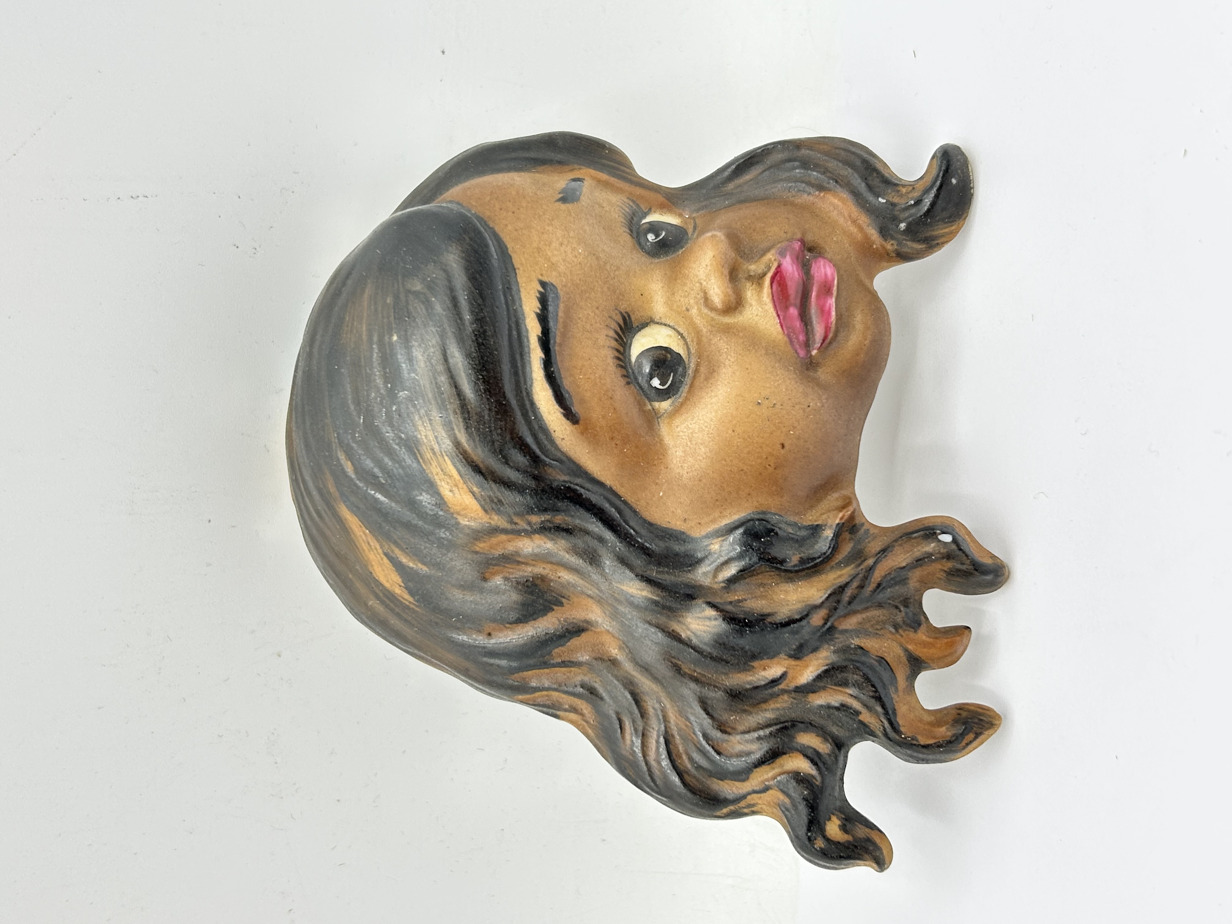 A mid-century ceramic wall plaque by Brownie Downing, depicting a stylized portrait of a young girl. The hand-painted piece features brown skin, dark wavy hair with golden highlights, and pink lips. The reverse bears the stamped maker’s mark Brownie Downing REGISTERED DESIGN and includes an integrated hole for hanging.
