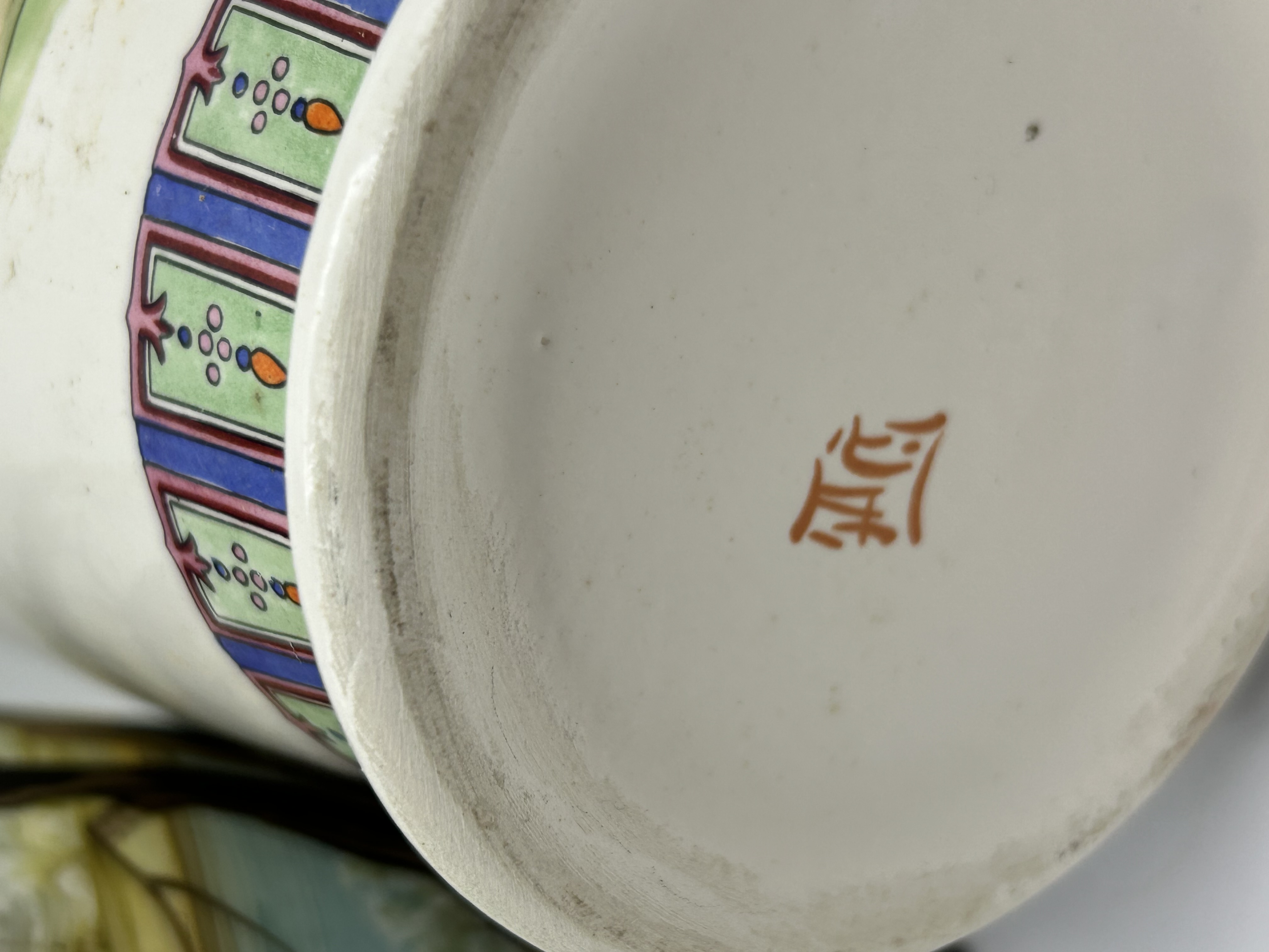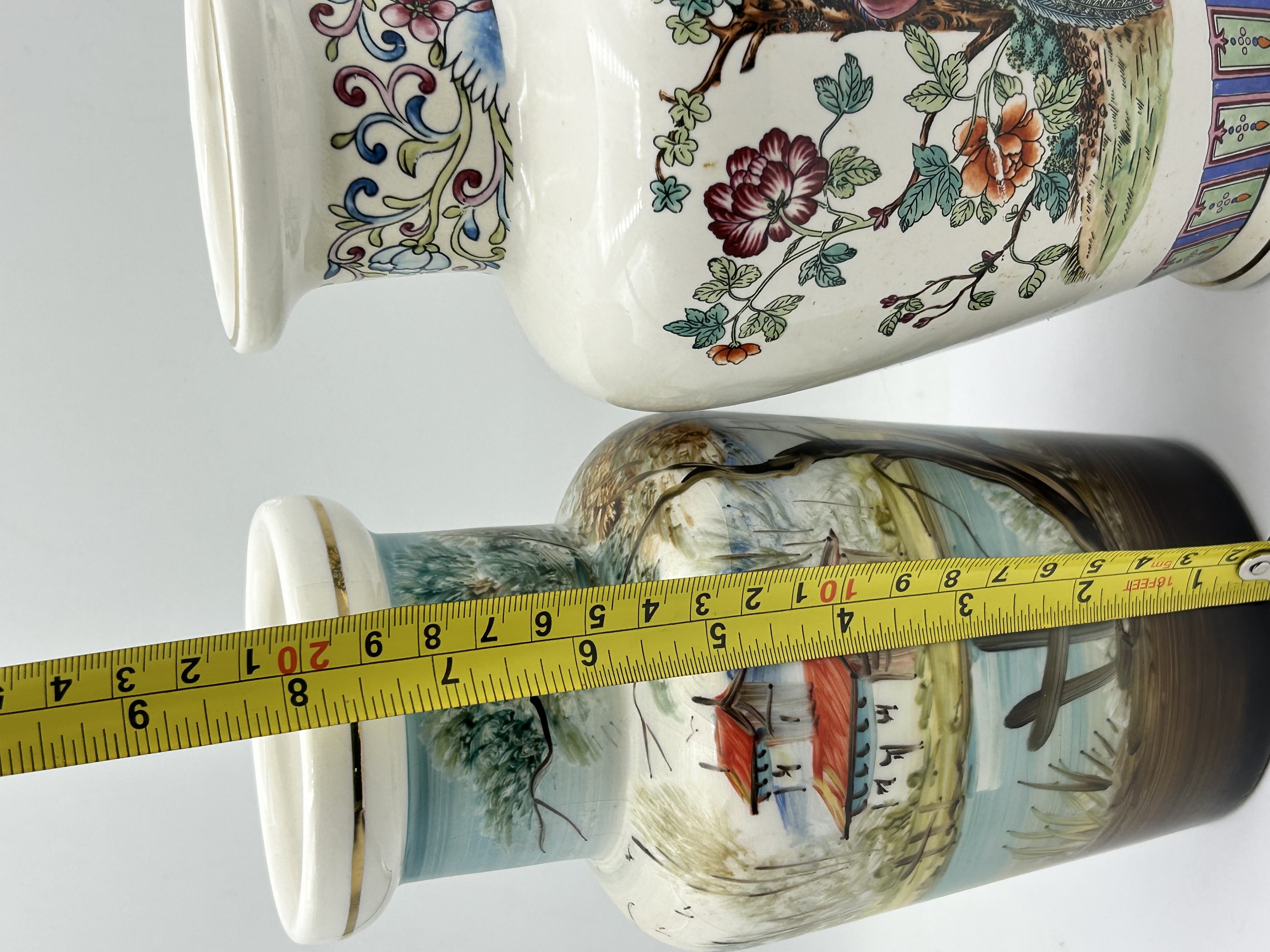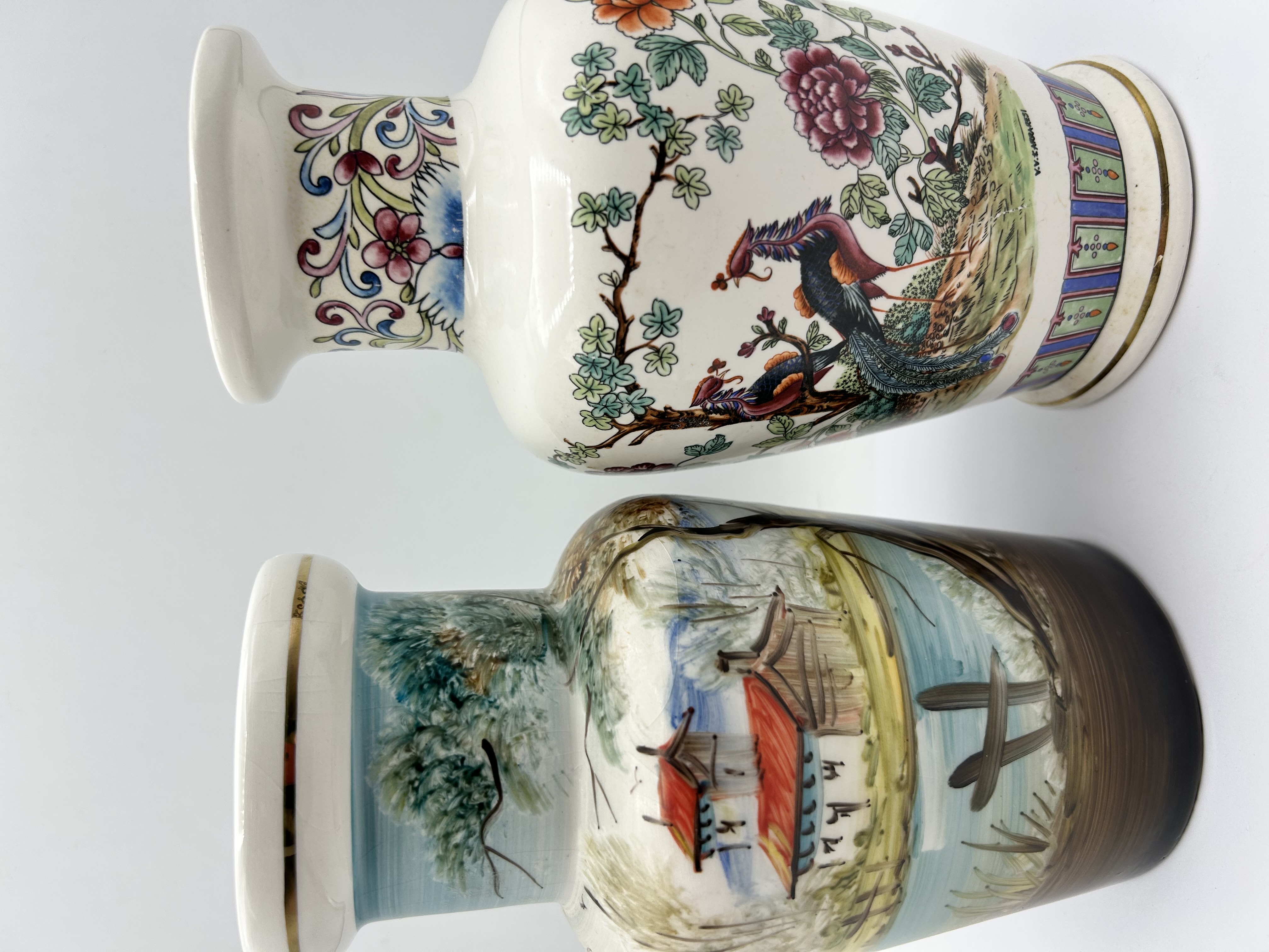 Two porcelain vases of baluster form. The first vase is decorated in an Oriental style with polychrome enamels depicting birds amongst peonies and flowering trees. The neck is embellished with floral scrolls, while the foot features a geometric patterned band. This piece is marked V.V. FERRARESI to the body and includes multiple columns of red characters in seal script, with a further single red character mark to the base. The second vase features a hand-painted continuous landscape scene showing a red-roofed building, water, and foliage, finished with a gilt rim.