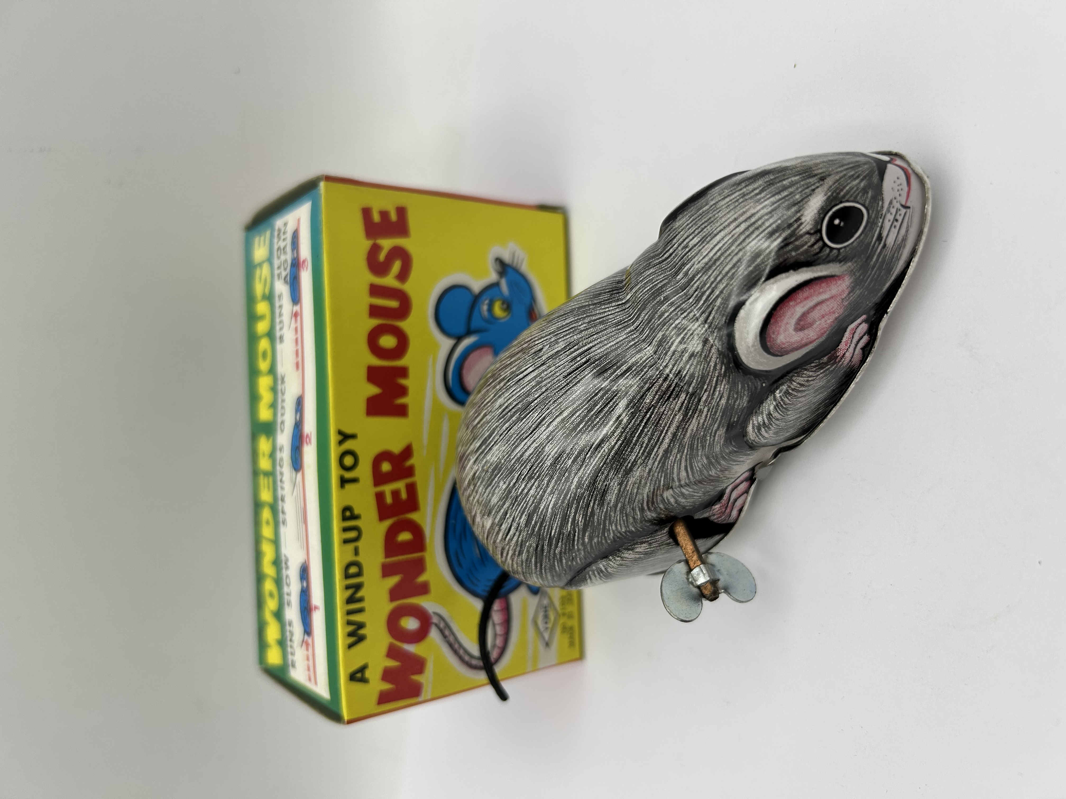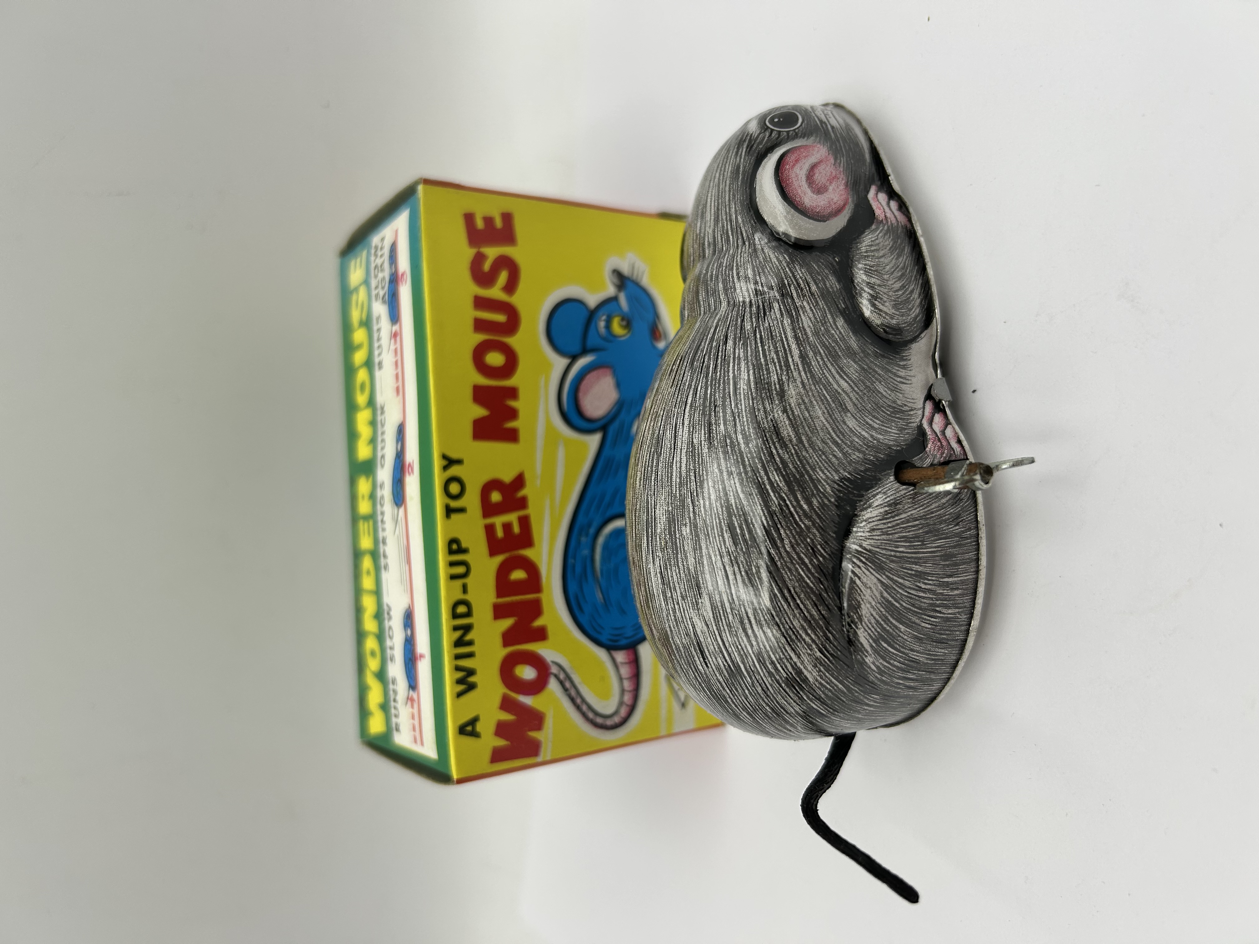 A vintage clockwork novelty toy, identified by the packaging as the Wonder Mouse. The toy is constructed from lithographed tinplate, featuring a grey and white fur-effect pattern with pink highlights to the ears and paws. It is fitted with a side-mounted metal winding key and a flexible black tail. The mechanism is designed to produce a variable speed movement, described on the box as Runs Slow – Springs Quick – Runs Slow Again. The item is accompanied by its original illustrated cardboard box, which features a yellow ground with red and blue graphics. A small diamond-shaped trademark is visible on the lower right of the box illustration. Based on market consensus for this specific novelty item, the toy is attributed to Japanese manufacture, specifically Yoneya.