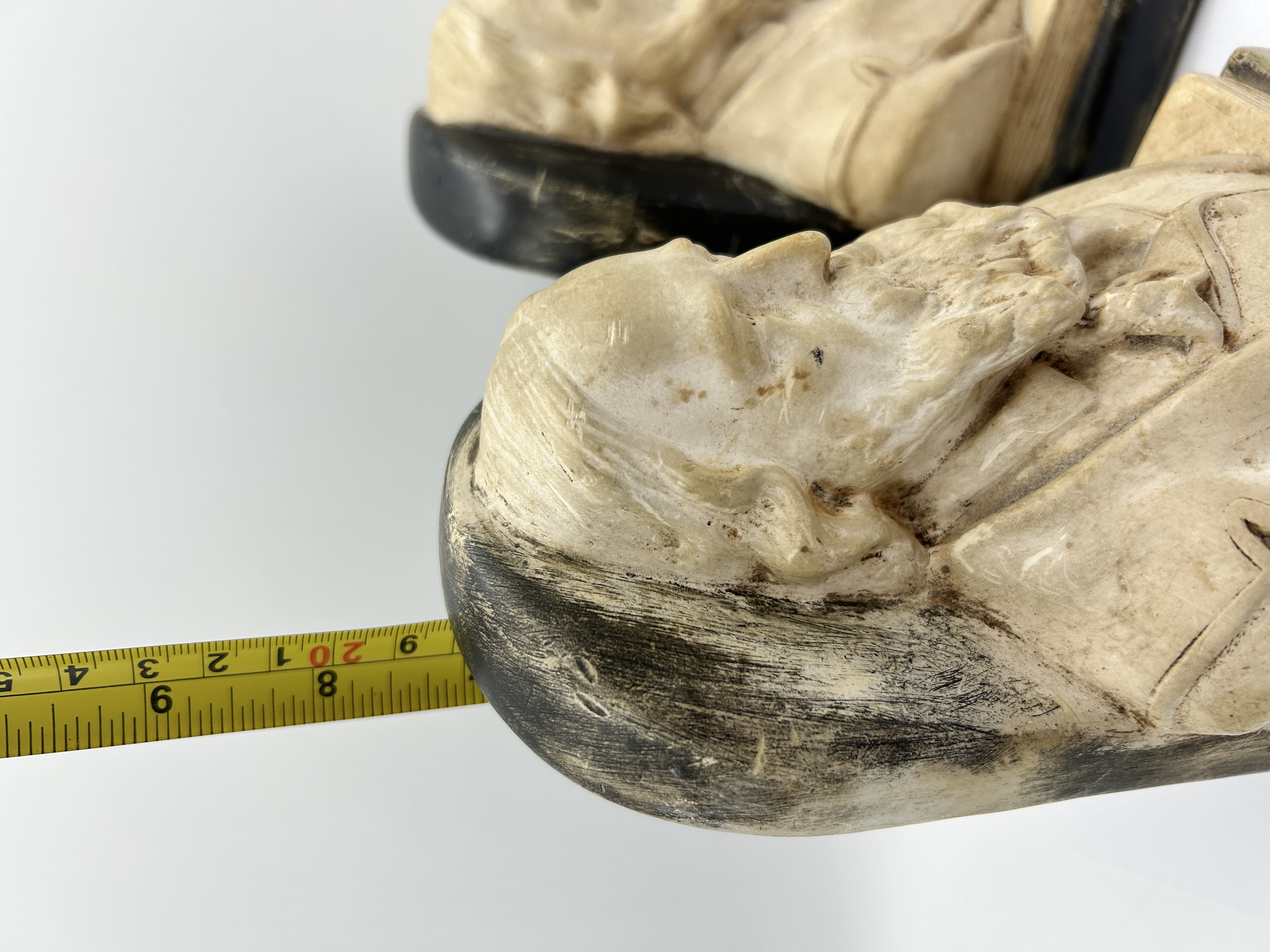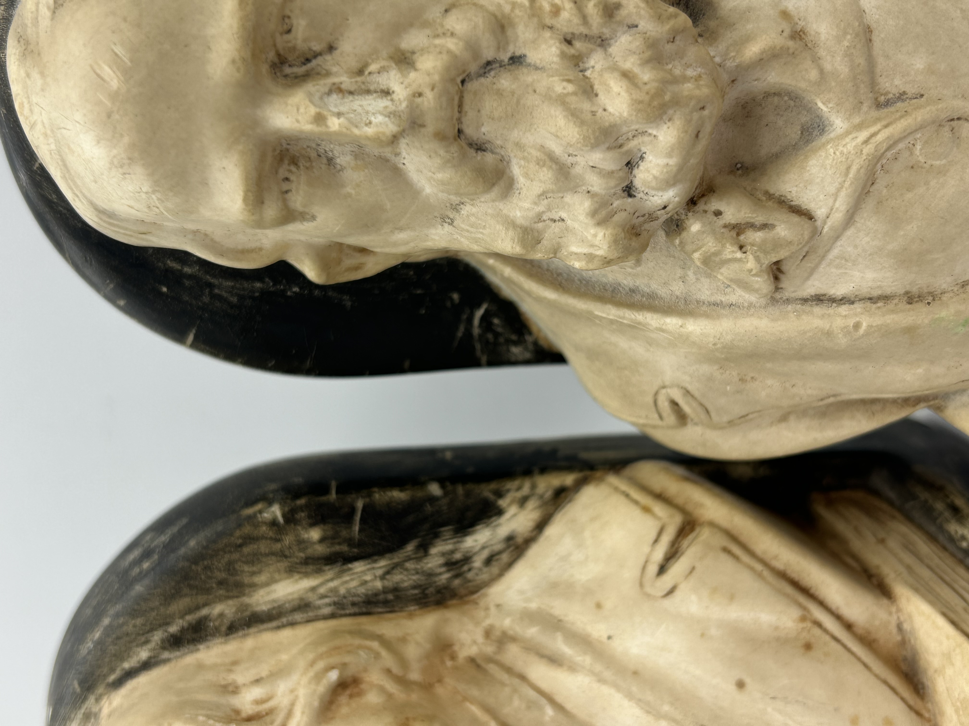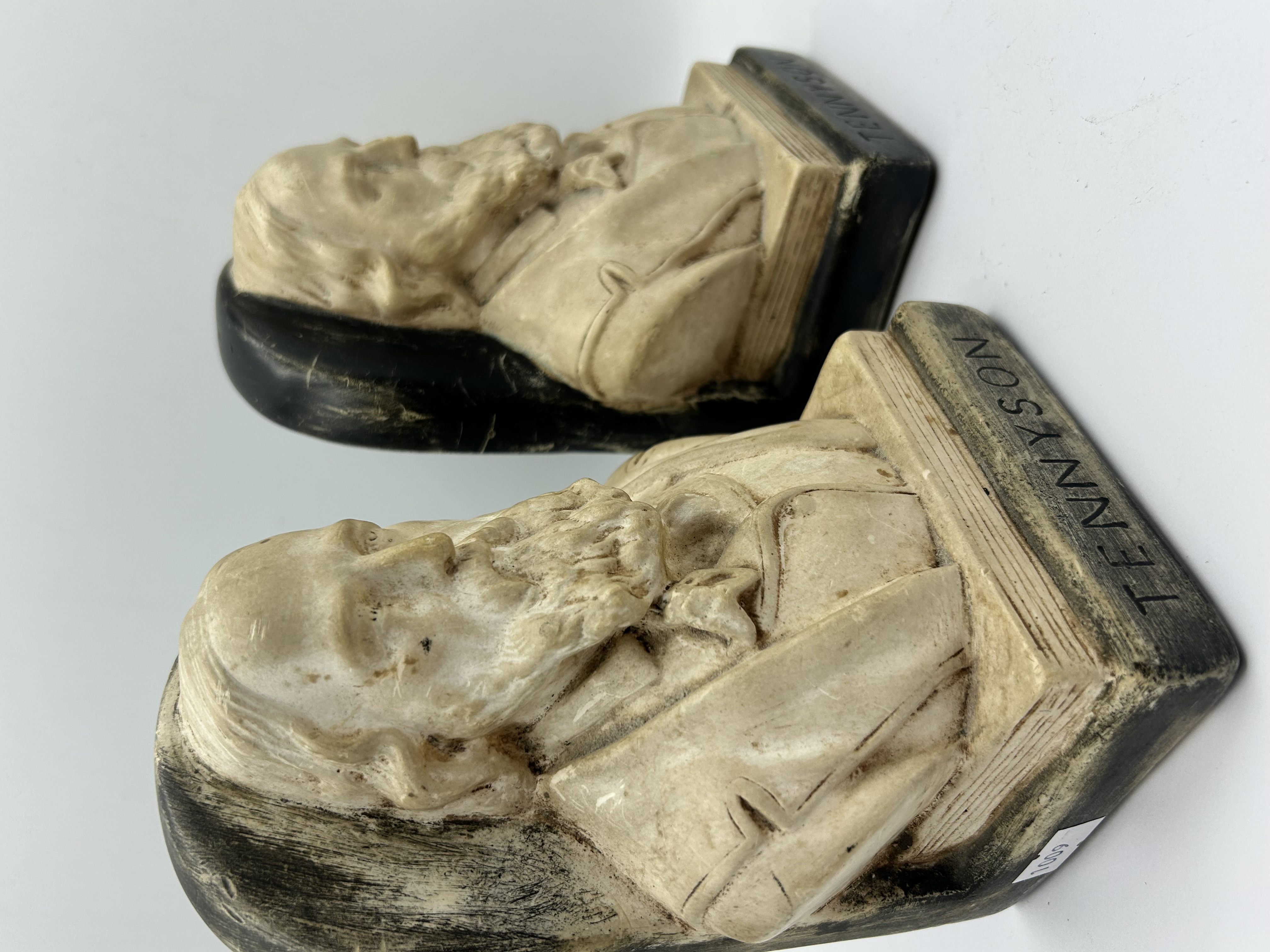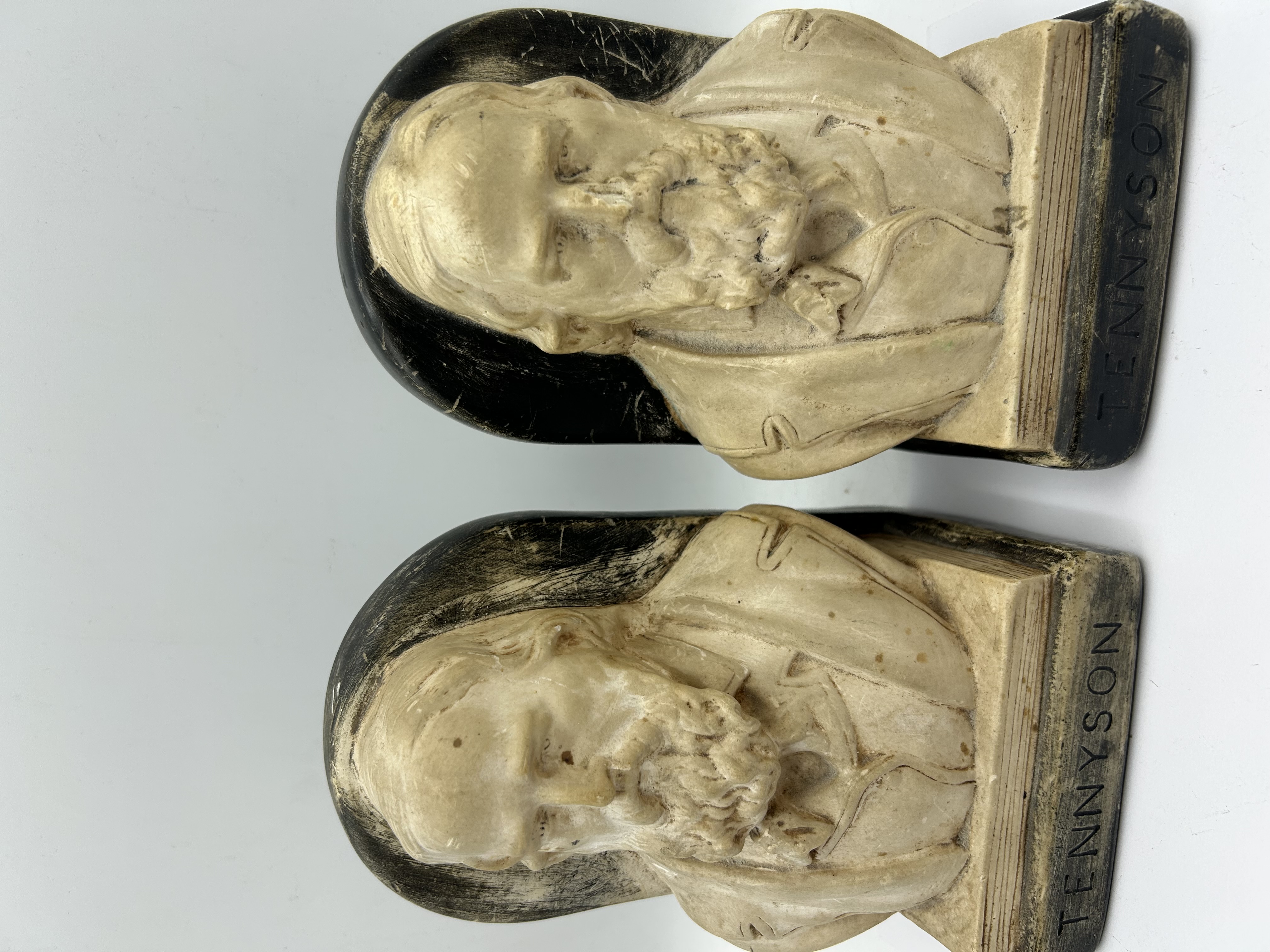 A pair of cast composite each featuring a bust of the poet Alfred, Lord Tennyson. The figures are finished in an antiqued cream colour to simulate carved stone or ivory, set against dark, rounded backings and rectangular bases. Each base is incised with the name TENNYSON. The items are constructed from a cast material resembling chalkware.