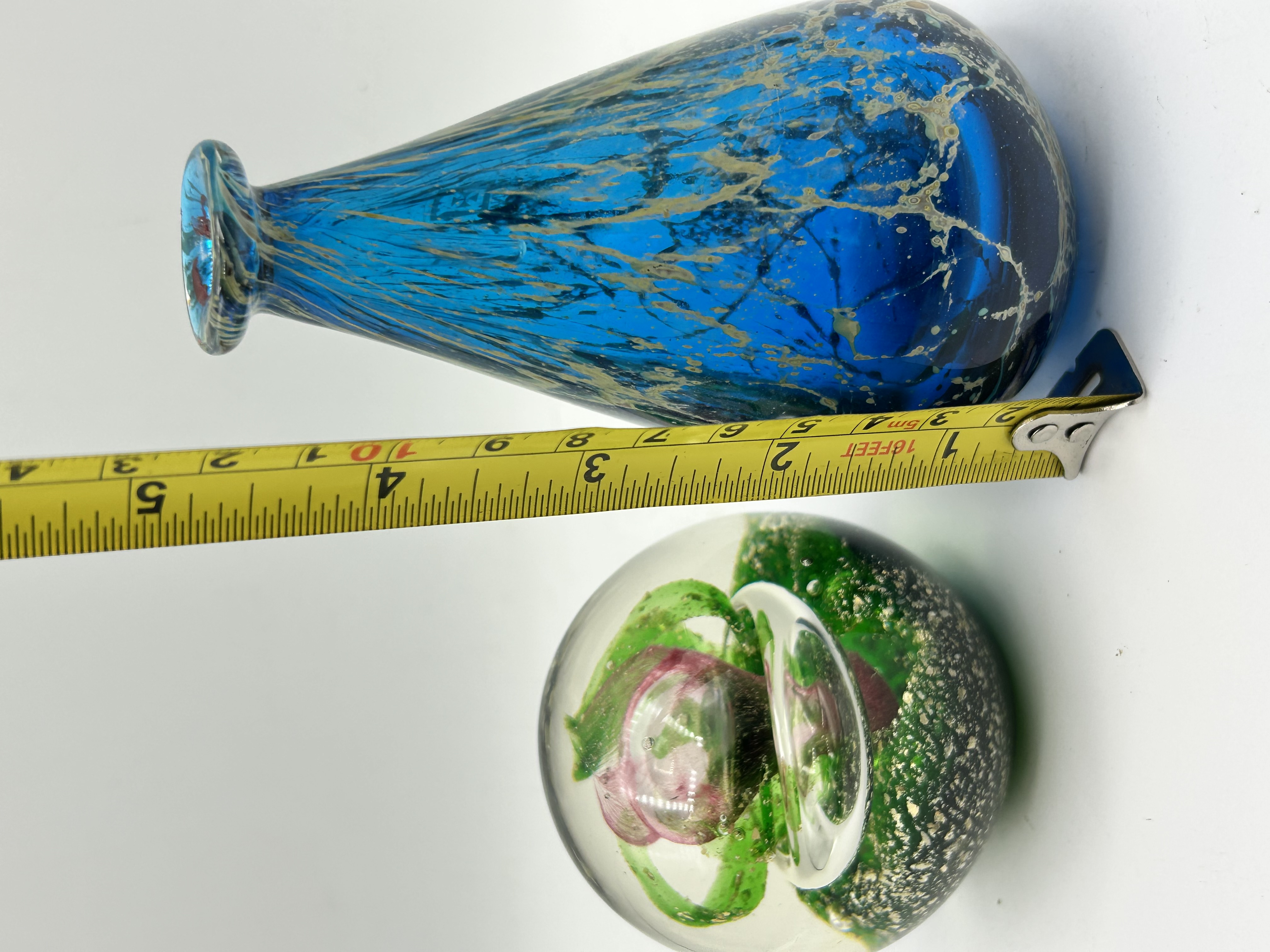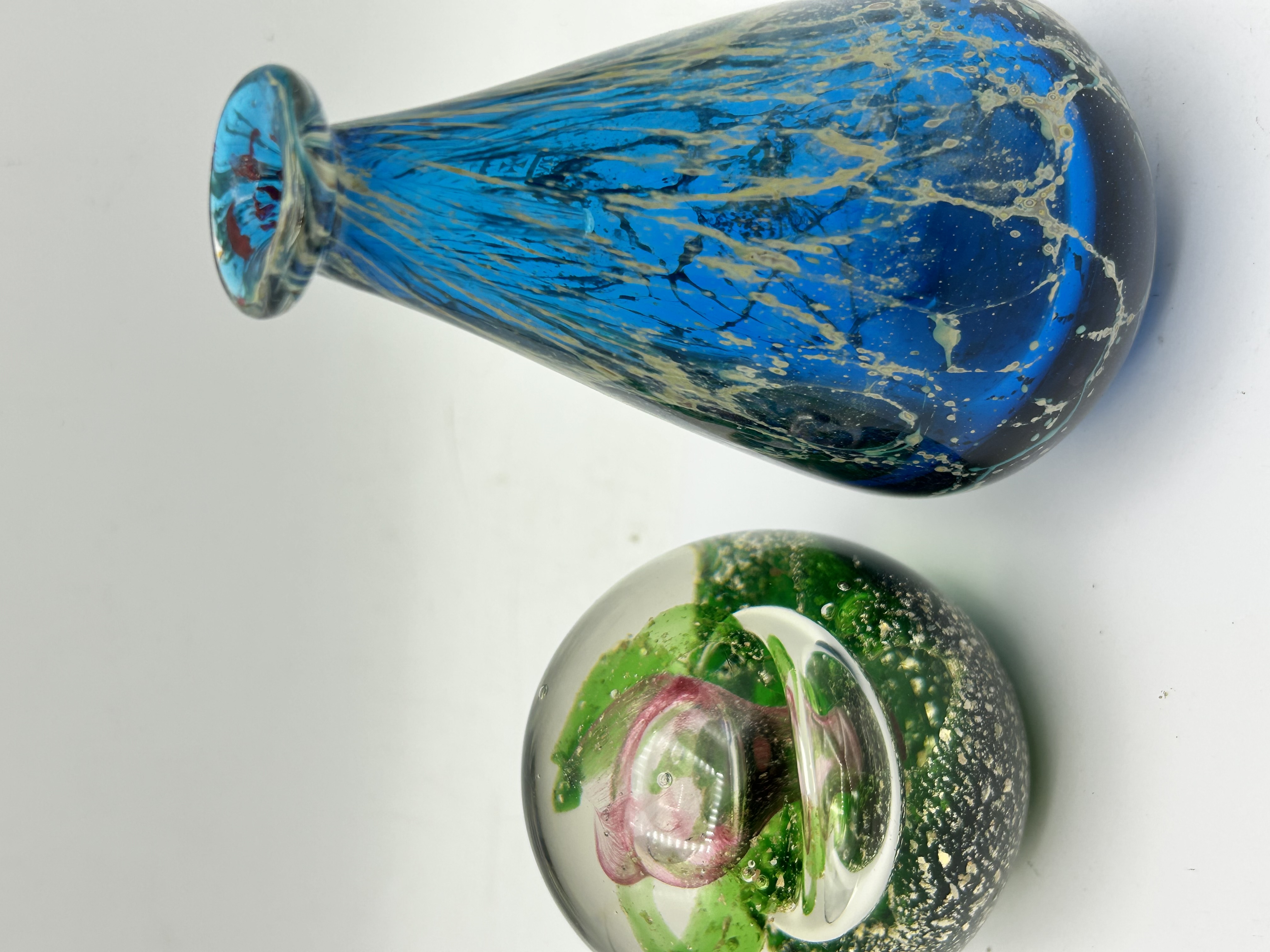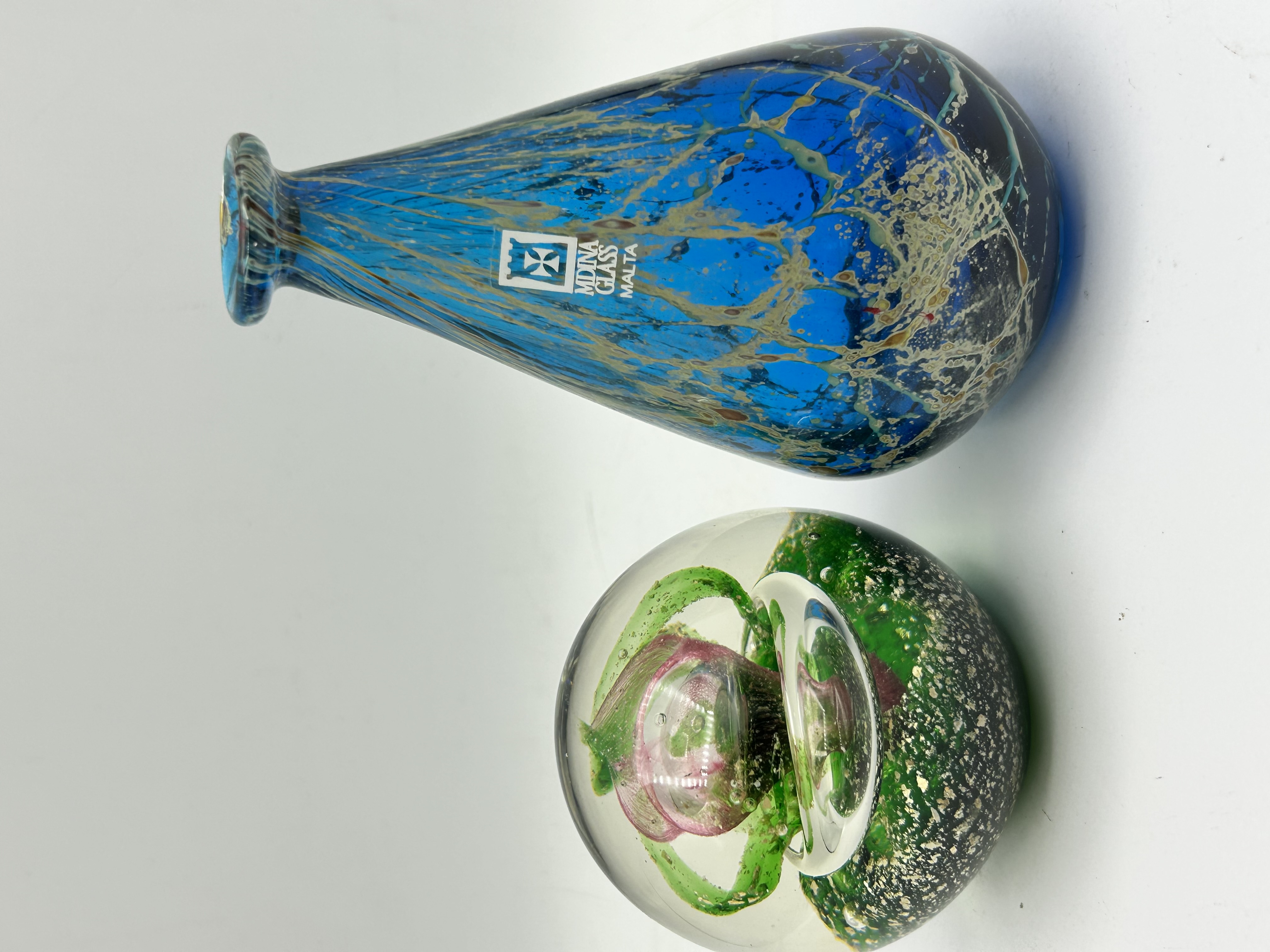 A collection of two pieces of Maltese art glass. The first item is a hand-blown vase of teardrop form with a short flared rim, constructed from cobalt blue glass with surface-applied trailing in earth and golden tones. This piece bears an original rectangular silver-toned foil label for Mdina Glass, Malta, featuring the company logo. The second item is a spherical glass paperweight featuring internal decoration. The design consists of a central pink and white swirl encased in green glass trails, positioned above a base layer of metallic gold-toned aventurine flecks. This item is unmarked and is in the style of glass produced in the Mediterranean region.