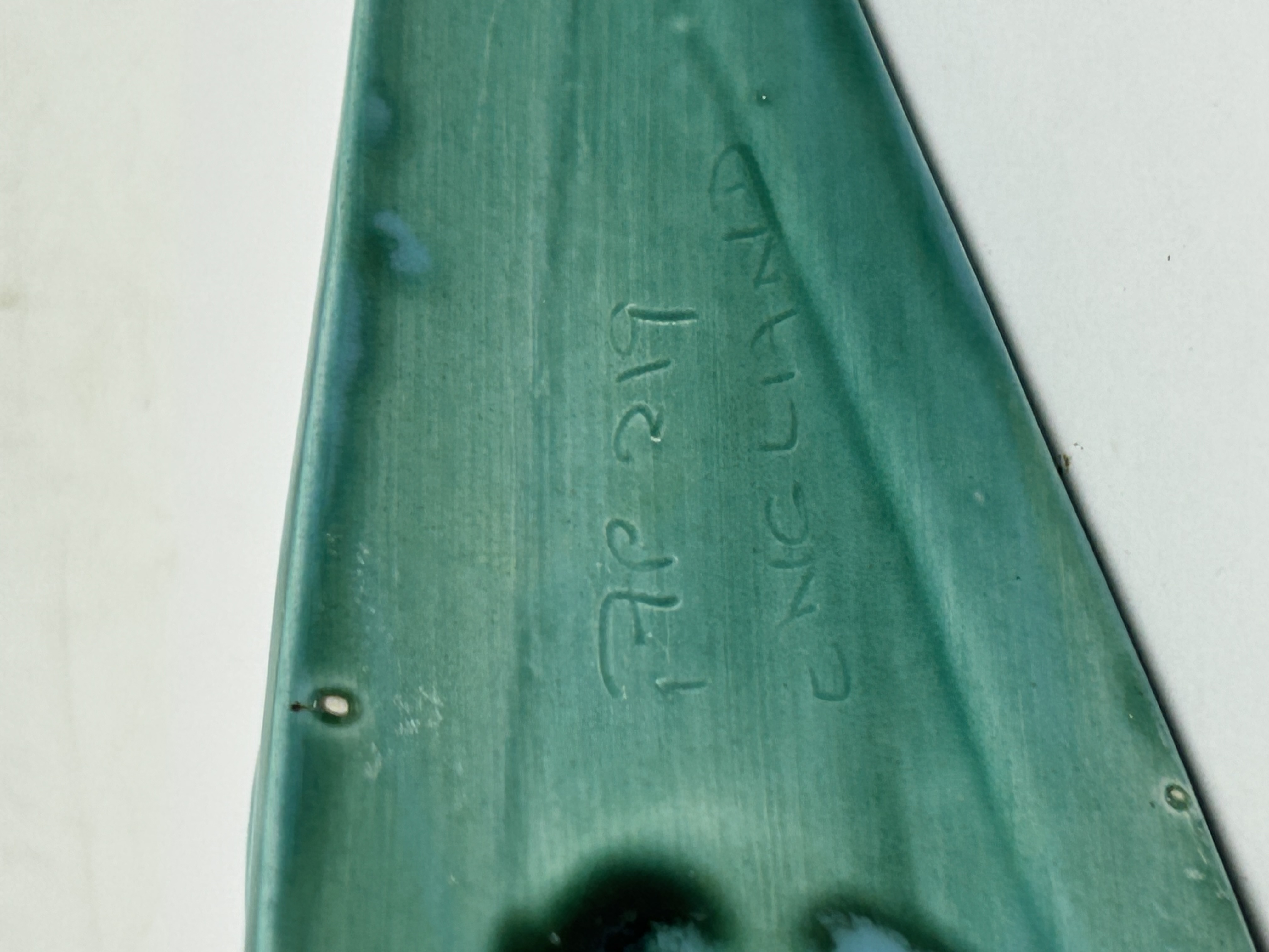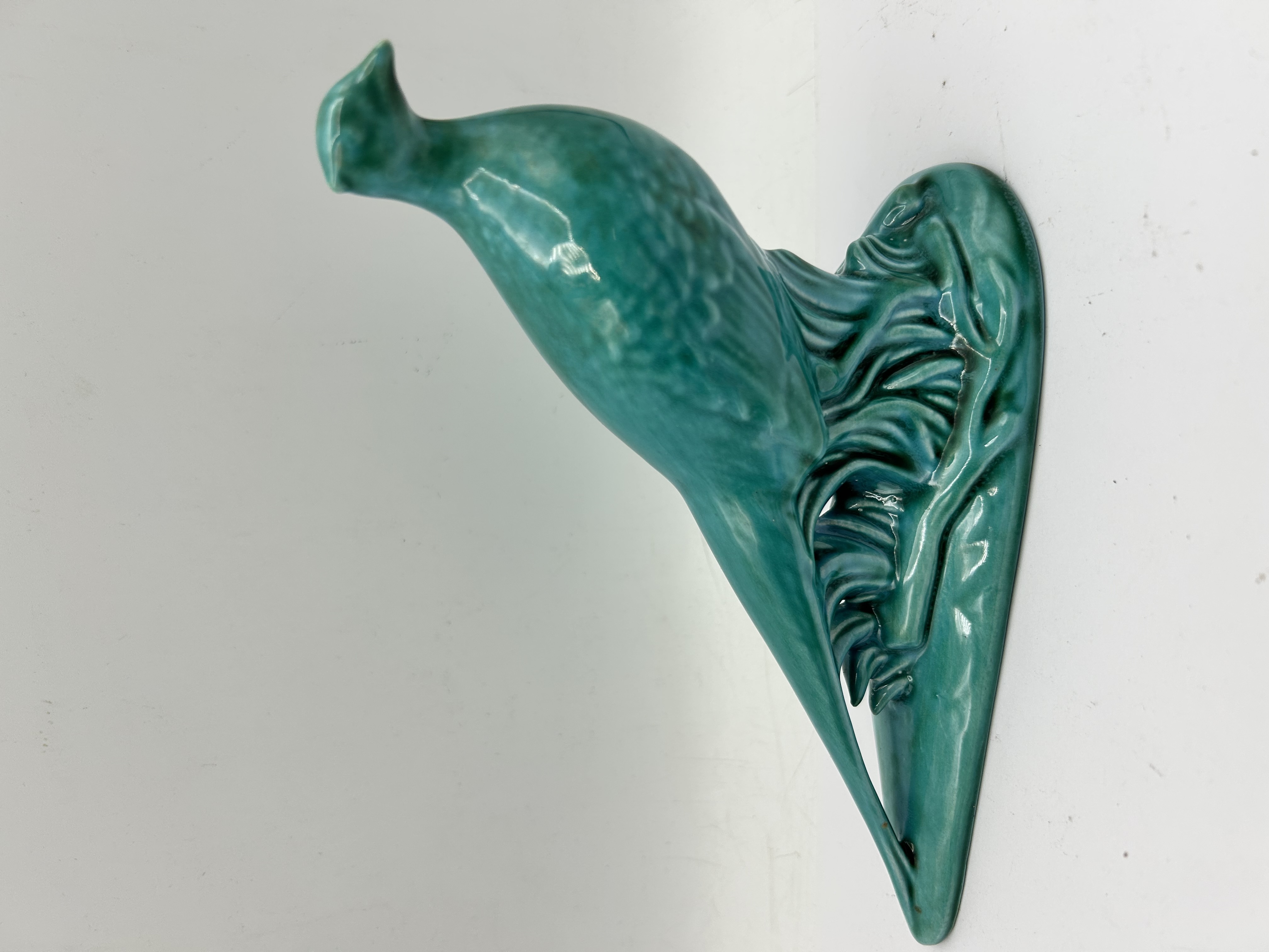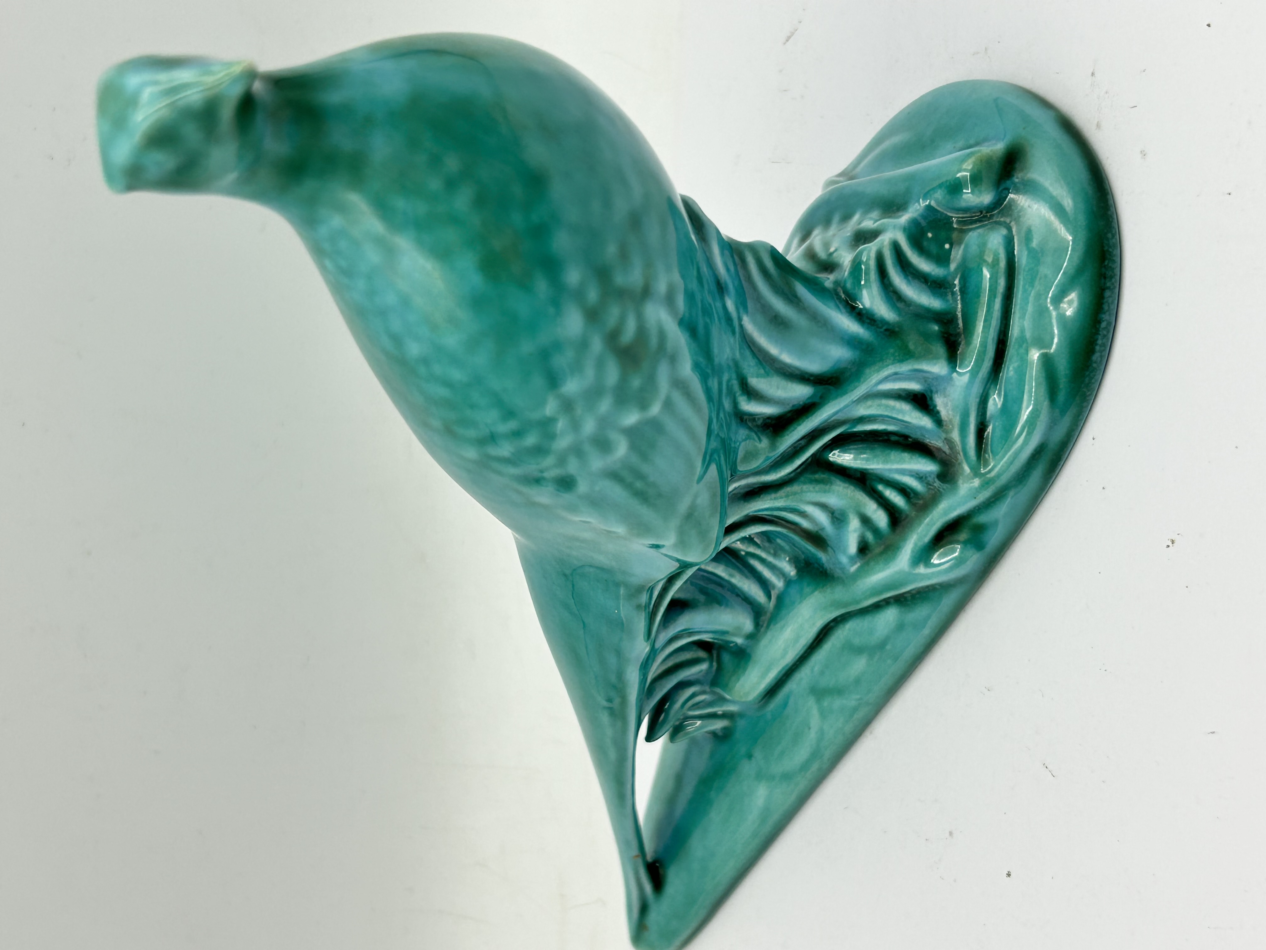 A British Art Deco style ceramic wall plaque attributed to (Shaw & Copestake). The item depicts a stylized bird against a decorative flourish. The piece is finished in a monochrome turquoise-green glaze with a fine crackle effect. The reverse features incised marks reading PP 219 and ENGLAND.