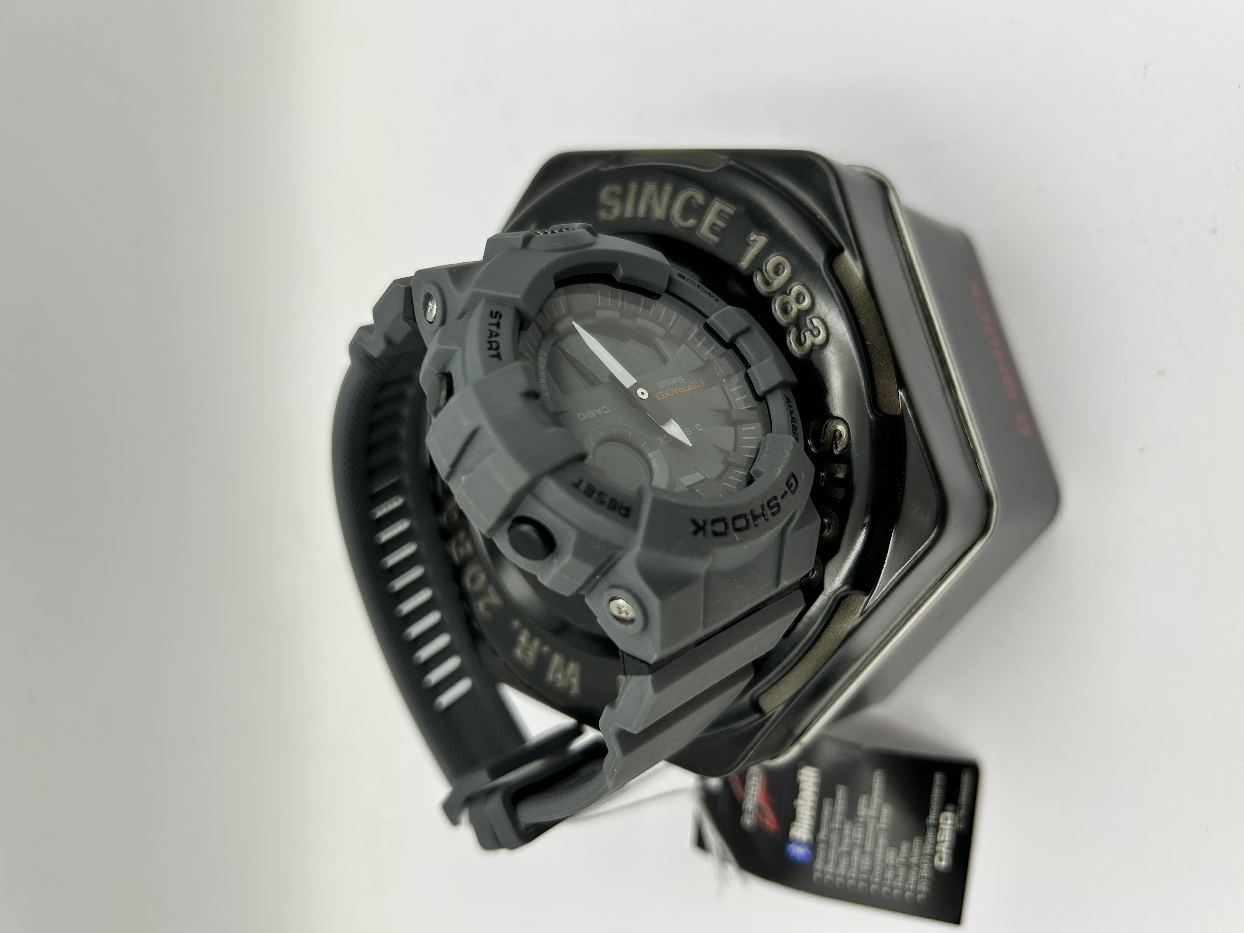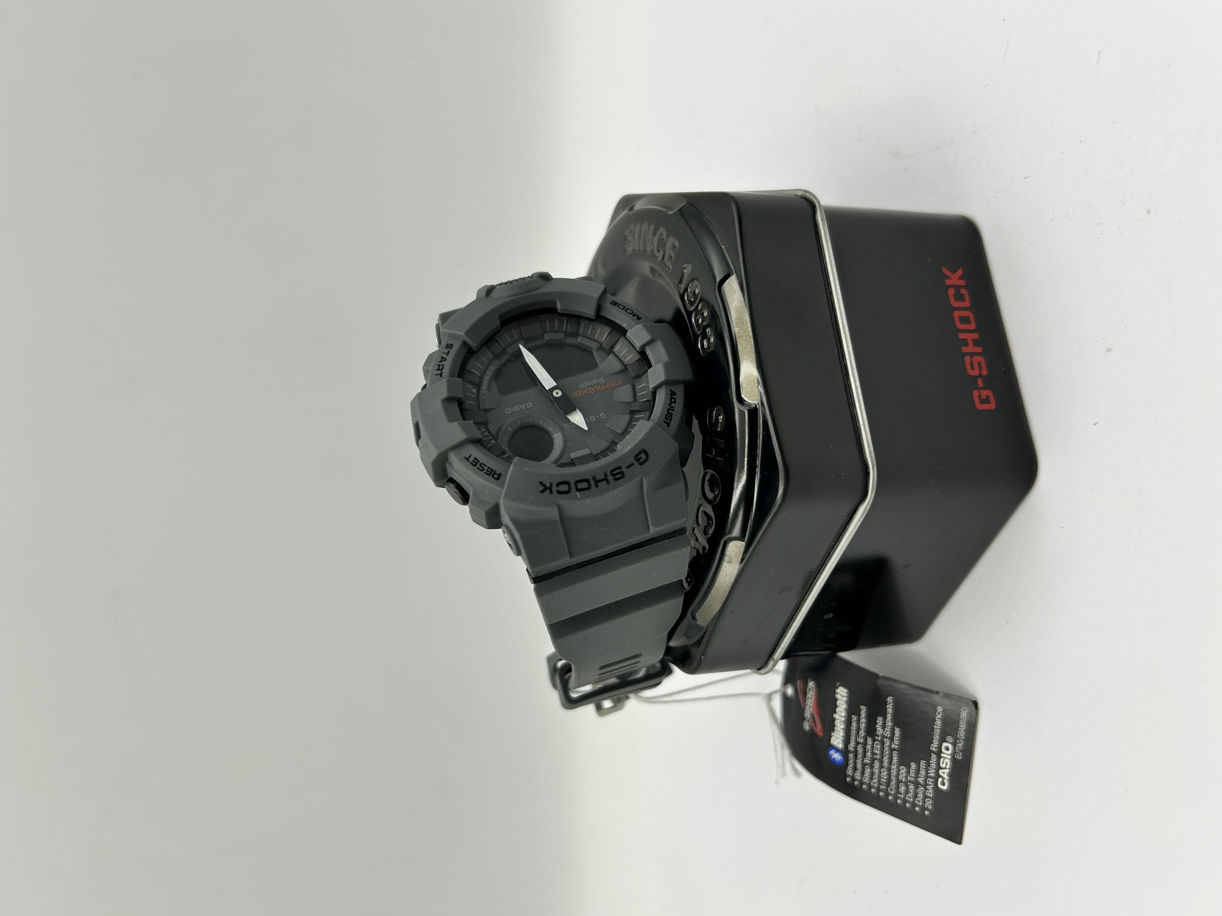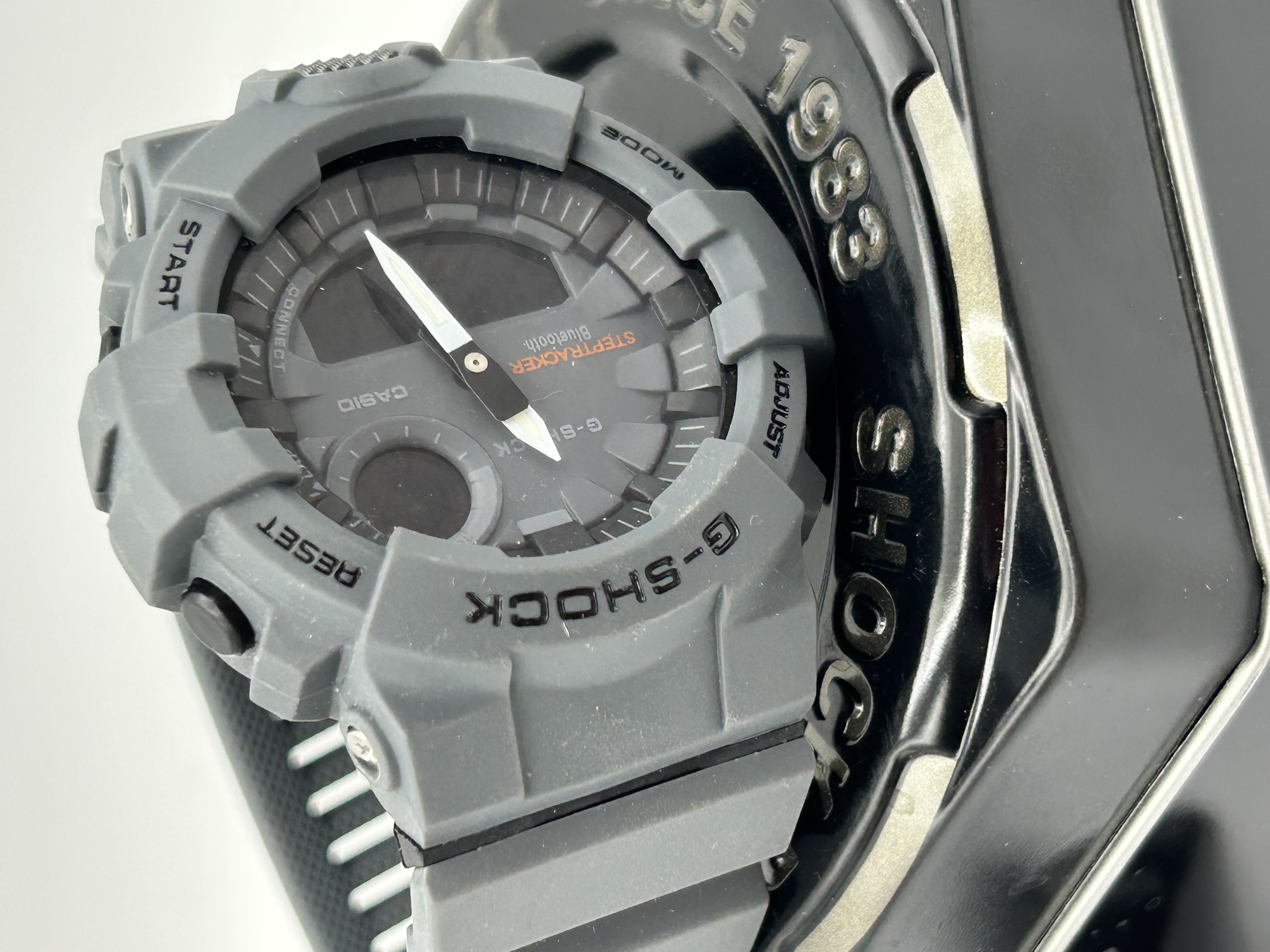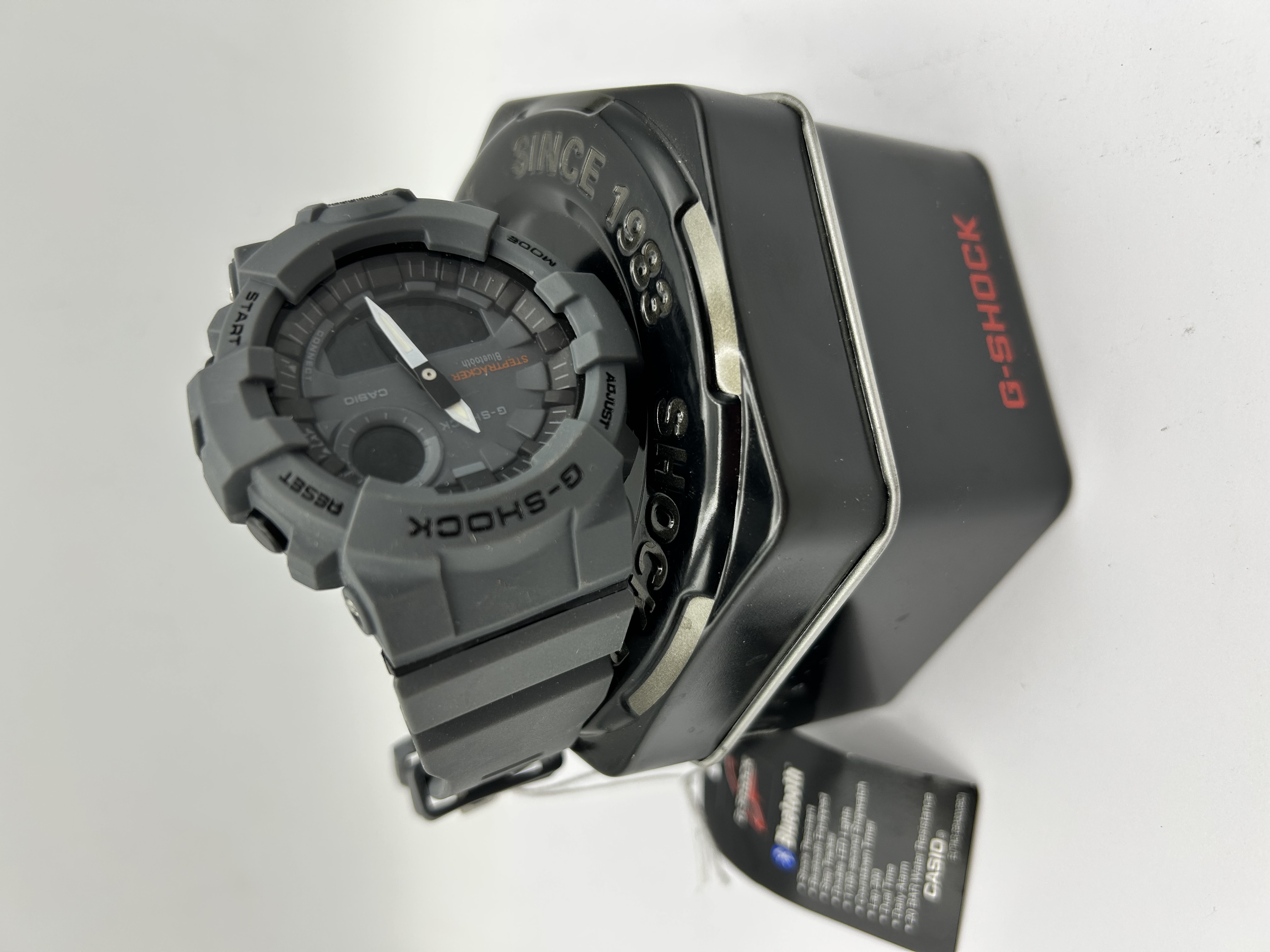 A Casio G-Shock G-SQUAD Step Tracker Bluetooth wristwatch, reference GBA-800-8BER. The timepiece features a grey resin case with an integrated grey resin strap and a pin buckle. The analogue-digital dial is finished in grey and black with white hour and minute hands. Markings on the dial include Casio, G-Shock, Step Tracker, Bluetooth, and Connect. The bezel is embossed with G-Shock, Adjust, Mode, Start, and Reset. The watch is powered by a quartz movement. It is accompanied by its original retail tag and a decorative black hexagonal presentation tin embossed with Since 1983 and G-Shock.