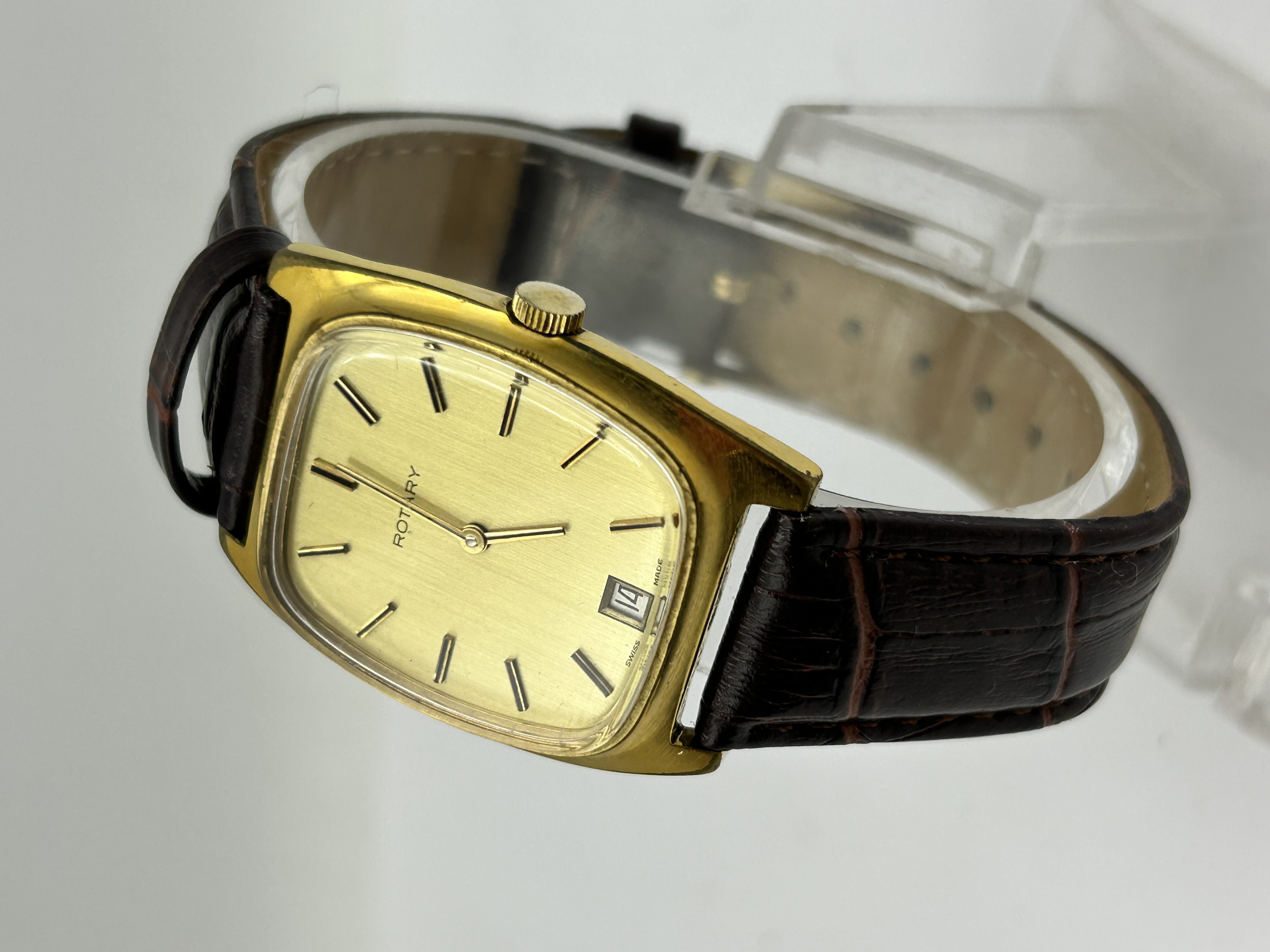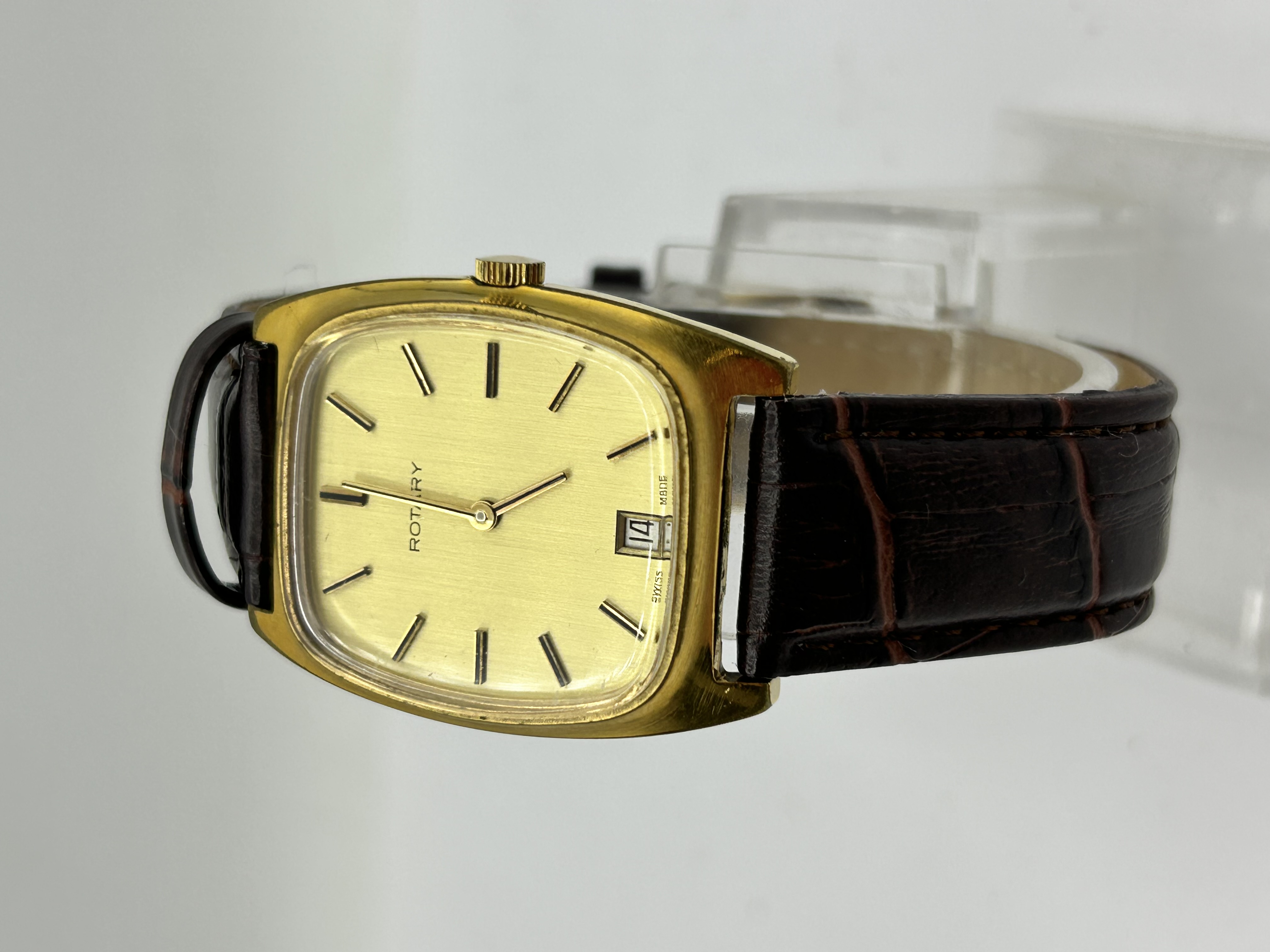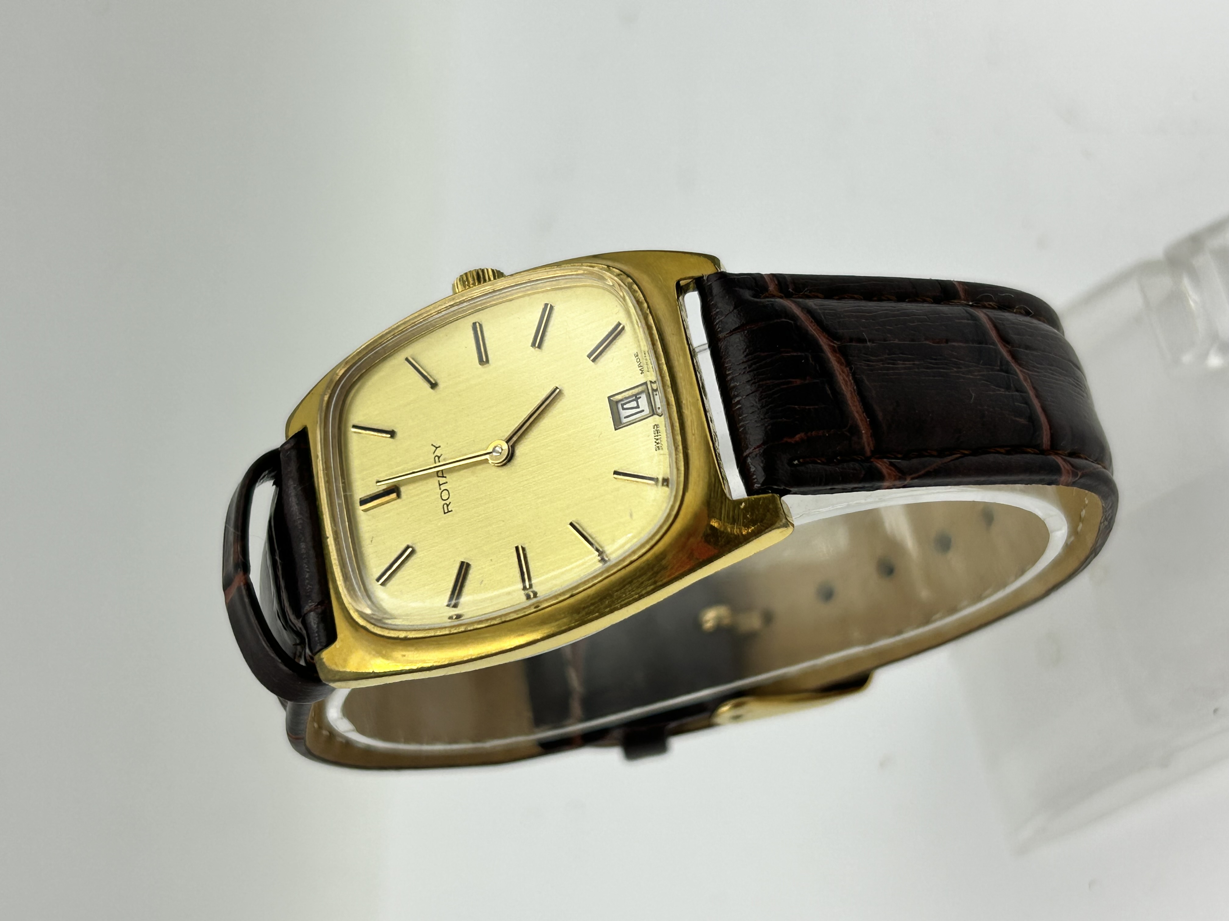 A vintage Swiss made wristwatch by the maker Rotary. The timepiece features a cushion-shaped gold-tone metal case housing a champagne sunburst dial. The dial is detailed with black and gold-tone baton hour markers and includes a date aperture at the 3 o’clock position. The watch is fitted to a brown crocodile-effect leather strap with a gold-tone pin buckle. The dial is signed Rotary and Swiss Made.
