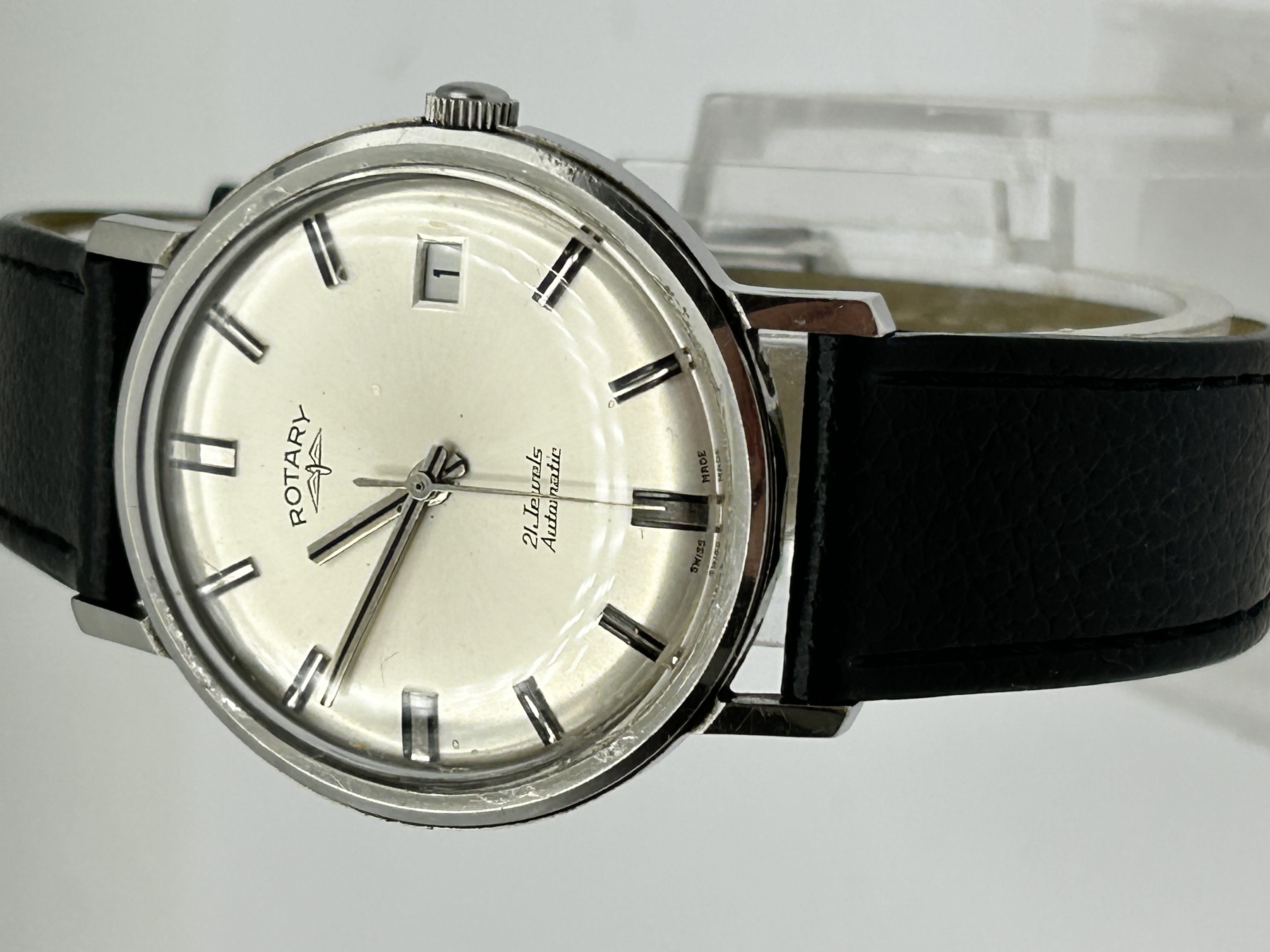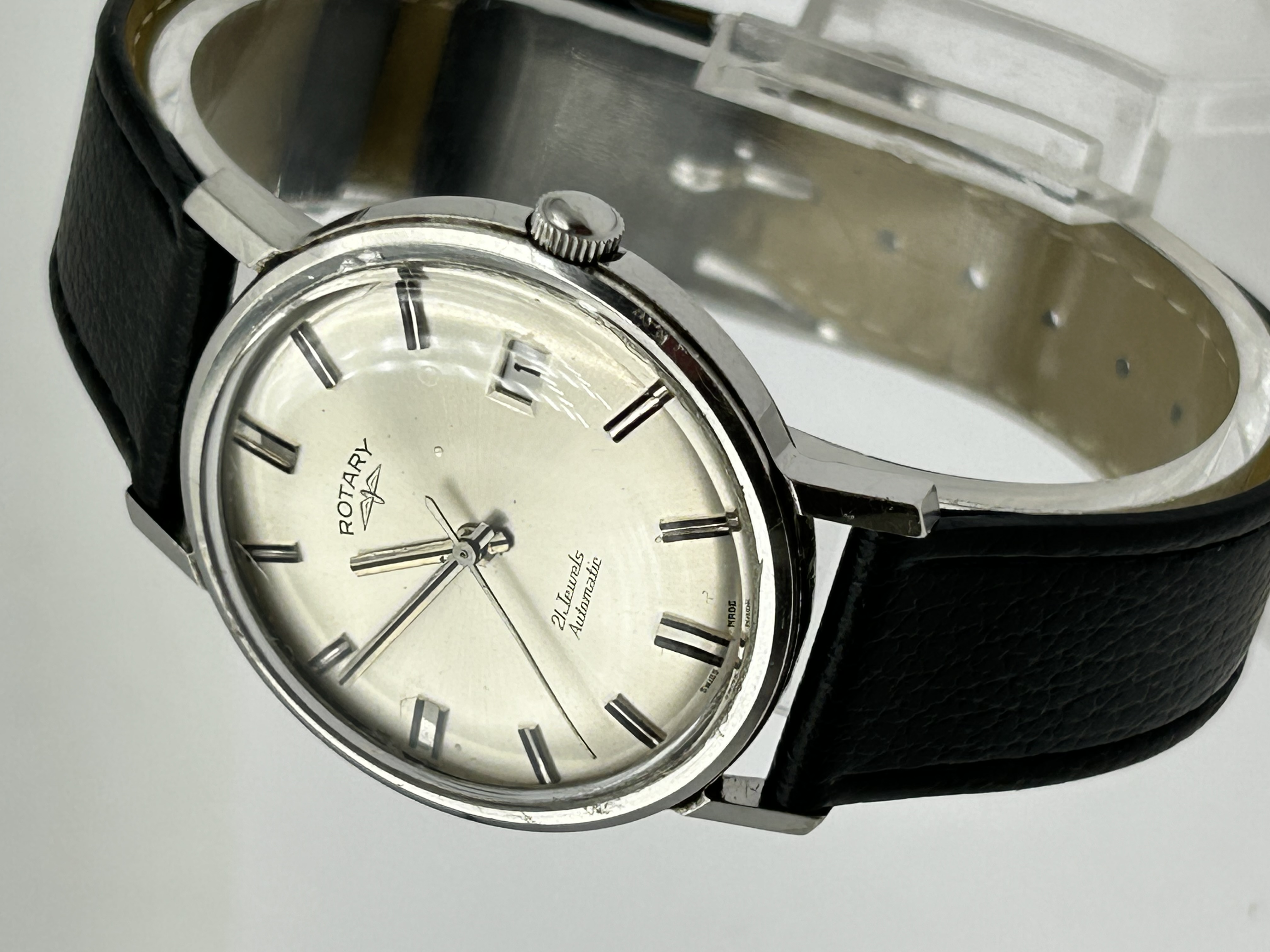 A vintage Rotary automatic wristwatch, circa 1960s, featuring a circular silvered dial with applied faceted baton hour markers. The dial is signed with the Rotary winged wheel logo and includes a date aperture at the 3 o’clock position. It is further inscribed 21 Jewels and Automatic in cursive script, with Swiss Made at the bottom edge. The watch features silver-tone dauphine hour and minute hands and a central sweep seconds hand. The movement is a 21-jewel automatic calibre. The silver-tone case is fitted with straight lugs and a domed acrylic crystal. The watch is presented on a modern black textured leather strap with a pin buckle.