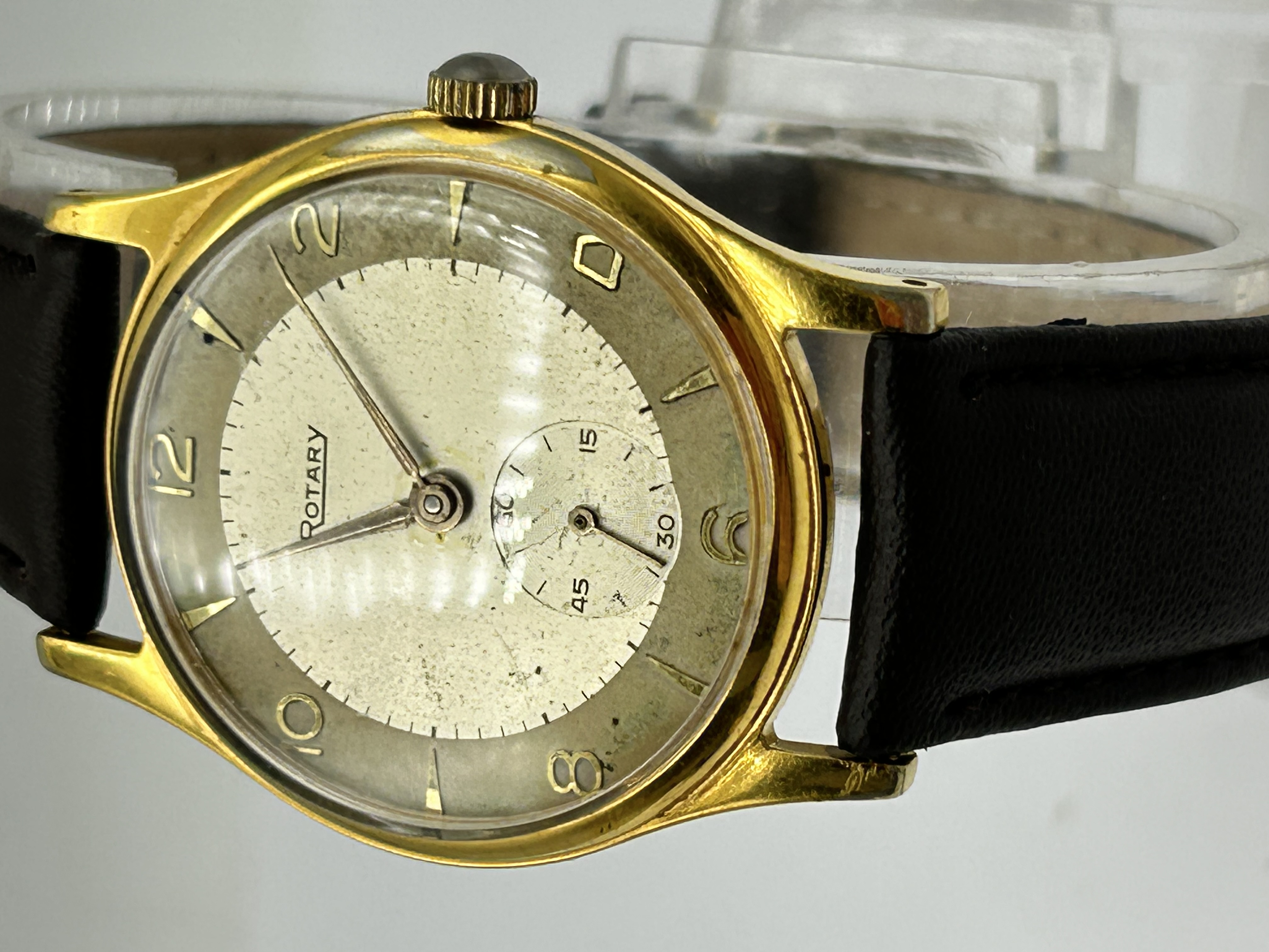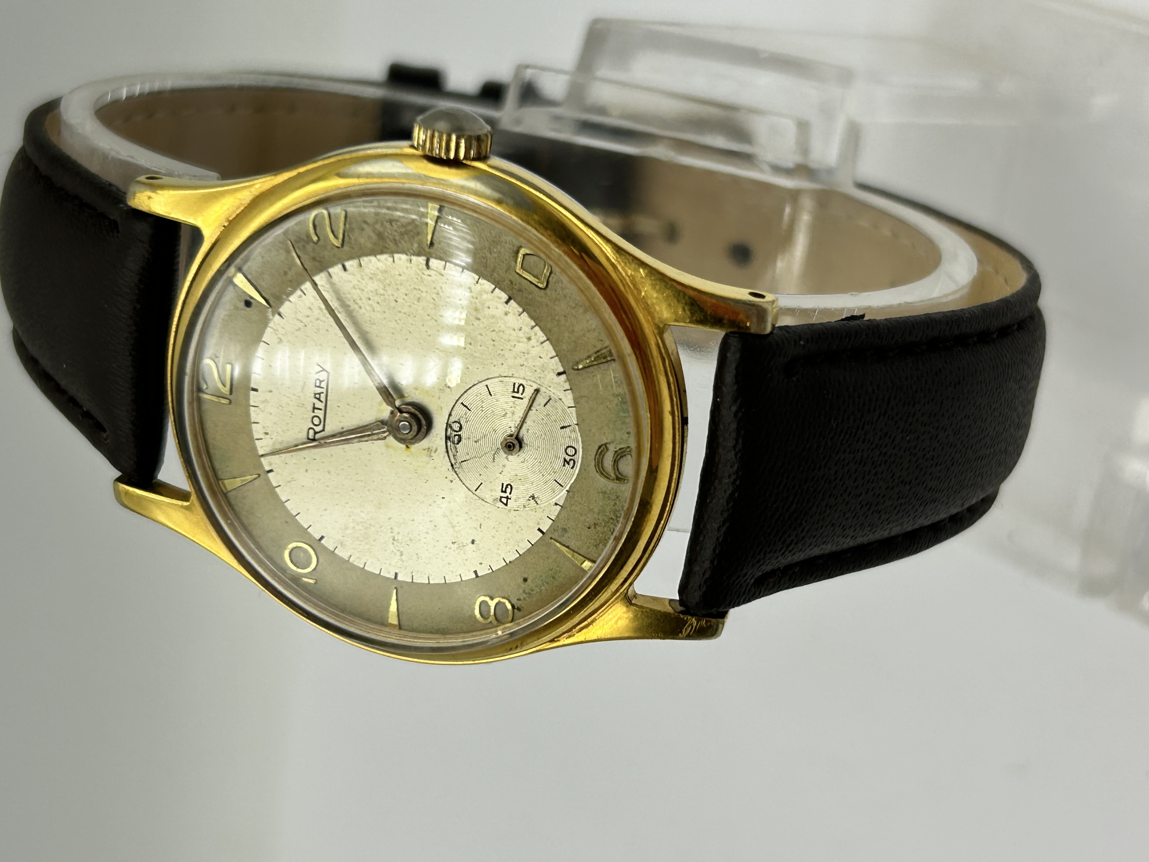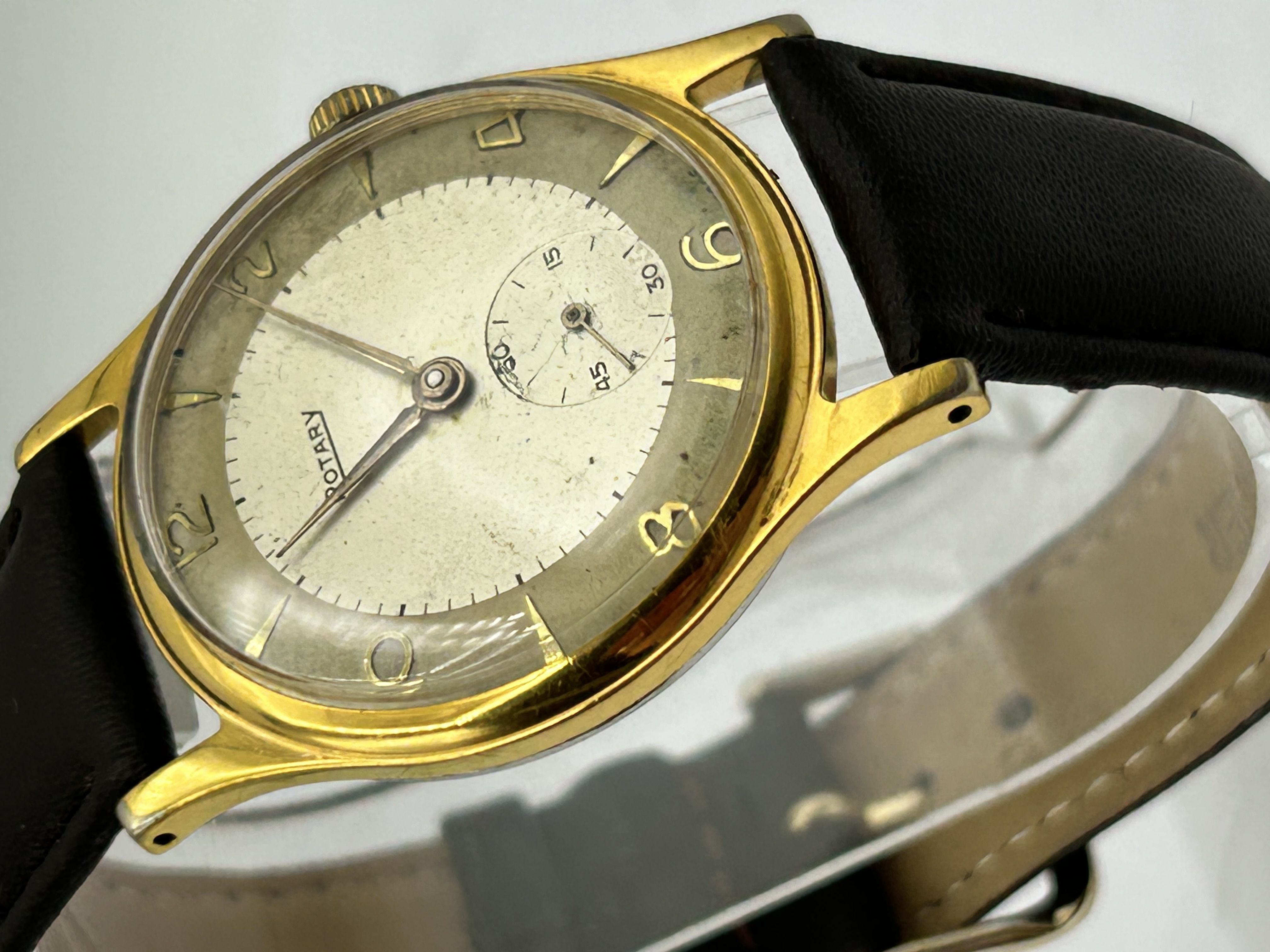 A mid-century gentleman’s wristwatch by Rotary. The watch features a gold-toned metal case with downturned lugs and a rounded bezel. The two-tone champagne dial is configured with an outer chapter ring featuring applied gilt Arabic numerals at the even hours and dart-shaped markers at the odd hours. A sub-seconds dial with concentric circular graining is positioned at the 6 o’clock position. The watch is fitted with gilt dauphine-style hands and a replacement black leather strap. The dial is signed ROTARY.