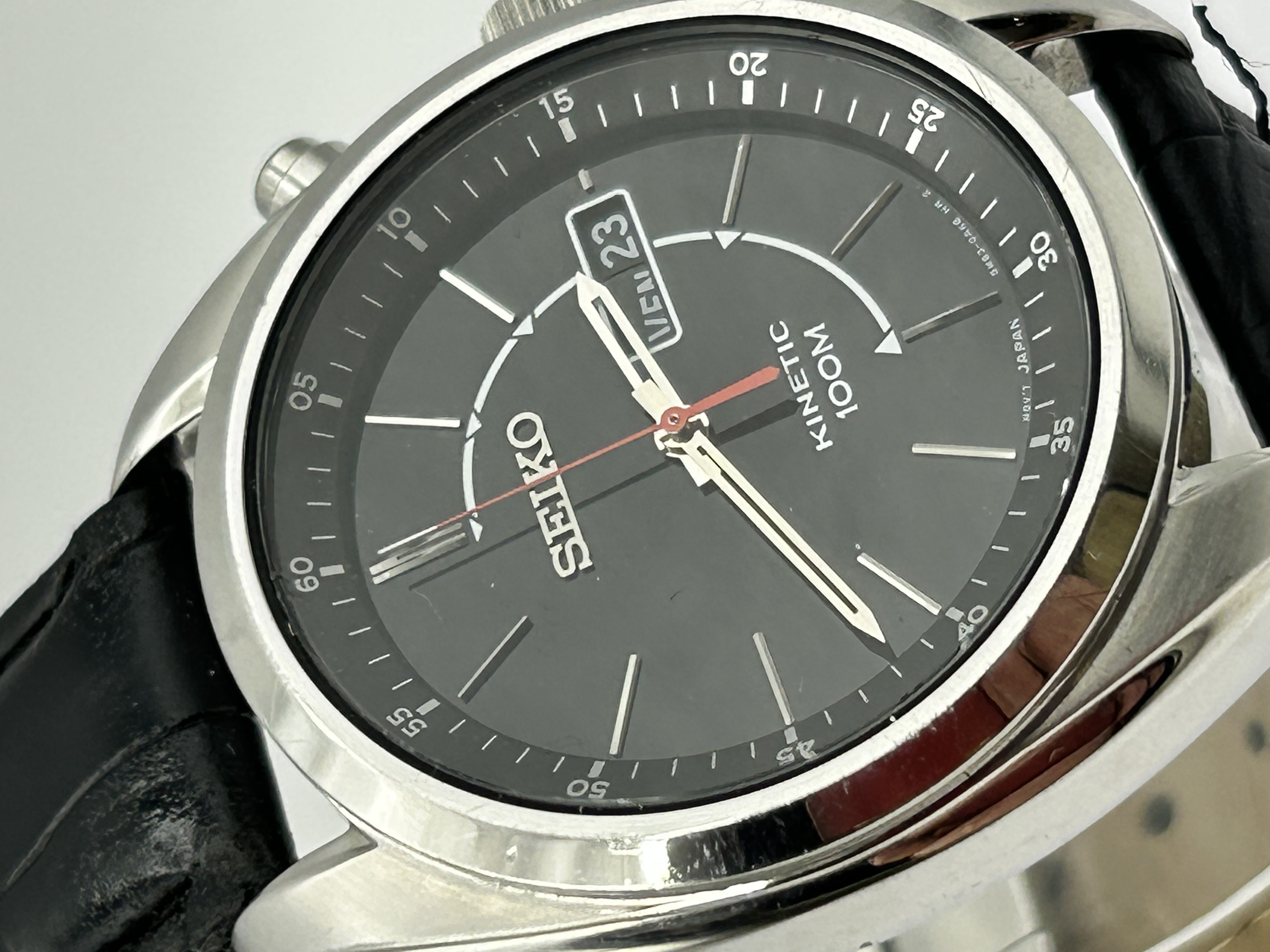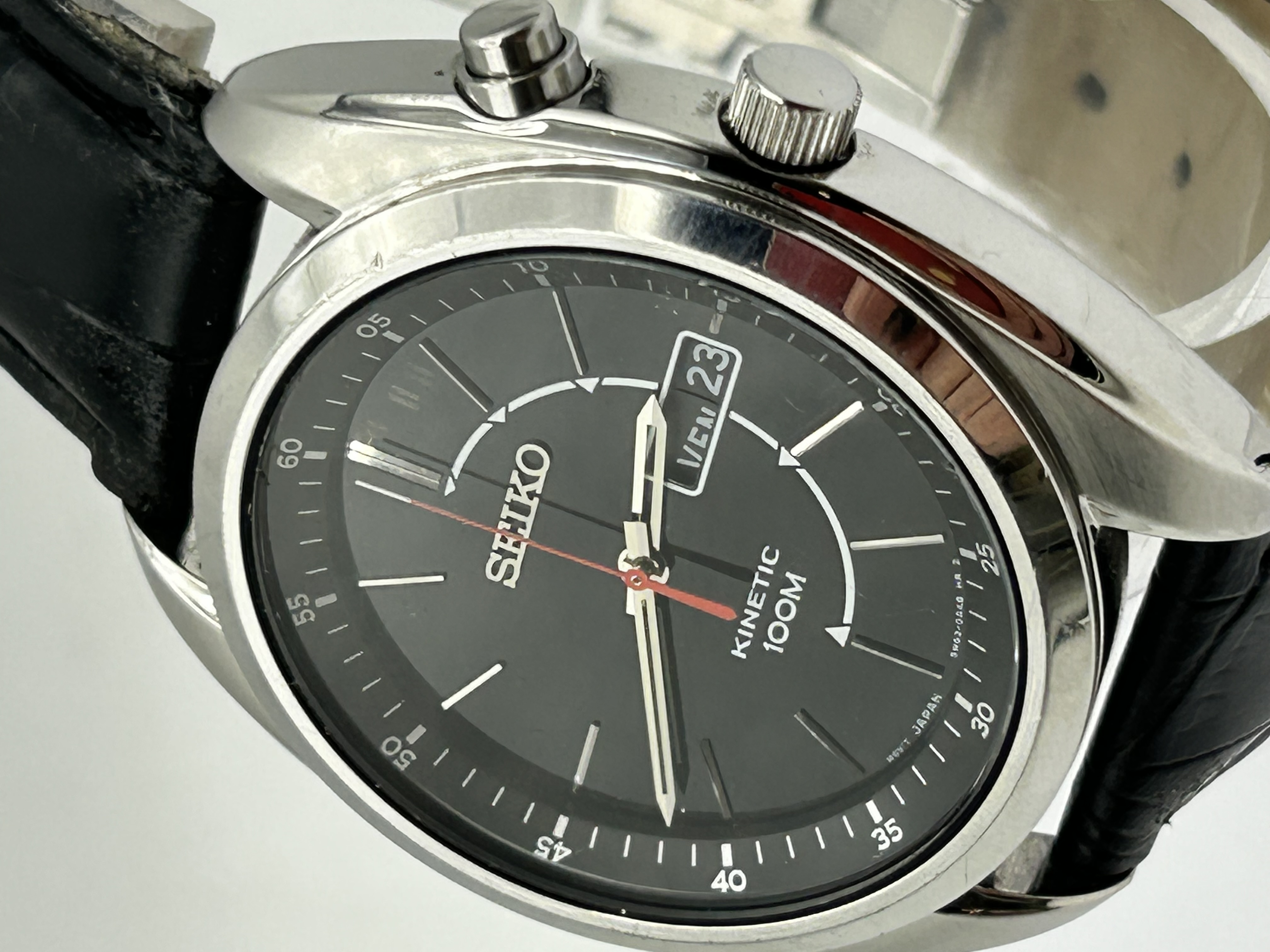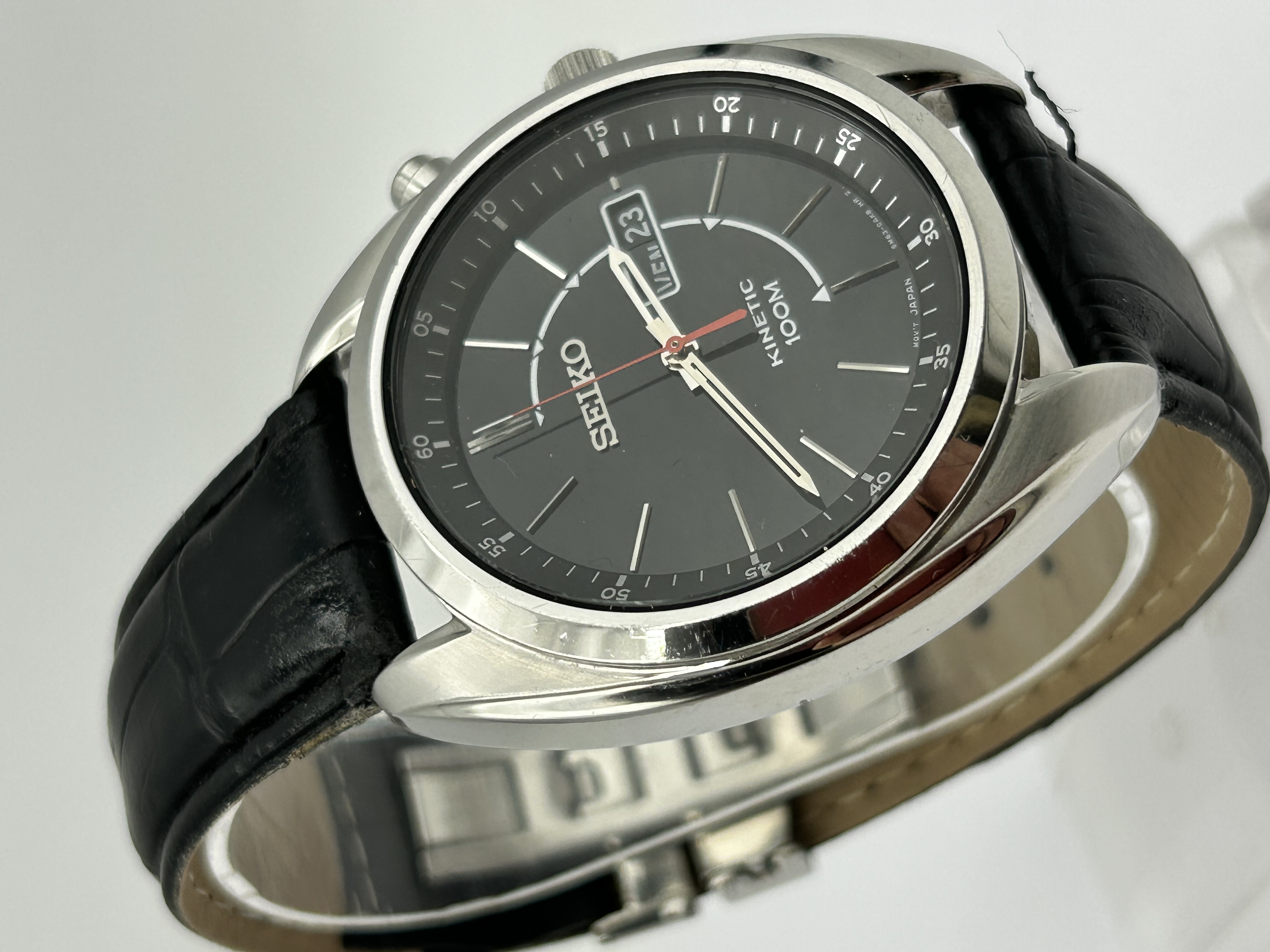 A Seiko Kinetic 100M wristwatch, reference 5M63-0AK0. The watch features a polished stainless steel case with a black dial. The dial is set with applied silver-tone baton hour markers, luminous hour and minute hands, and a central red seconds hand. It includes an outer minute track with five-minute Arabic numeral intervals and a day-date aperture at the 3 o’clock position, currently displaying the day in French. The timepiece is powered by a Seiko Kinetic movement, caliber 5M63, which utilises the wearer’s motion to charge a capacitor that powers the quartz timing mechanism. The watch is fitted with a black leather strap featuring an embossed alligator-style pattern and a stainless steel deployant clasp. Dial markings include Seiko, Kinetic 100M, and Mov’t Japan 5M63-0AK0 HR 2.